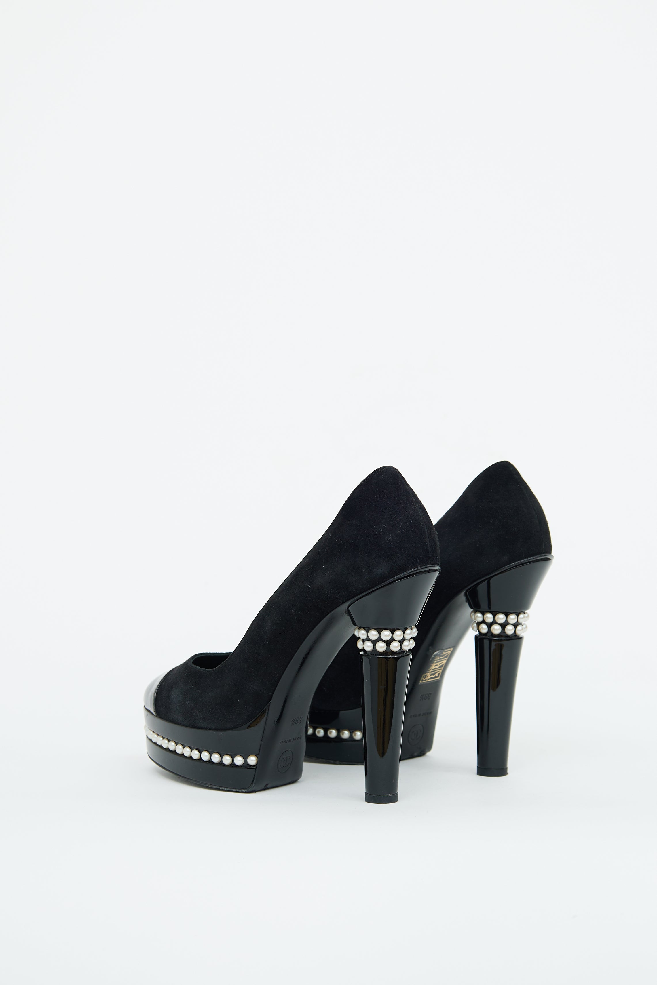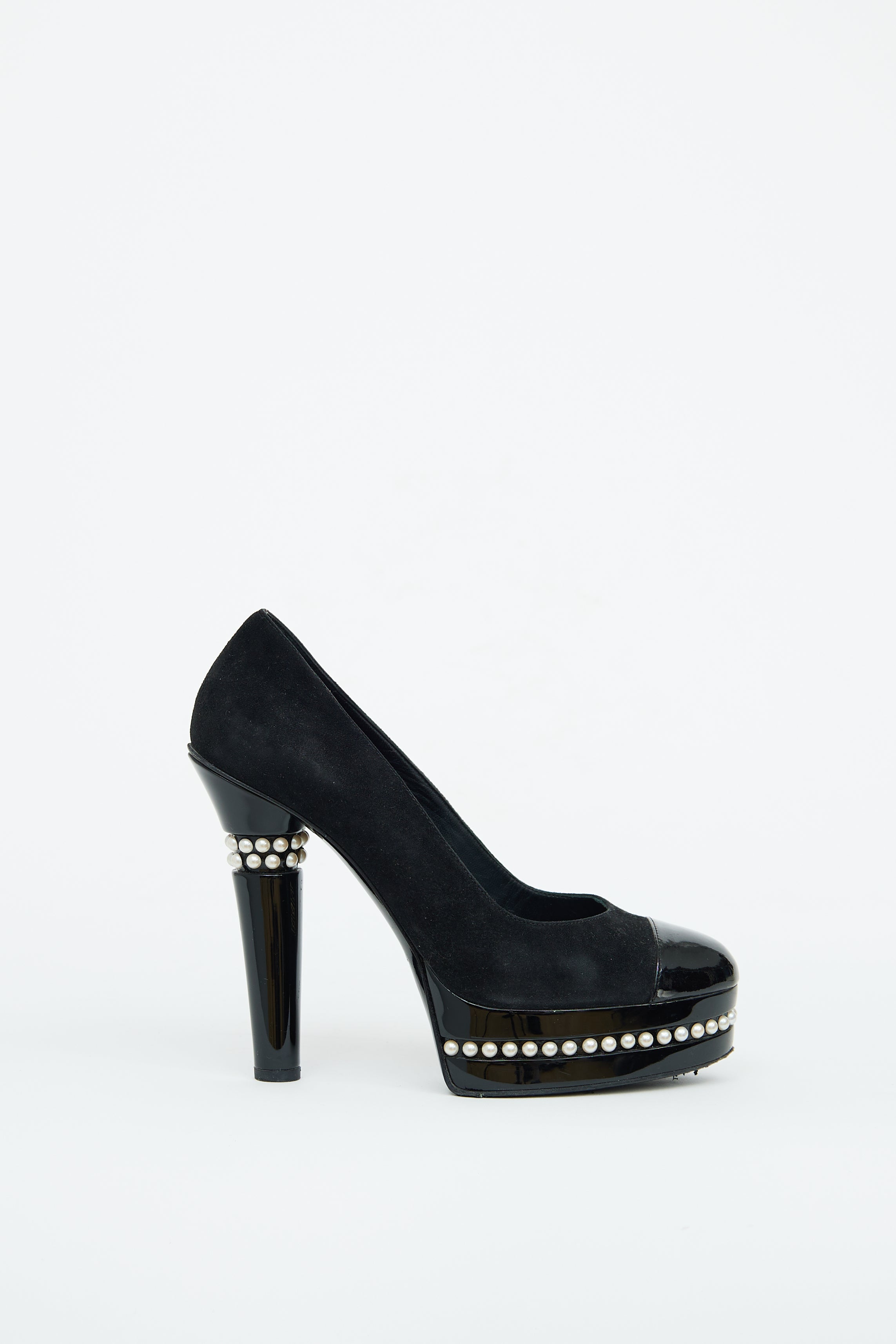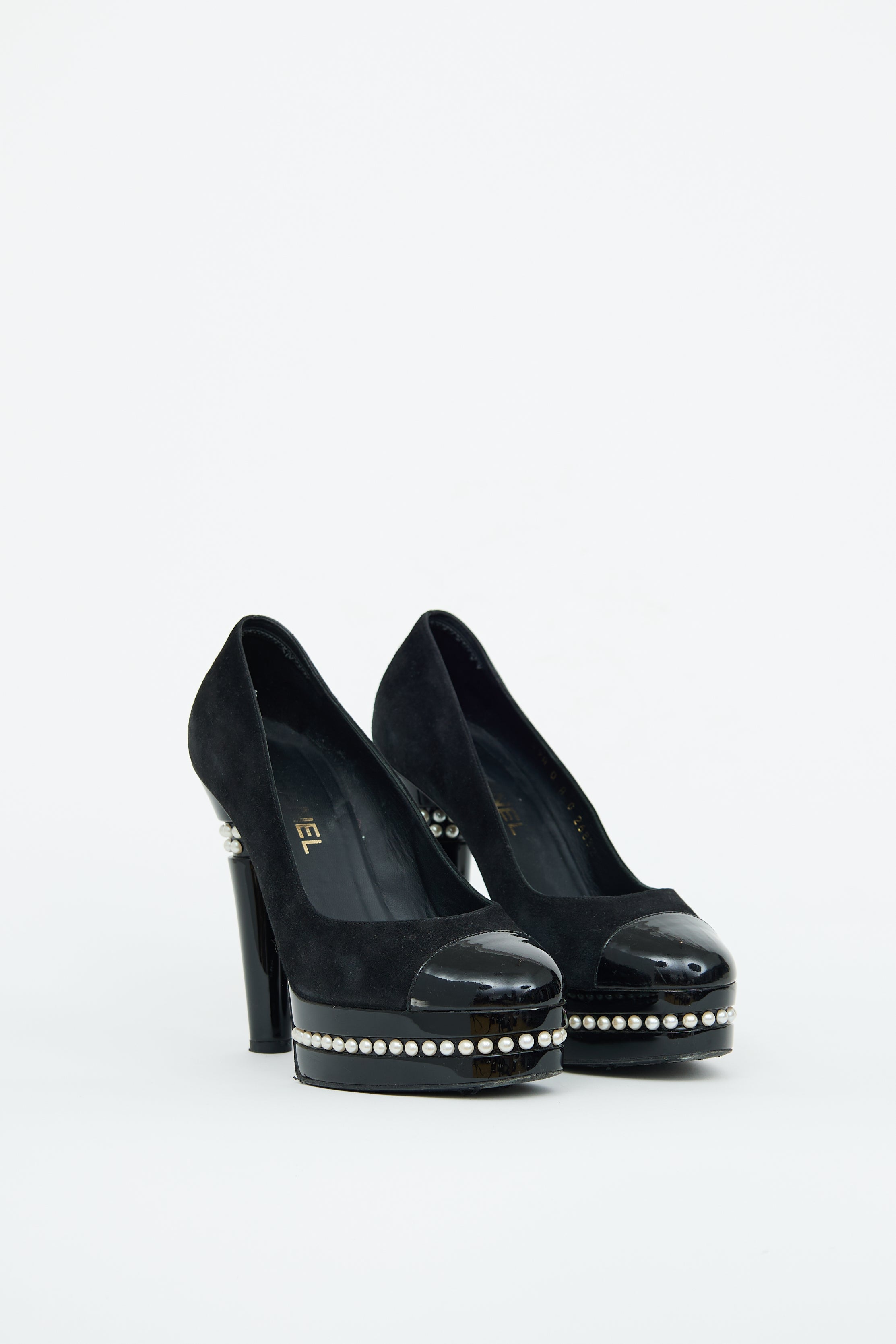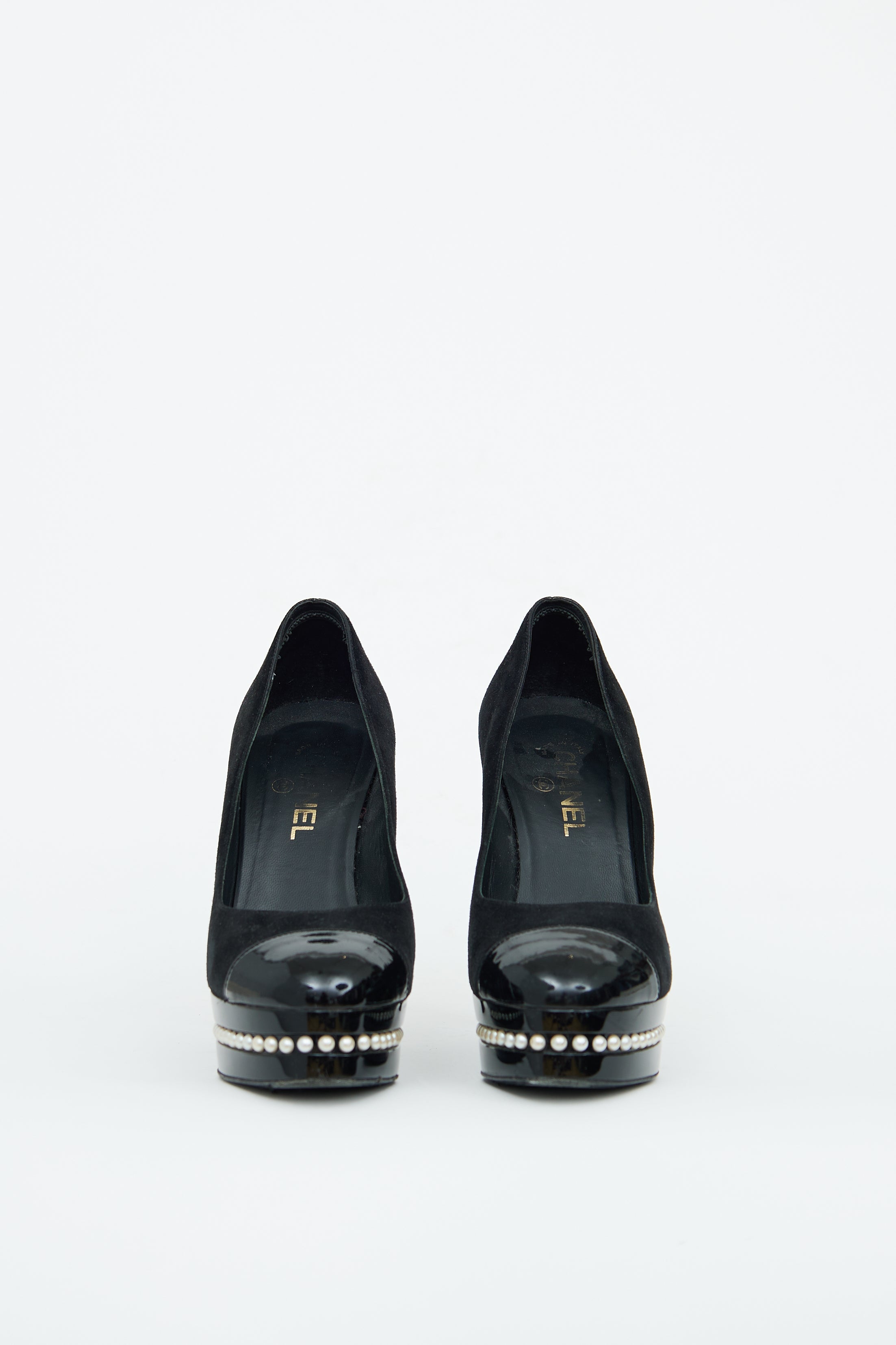 Pre-owned Chanel 2009 black Moscow pumps featuring round toe with patent leather cap toe, patent platform midsole with pearl trim, suede upper, patent heel with pearl detail and slip on entry.
