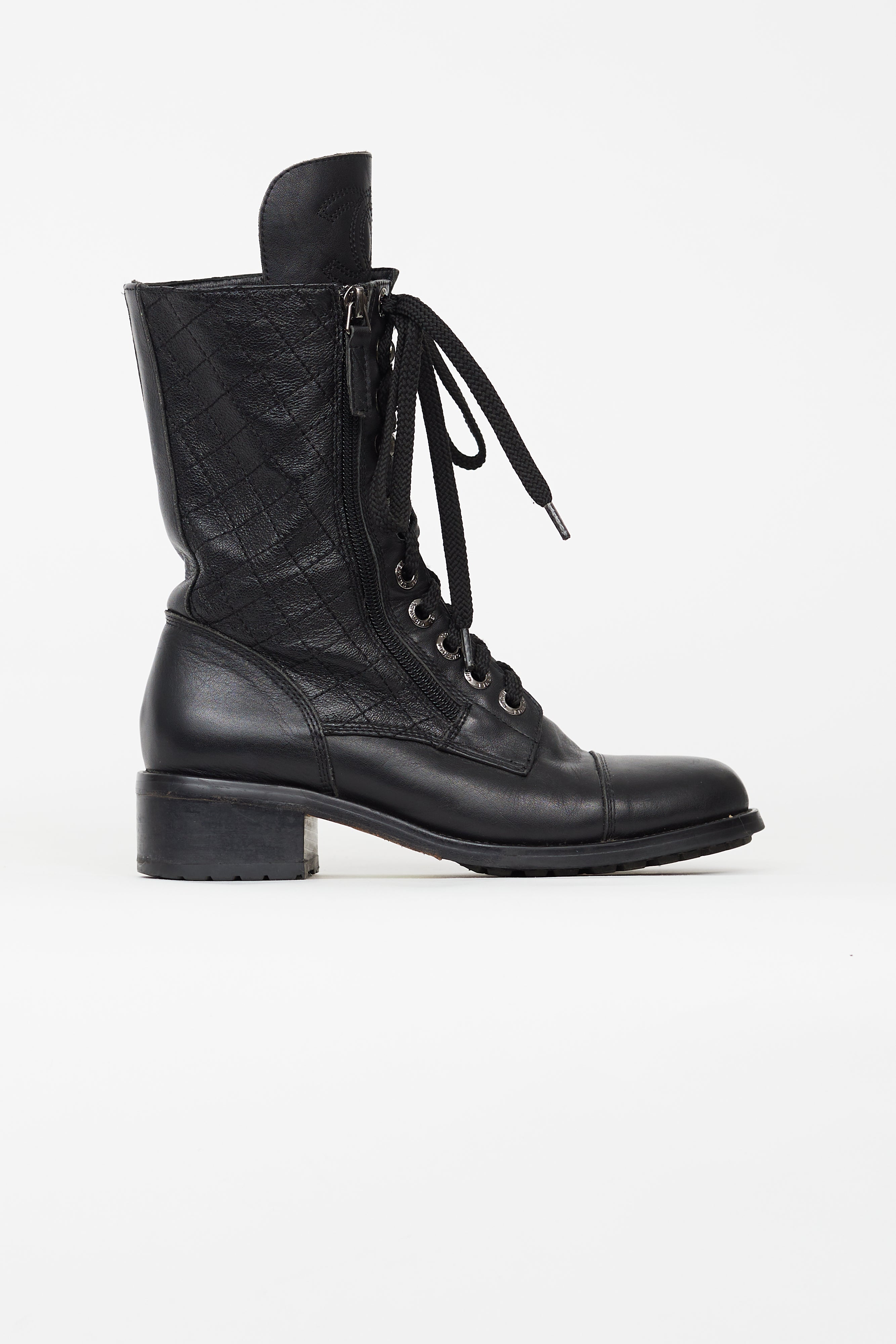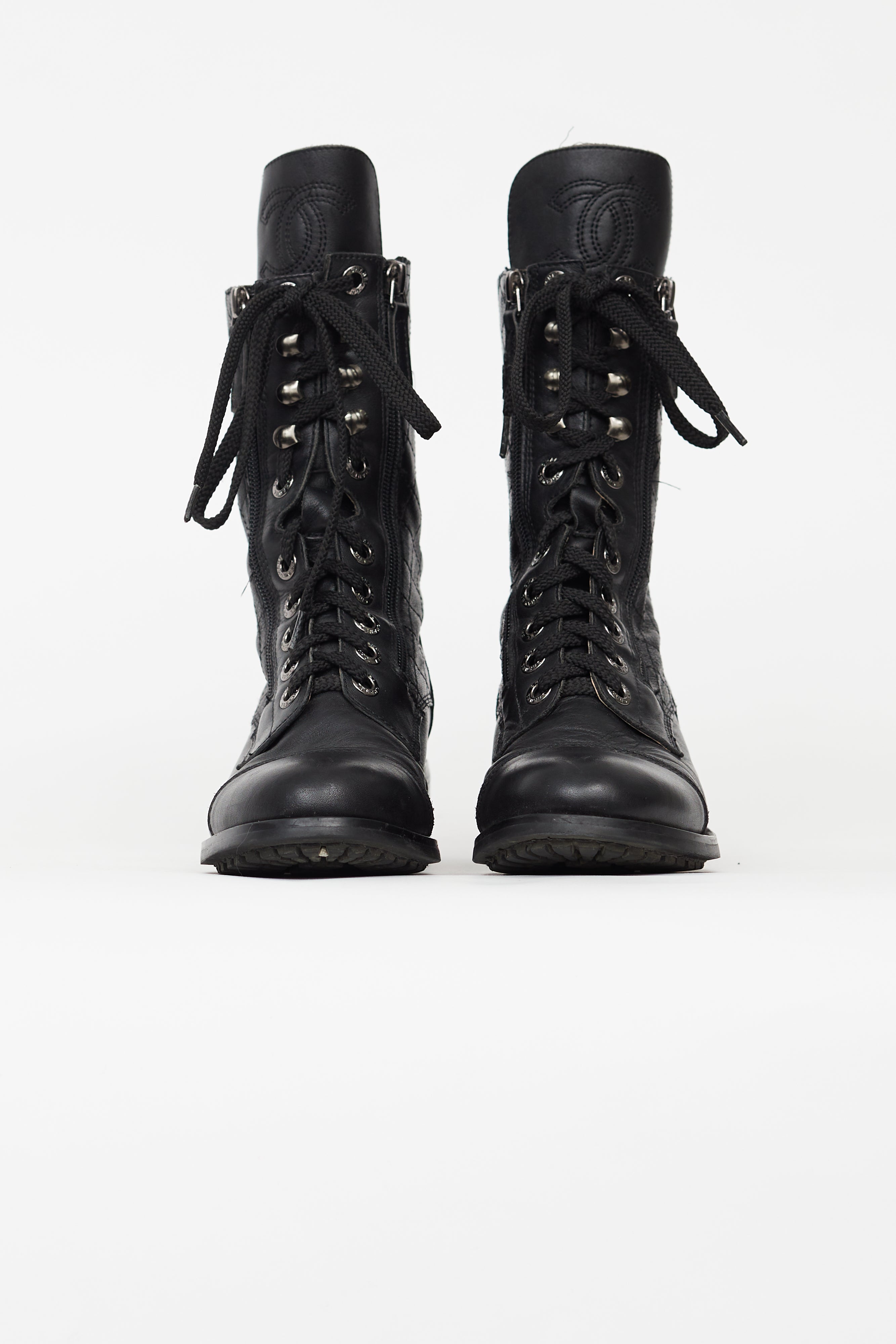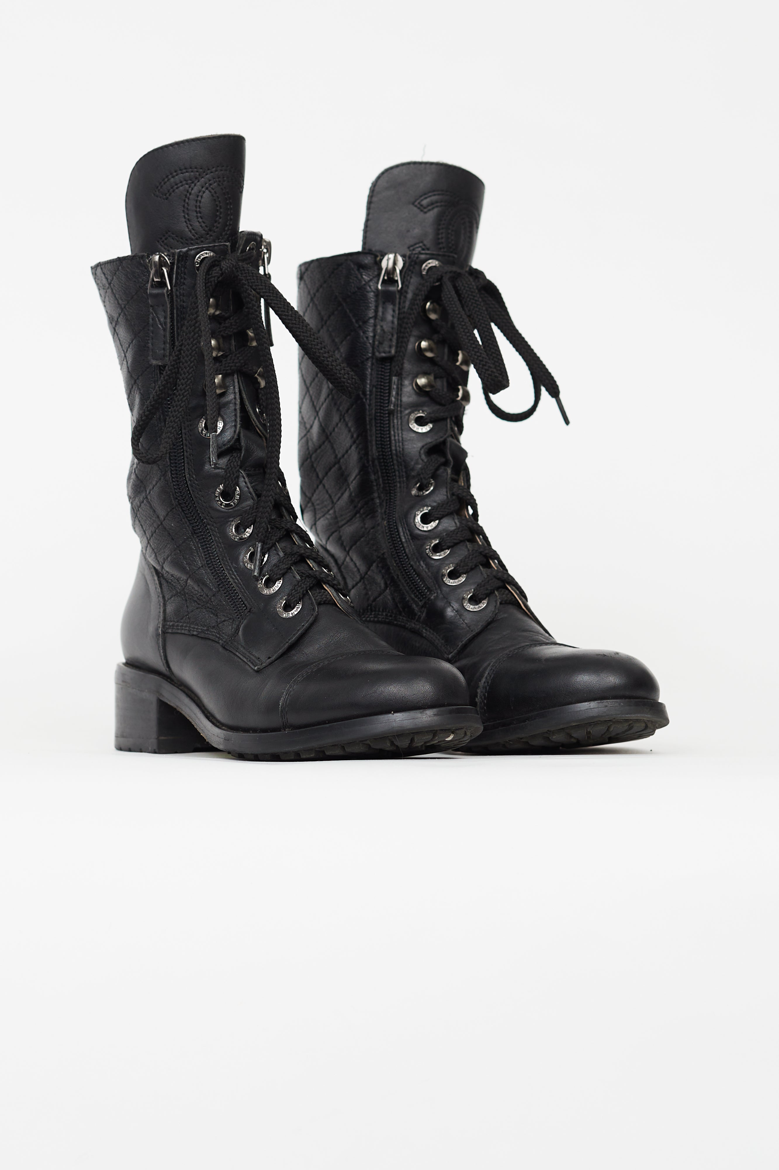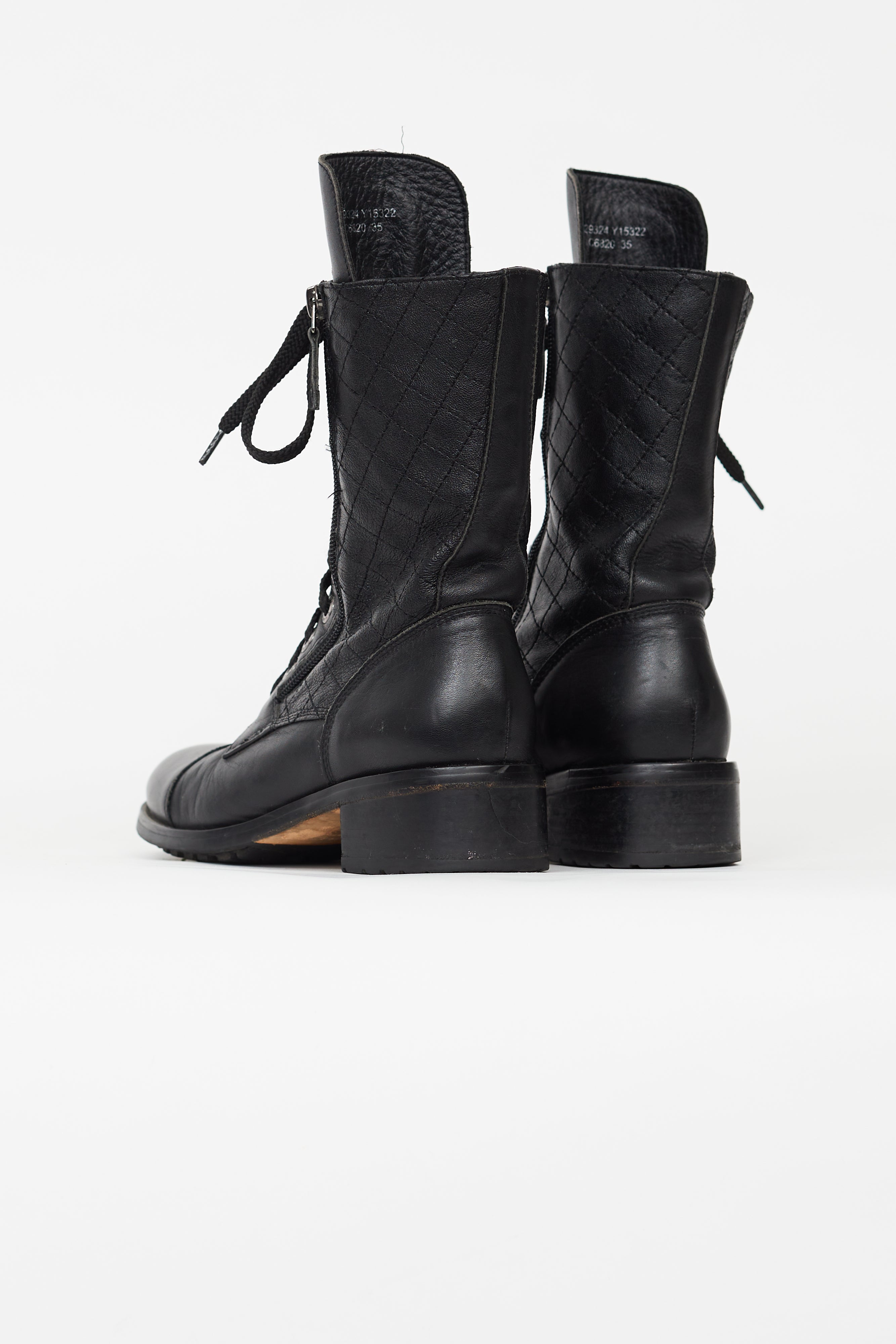 Pre-owned Chanel black boots featuring rounded toe, lace up vamp, embroidered logo at tongue, quilted leather upper, side zip closure, and stacked heel.