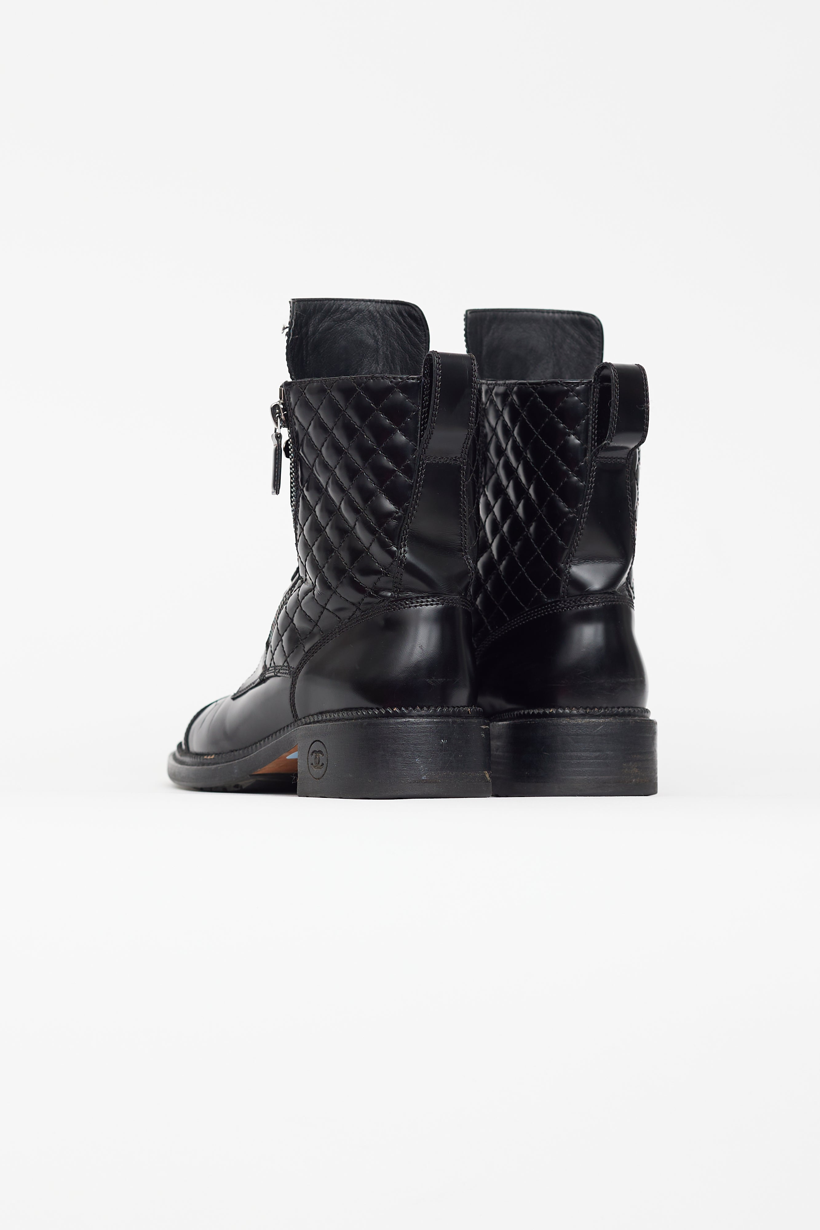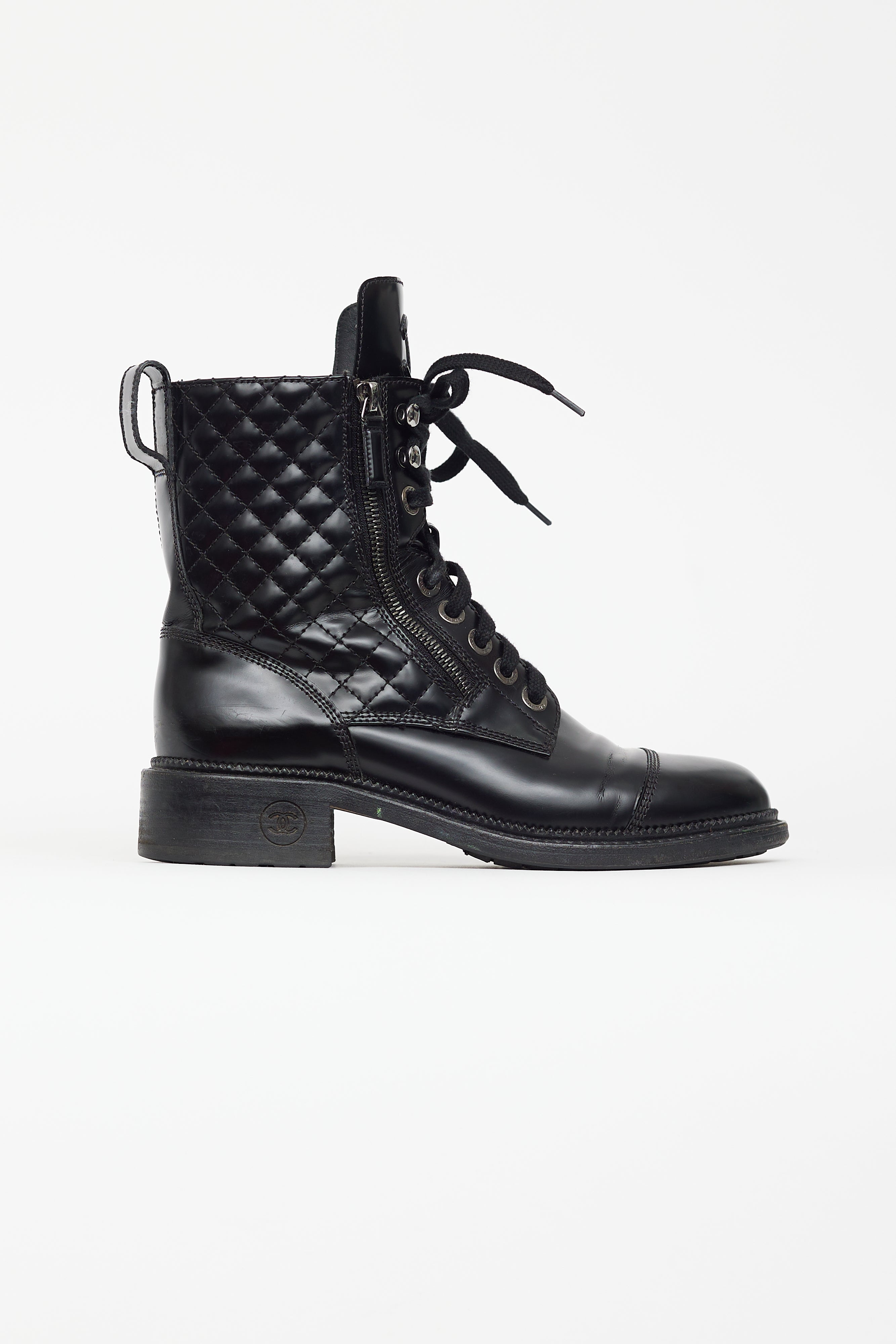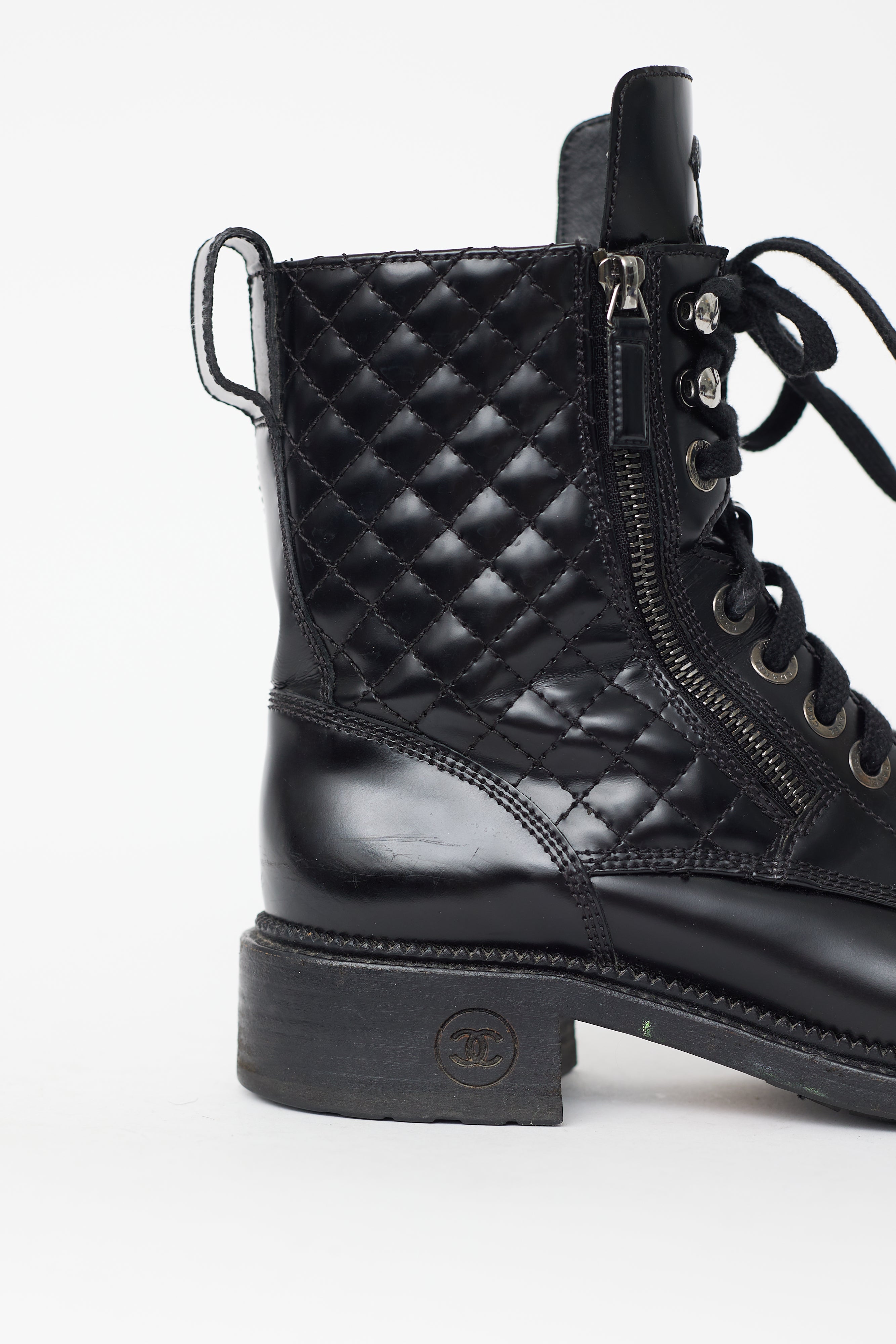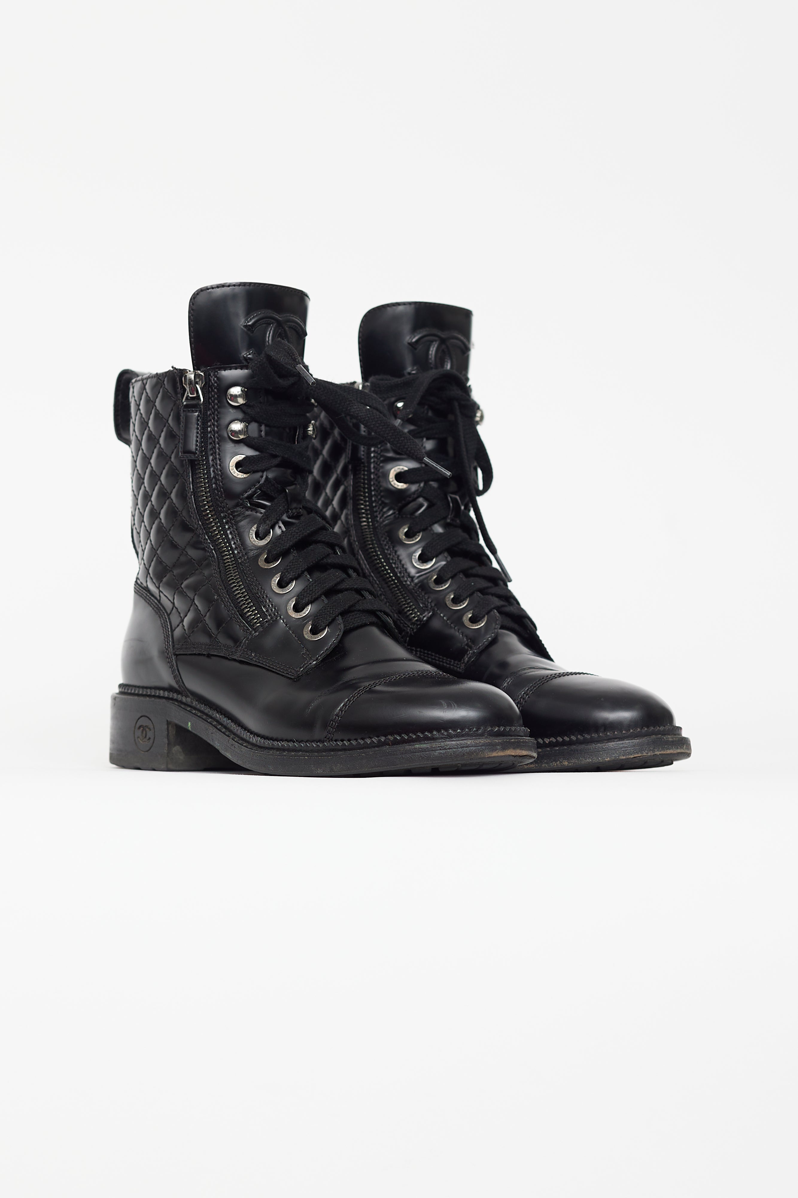 Pre-owned Chanel combat boots featuring rounded toe, lace up front, expandable sides at vamp with zip fastening, embossed CC logo at tongue, pull tab at back, quilted upper, and block heel with CC logo at side. Comes with a dust bag.