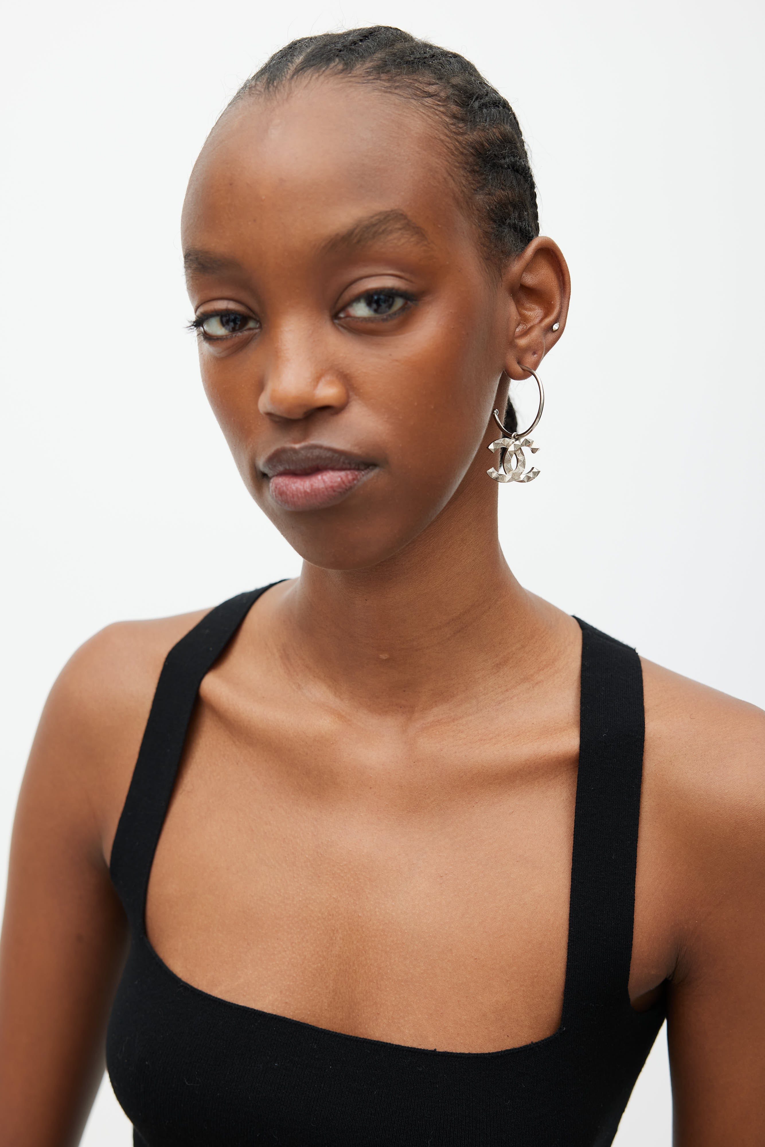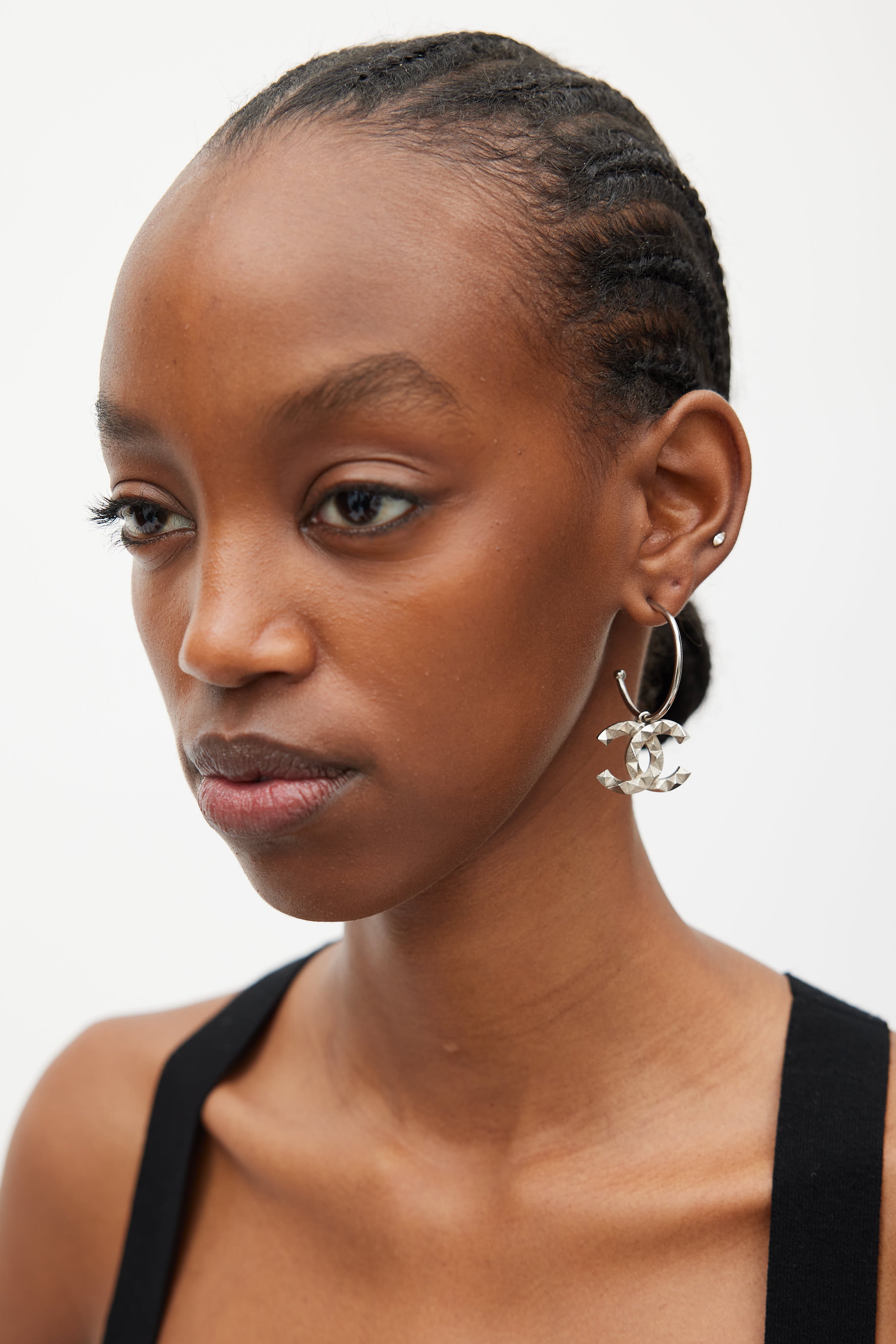 Pre-owned single Chanel silver earring featuring CC spiked logo pendant, open hoop, and push lock closure.