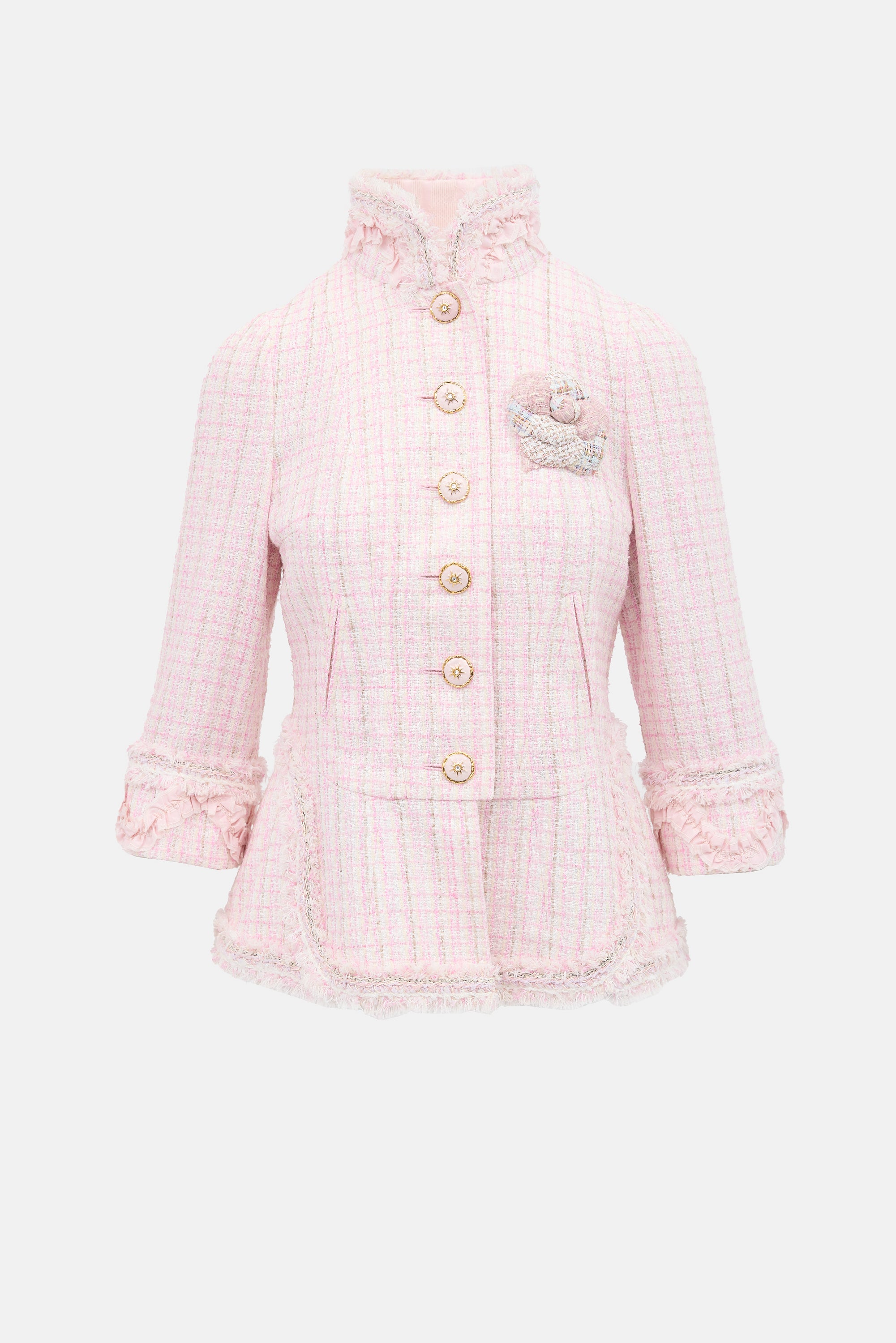 Pre-owned Chanel Crusie 2013 pink and white tweed jacket featuring a stand collar, button front, double welt pockets, peplum, white CC embellishment at left cuff, and embroidered trim. Lined. Comes with detachable Camelia flower brooch.