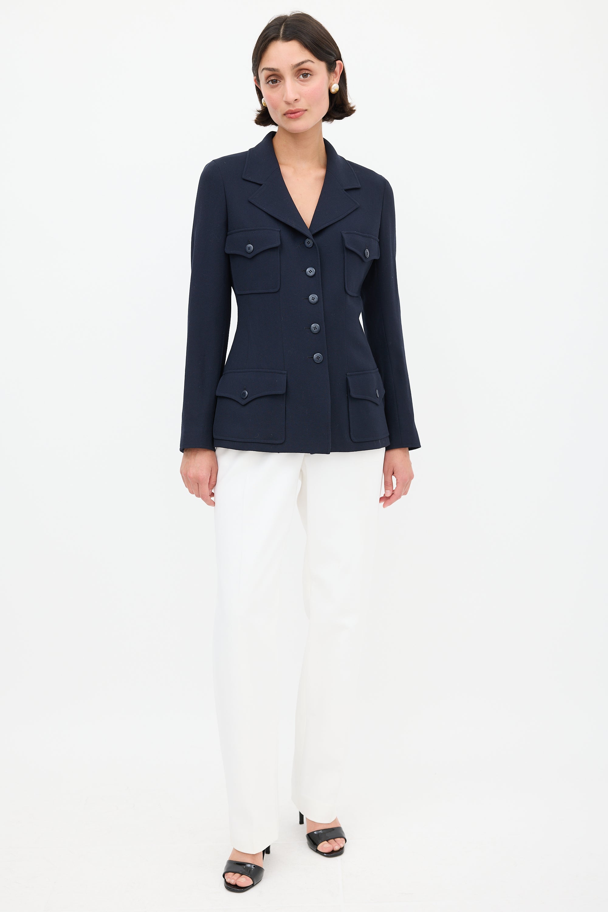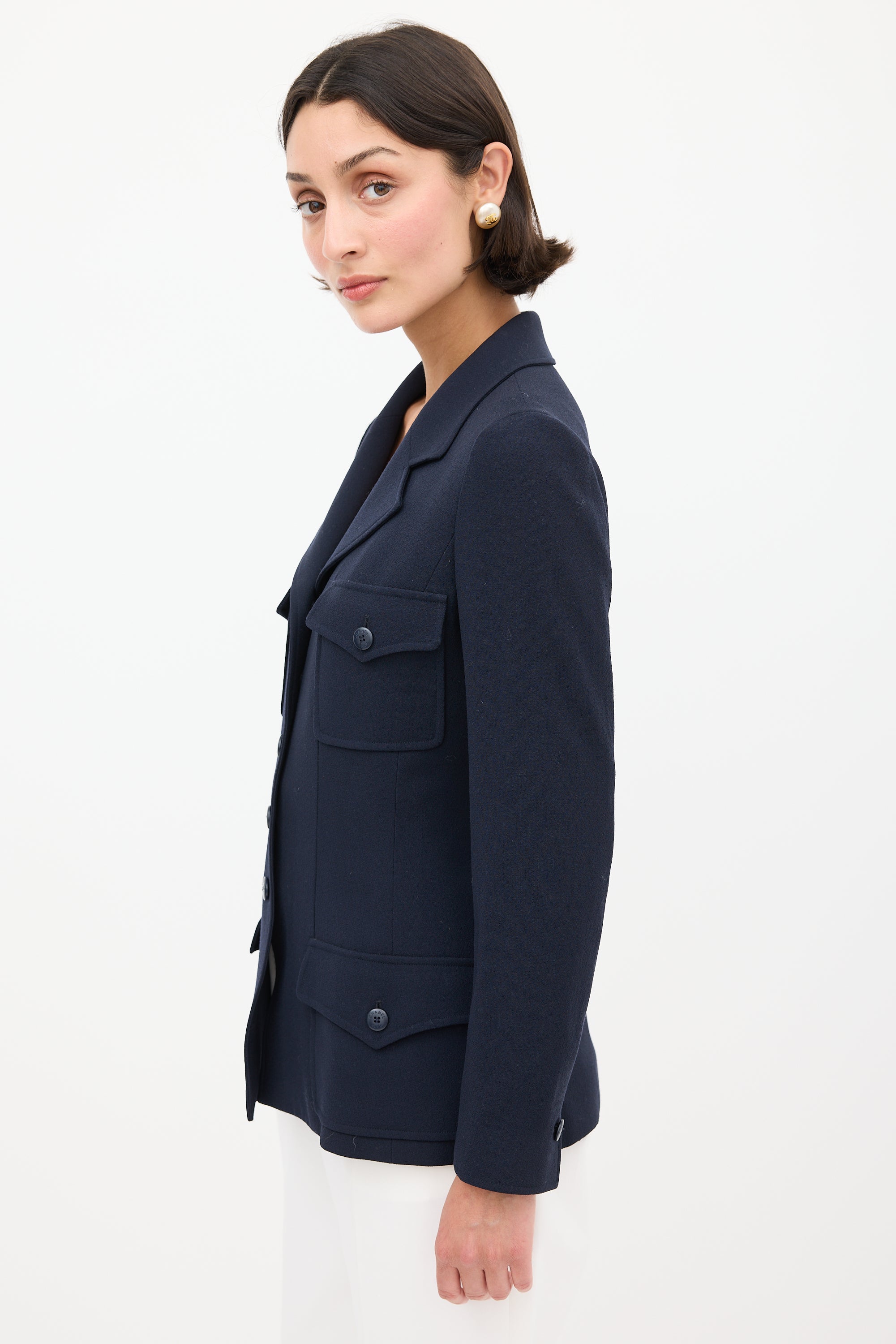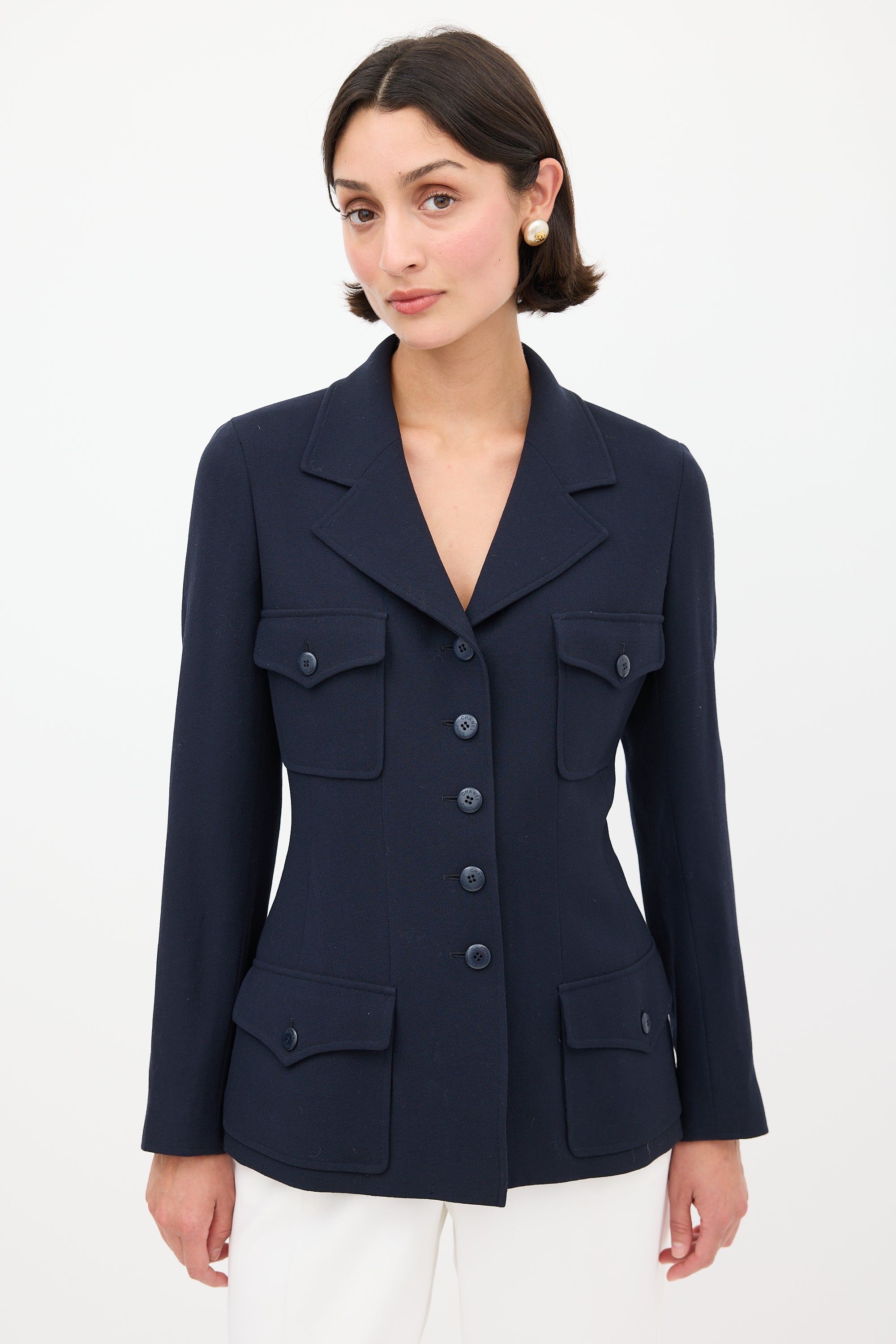 Pre-owned Chanel Fall/Winter 1997 navy wool blazer featuring a notched lapel, long sleeves with buttoned cuffs, four flap pockets at front, and button up closure. Lined.