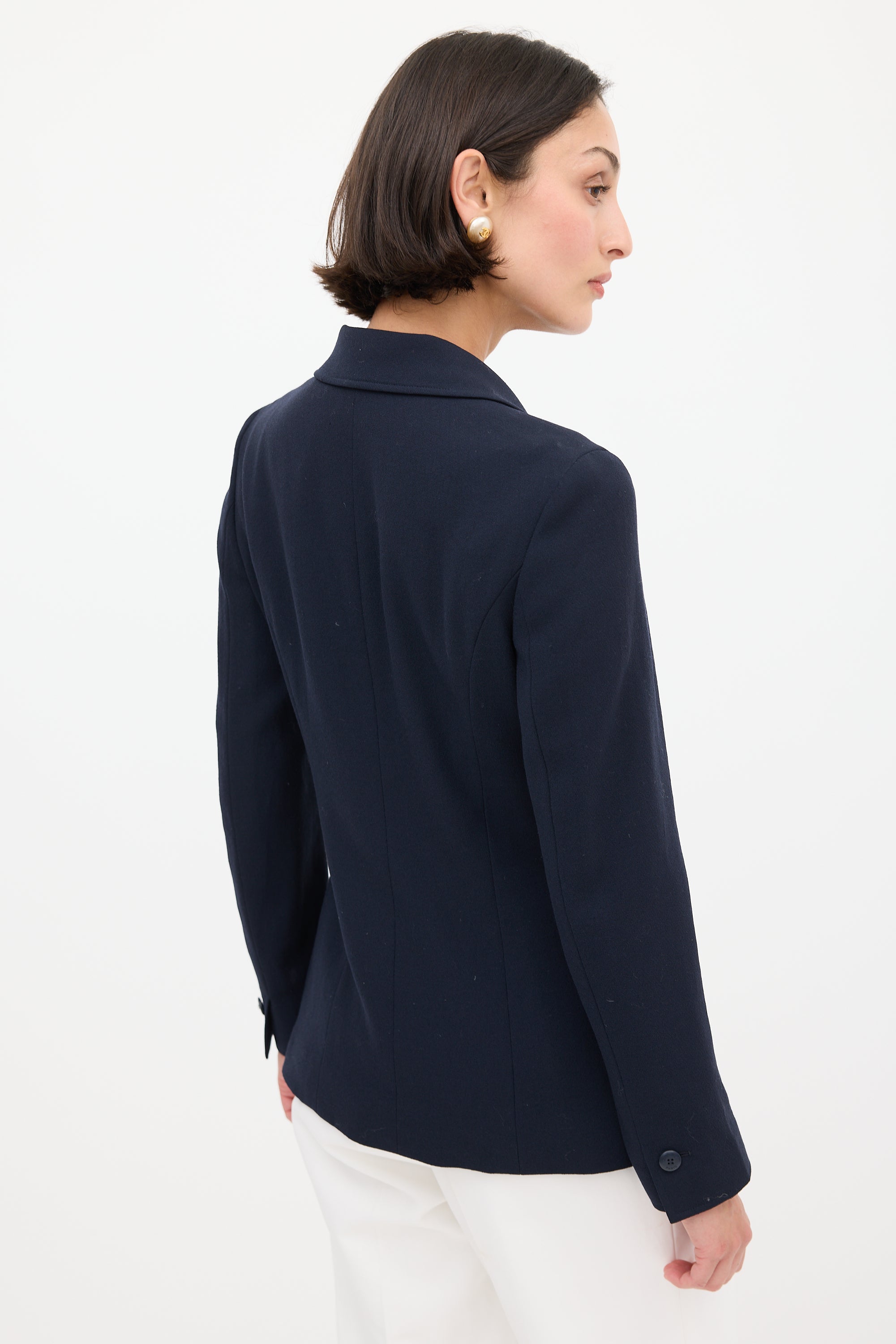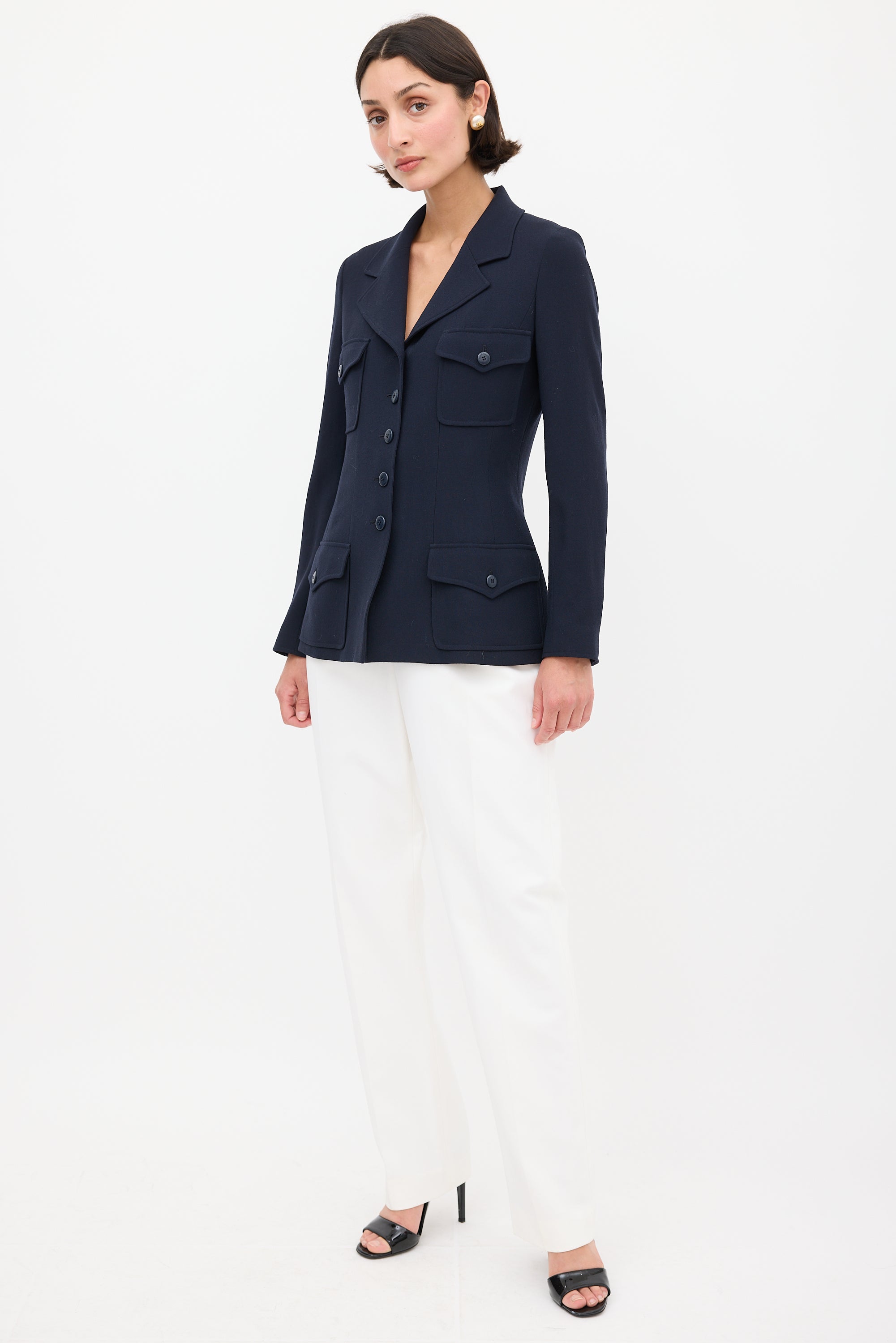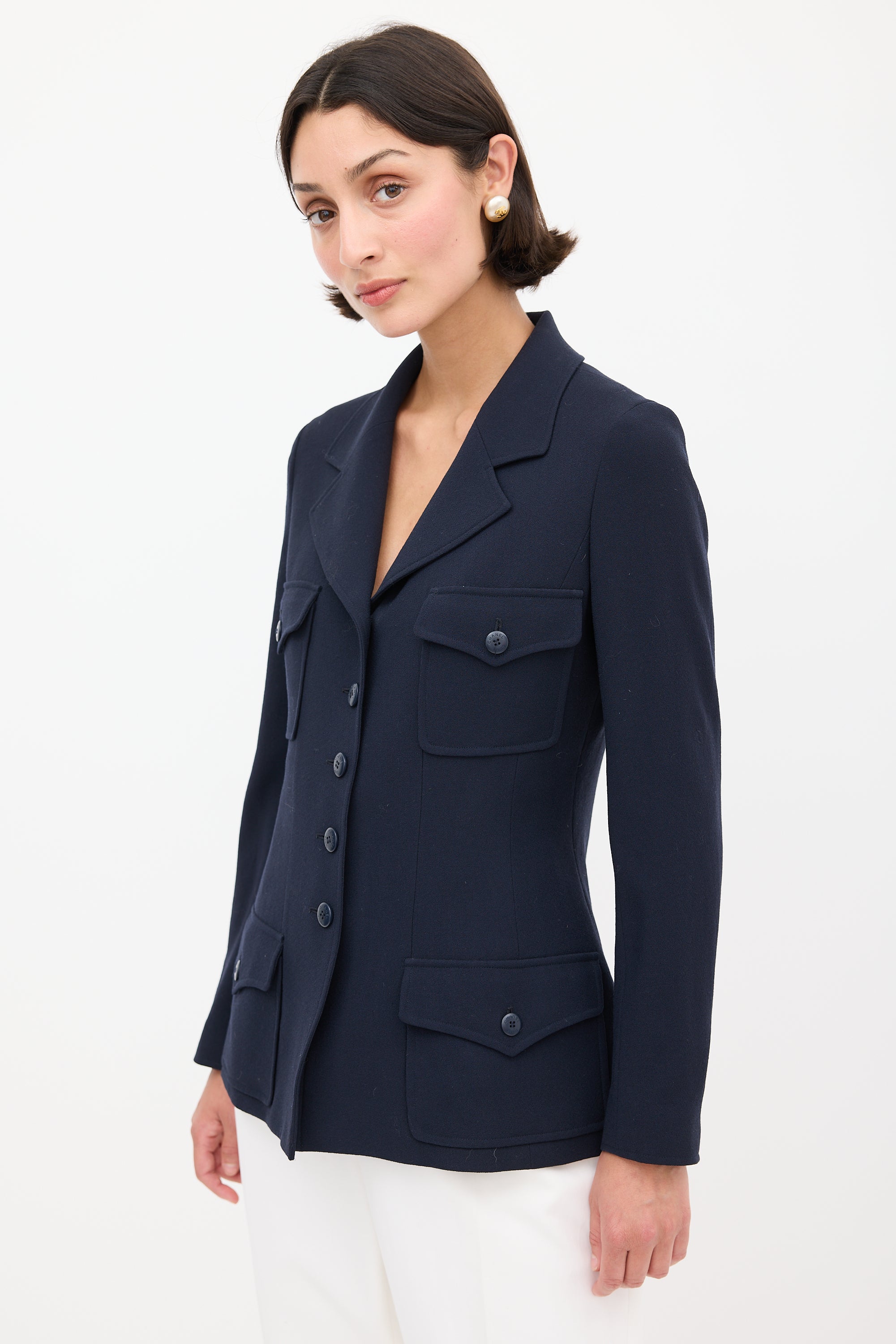 Pre-owned Chanel Fall/Winter 1997 navy wool blazer featuring a notched lapel, long sleeves with buttoned cuffs, four flap pockets at front, and button up closure. Lined.