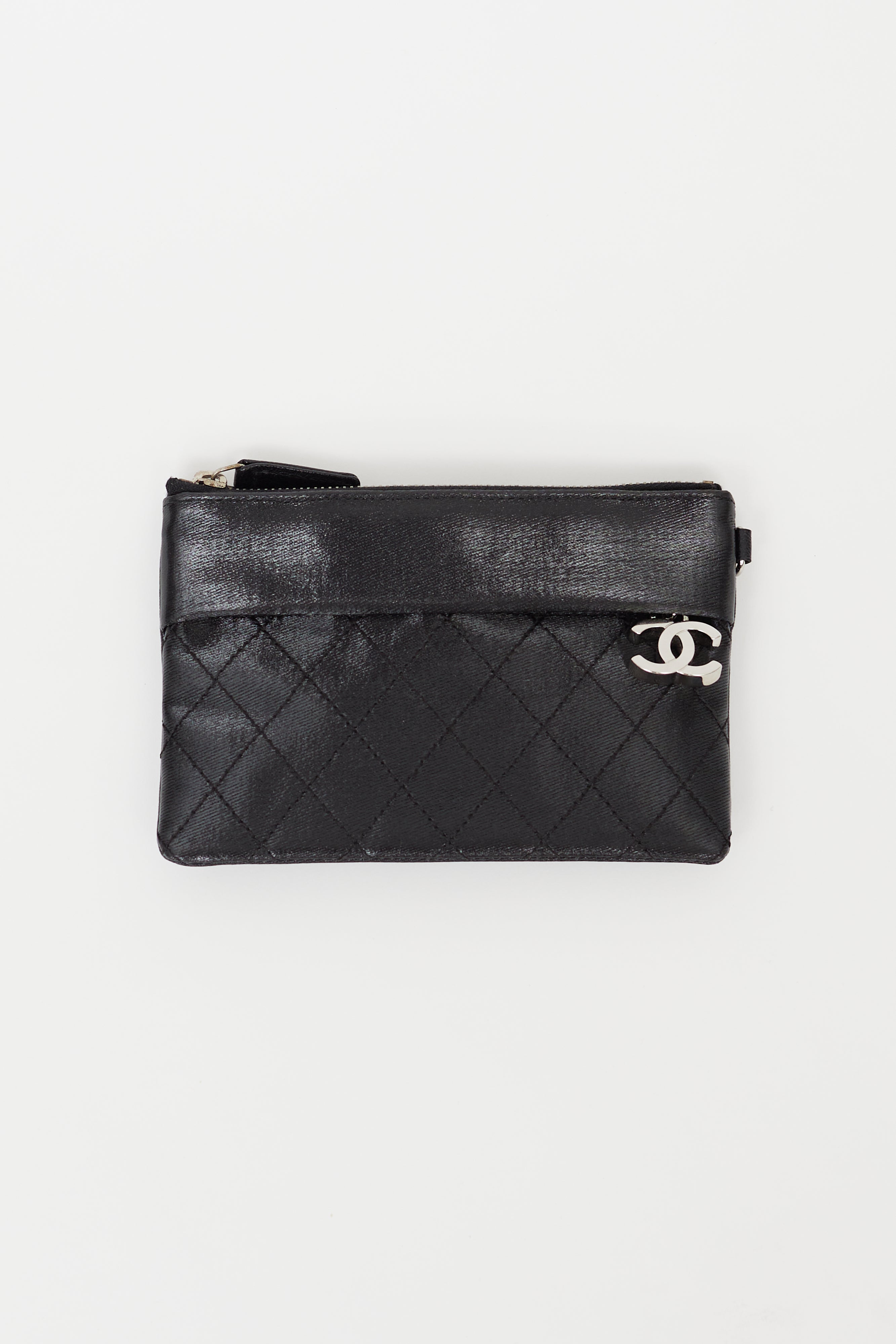 Pre-owned Fall 2007 Chanel black zip pouch featuring silver tone hardware, zip pocket at front with CC zip charm, metallised quilted base, four slip pockets at back, and middle compartment with logo tab inside. Comes with original box.