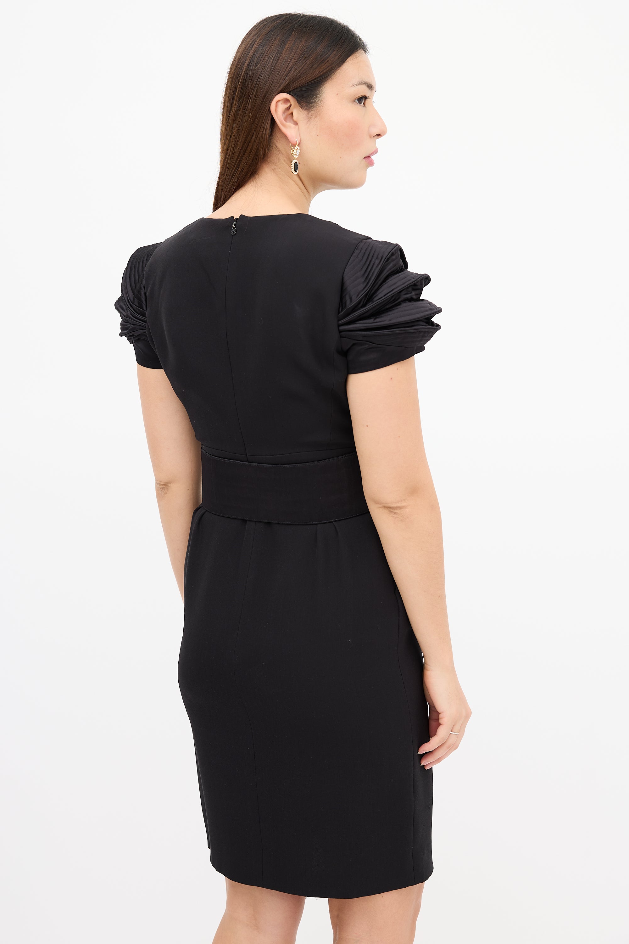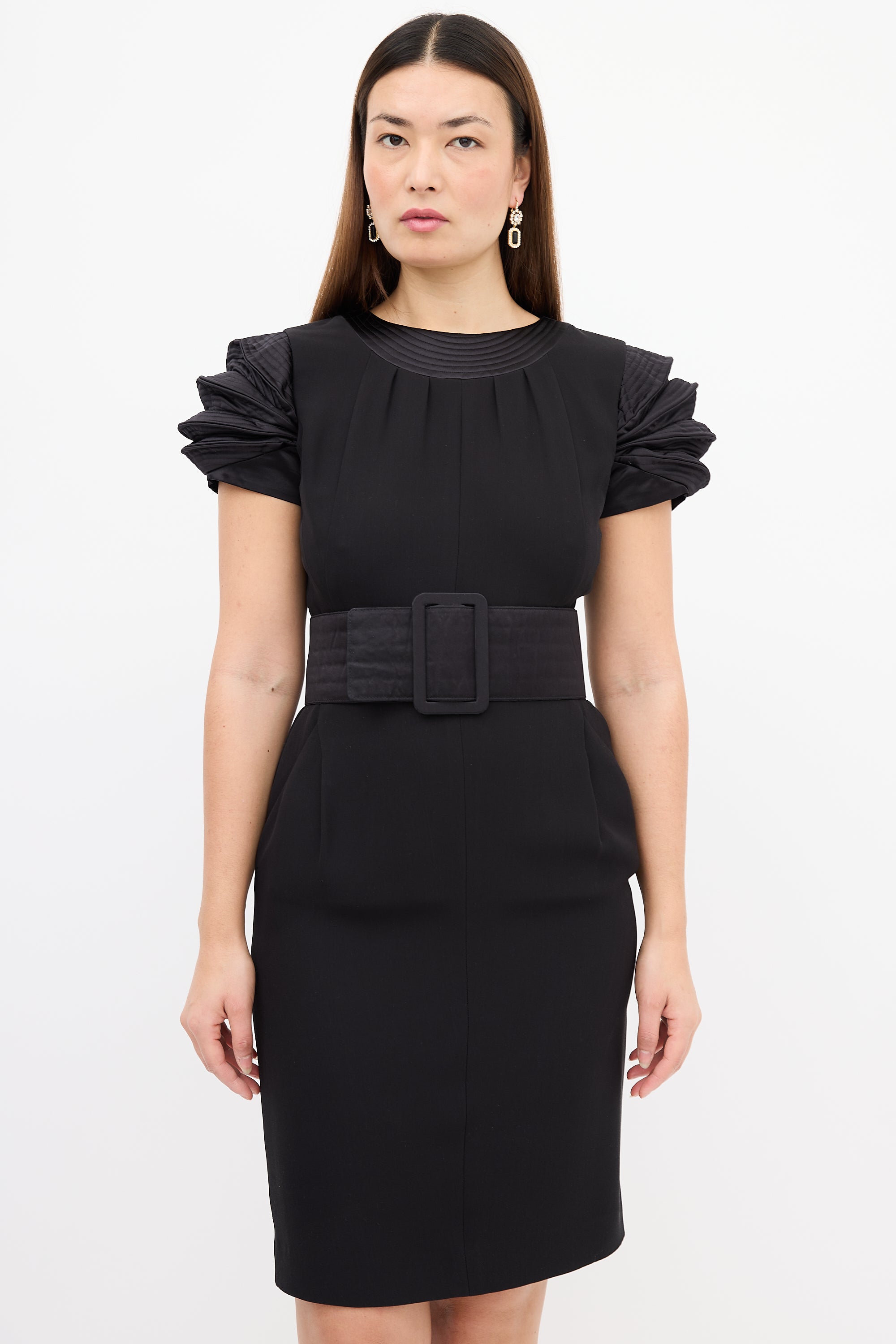 Pre-owned Chanel Fall 2008 black silk midi sheath dress featuring a round neckline with front pleats, slash pockets at front hip, tiered cap sleeve, concealed back zip, and quilt stitching at collar, sleeves, and waist belt. Lined.