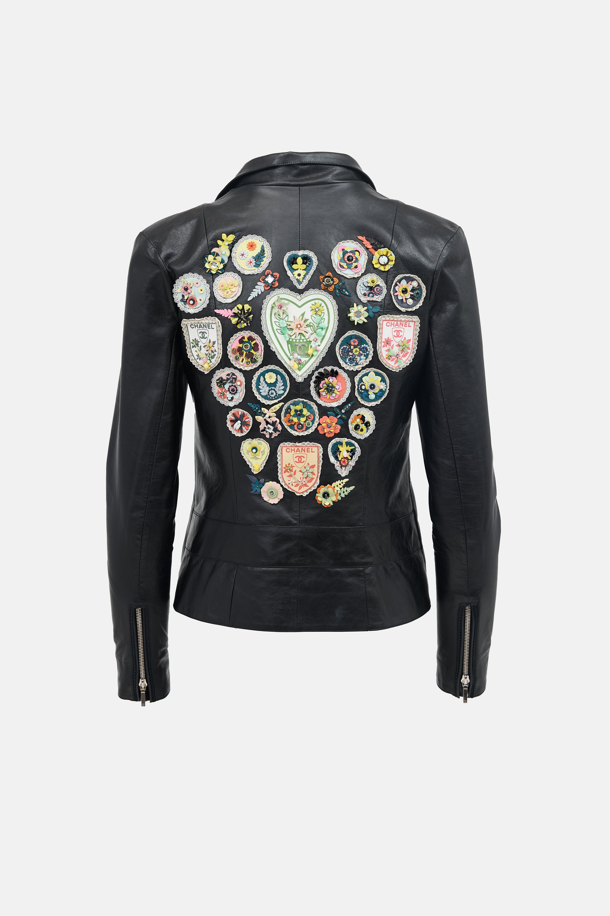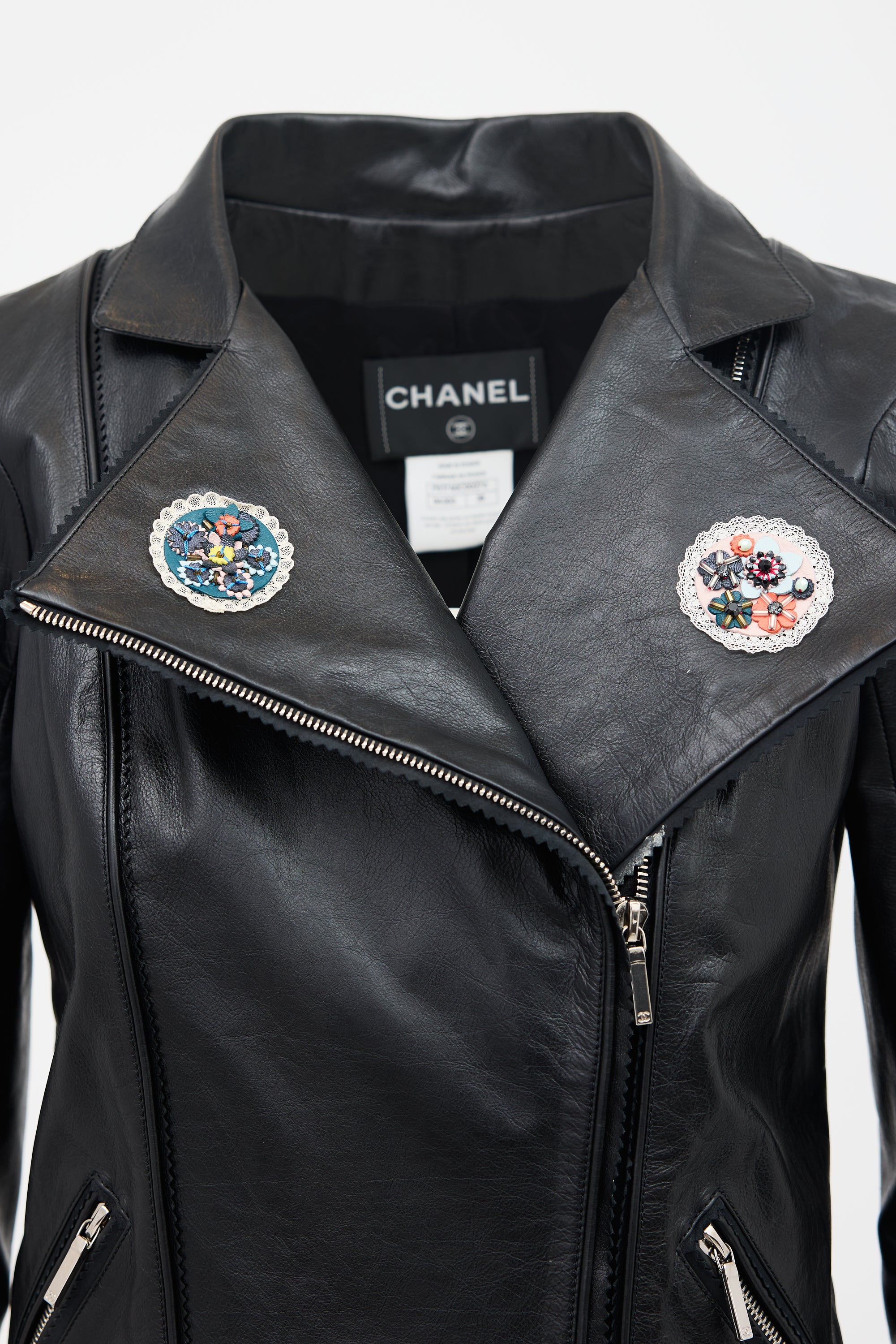 Pre-owned Chanel black leather biker jacket featuring multicolour floral and logo patches, notched lapel, asymmetrical front zip, zip pockets, zip cuffs, and scalloped trim. Lined.