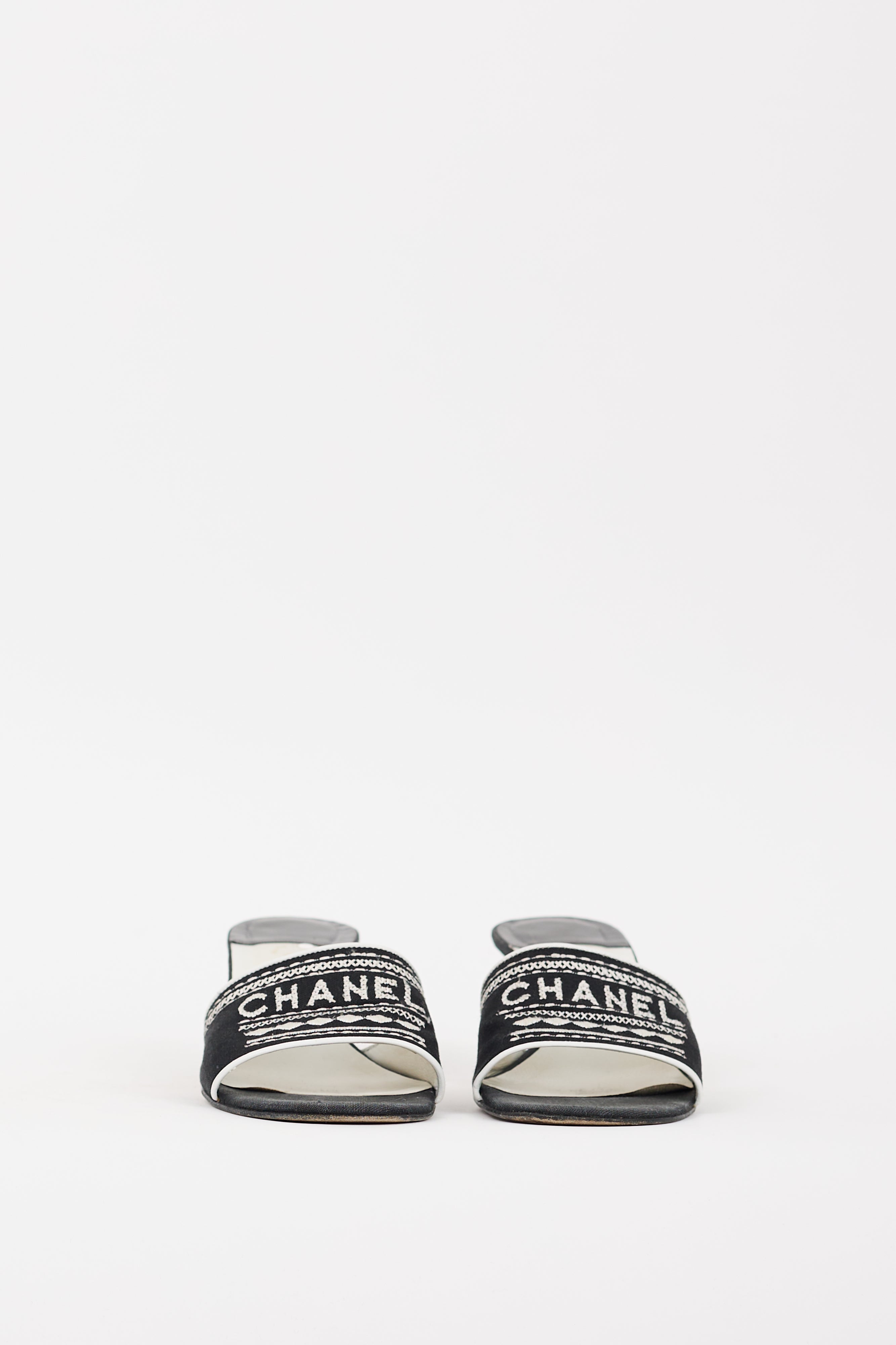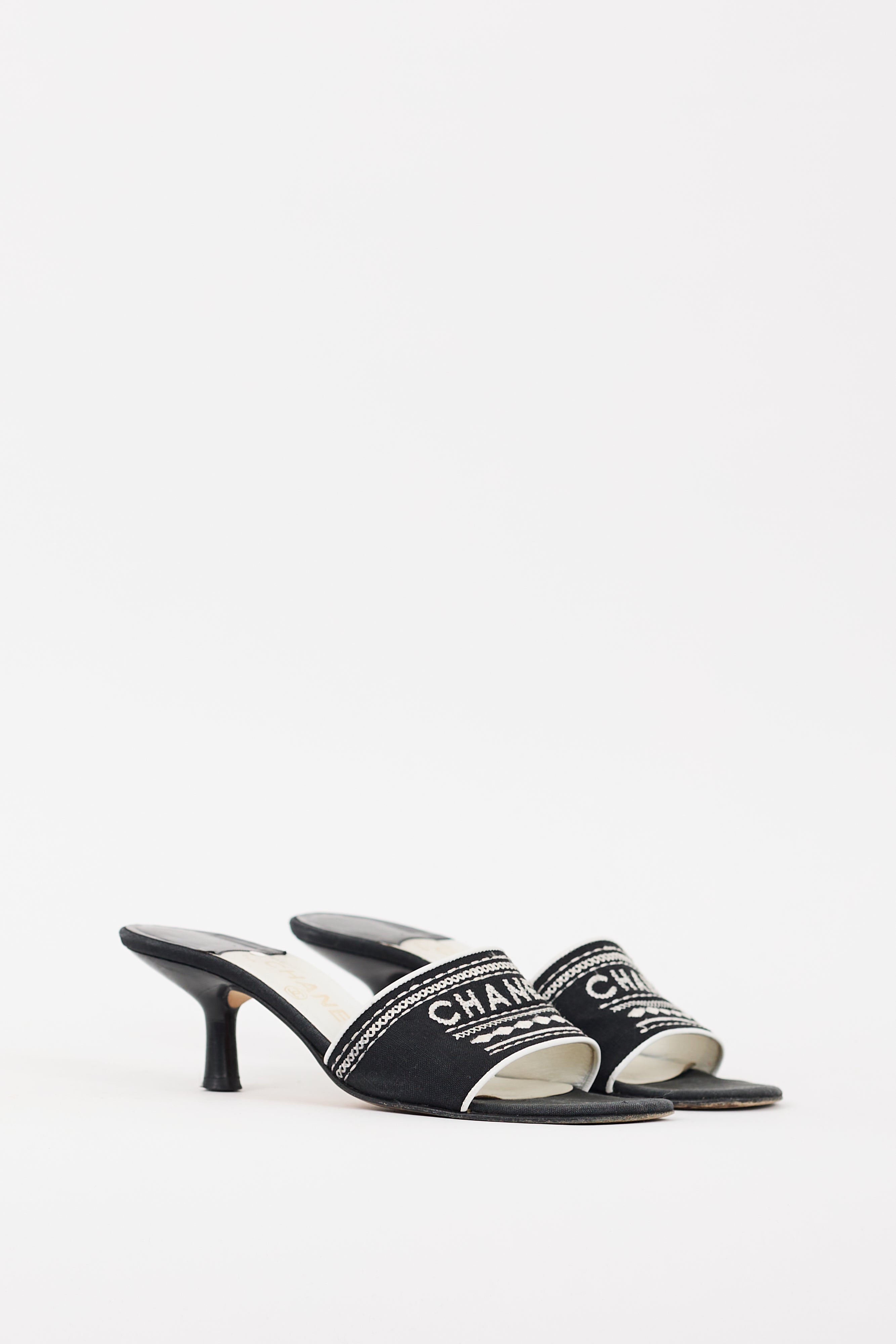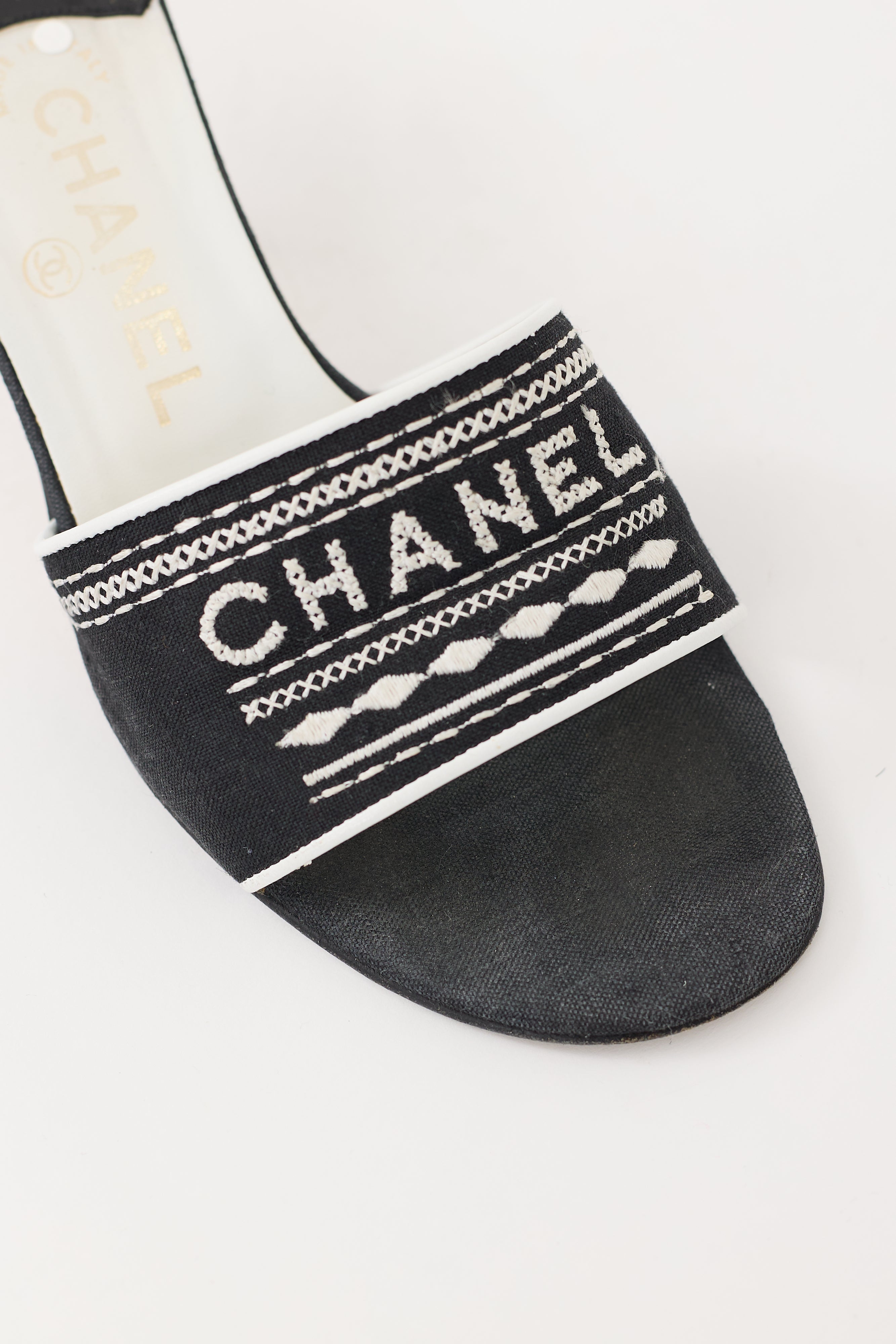 Pre-owned Chanel Spring/Summer 2001 black mules featuring an open rounded toe, strap across vamp with white decorative and logo embroidery, and kitten heel. Comes with original box.