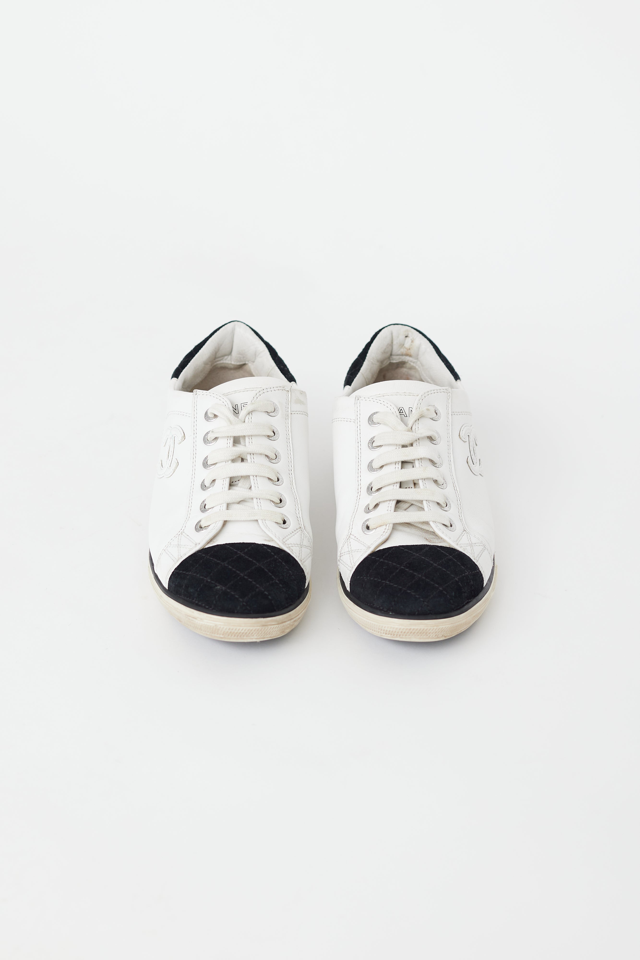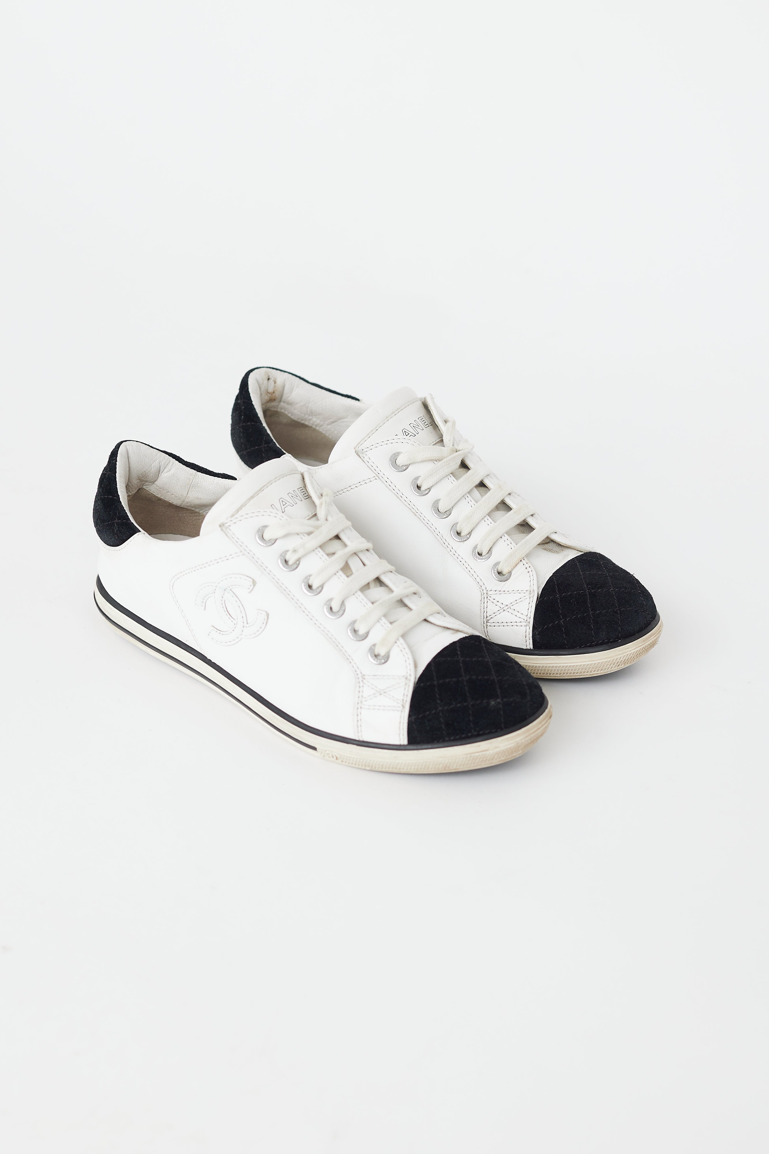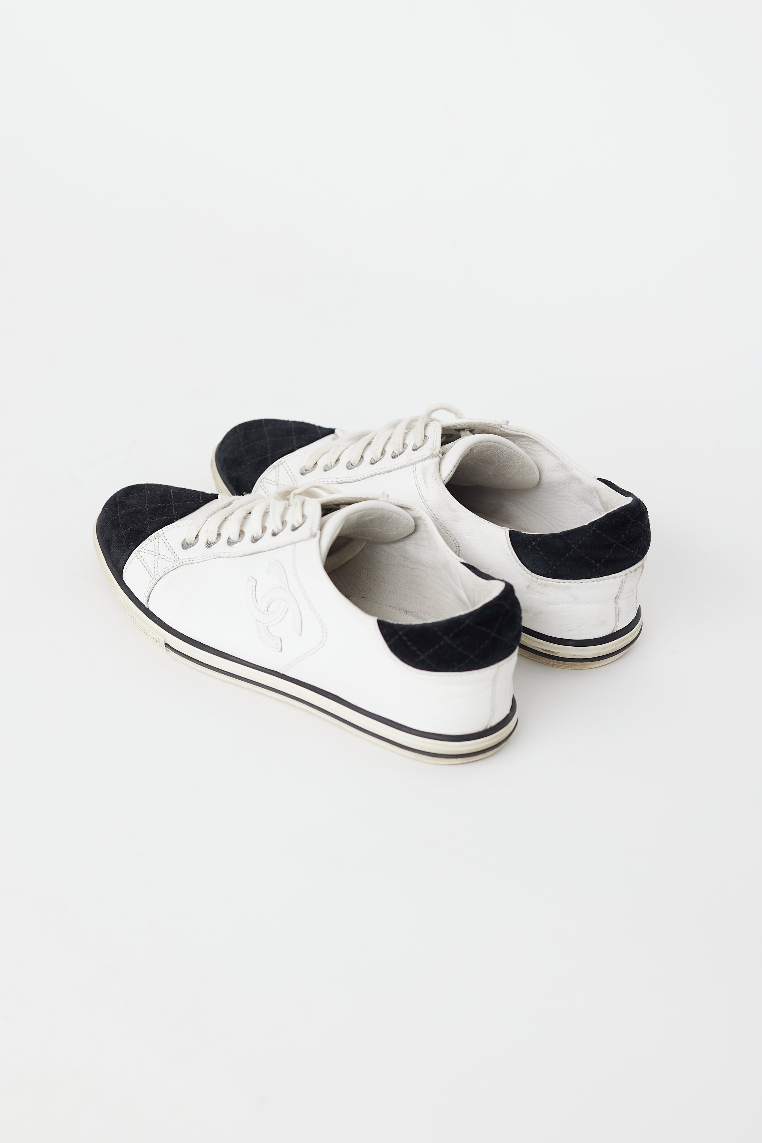 Pre-owned Chanel white and black sneakers featuring quilted suede toe cap and heel counter, rounded toe, lace up front, CC logo at outer side, and black and white rubber midsole.