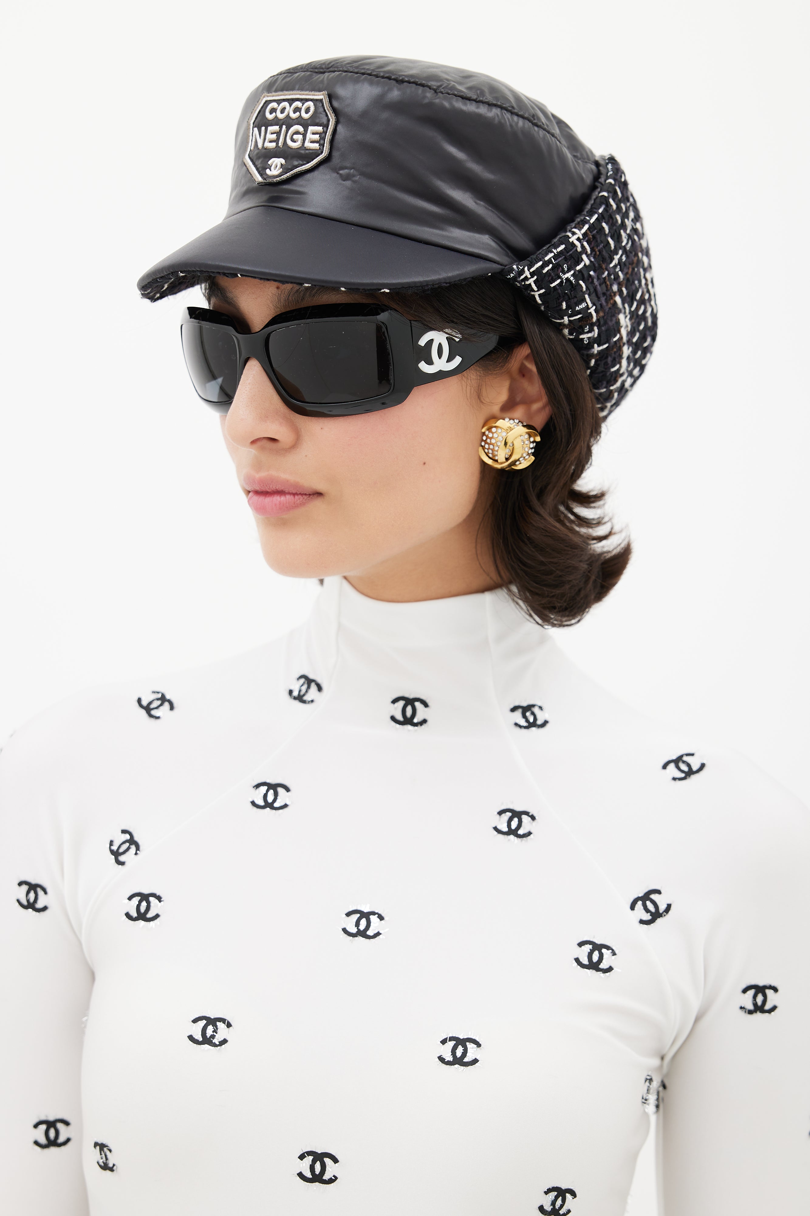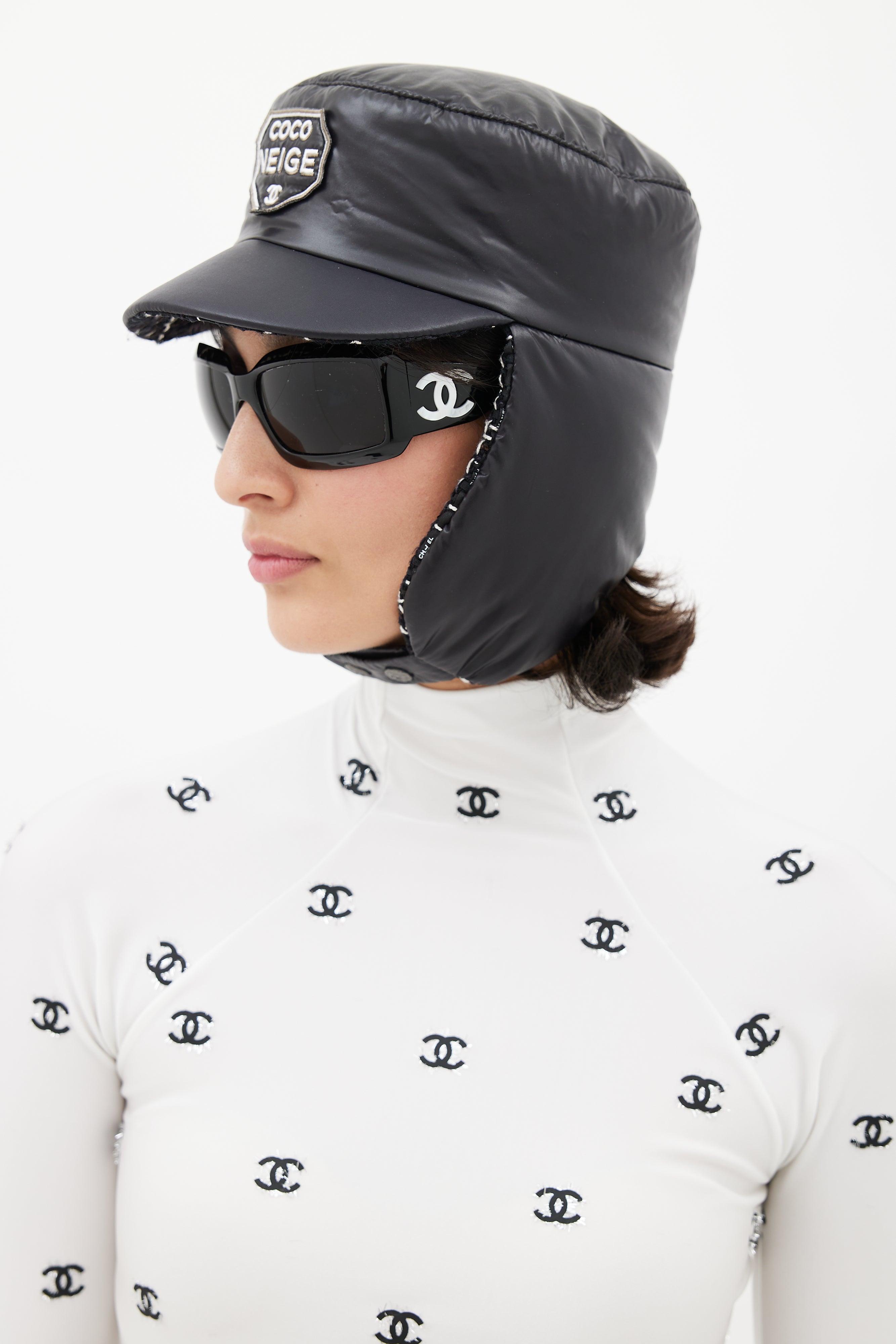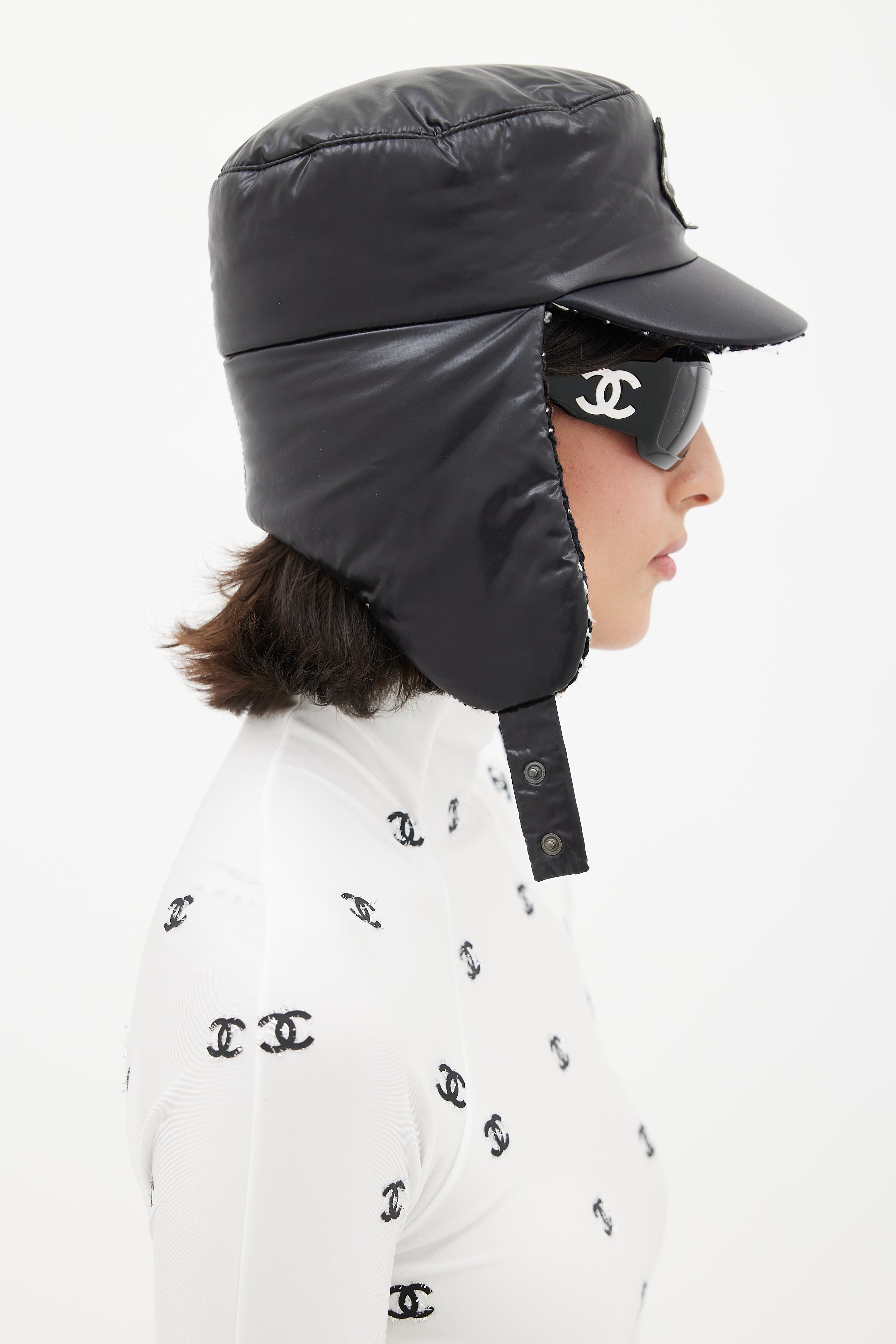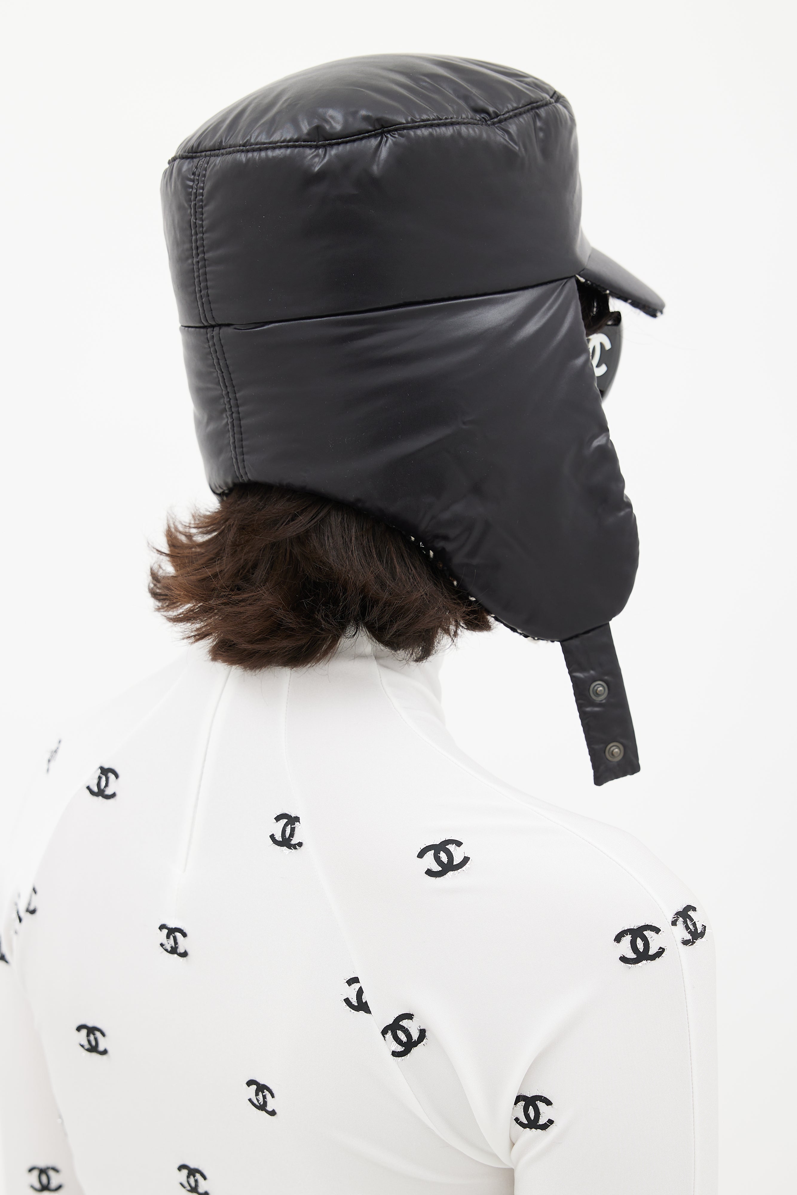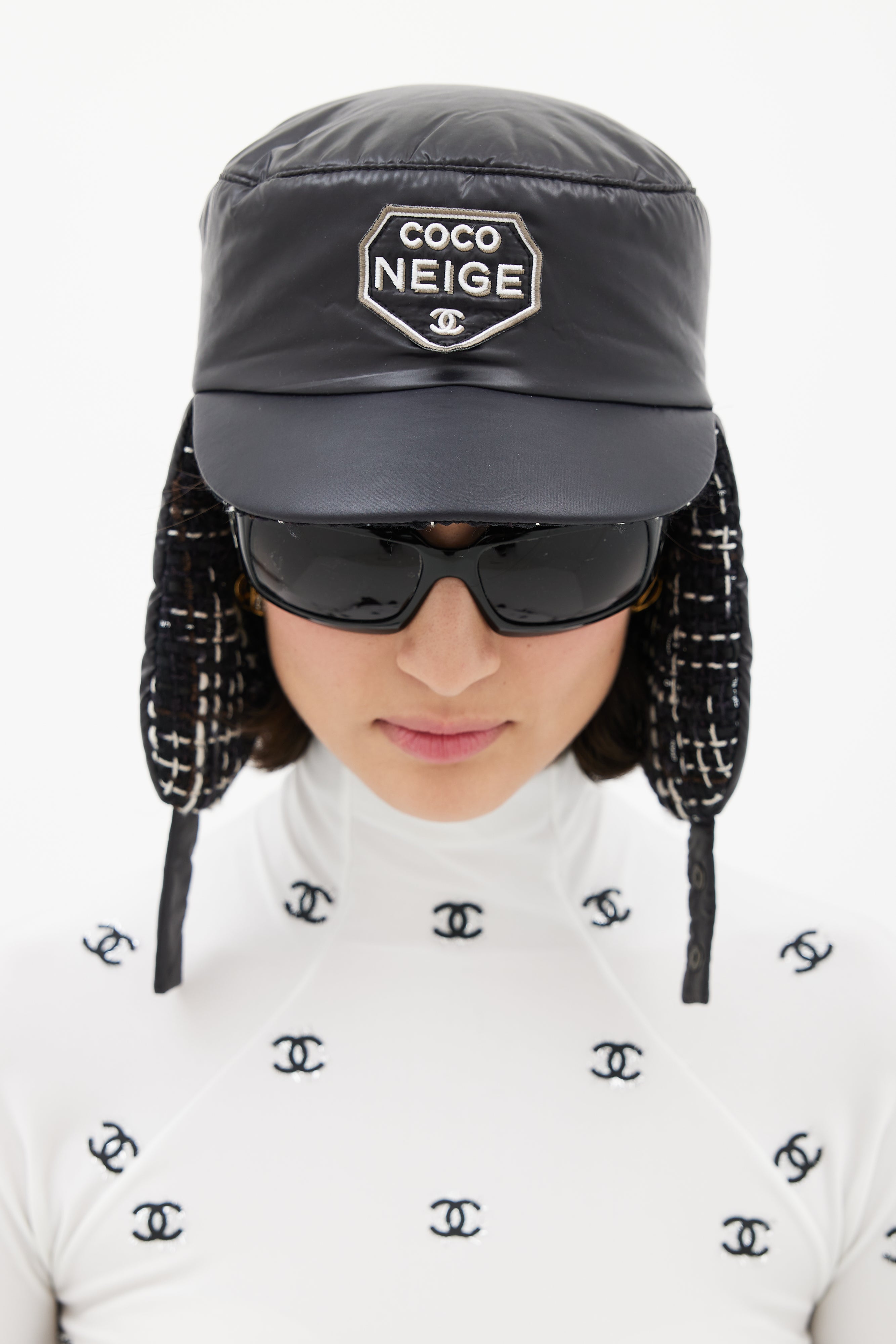 Pre-owned Winter 2018 Chanel black trapper hat featuring "Coco Neige" patch at front, puffer upper, tweed lining at flaps and under brim, and snap button fastening.