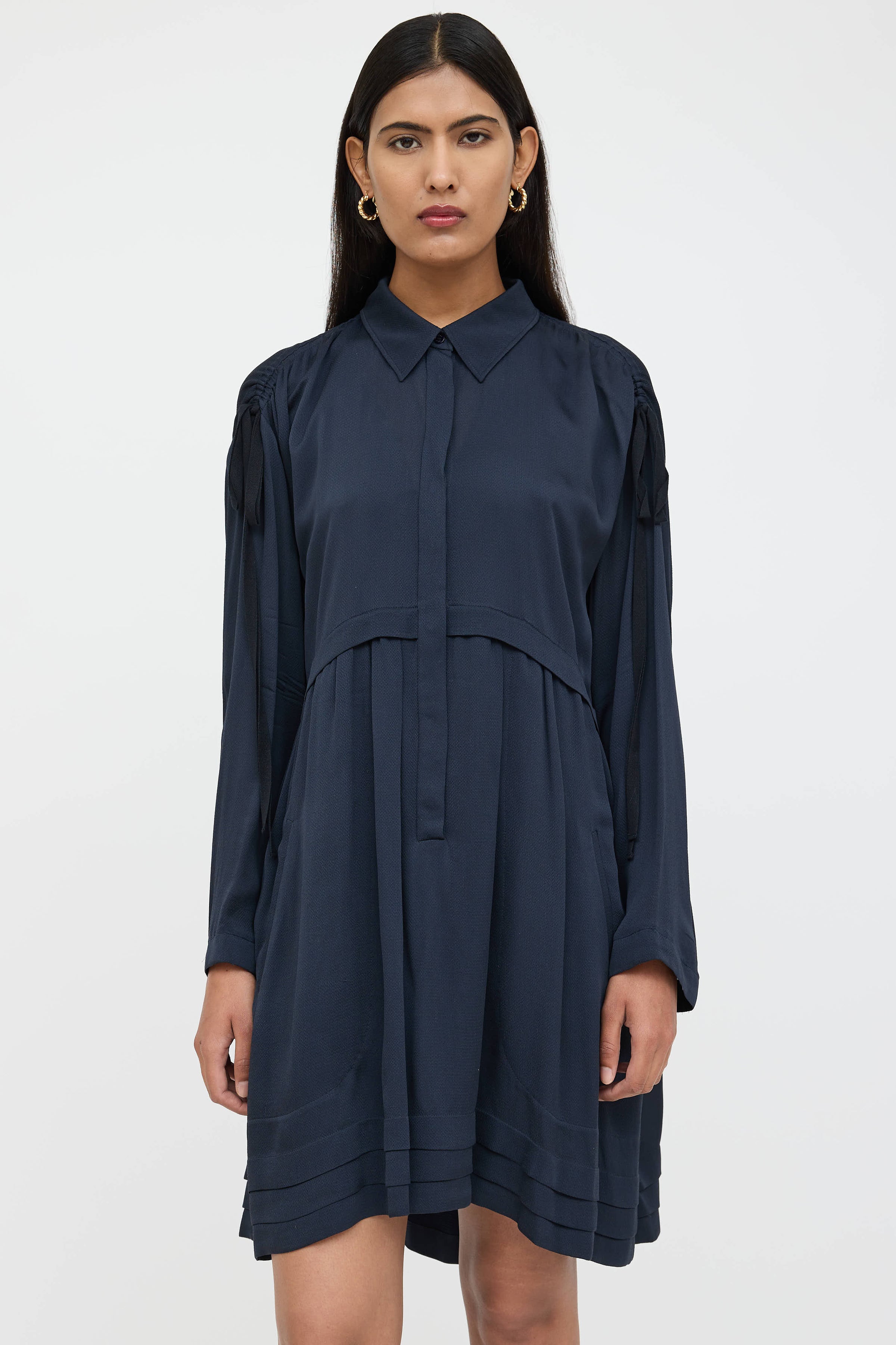 Pre-owned Chloé navy shirt dress featuring a pointed collar, long sleeves, cinch tie detail at shoulders, and quarter button up closure. Includes matching slip.