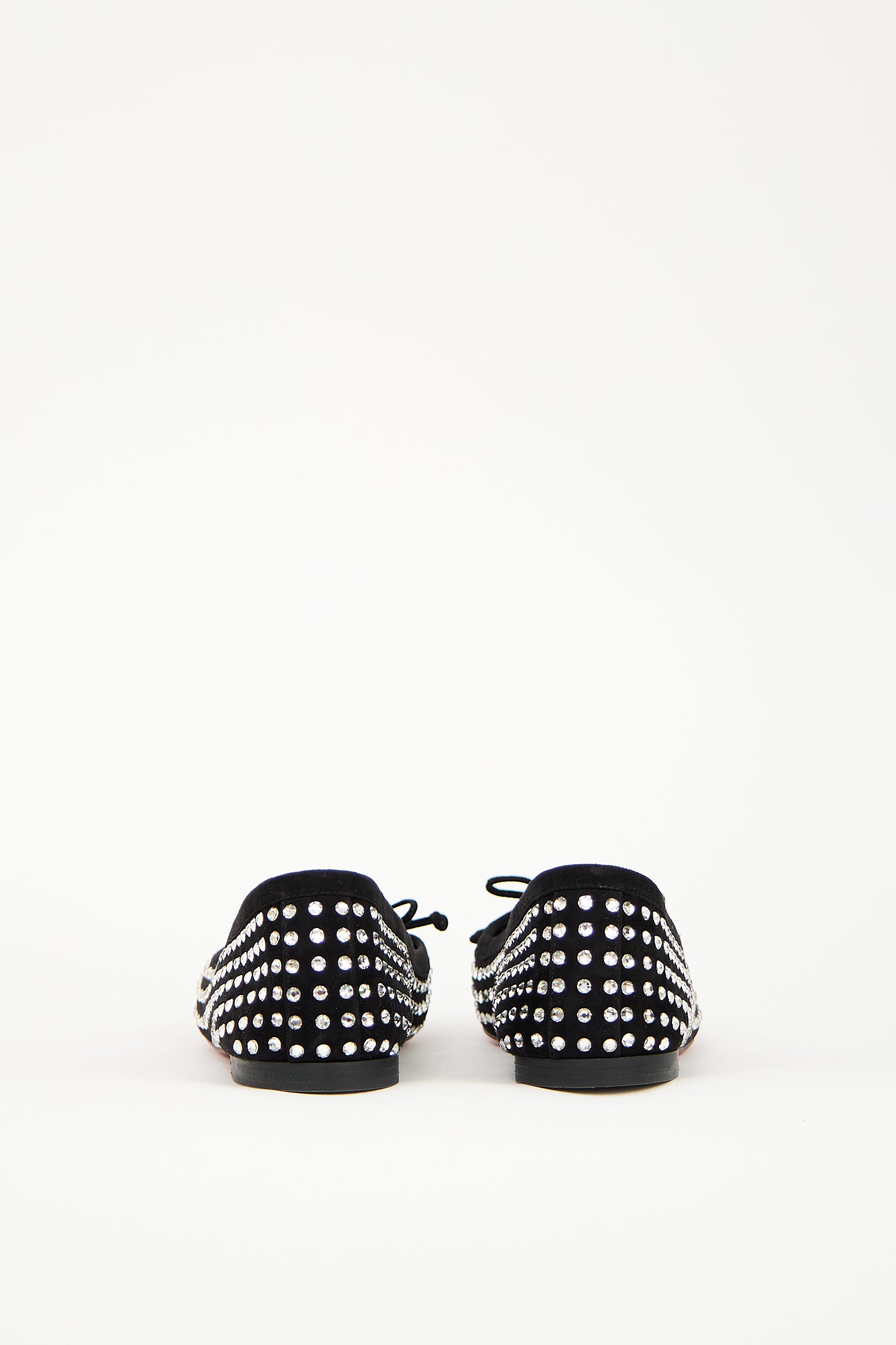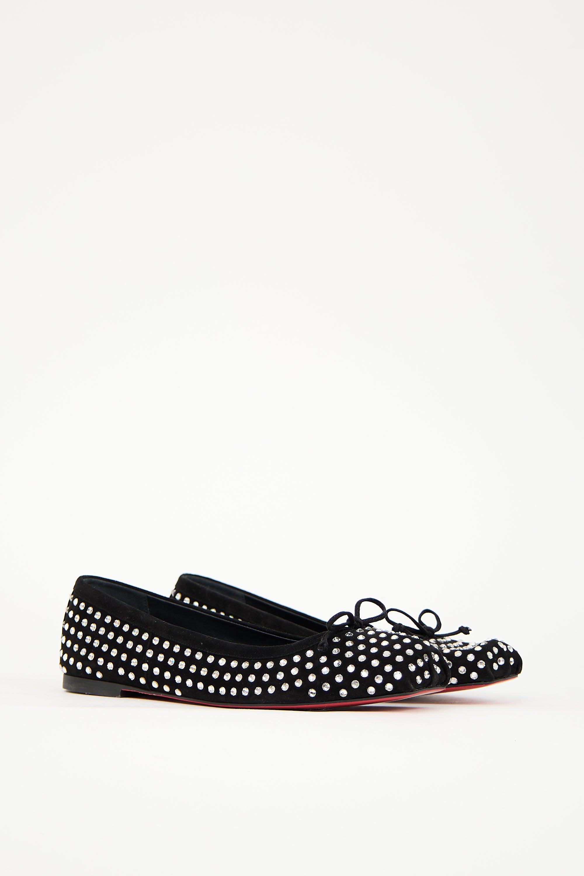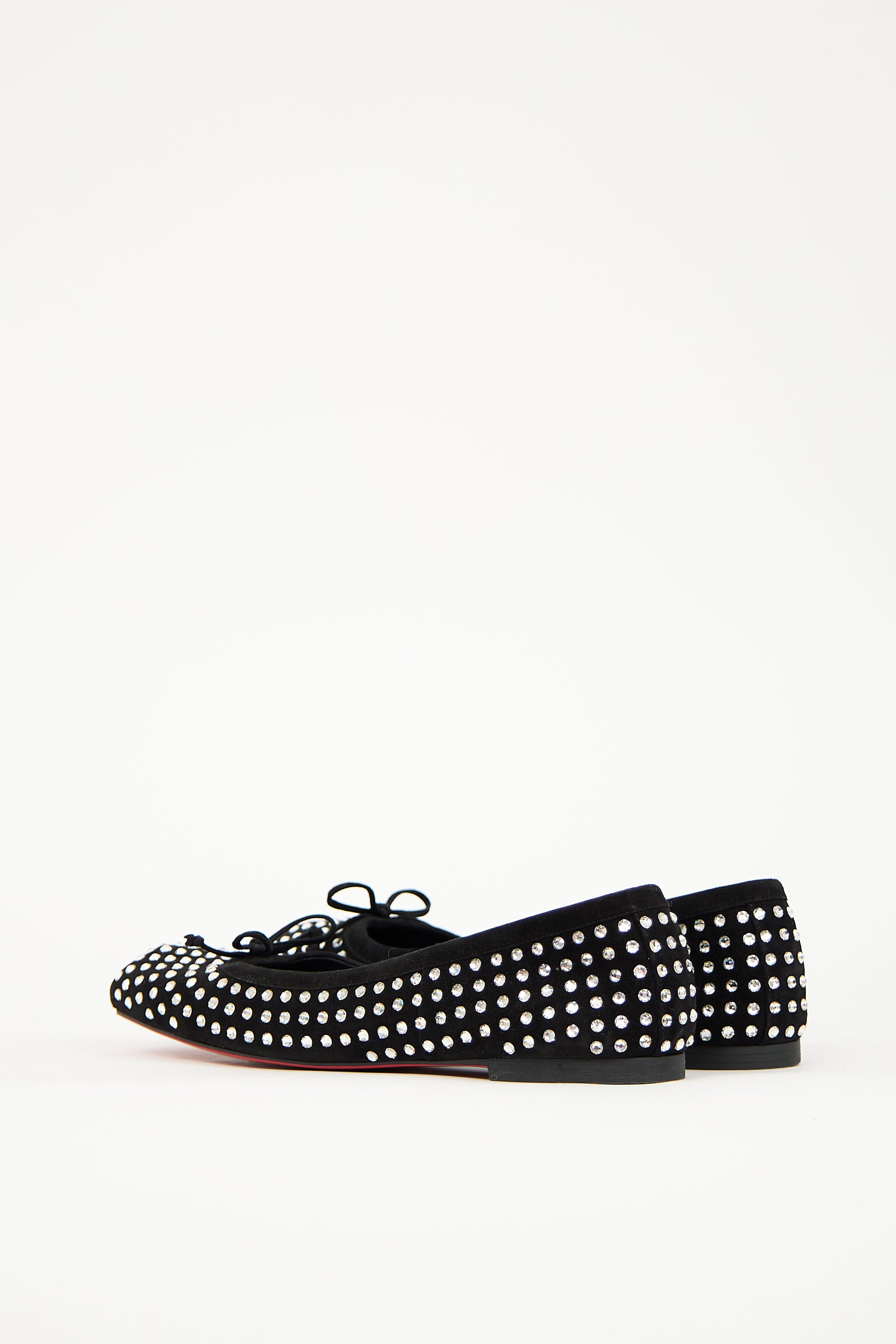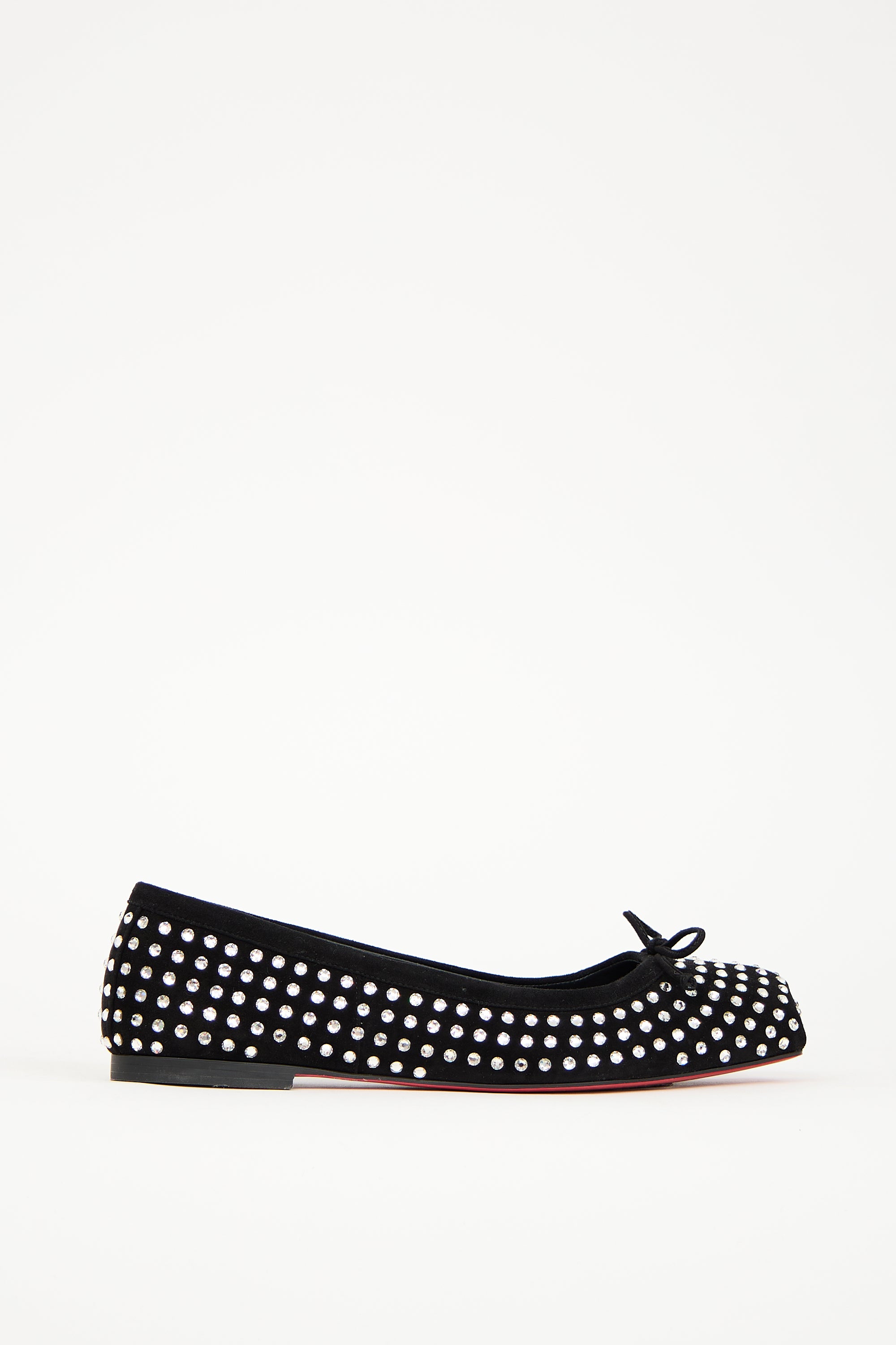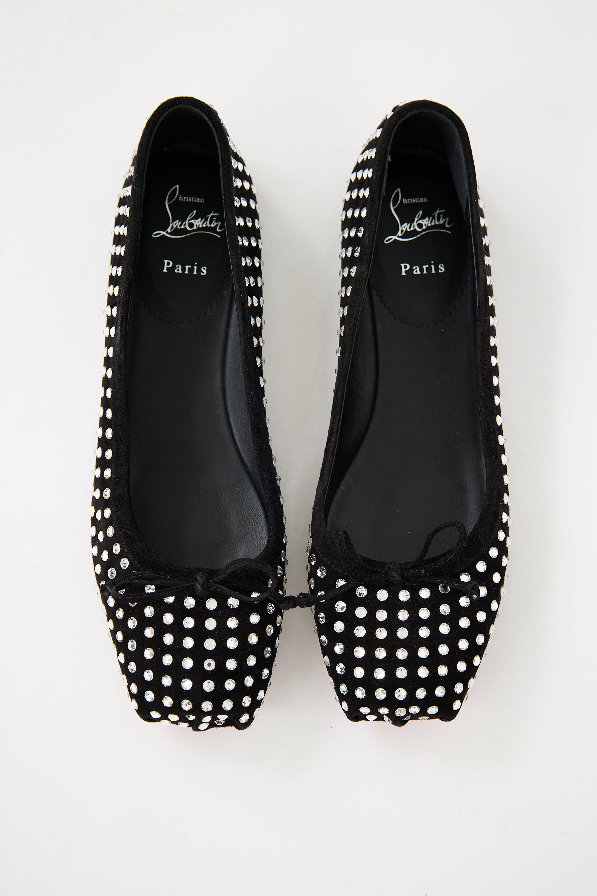 Pre-owned Christian Louboutin black suede Mamadrague flats featuring ruched square toe, crystal embellishment throughout, bow at topline, slip on entry, and covered block heel.