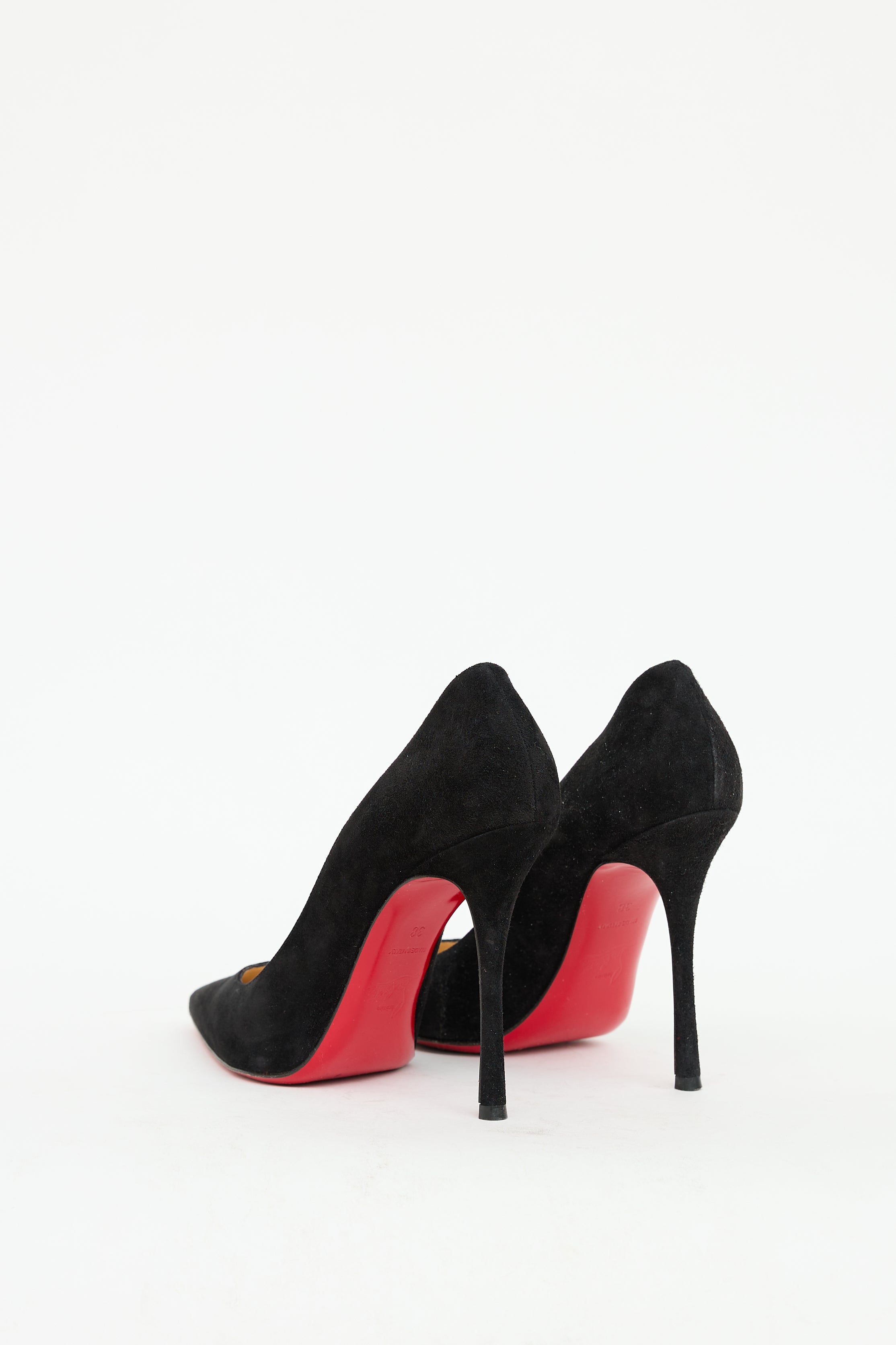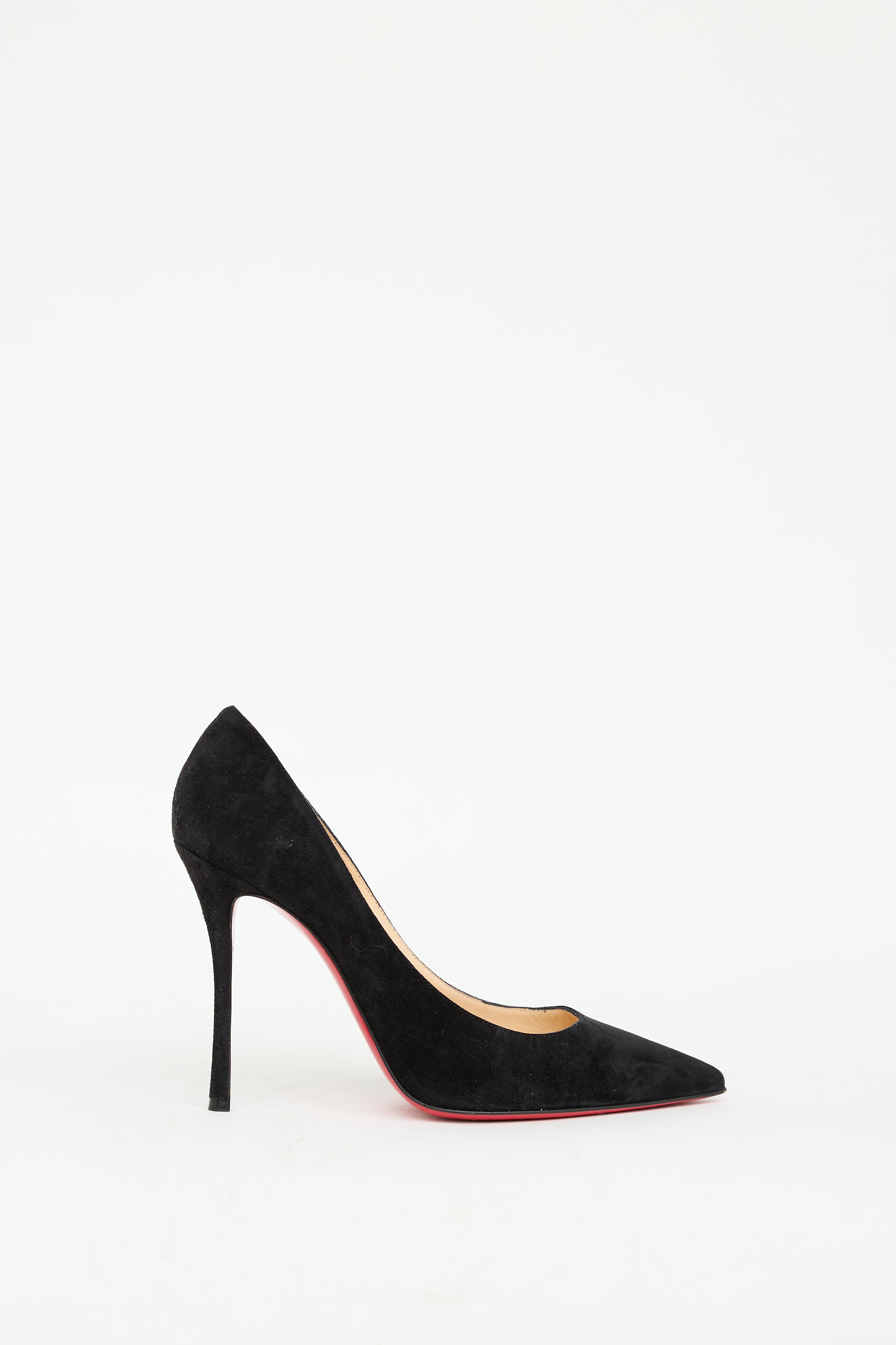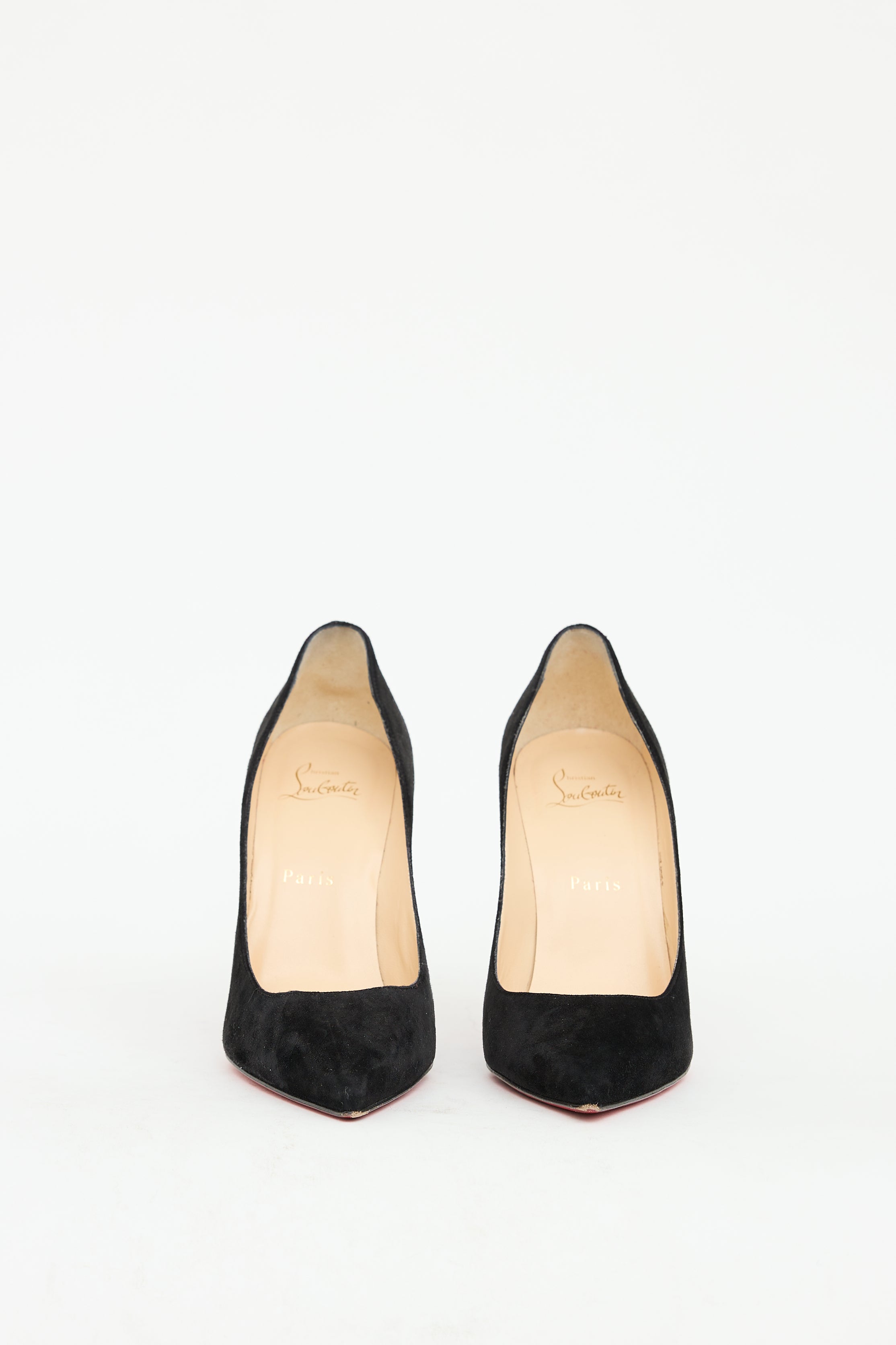 Pre-owned Christian Louboutin black Kate suede heels featuring a pointed toe, wrapped stiletto heel, and slip on entry.