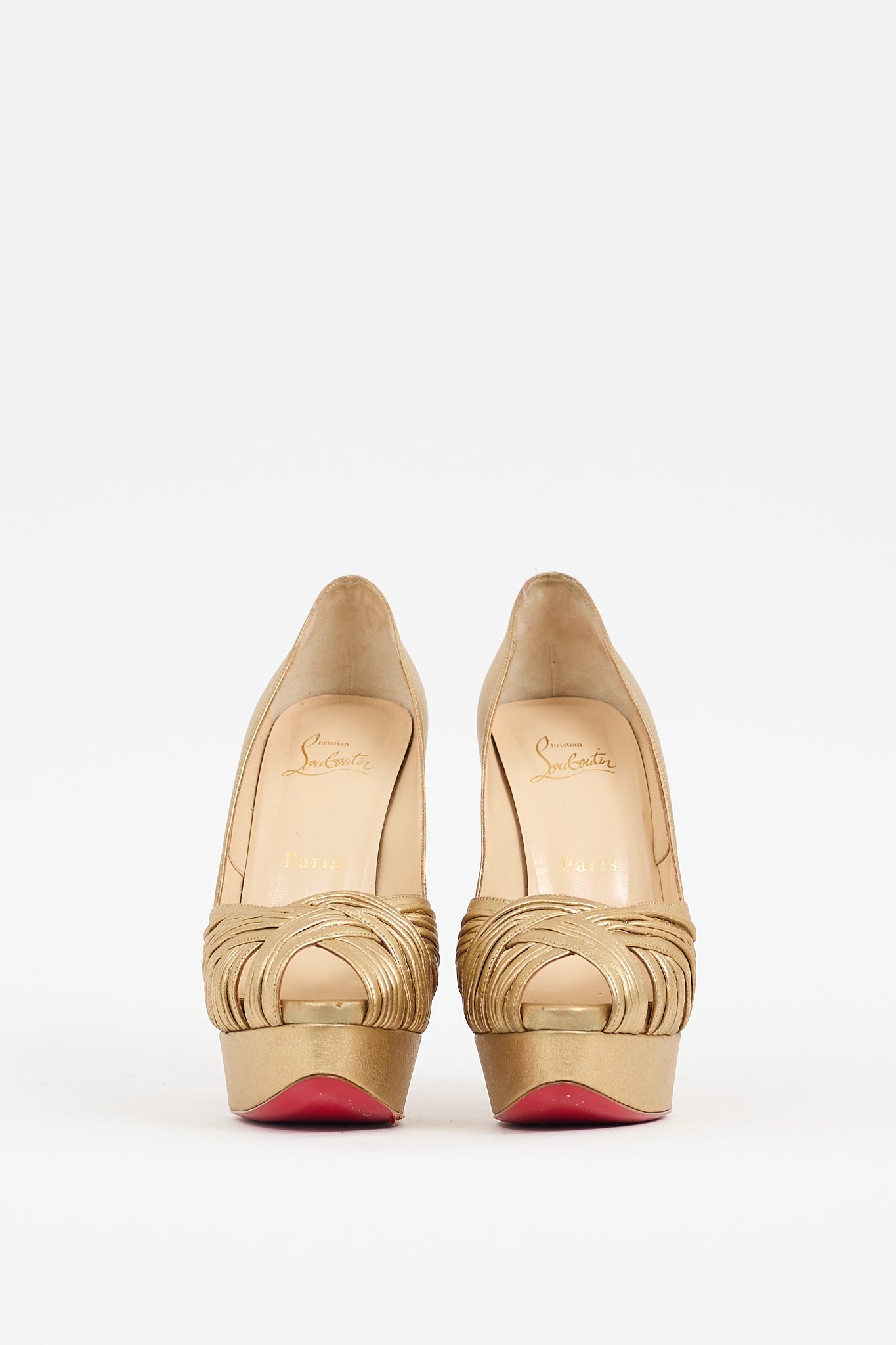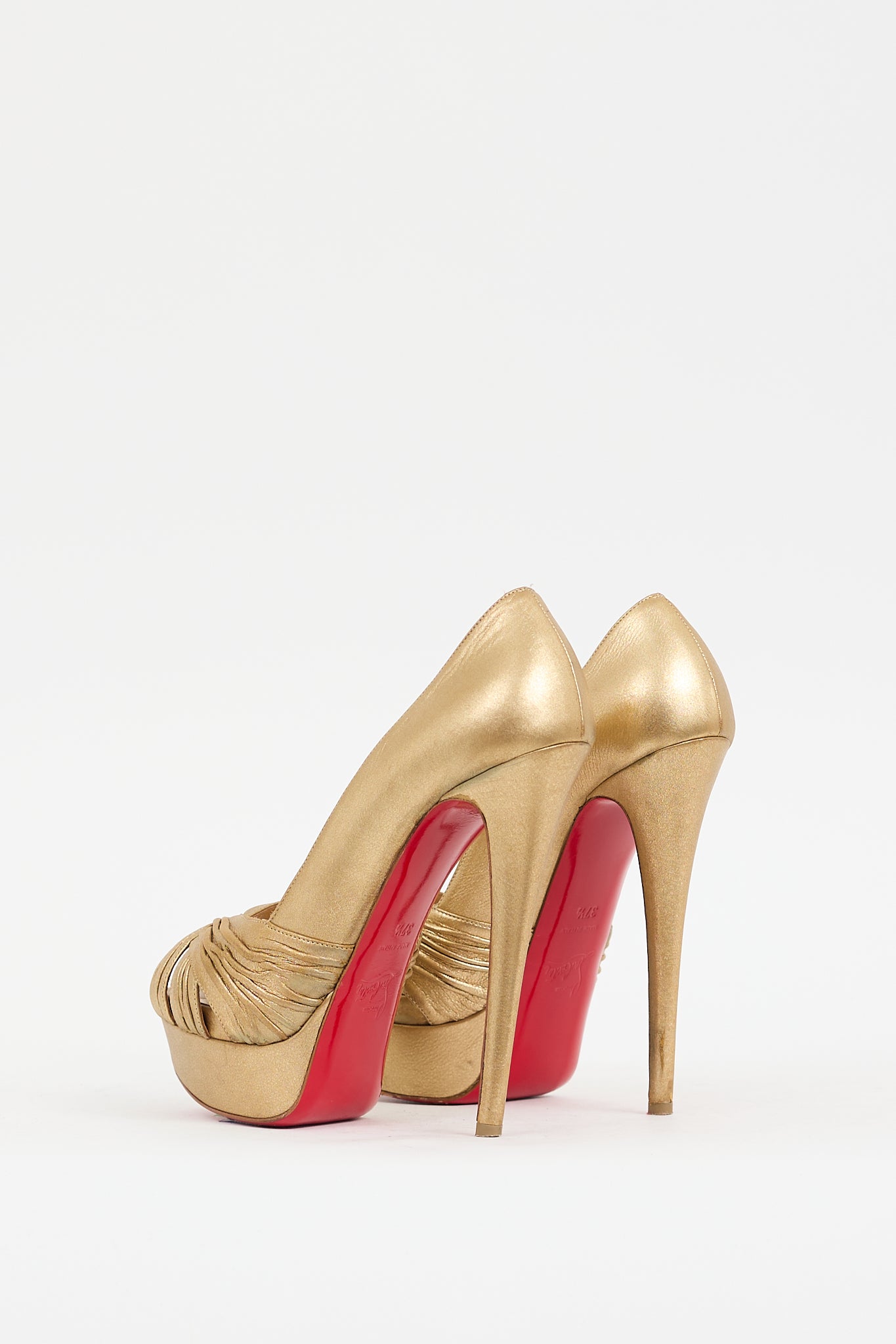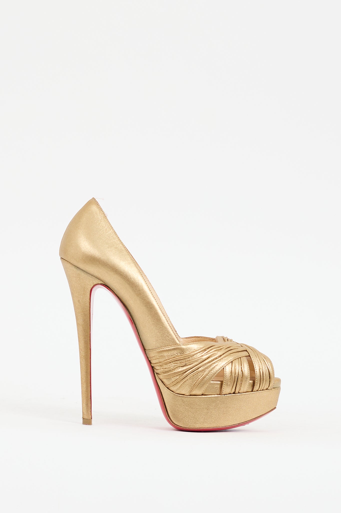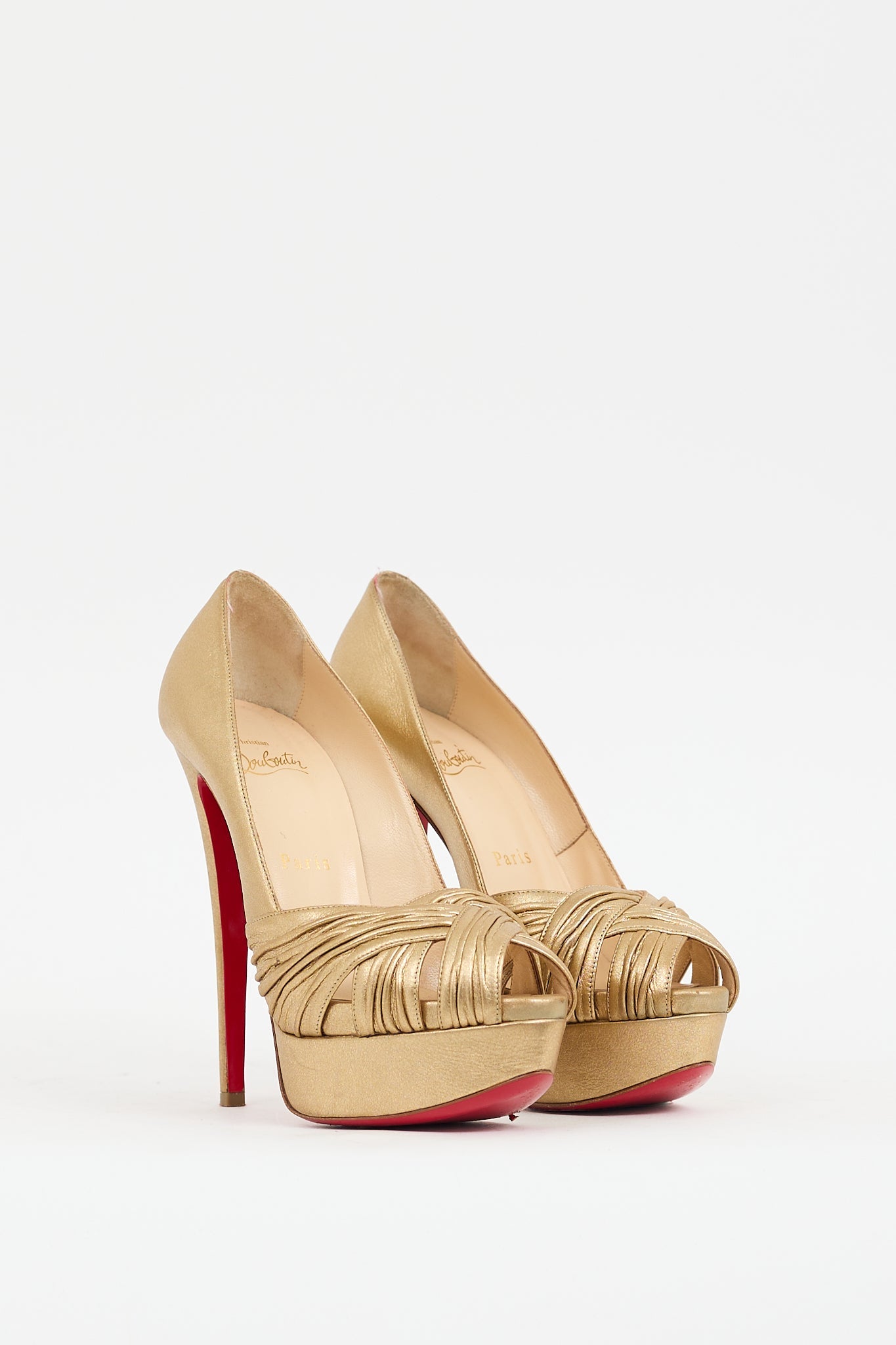 Pre-owned Christian Louboutin gold leather Aborina pumps featuring peep almond toe, pleated detail at vamp, slip on entry, platform toe box, stiletto heel, and signature red lacquered outsole. Comes with original dust bag.