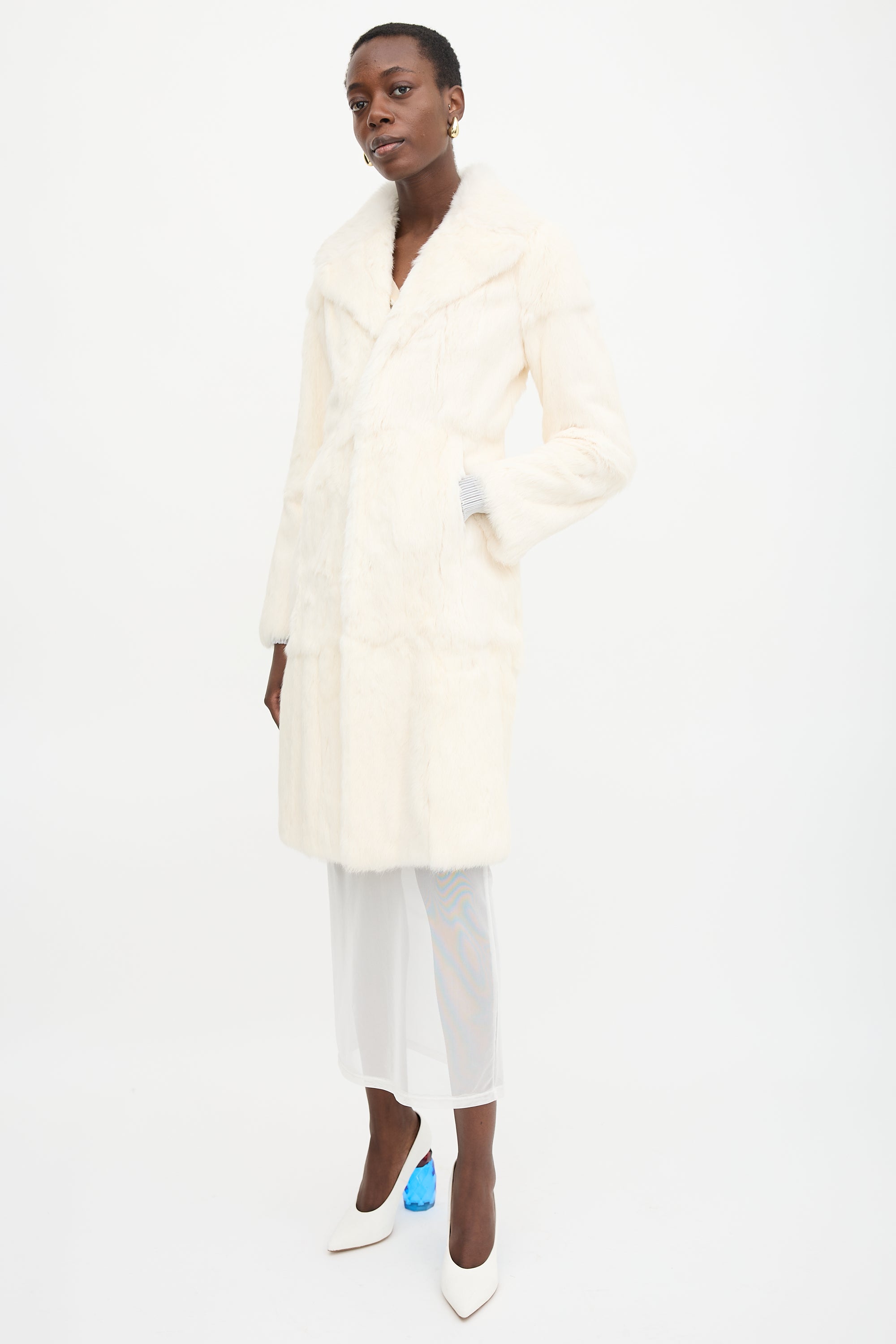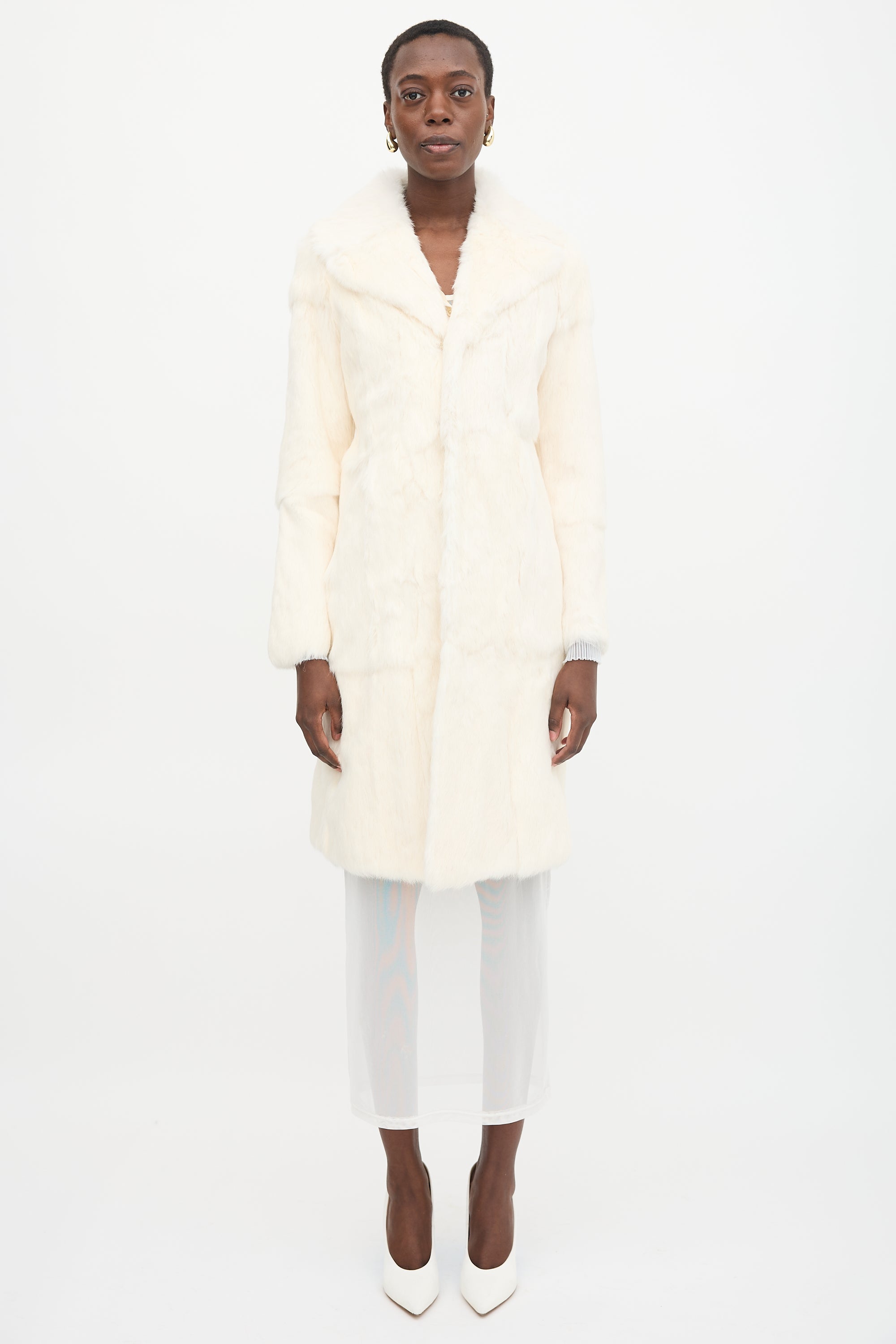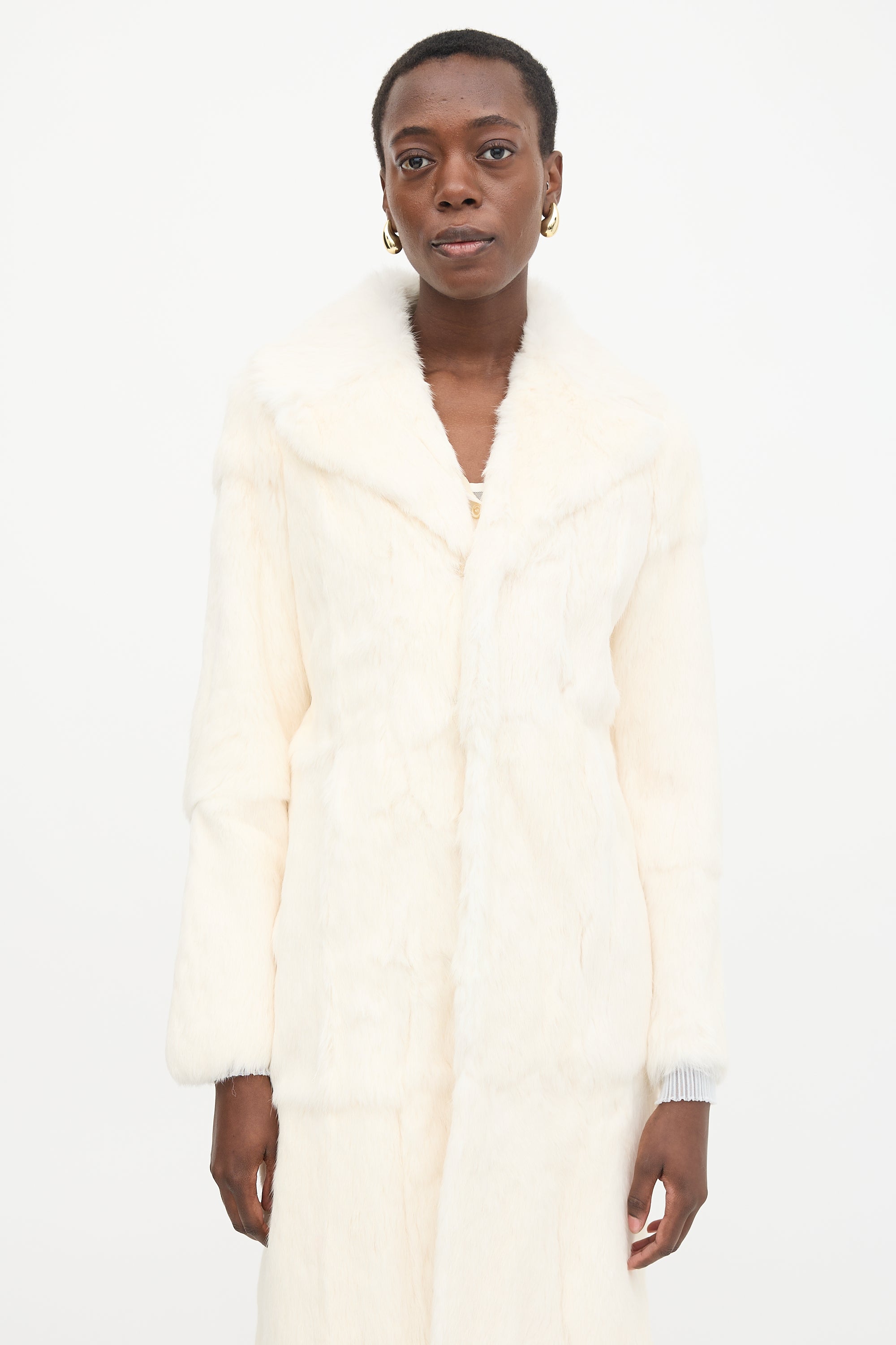 Pre-owned Diesel white fur coat featuring wide collar and lapel, hook and eye front closure, and two front slip pockets. Lined.