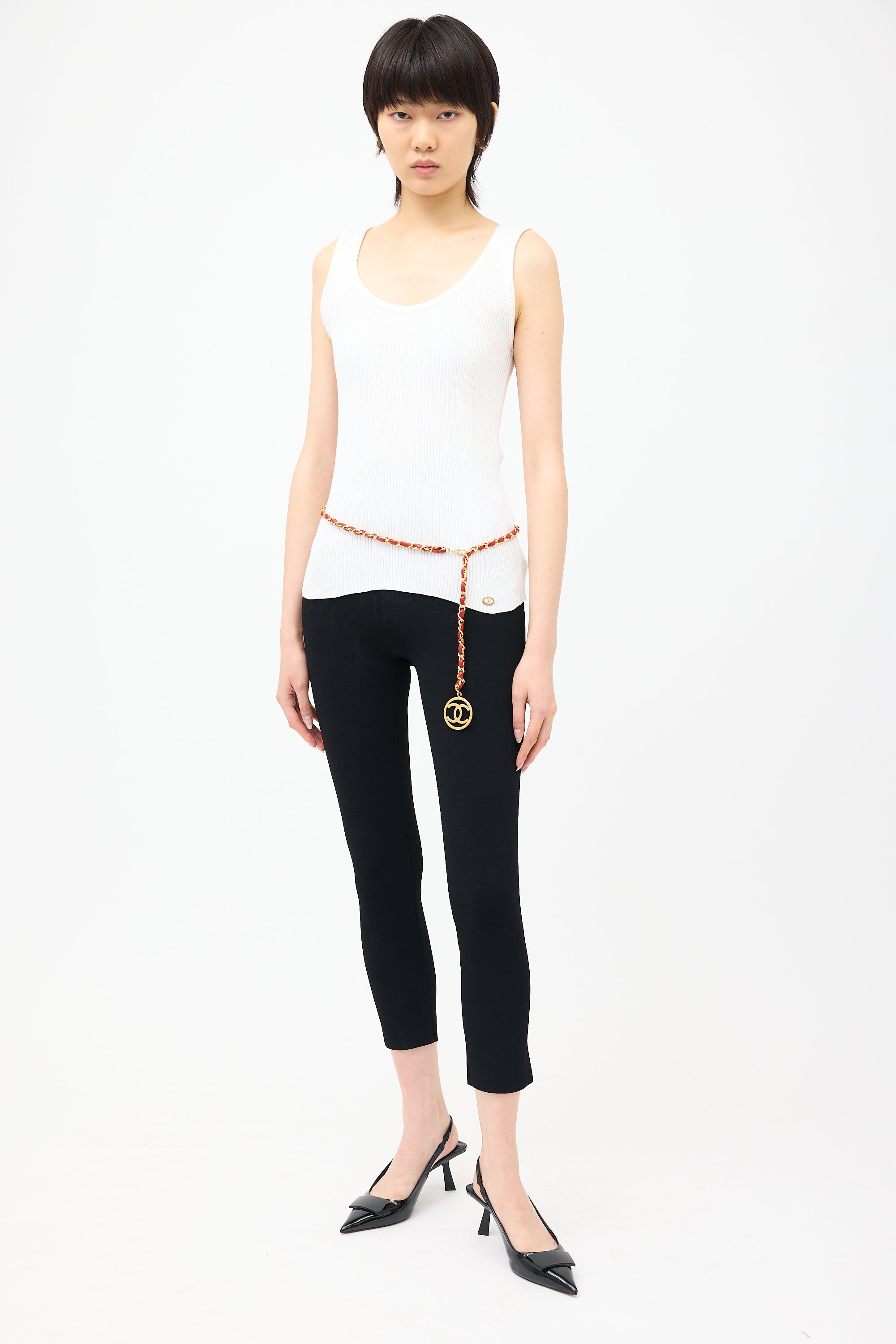 Pre-owned Chanel vintage red and gold belt featuring braided leather and chain strap, tonal CC logo charm at end, and clasp closure. Comes with original box. c. 1980s.