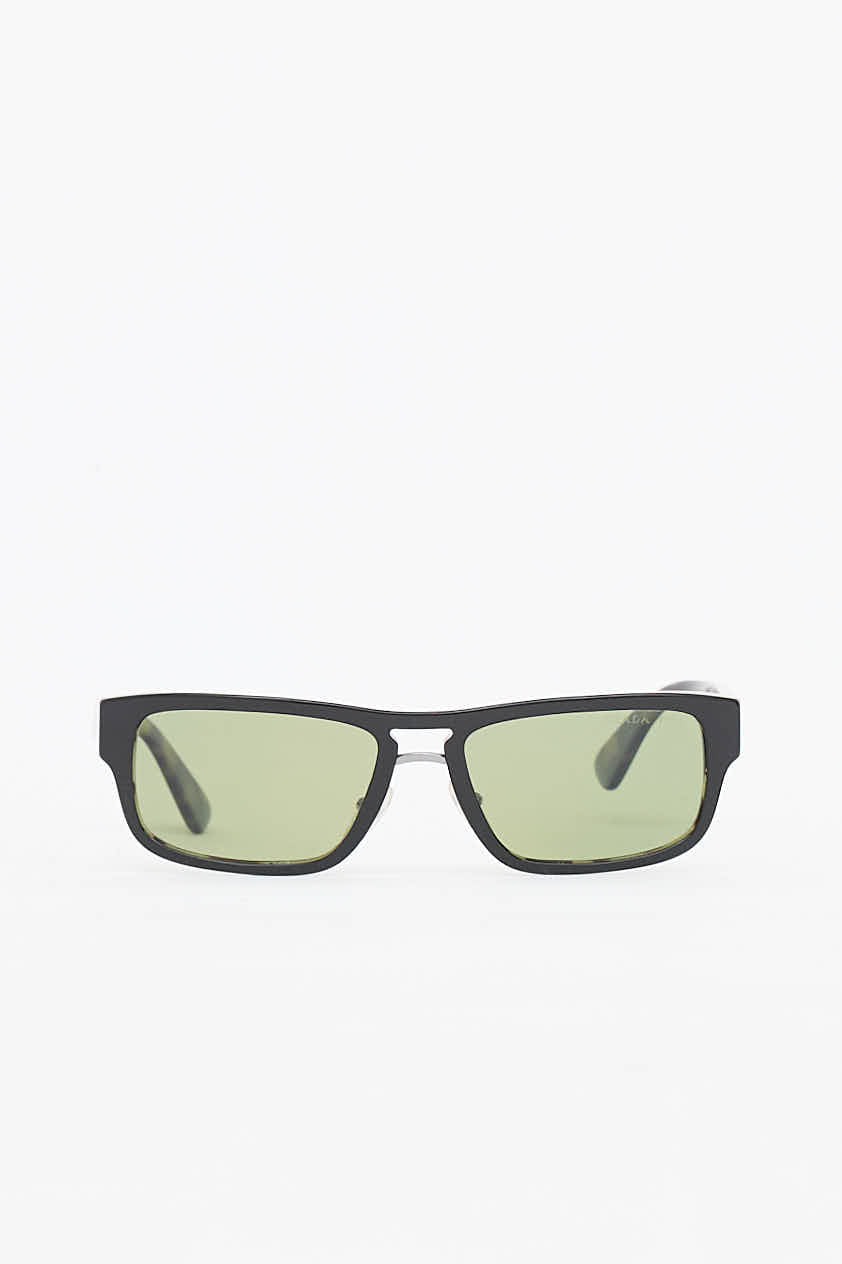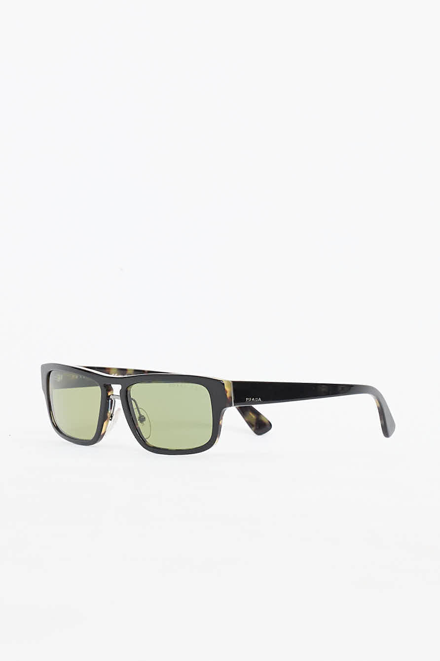 Pre-owned Prada black and green SPR05V sunglasses featuring rectangle frames, green polarized lenses, nose pads, interior tortoise pattern, and logo at temples.