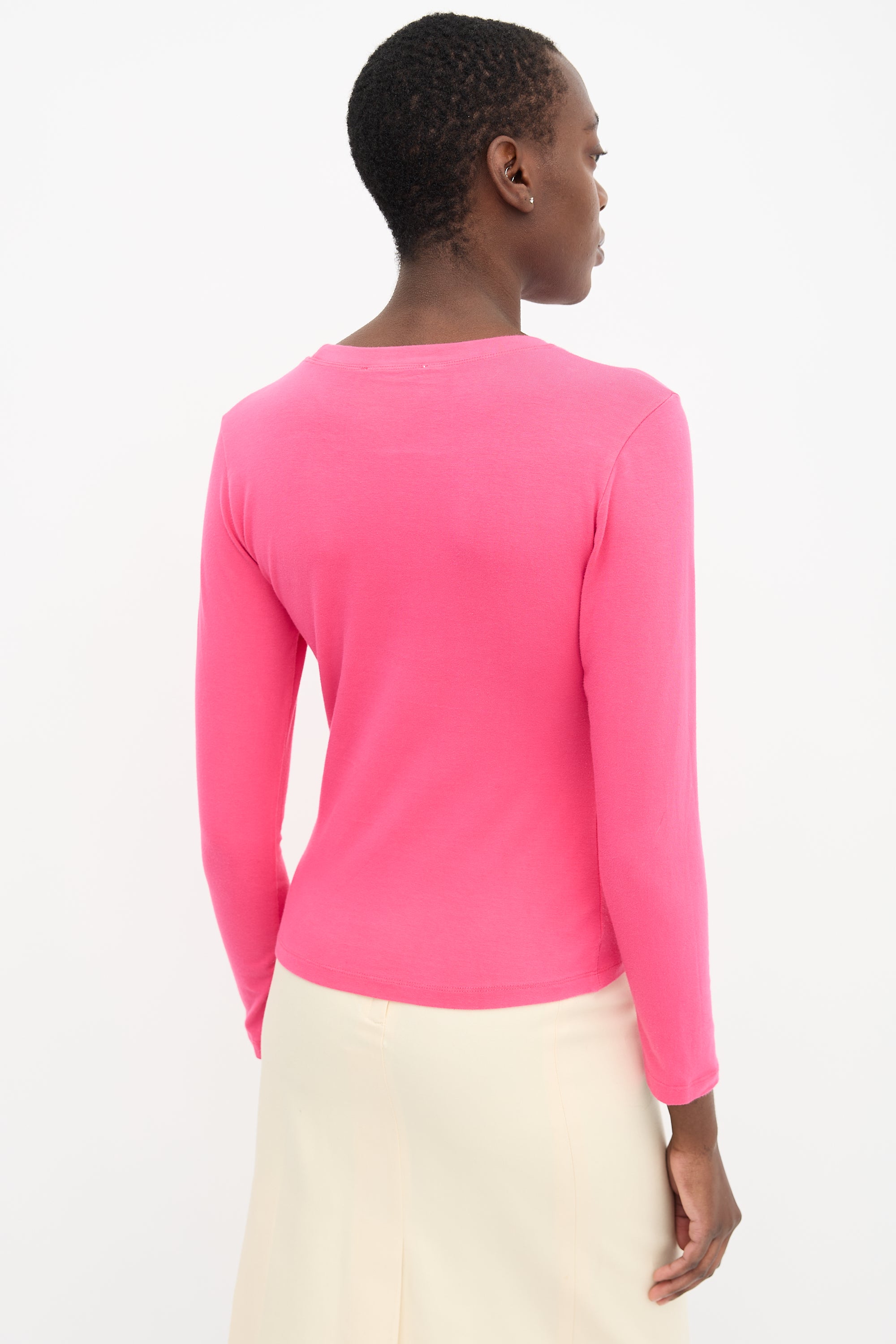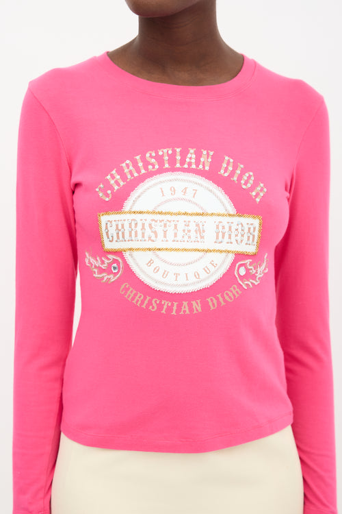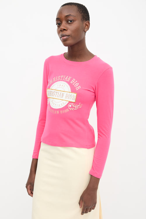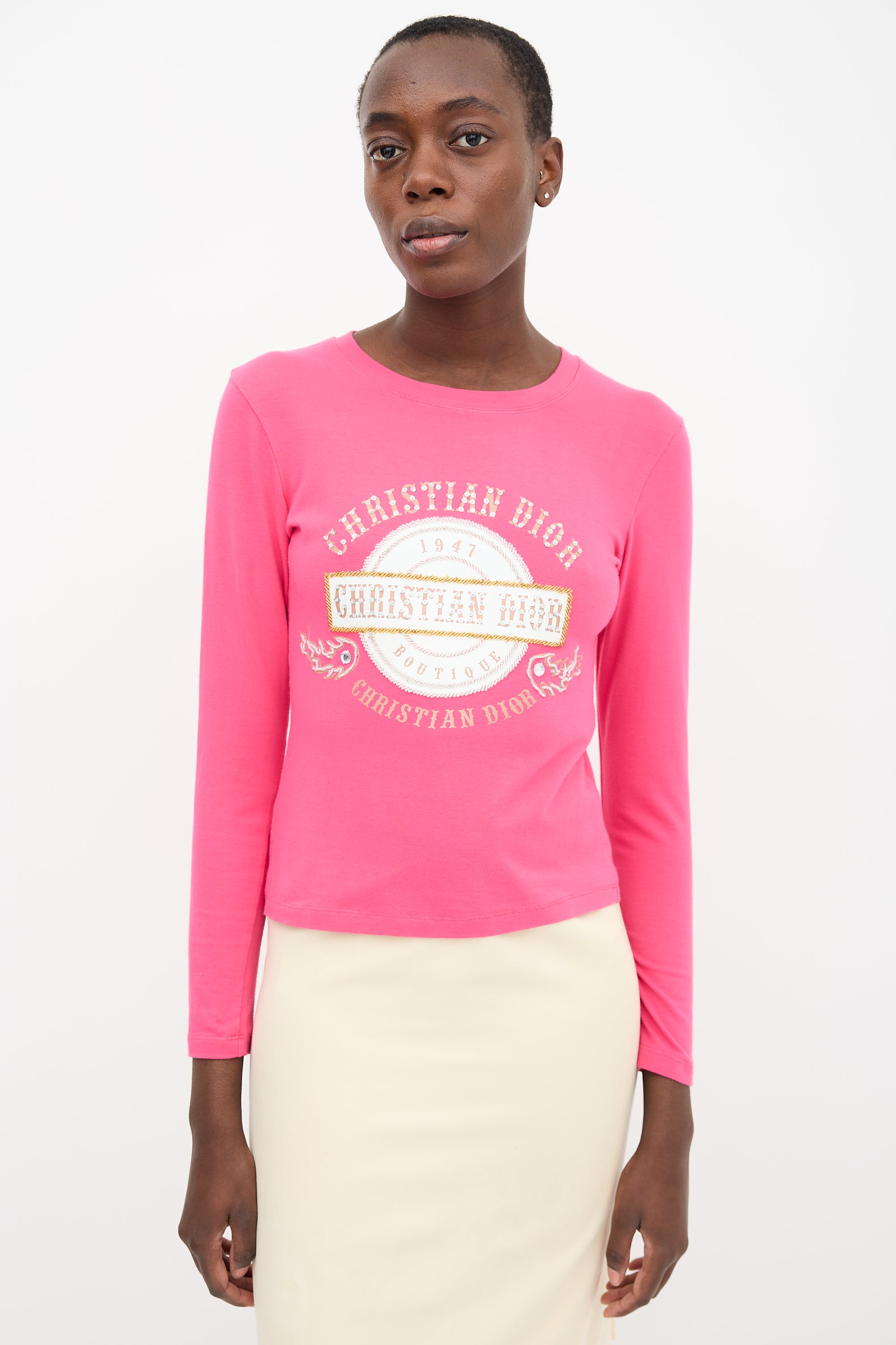 Pre-owned Christian Dior pink long sleeve top featuring crew neckline and printed logo with beaded embellishments at front.