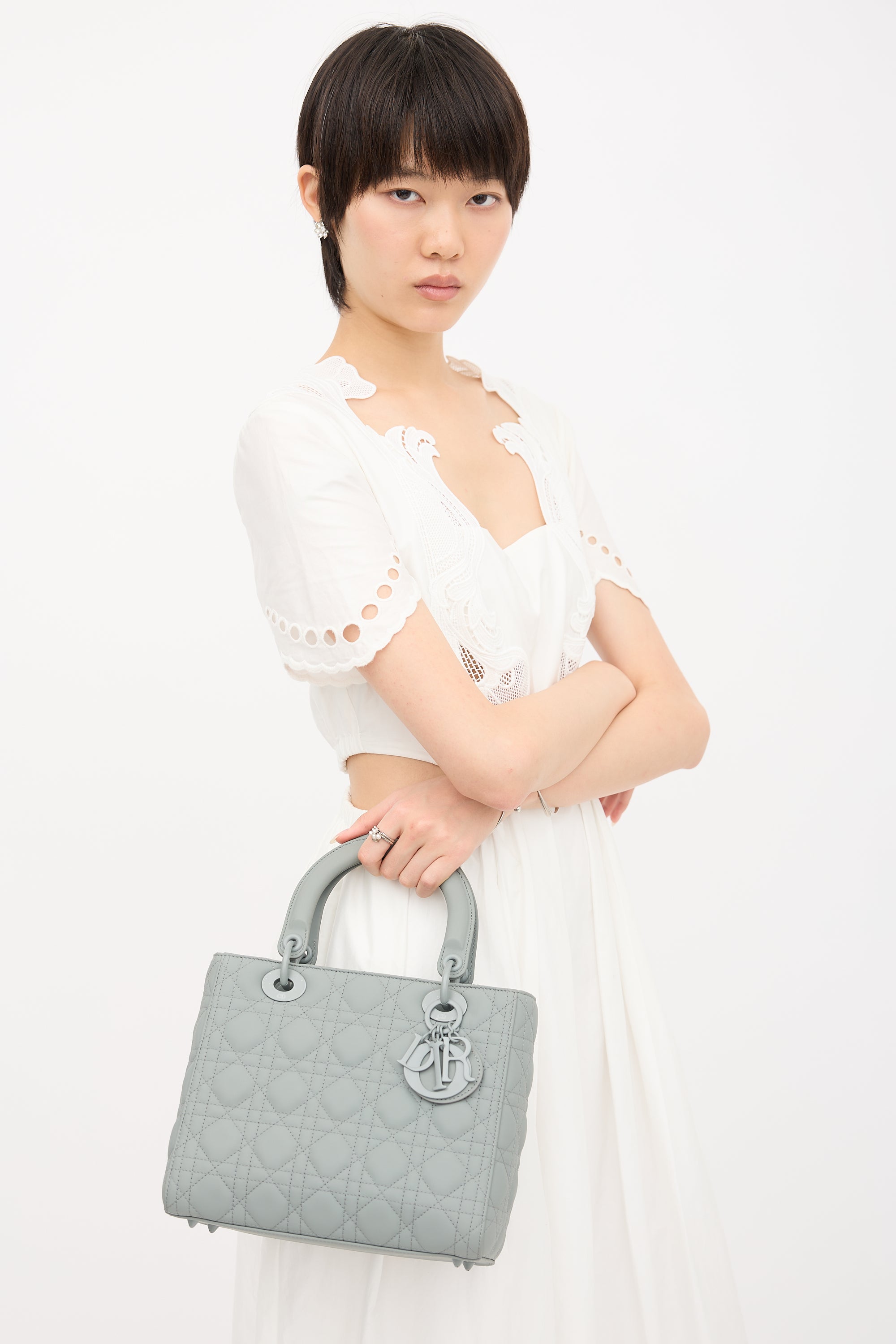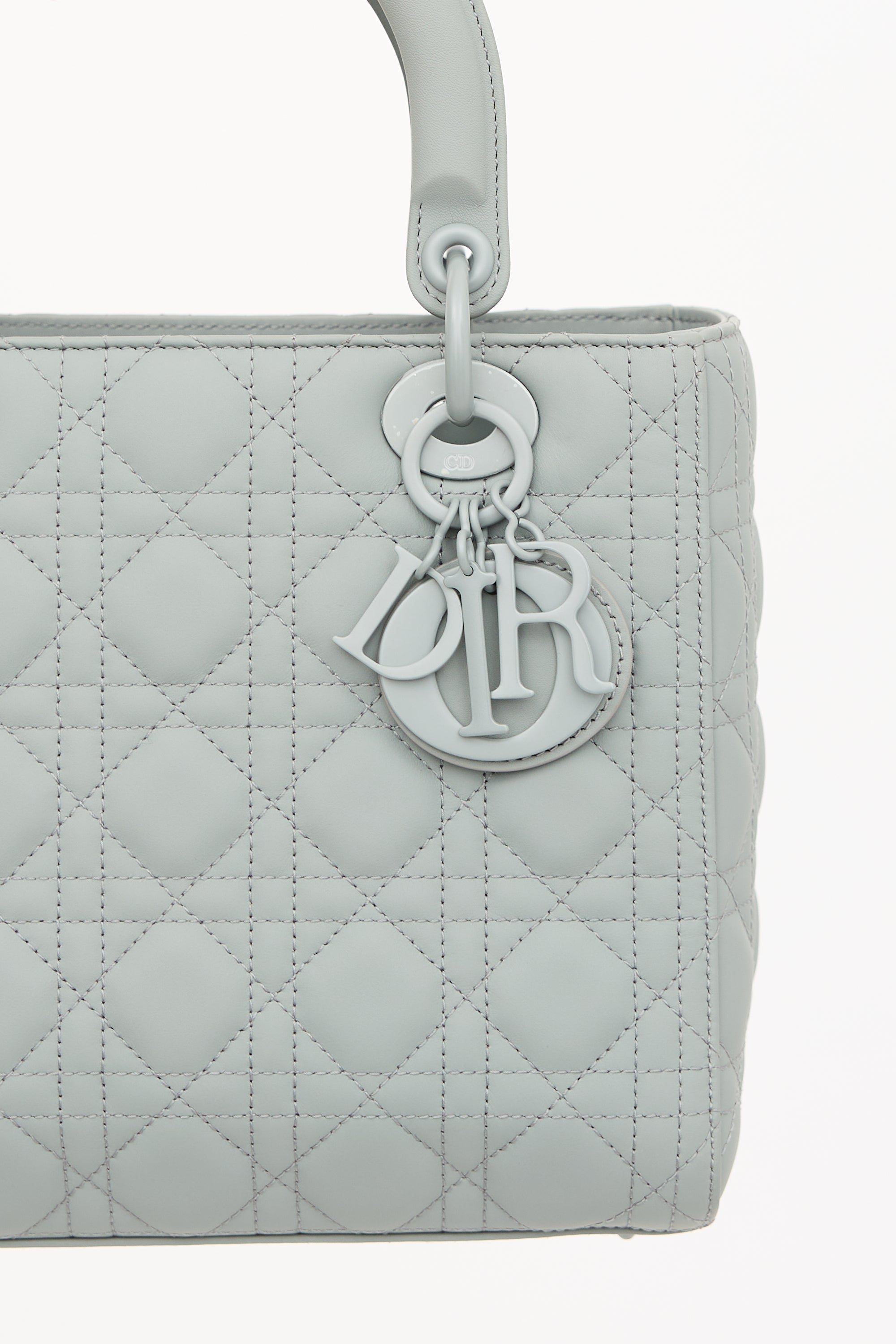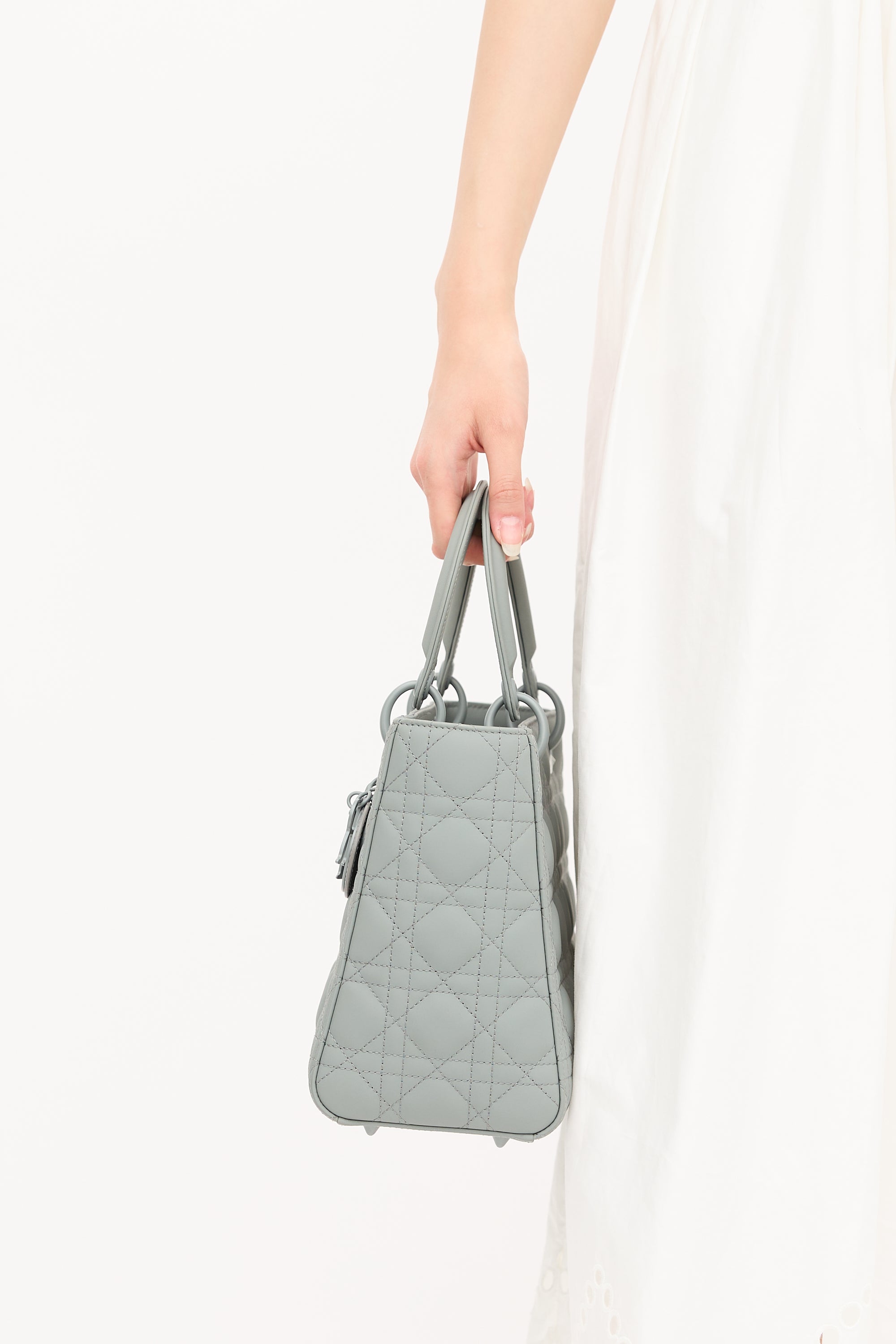 Pre-owned Christian Dior 2020 grey Medium Ultramatte Lady Dior bag featuring a signature Cannage quilted leather body, tonal hardware, dual top handles, detachable and adjustable shoulder strap, "D.I.O.R" logo charm at front, protective feet at base, open top with interior flap, and one suede lined main compartment with one slip pocket and one zip pocket. Comes with original box and dust bag.