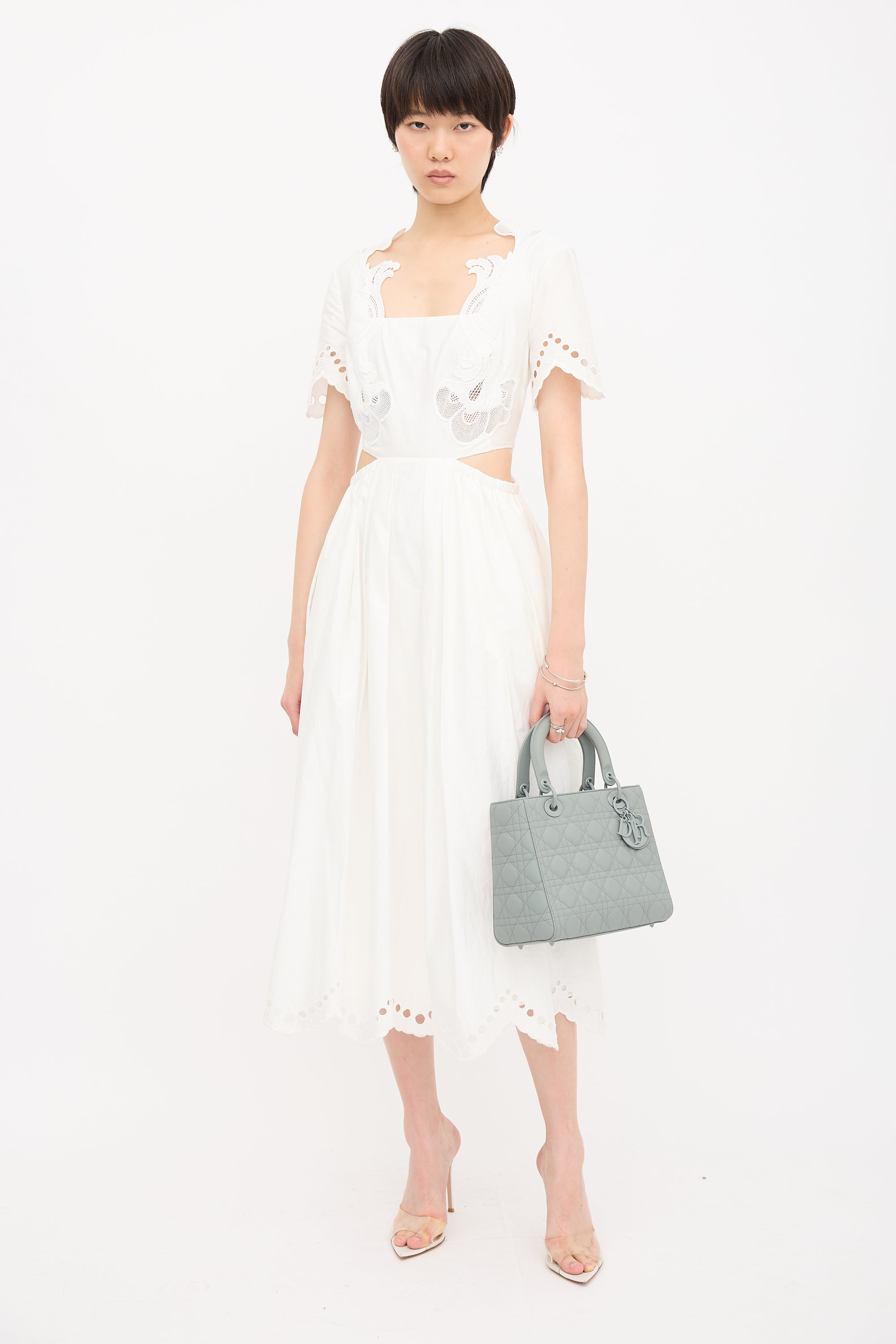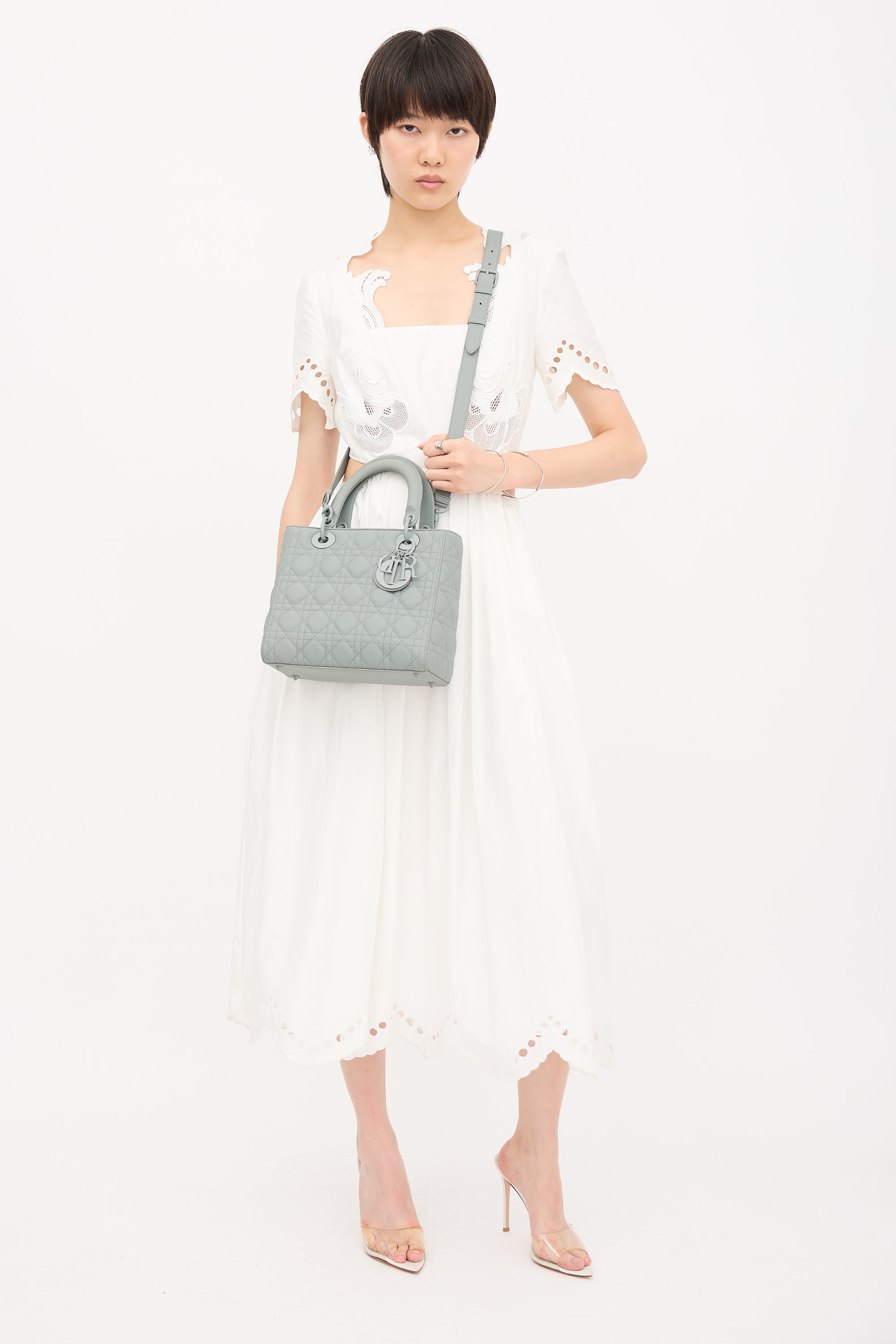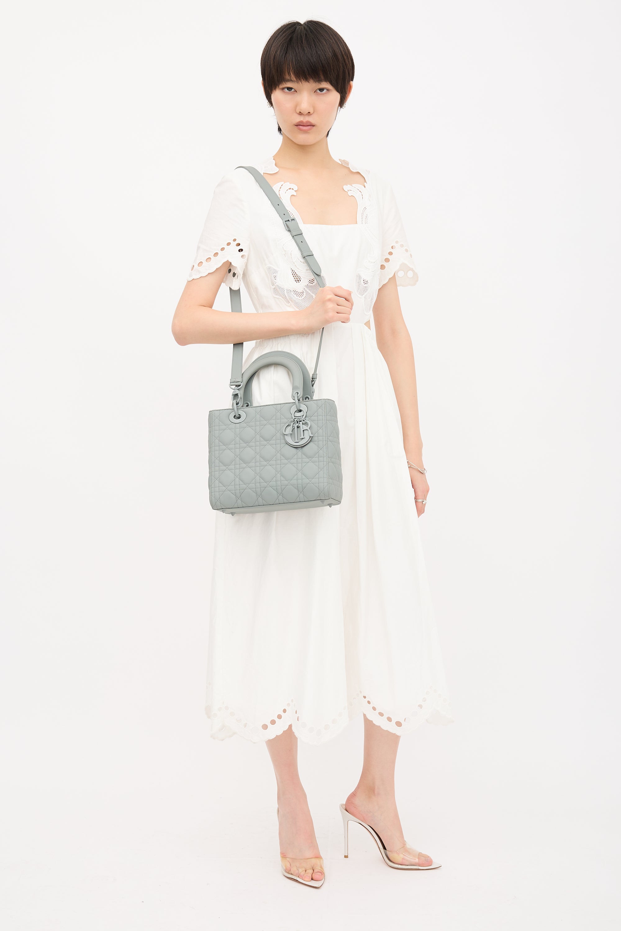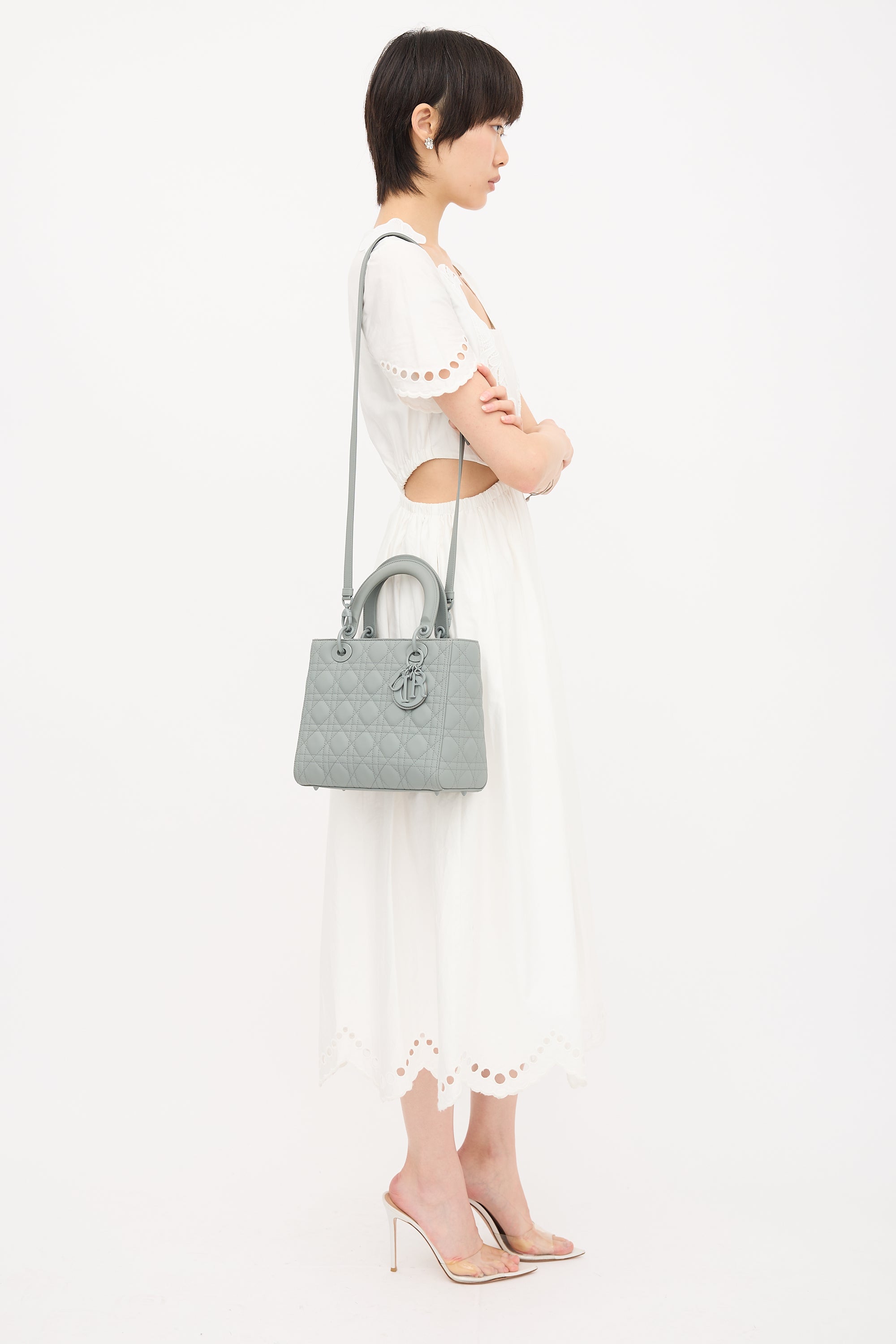 Pre-owned Christian Dior 2020 grey Medium Ultramatte Lady Dior bag featuring a signature Cannage quilted leather body, tonal hardware, dual top handles, detachable and adjustable shoulder strap, "D.I.O.R" logo charm at front, protective feet at base, open top with interior flap, and one suede lined main compartment with one slip pocket and one zip pocket. Comes with original box and dust bag.