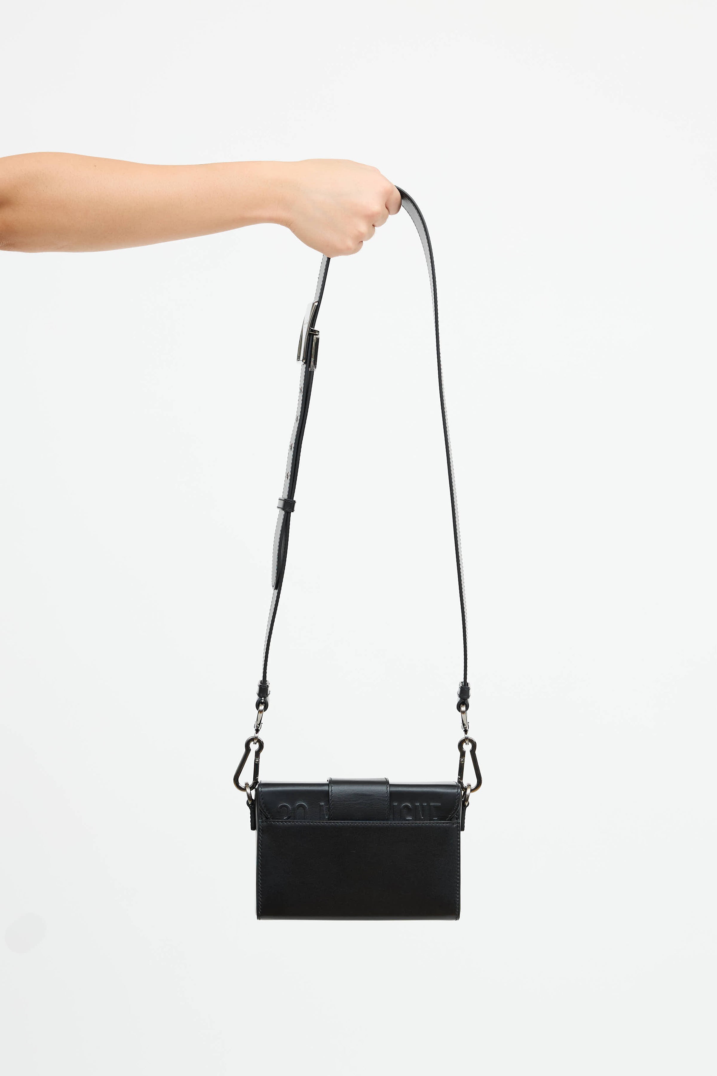 Pre-owned Dior 30 Montaigne Box Bag in black featuring tonal CD clasp closure, top flap, detachable shoulder strap, one main compartment, interior slip pocket with logo tab, exterior slip pocket, embossed "30 MONTAIGNE" at back, and detachable shoulder strap with engraved buckle.