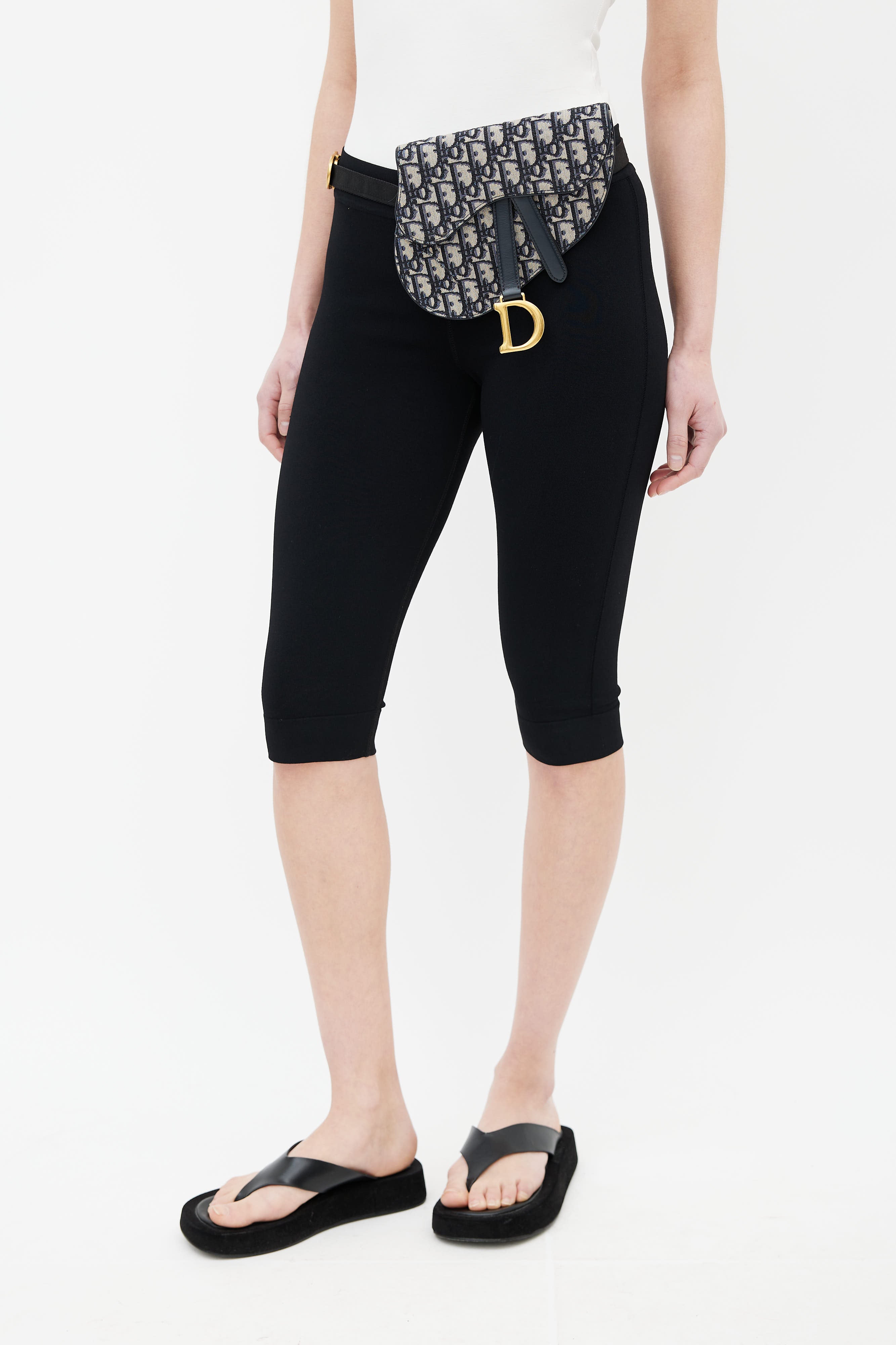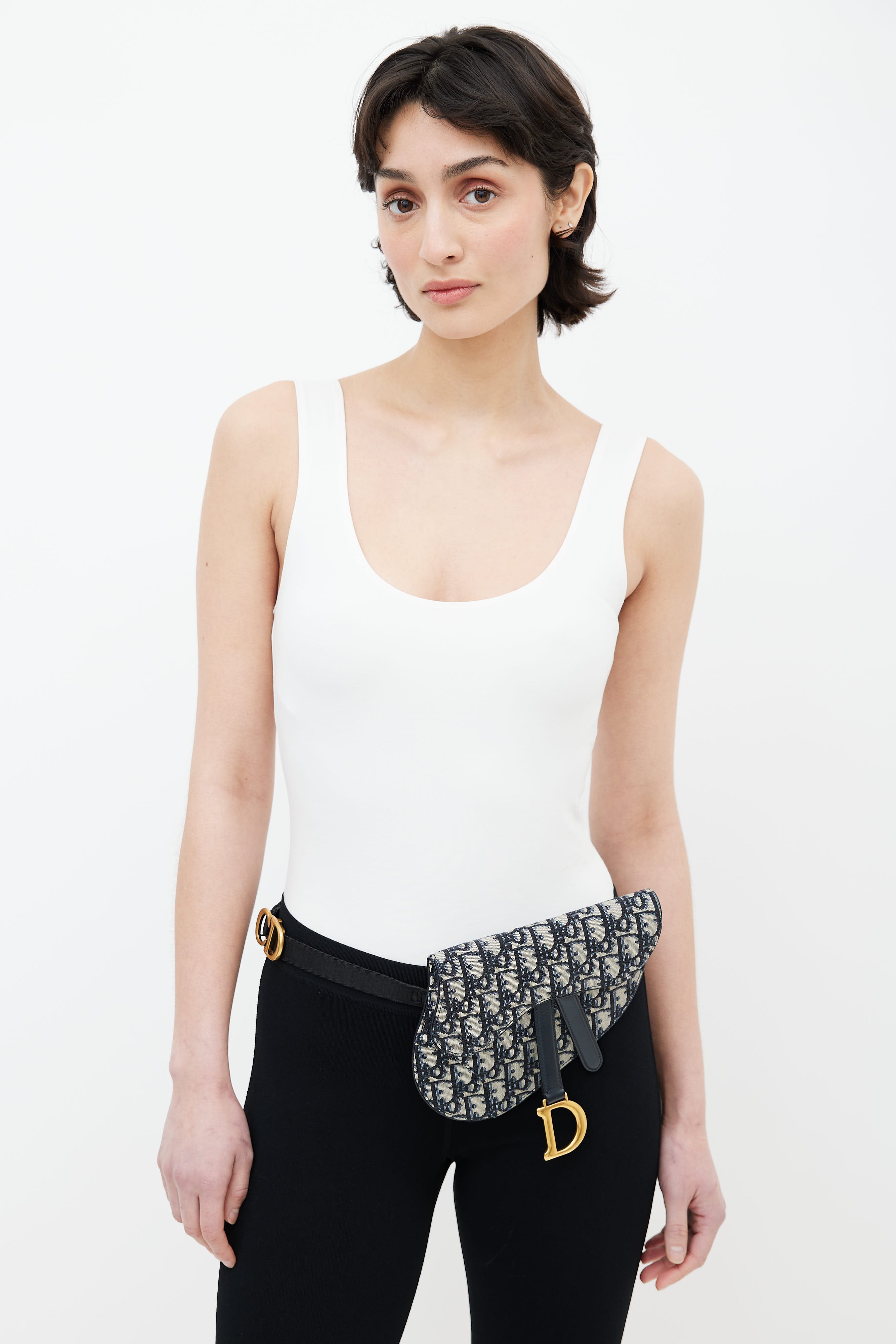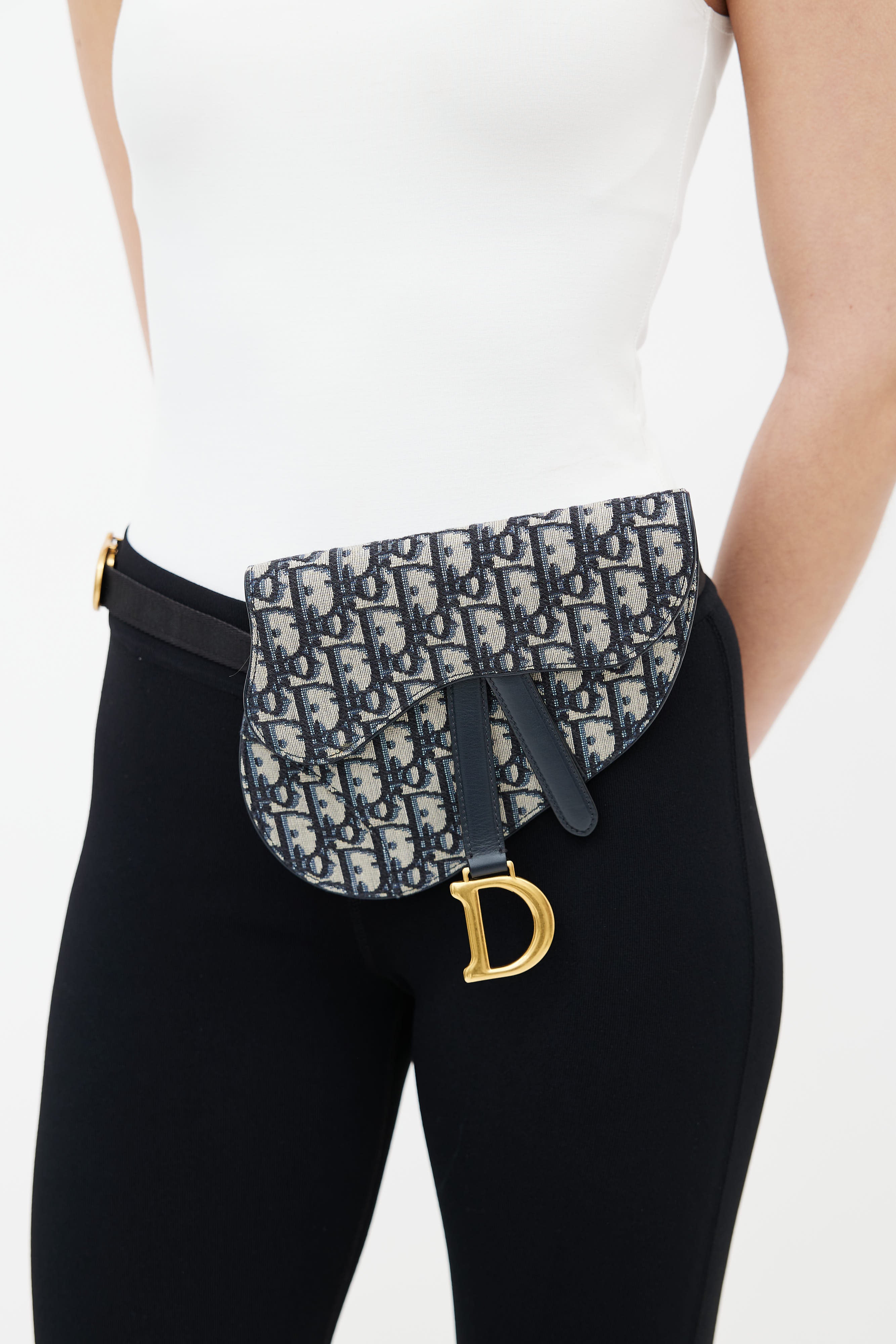 Pre-owned Dior Saddle belt pouch featuring blue Dior Oblique jacquard, asymmetrical top flap, magnetic closure, navy leather straps with gold tone D charm, single main compartment with logo tab, exterior slip pocket, removable belt with gold tone CD buckle, and two gold tone D-rings at back. Comes with a dust bag.