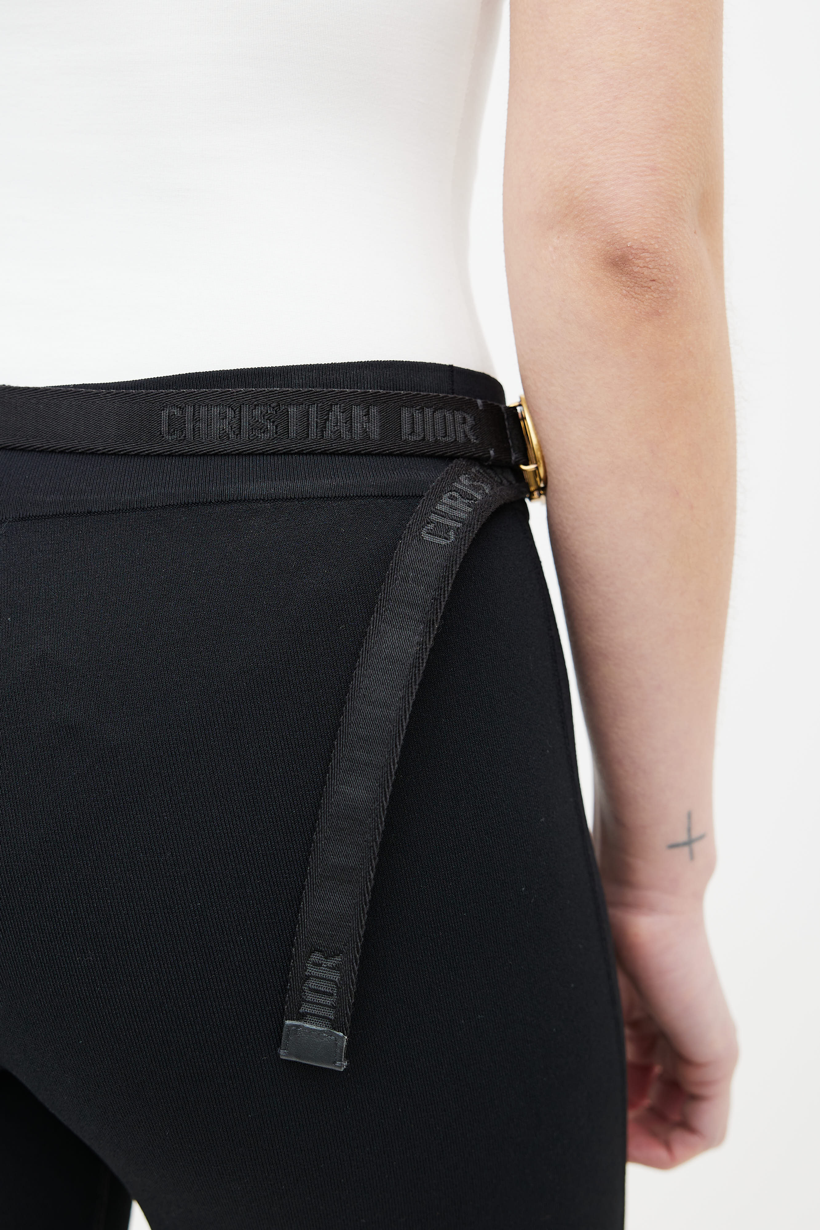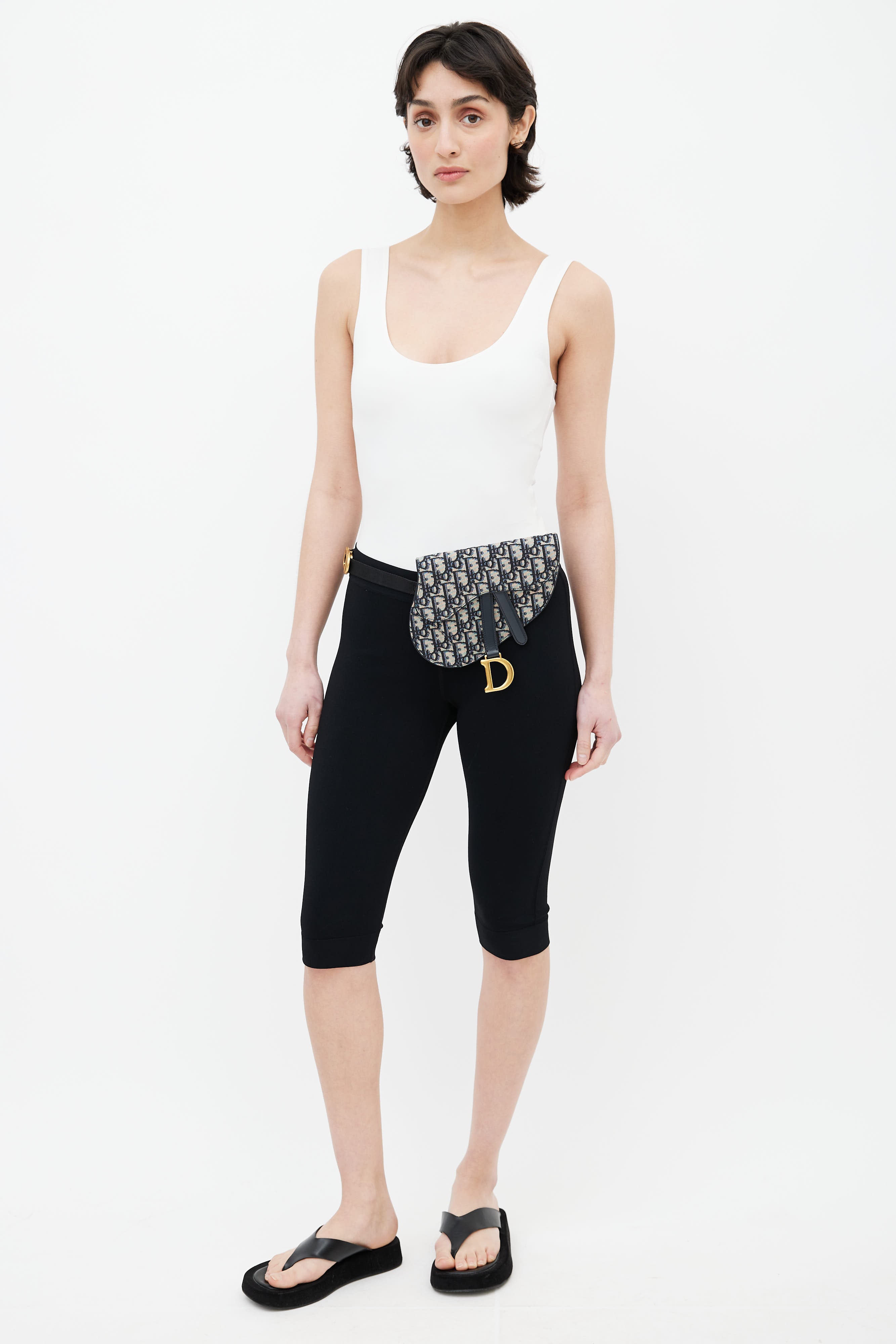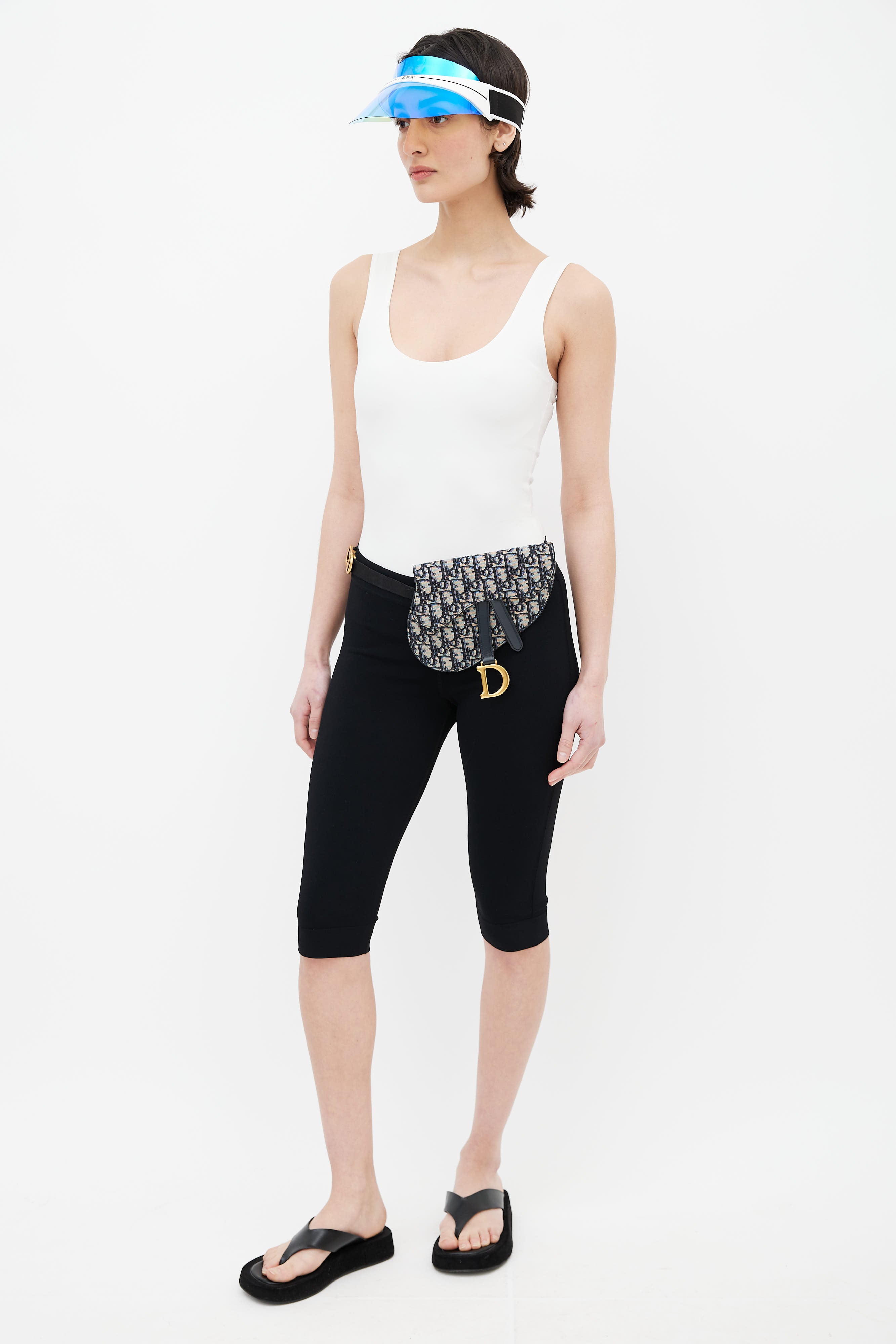 Pre-owned Dior Saddle belt pouch featuring blue Dior Oblique jacquard, asymmetrical top flap, magnetic closure, navy leather straps with gold tone D charm, single main compartment with logo tab, exterior slip pocket, removable belt with gold tone CD buckle, and two gold tone D-rings at back. Comes with a dust bag.