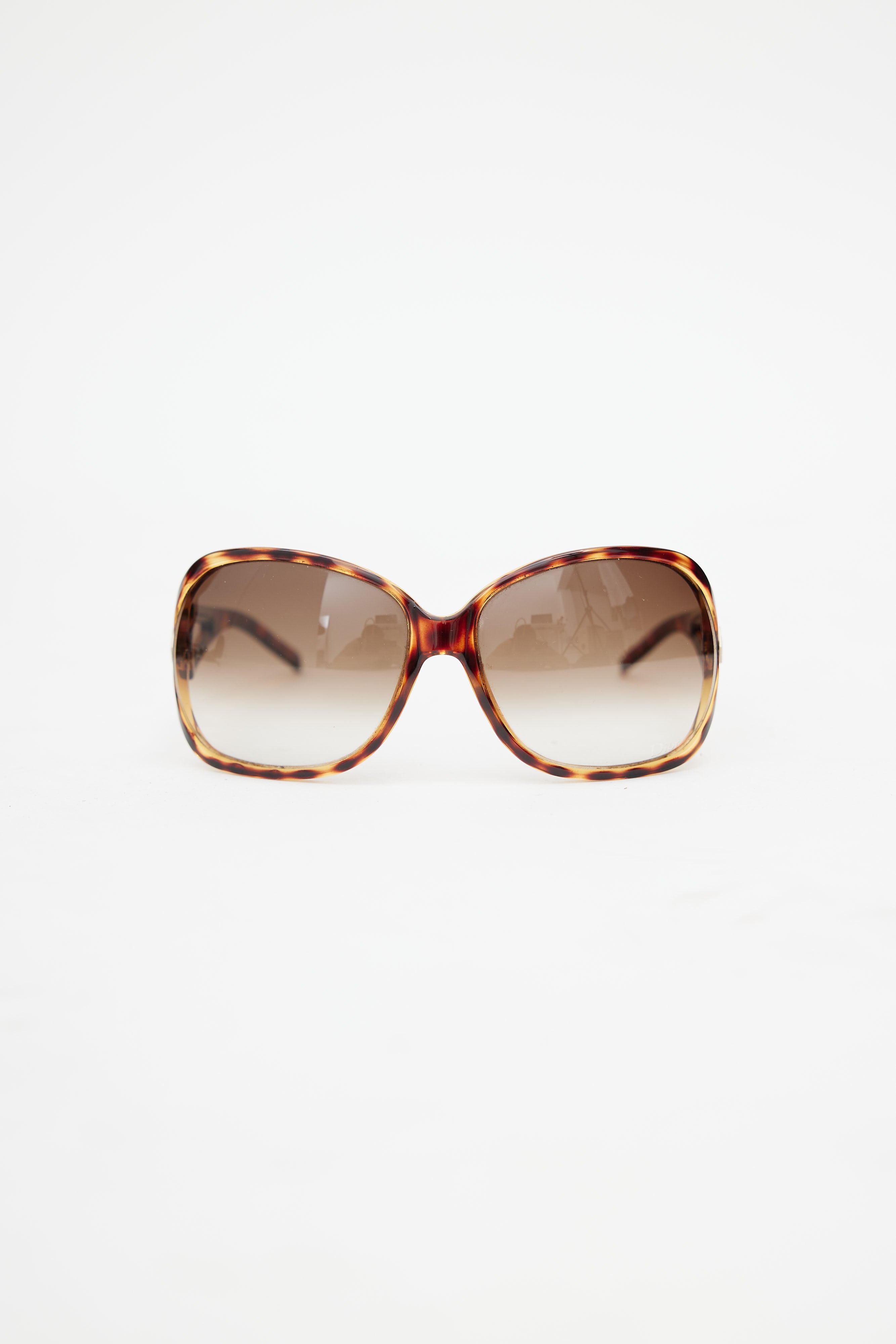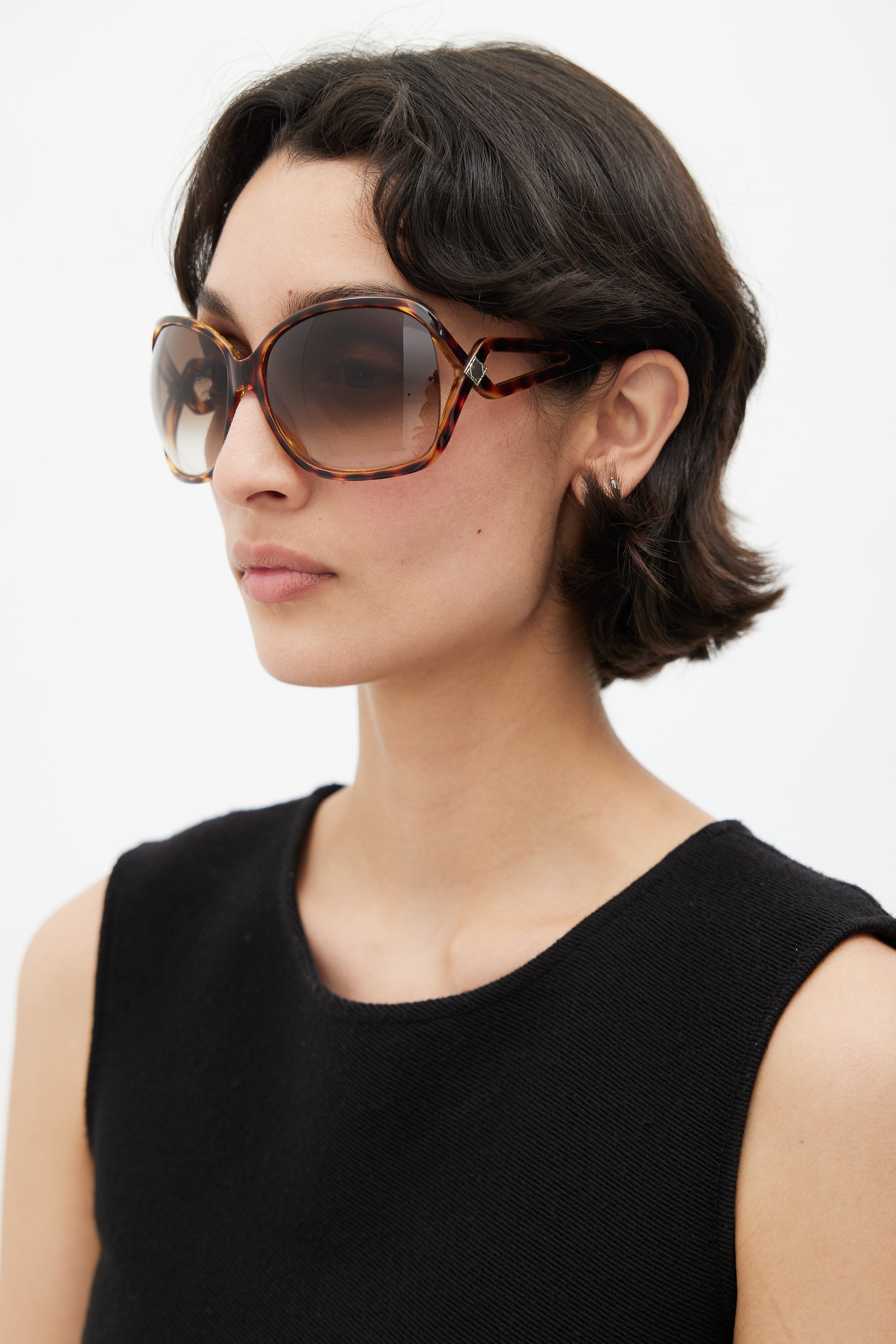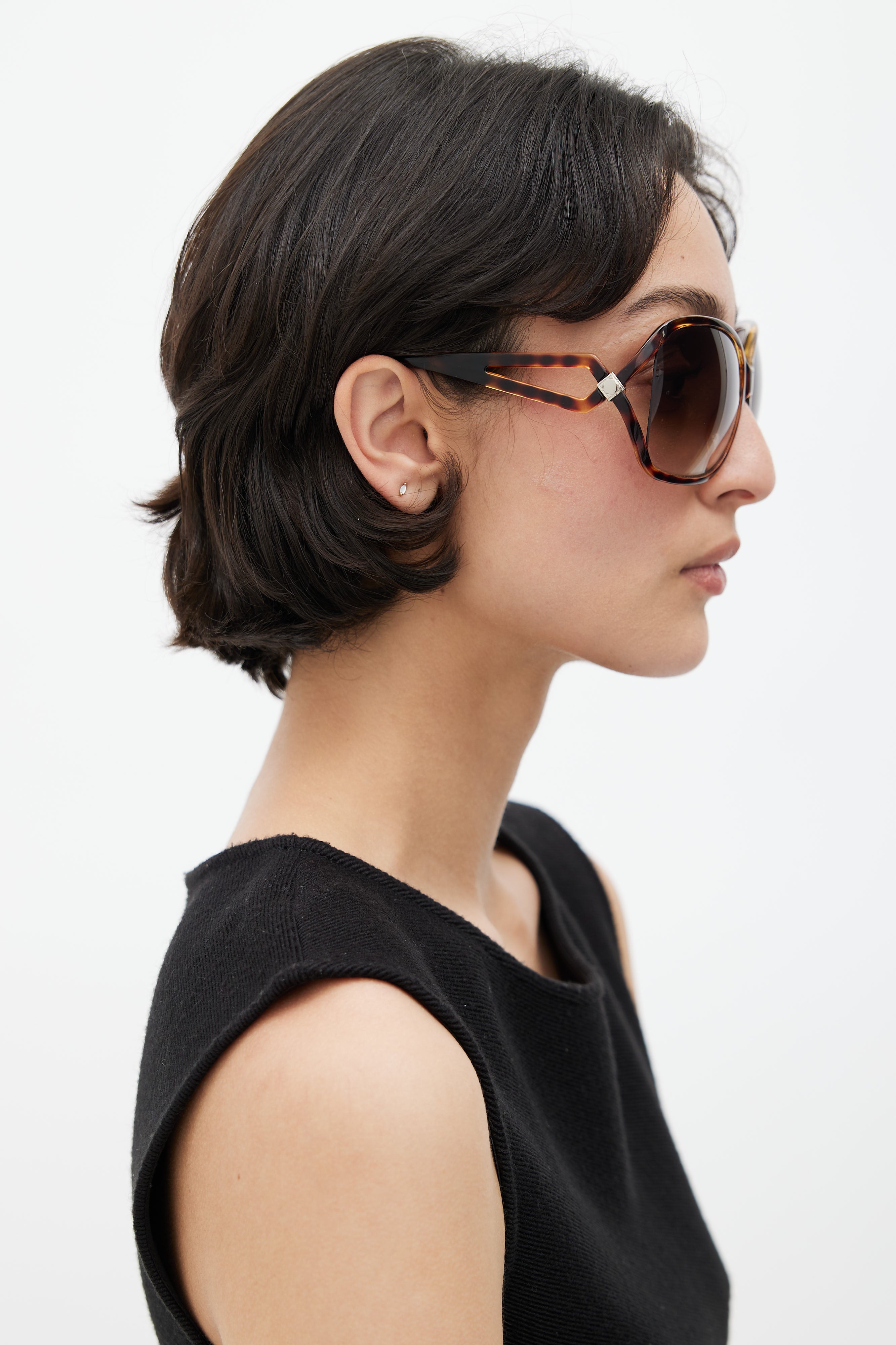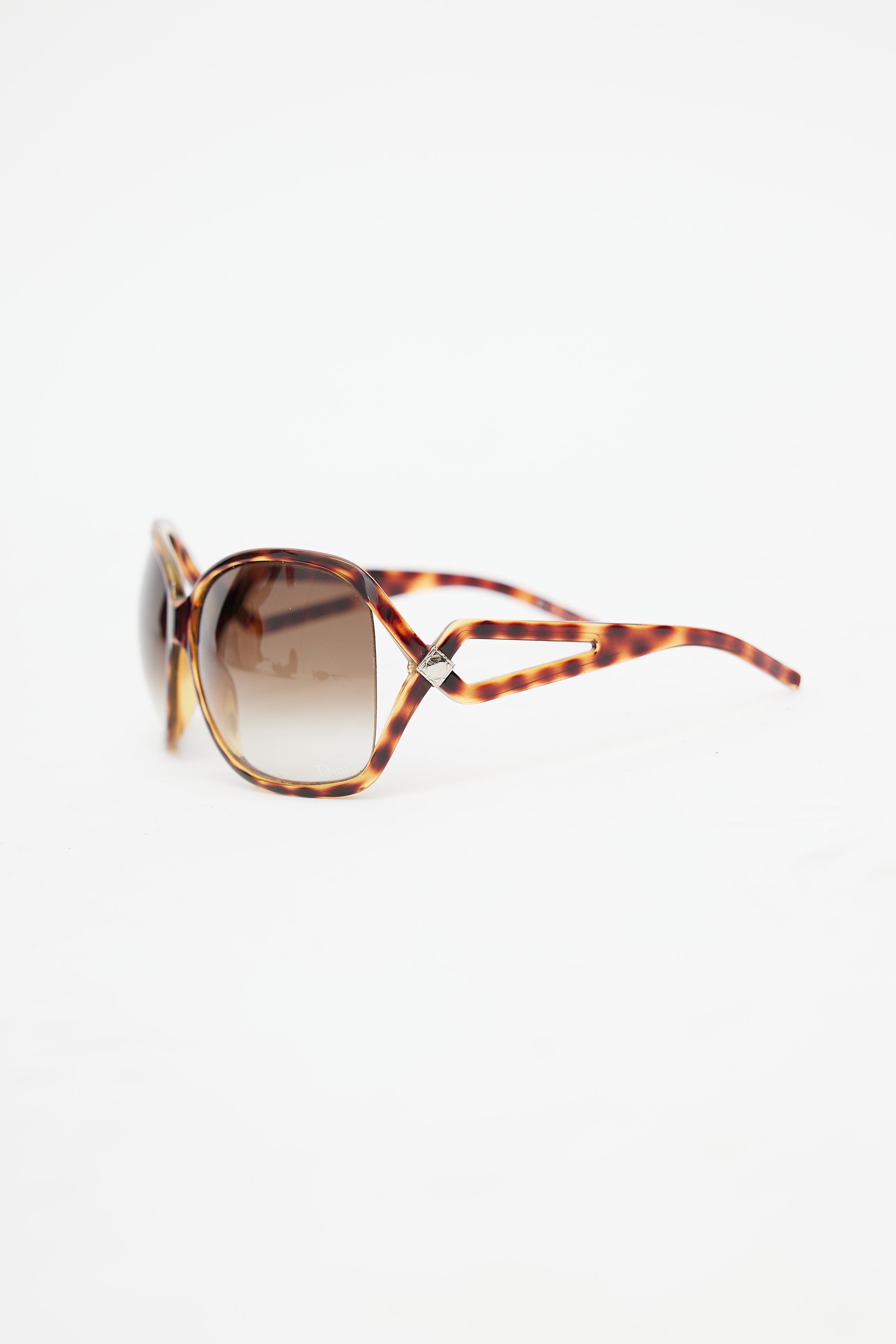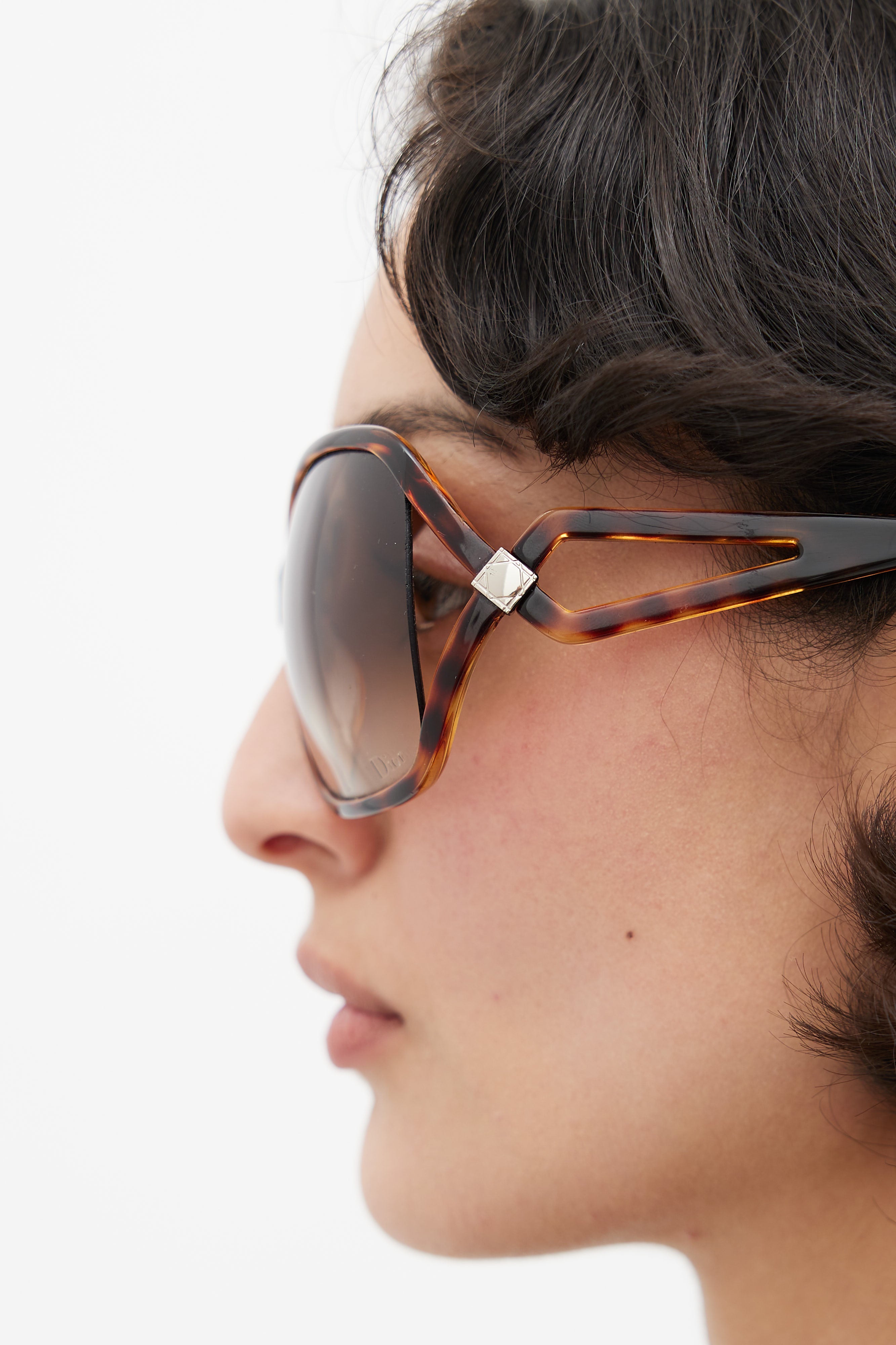 Pre-owned Dior brown Madrague V08JS sunglasses featuring tortoise shell frame, oversized lens, nose saddle bridge, and silver tone logo at cut out temple. Comes with original case.