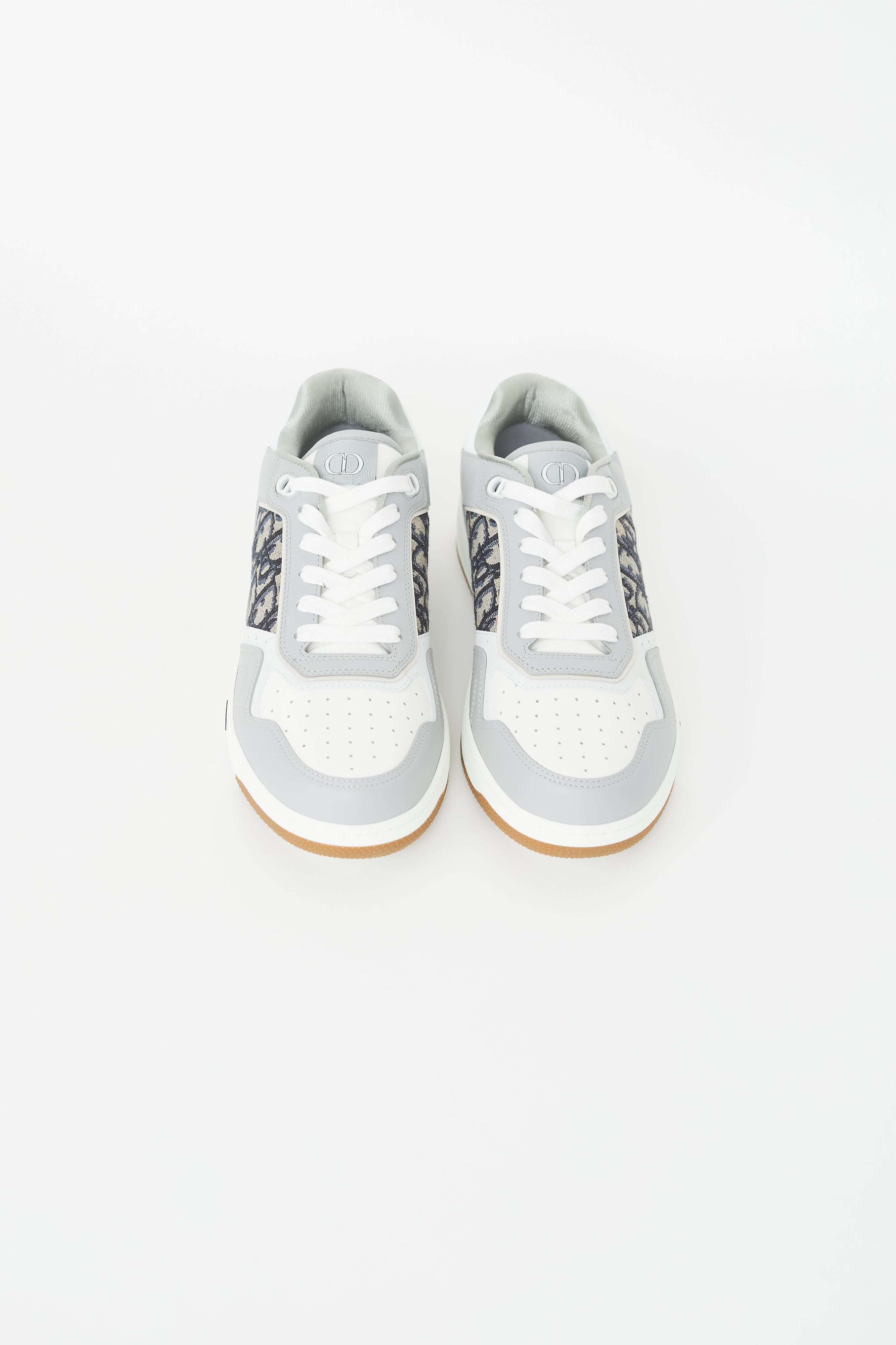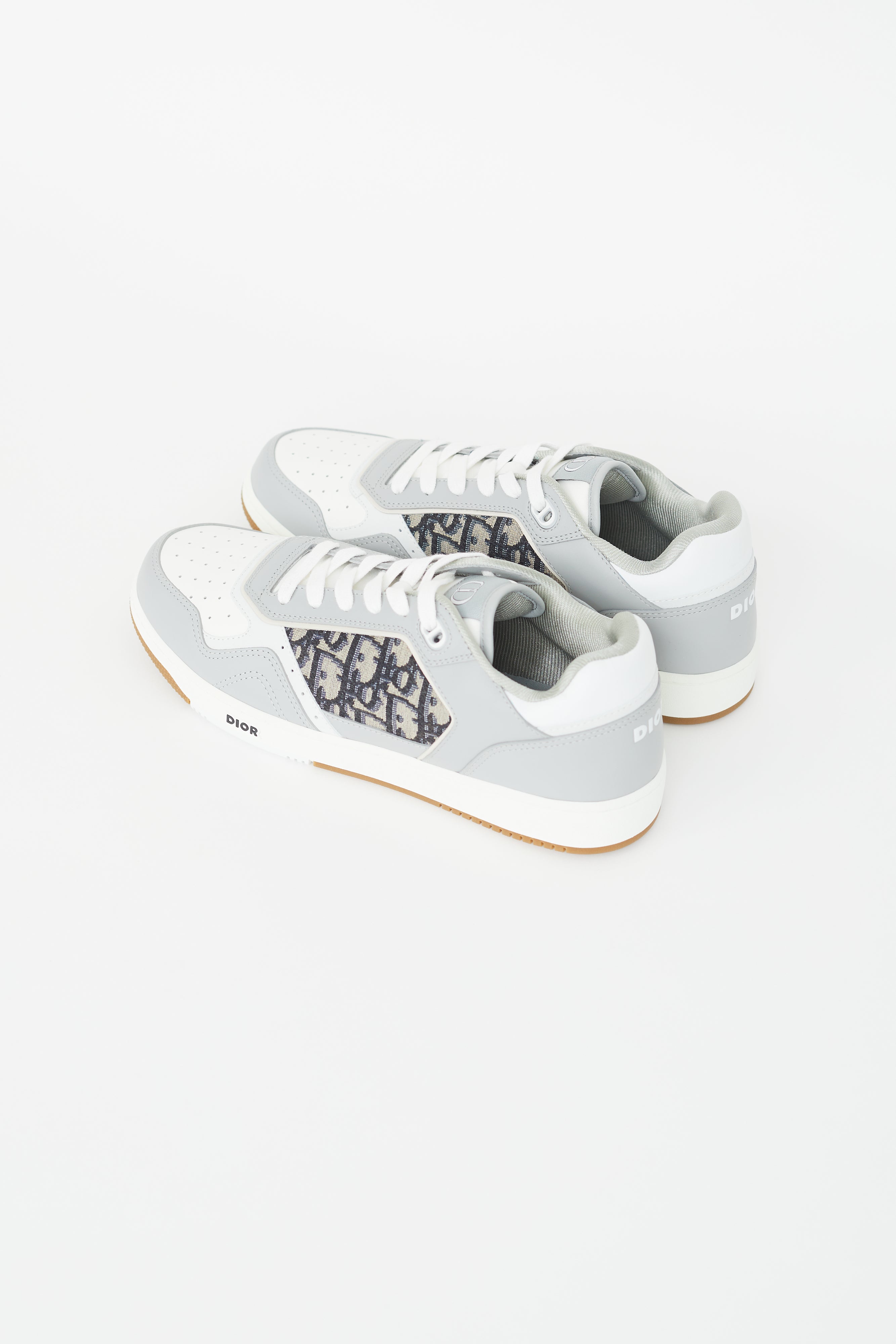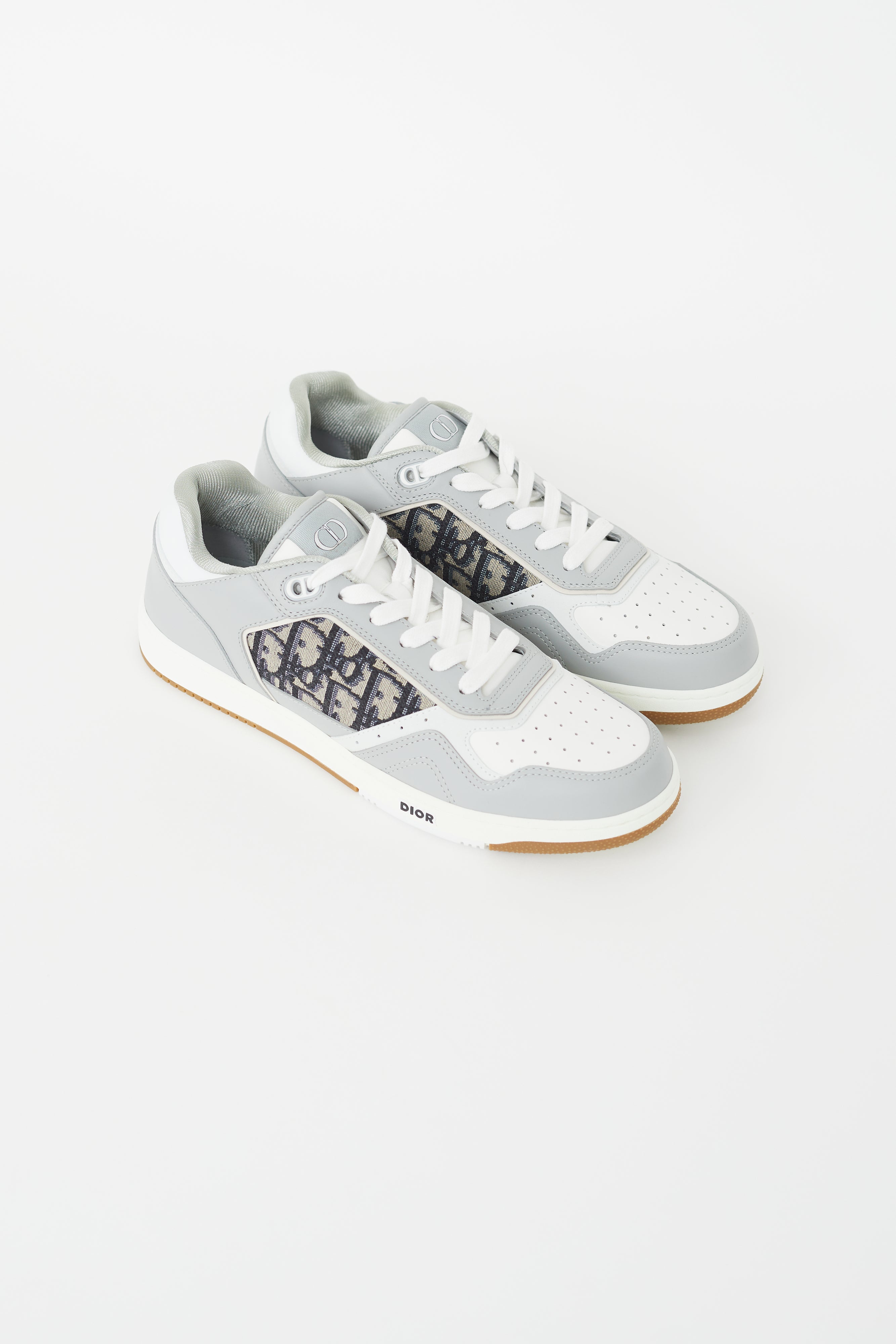 Pre-owned Dior grey and white B27 low top sneakers featuring rounded toe, lace up vamp, Dior oblique jacquard at side, stamped logo at counter, rubberized logo at side midsole, logo tab at tongue, and rubberized logo eyelet. Comes with original dust bag.