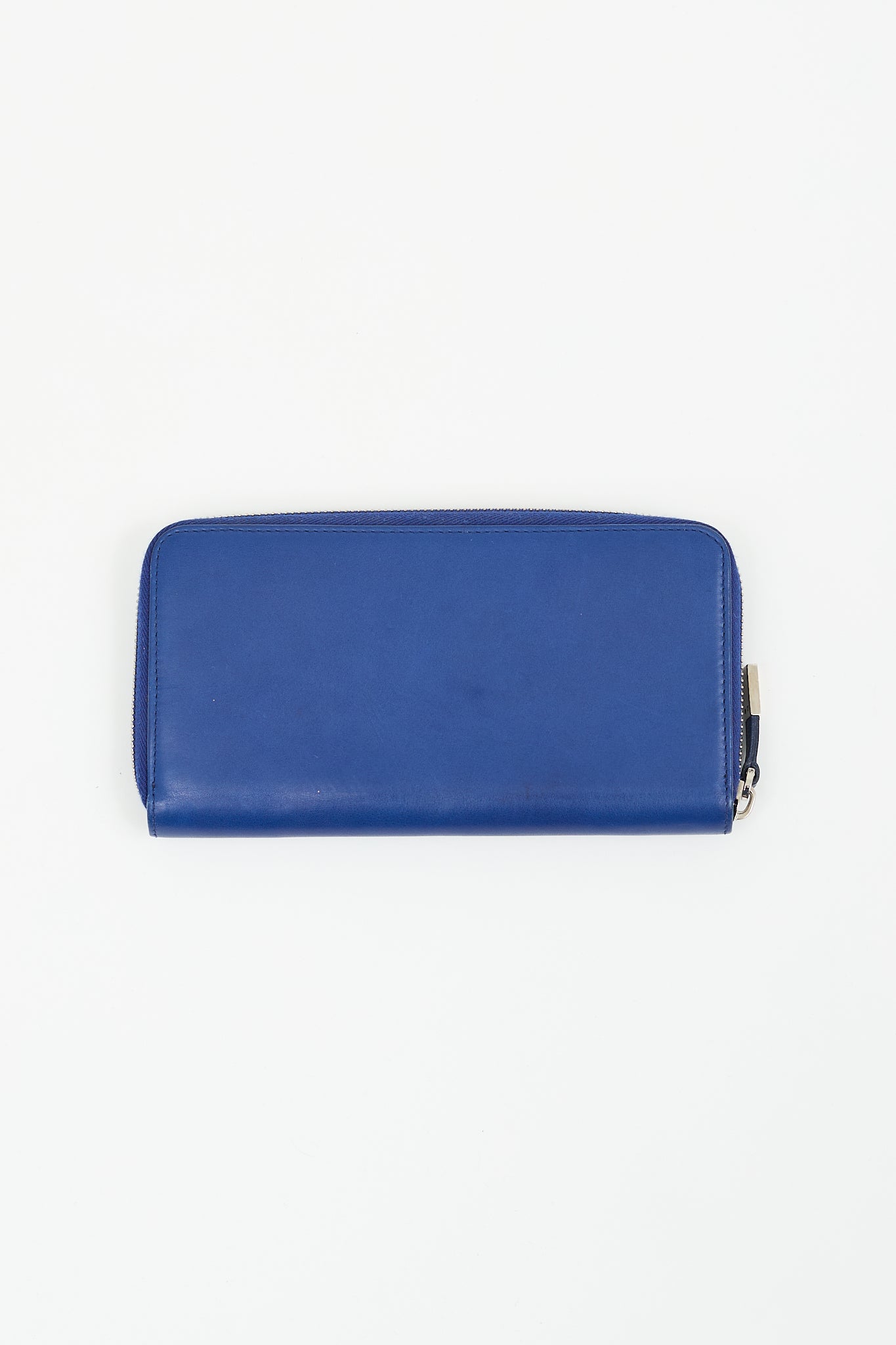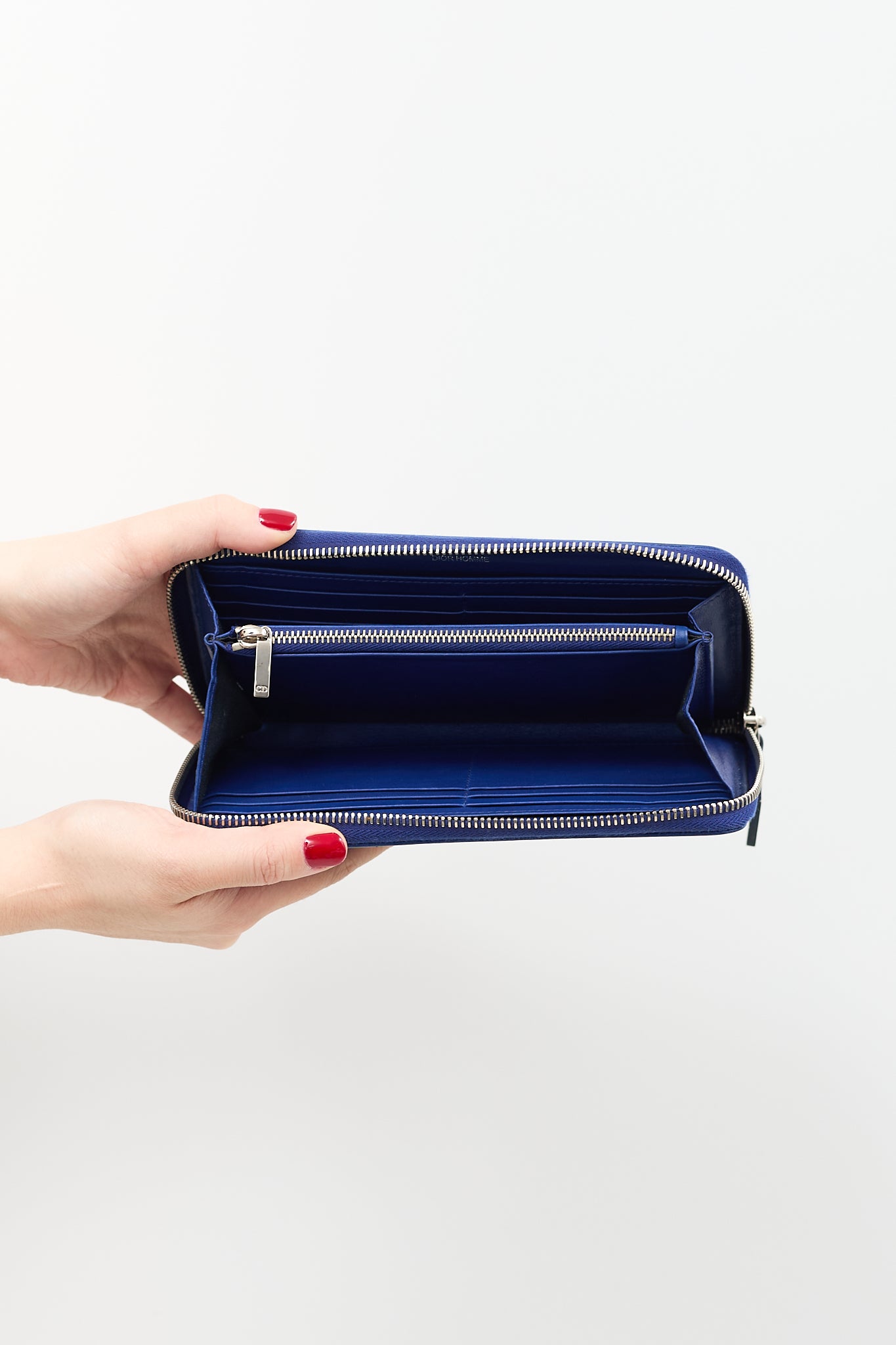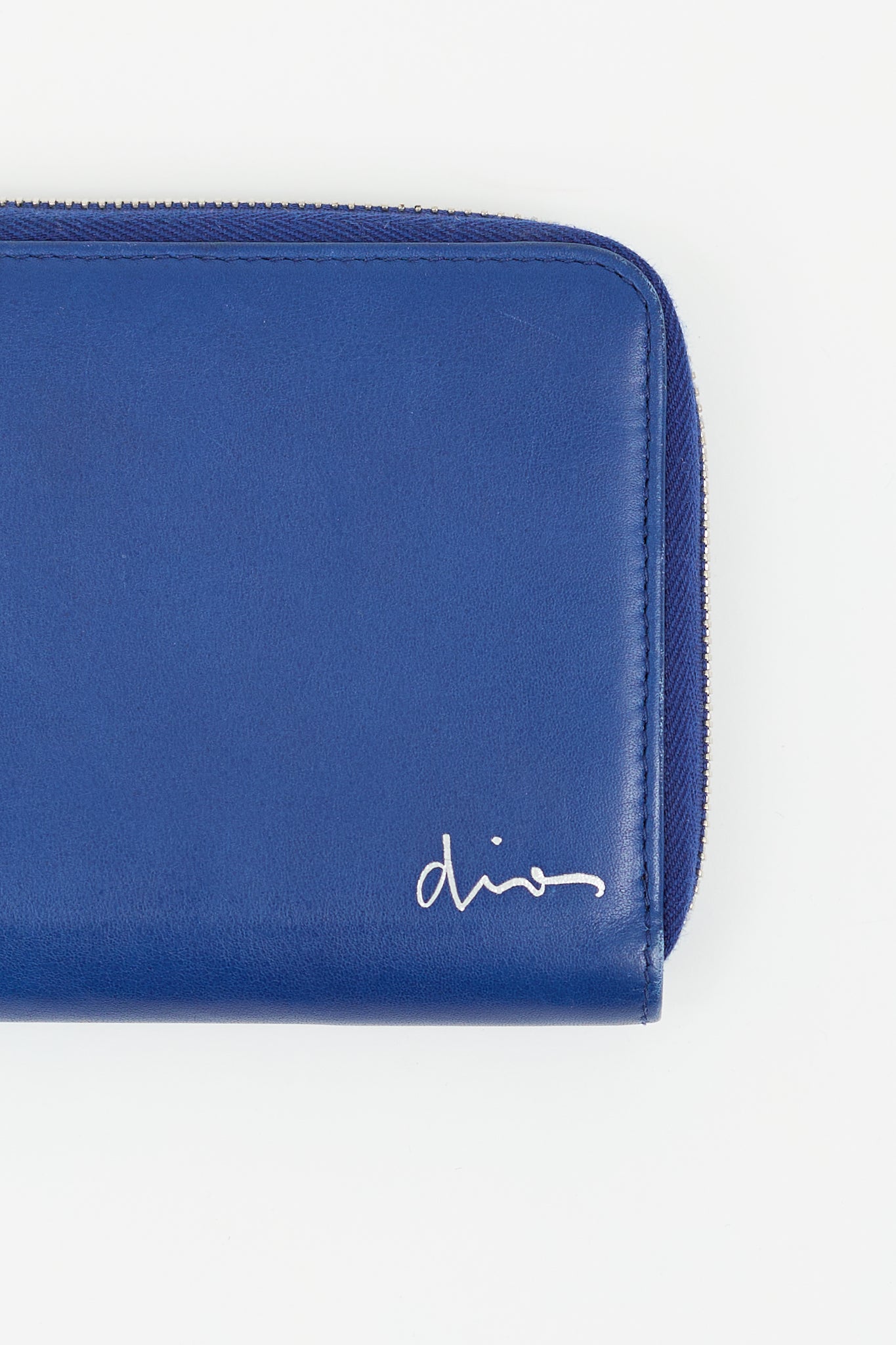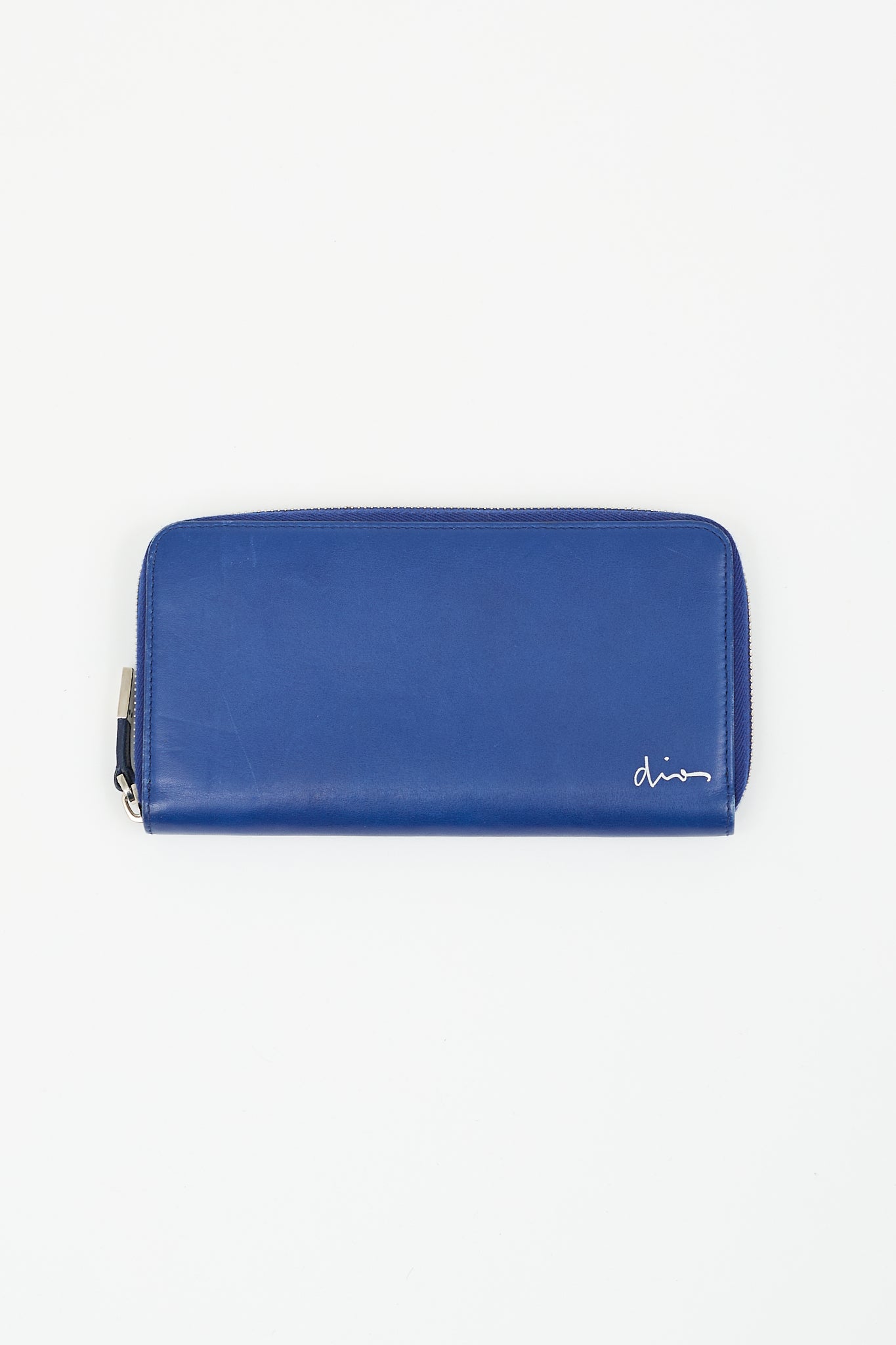Pre-owned Dior Homme blue leather wallet featuring logo at front, silver tone hardware, zip around closure, two main compartments, middle zip pocket, 12 card slots, and two slip pockets.