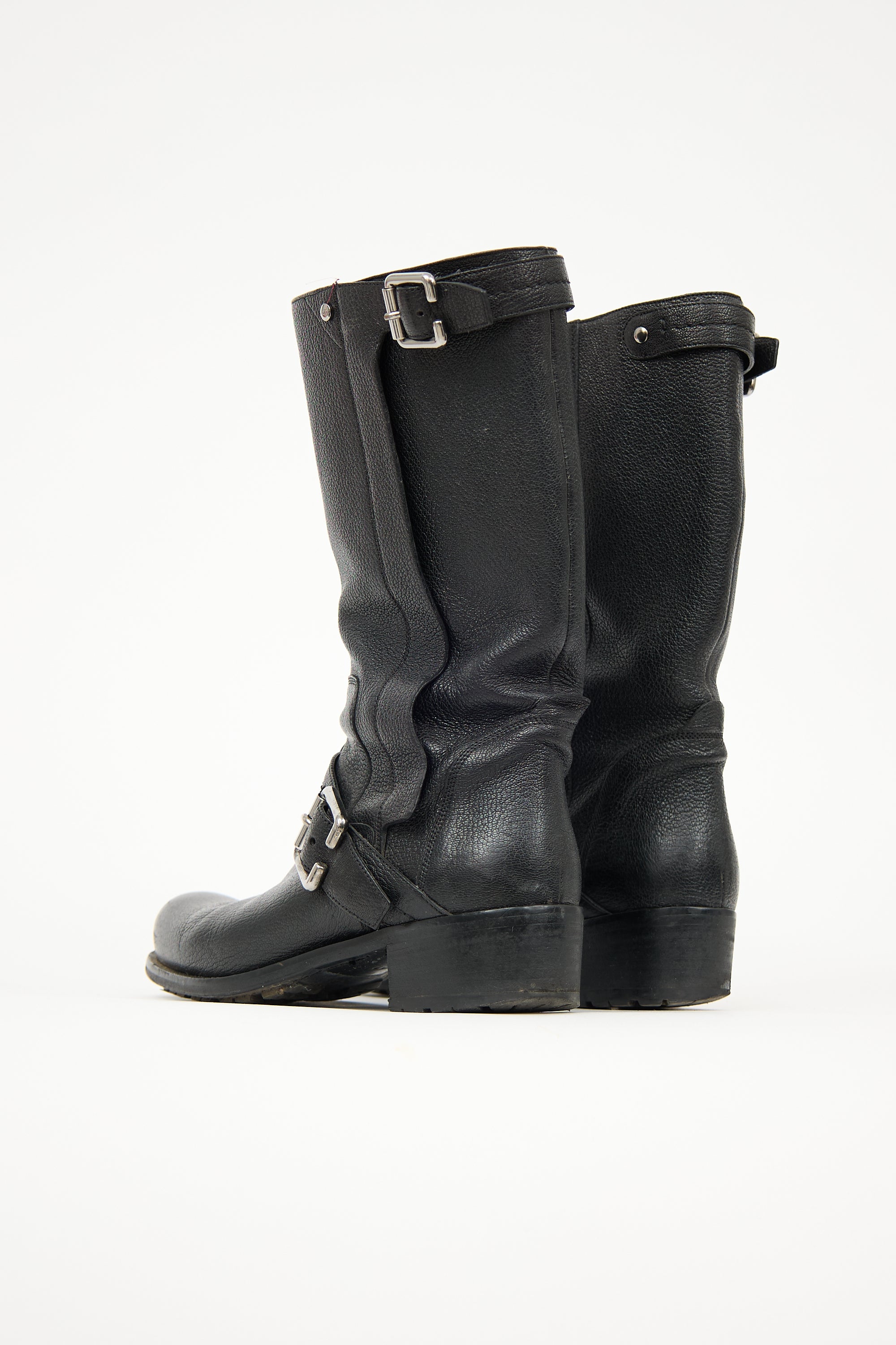 Pre-owned Dior black leather biker boots featuring rounded toe, buckled straps at instep and topline, etched logo rivet at outer topline, pull on entry, and tonal block heel.