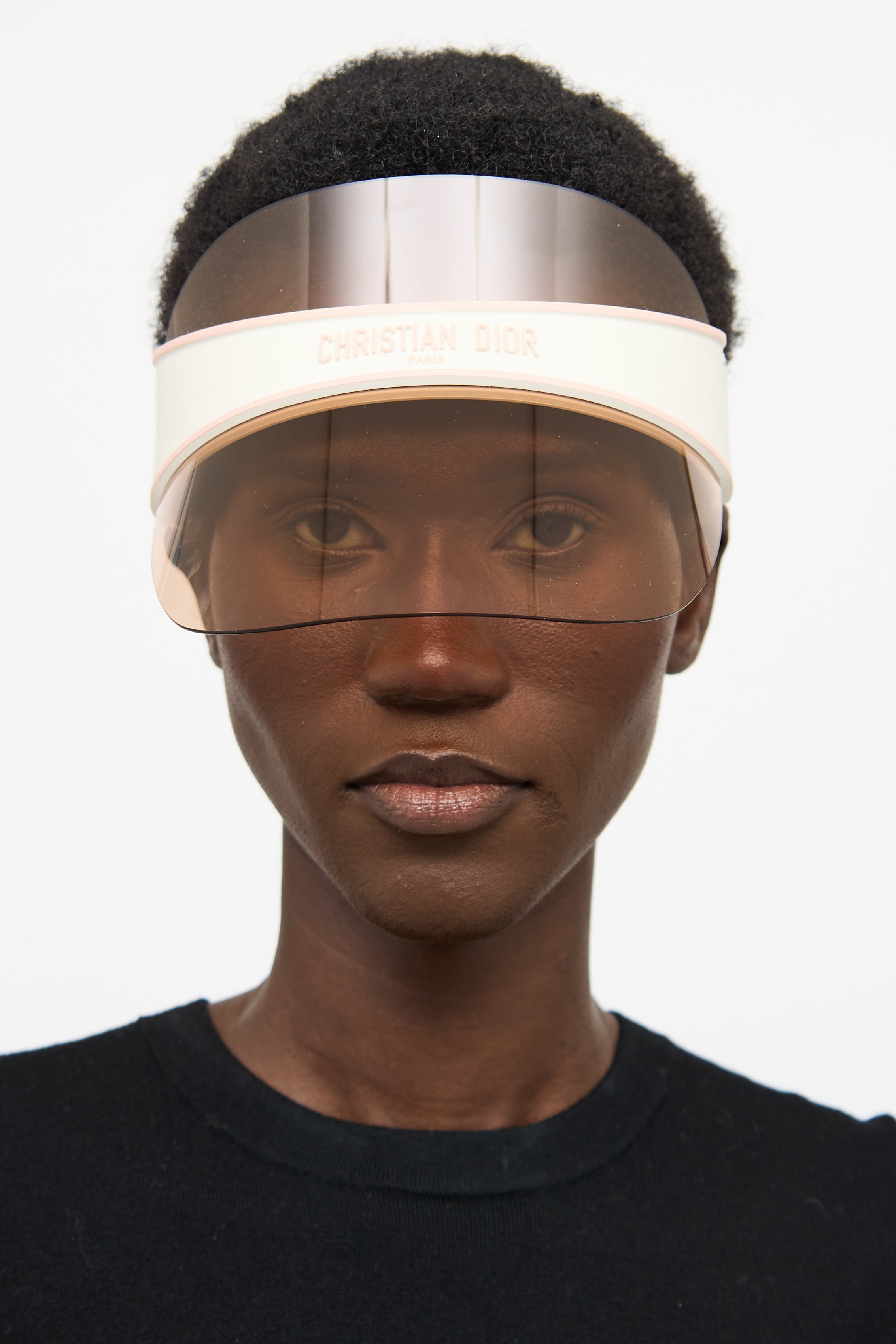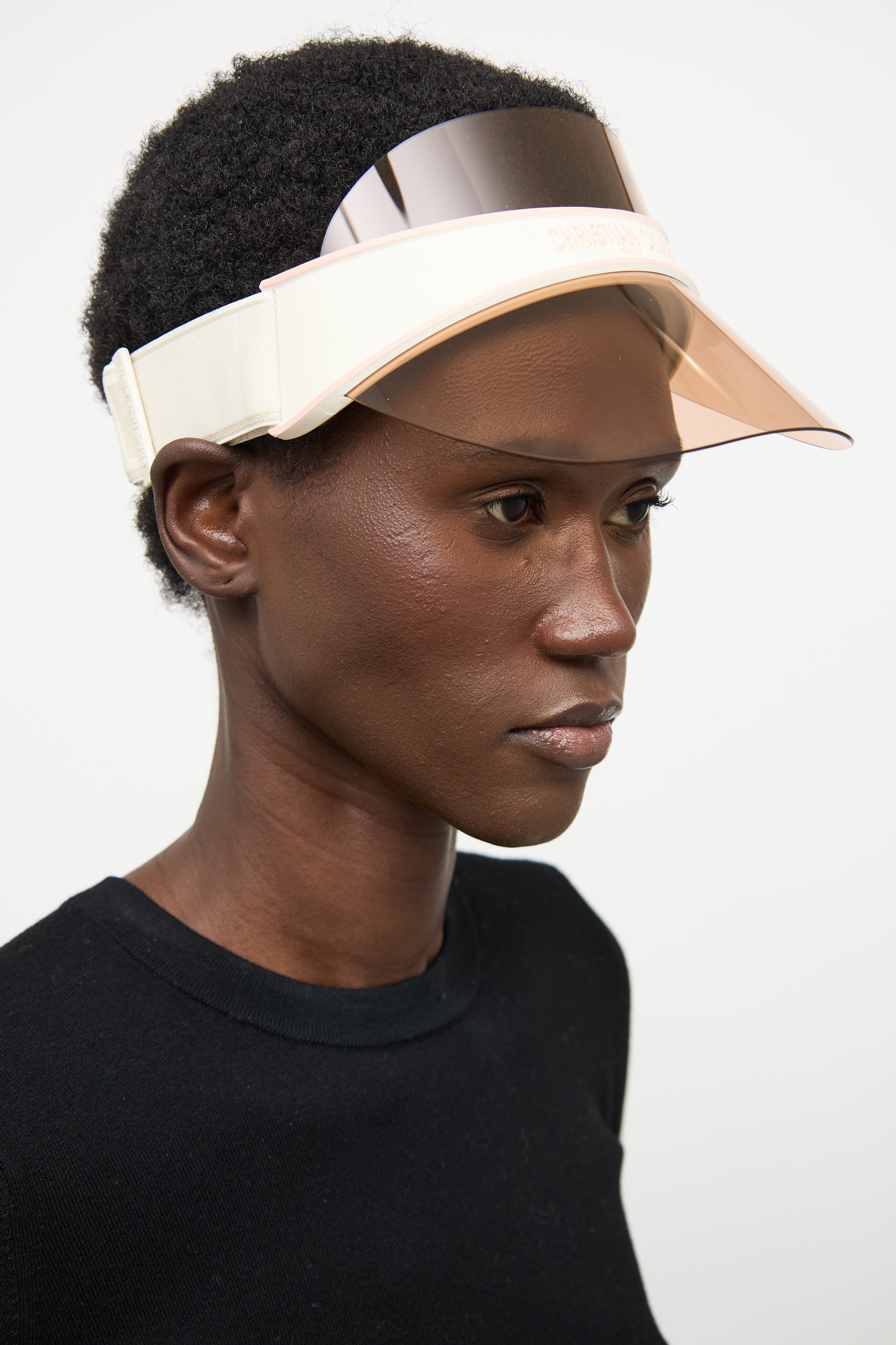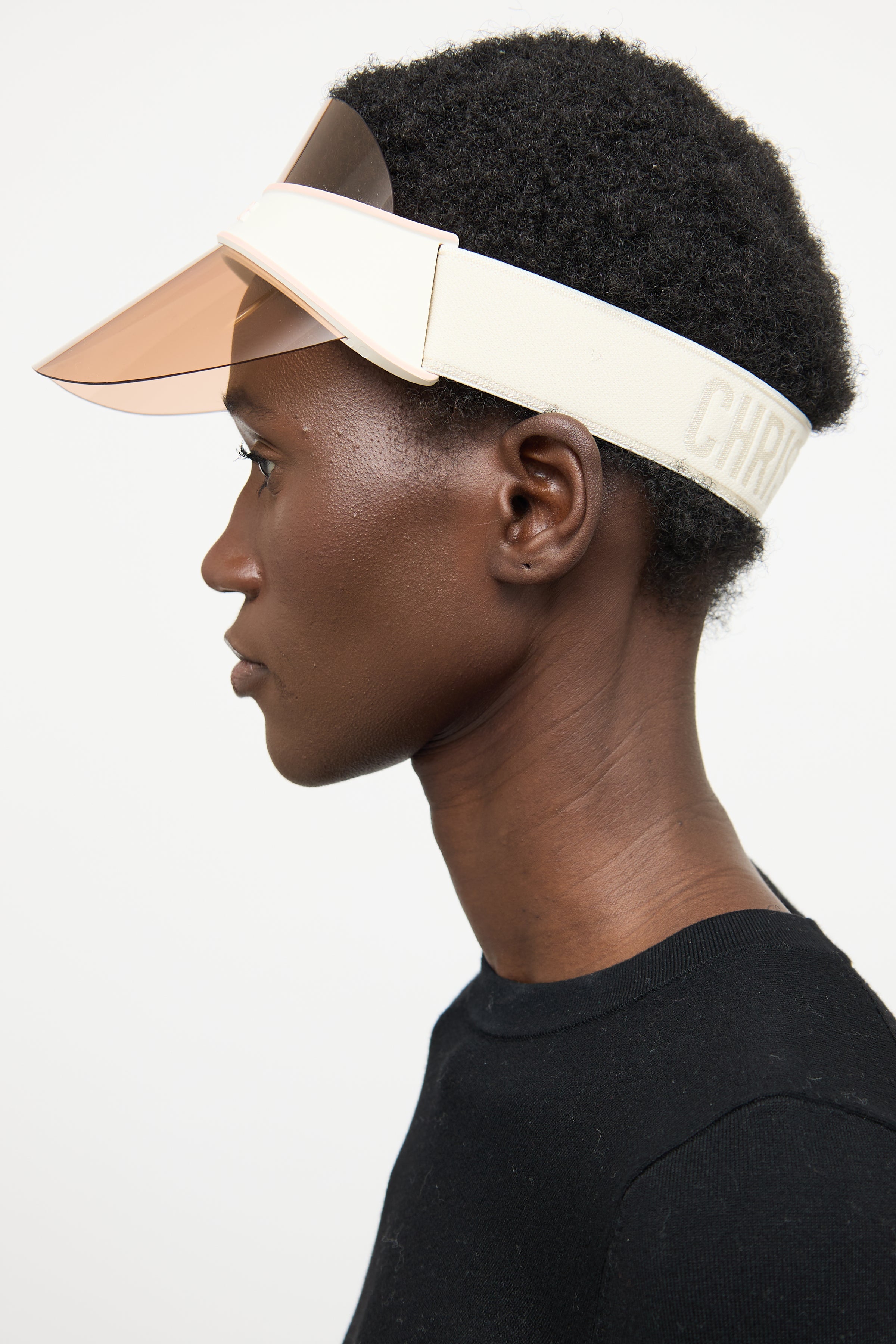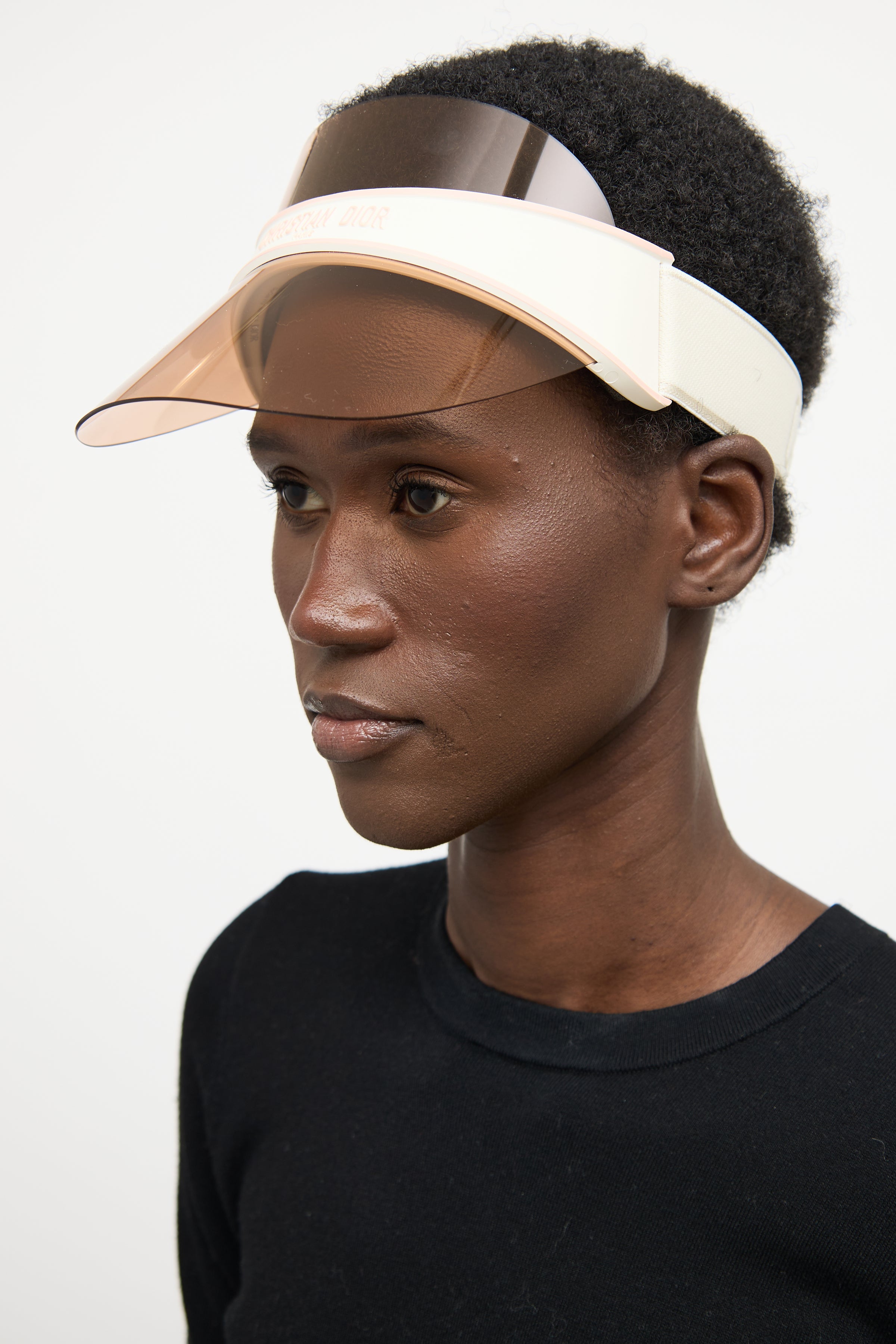 Pre-owned Dior Club1 visor featuring clear pink visor, rubberized lining with Christian Dior text, padding on forehead interior, and adjustable webbed strap with logo text.