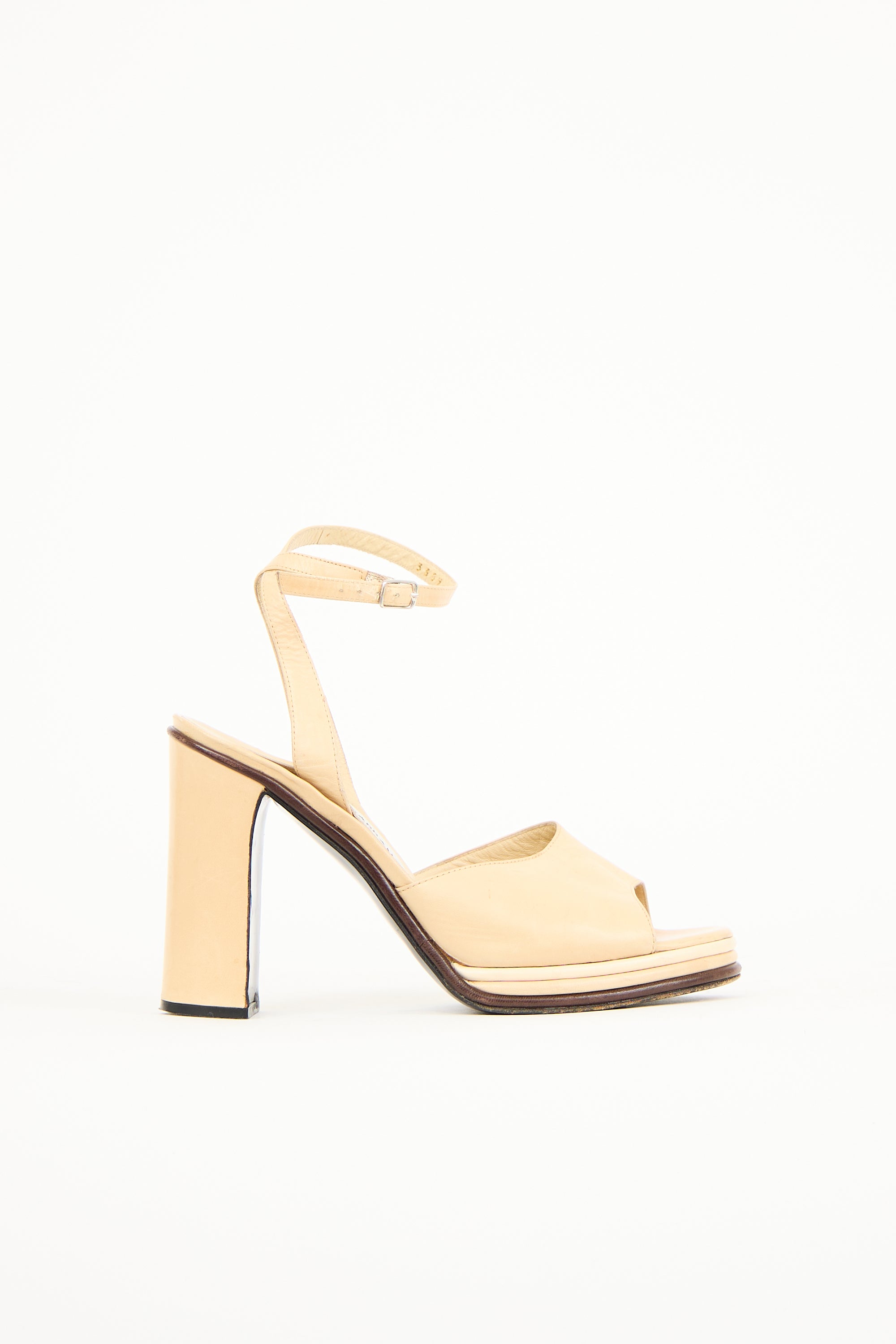 Pre-owned Dolce & Gabbana beige leather heels featuring open rounded toe, strap across vamp, adjustable ankle strap with buckle fastening, short tiered platform, and covered block heel.