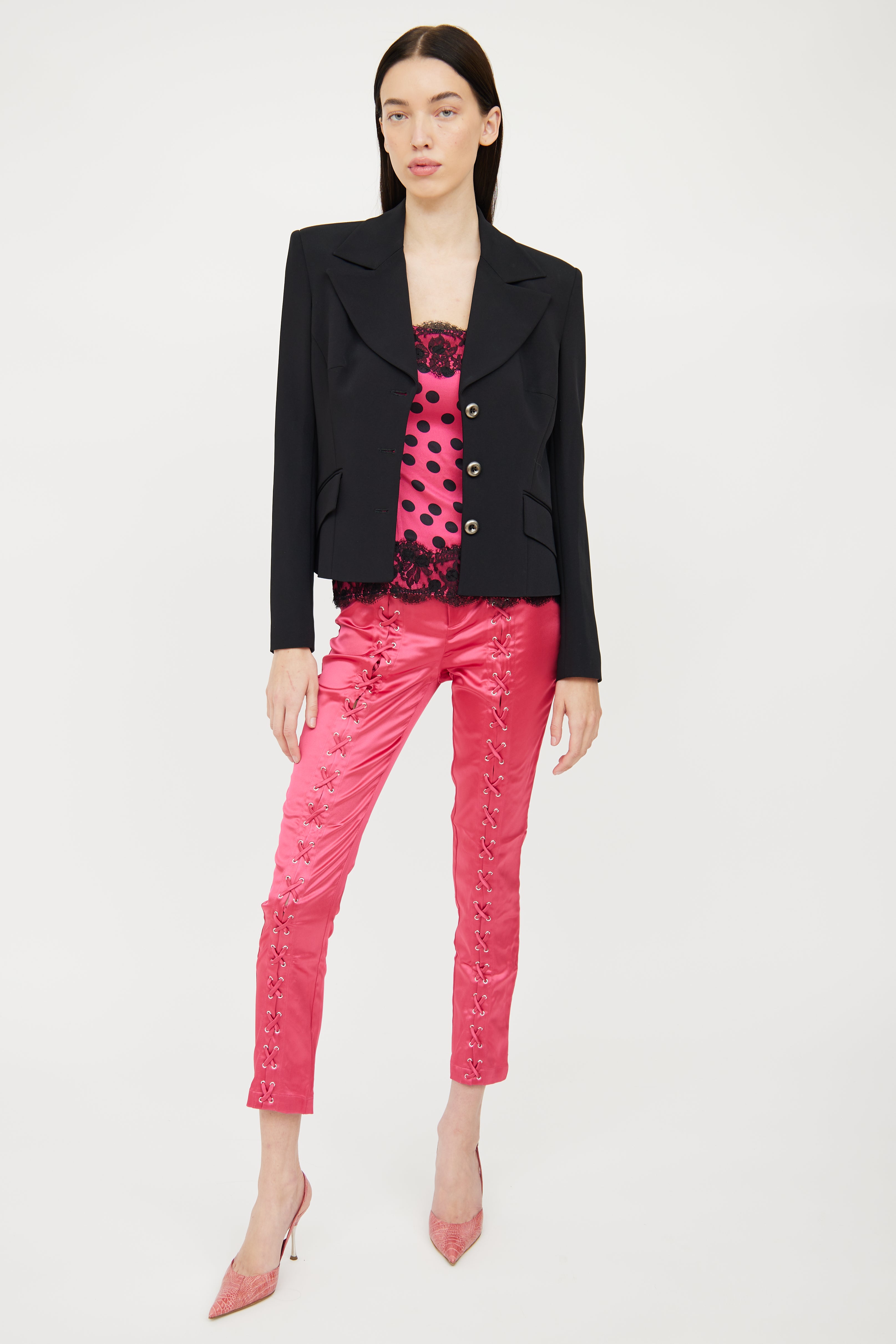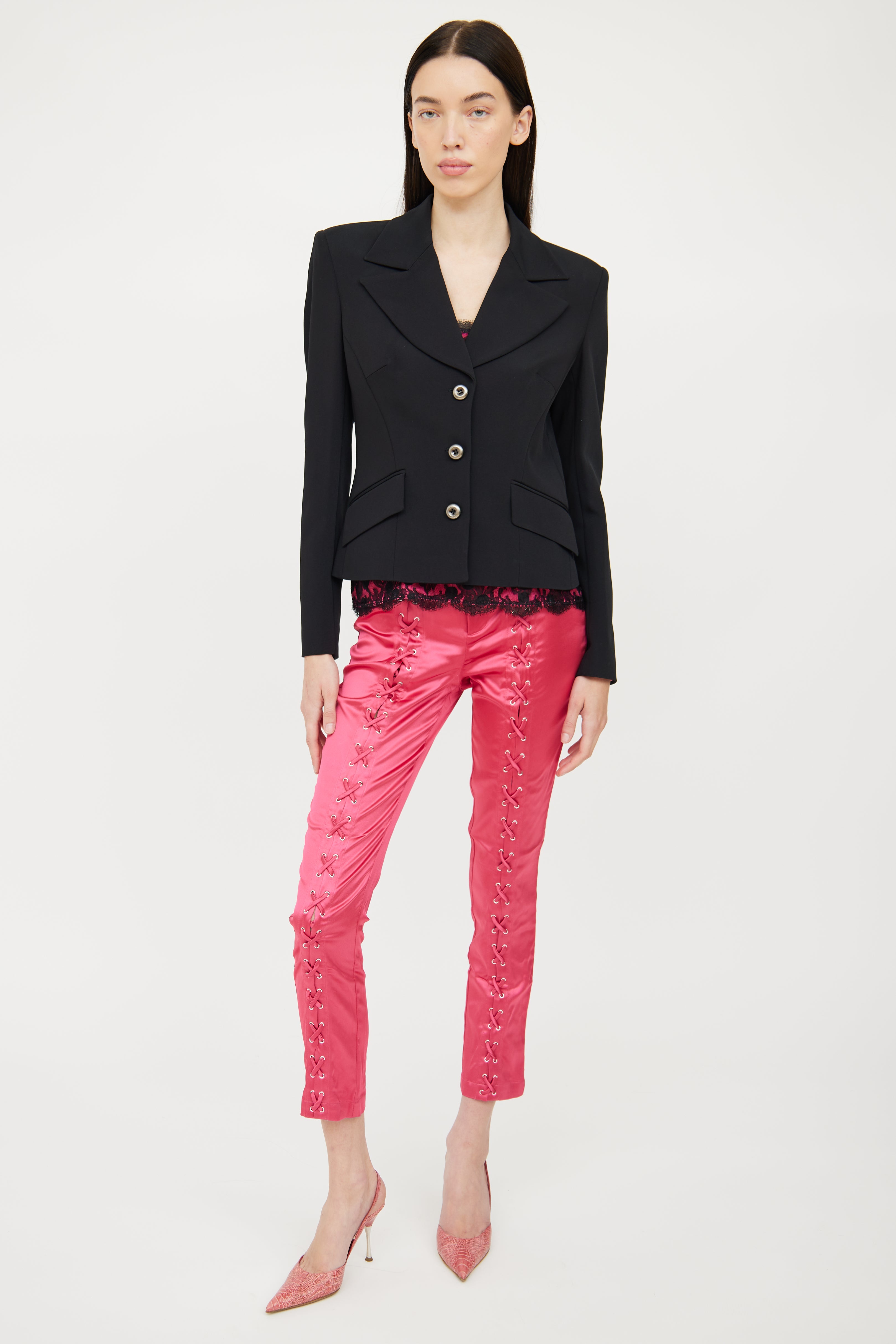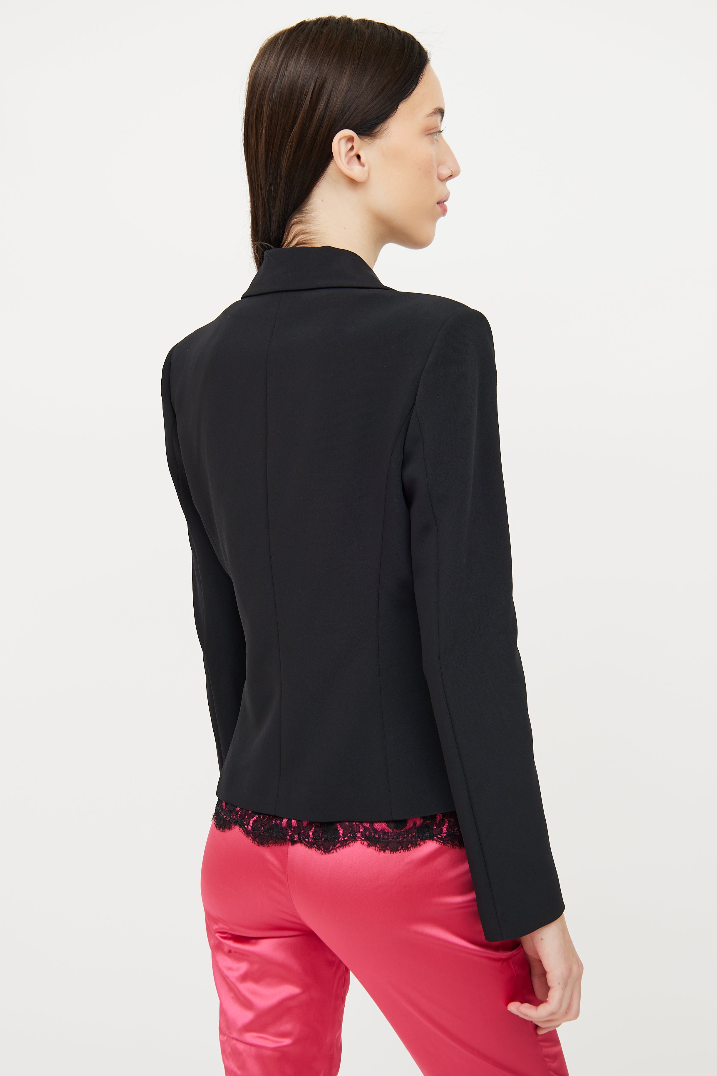 Pre-owned Dolce & Gabbana black long sleeve blazer featuring notch lapel collar, padded shoulders, button up front, dual stitched flap pockets on waist and hot pink logo stamped interior.
