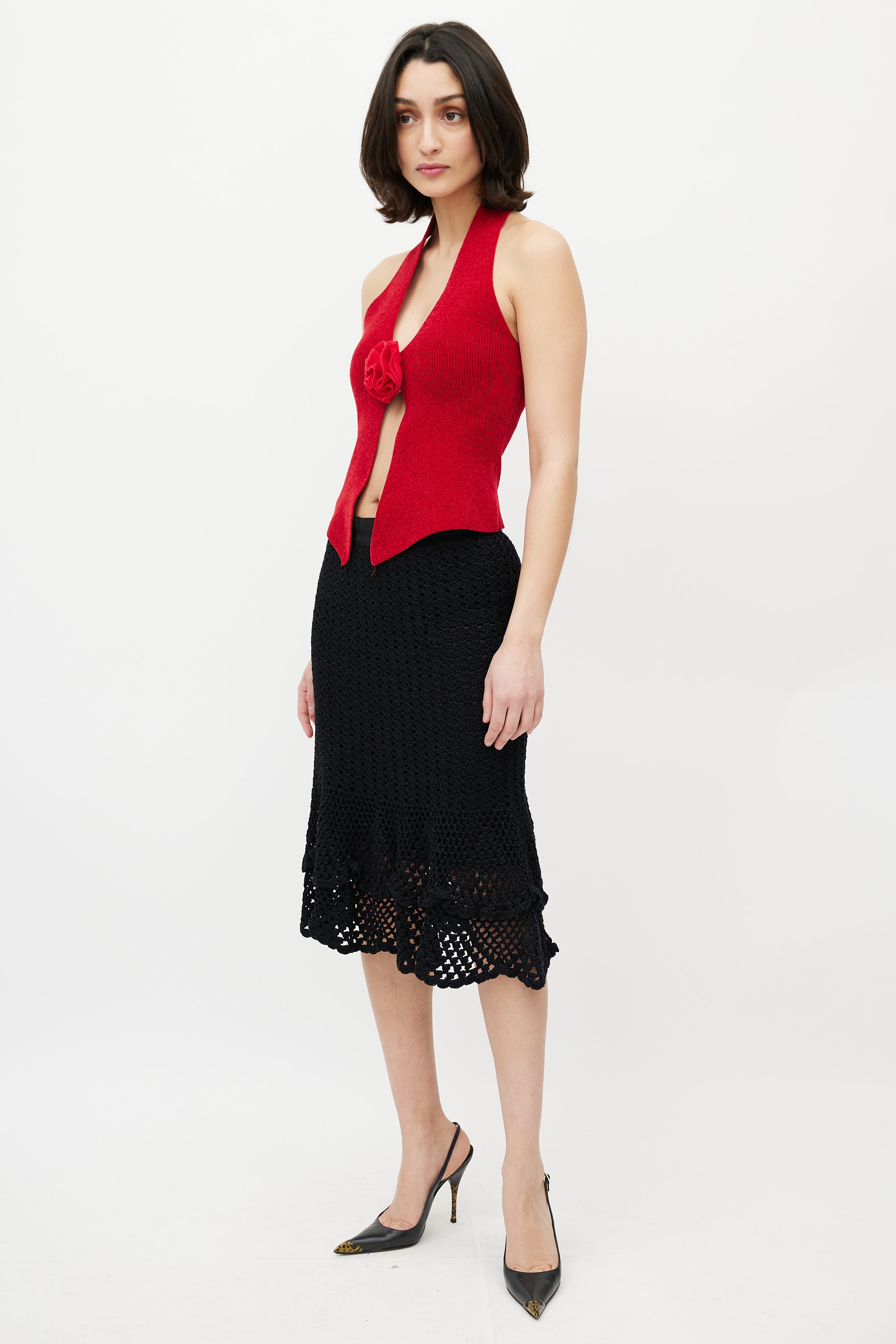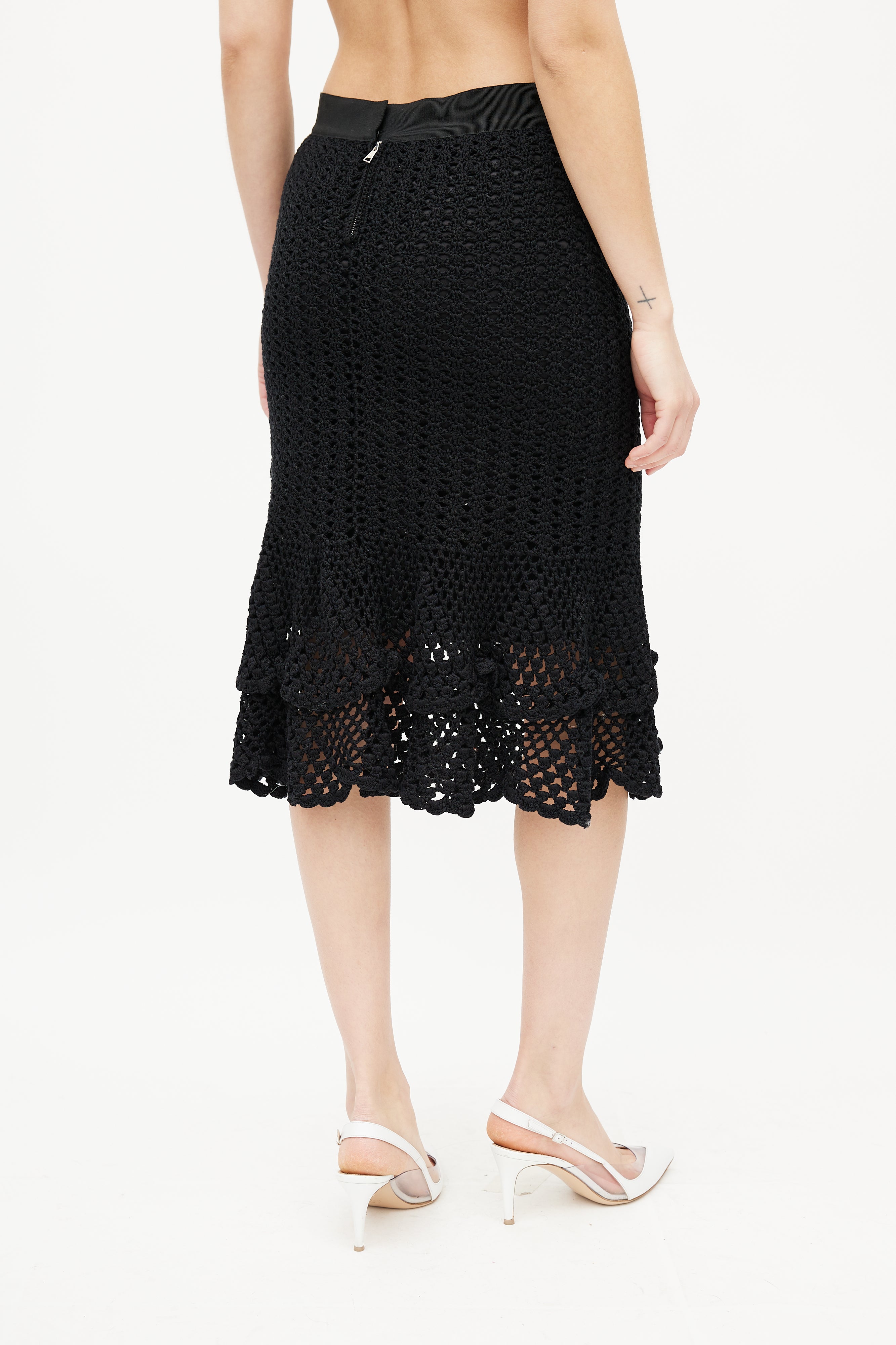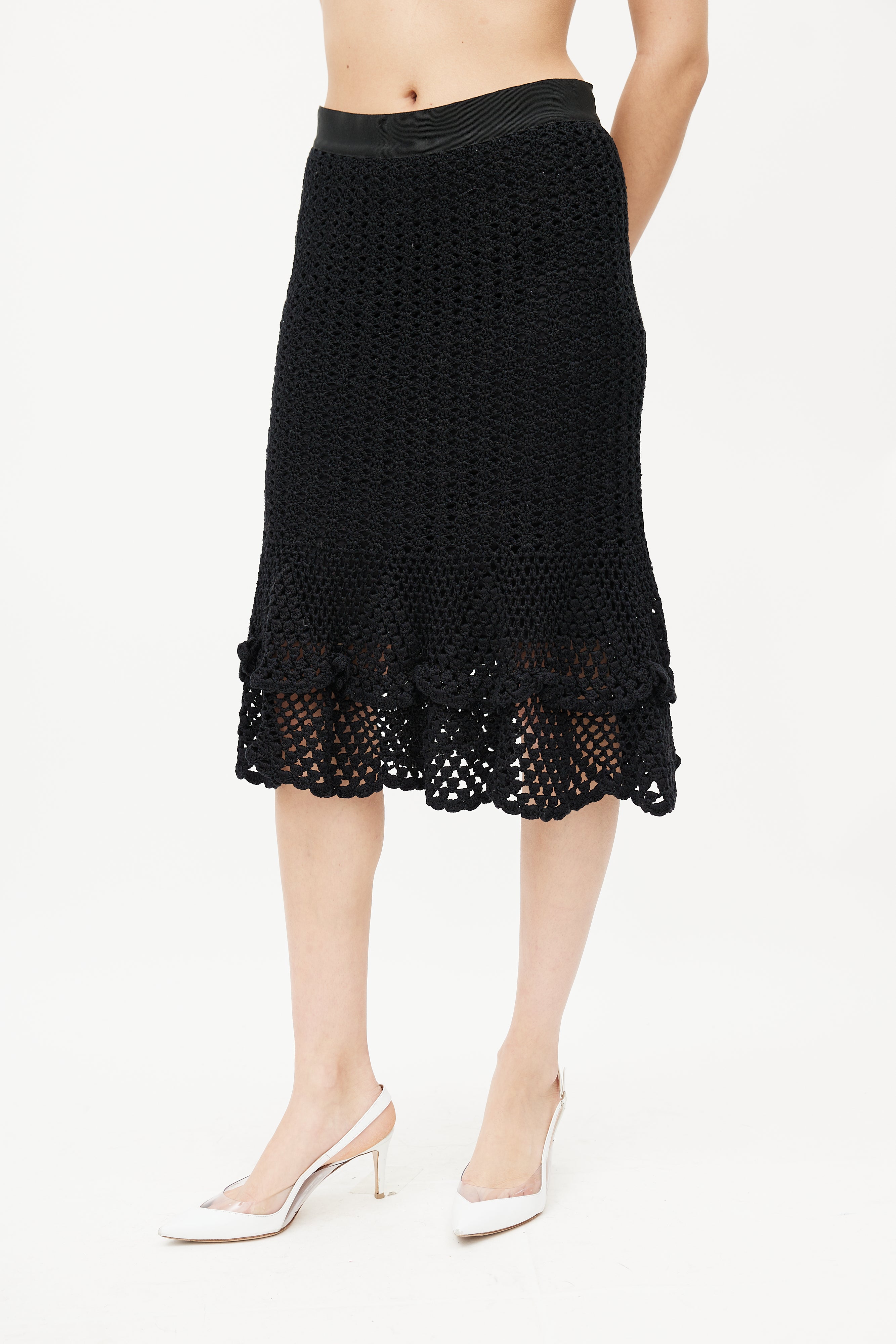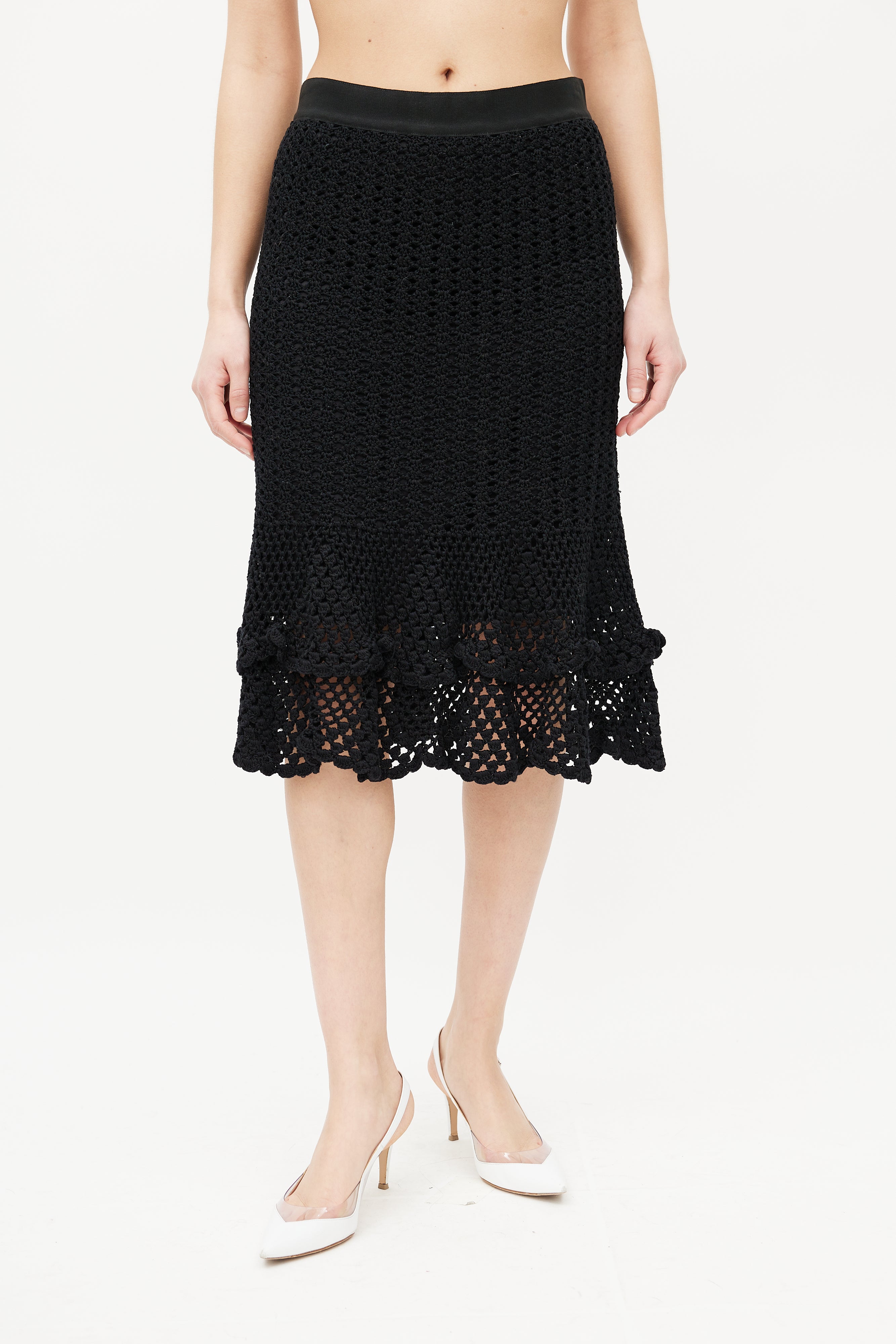 Pre-owned Dolce & Gabbana black skirt featuring grosgrain waistband, mesh crochet, zip closure at back, and ruffle hem. Comes with a black silk slip skirt.