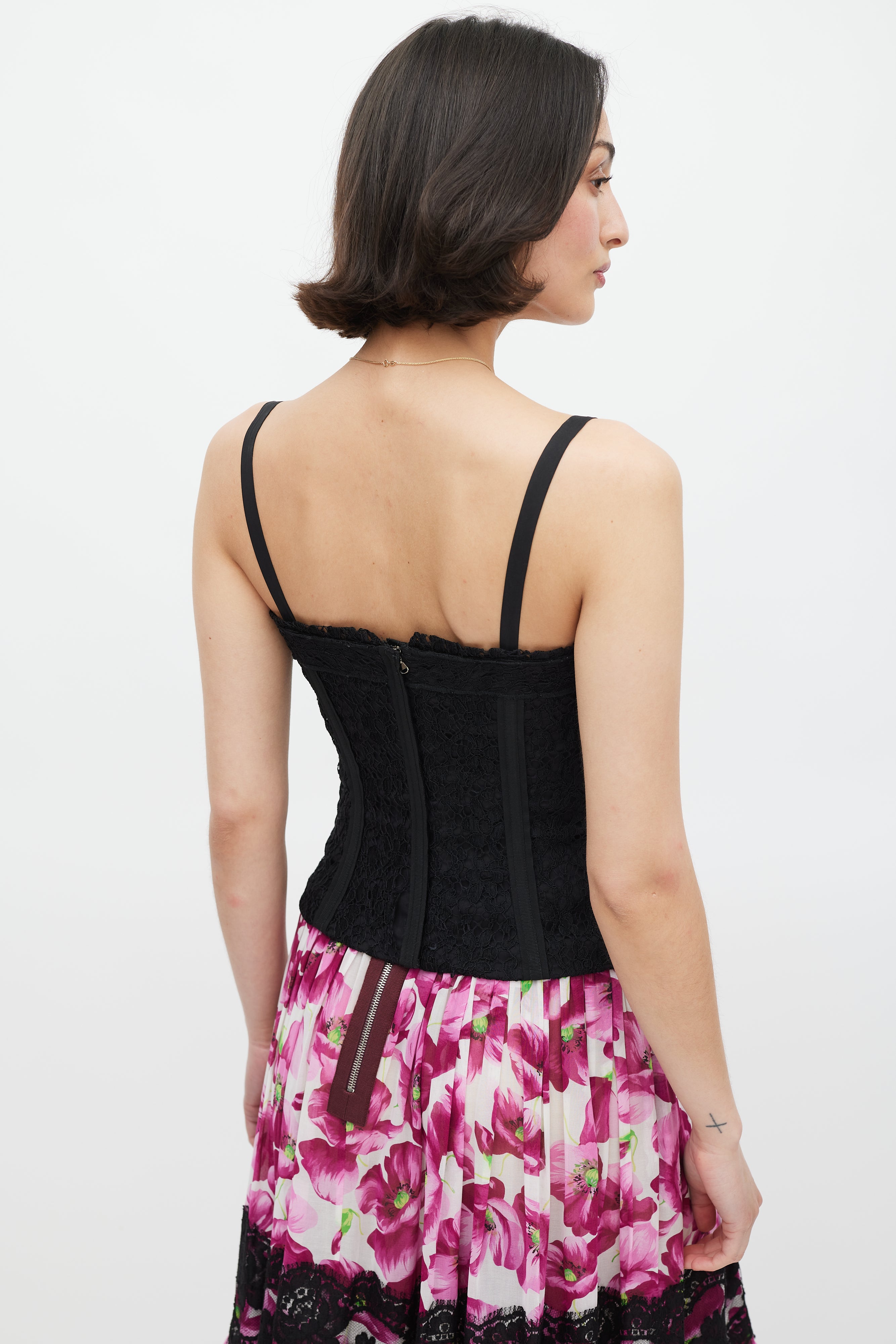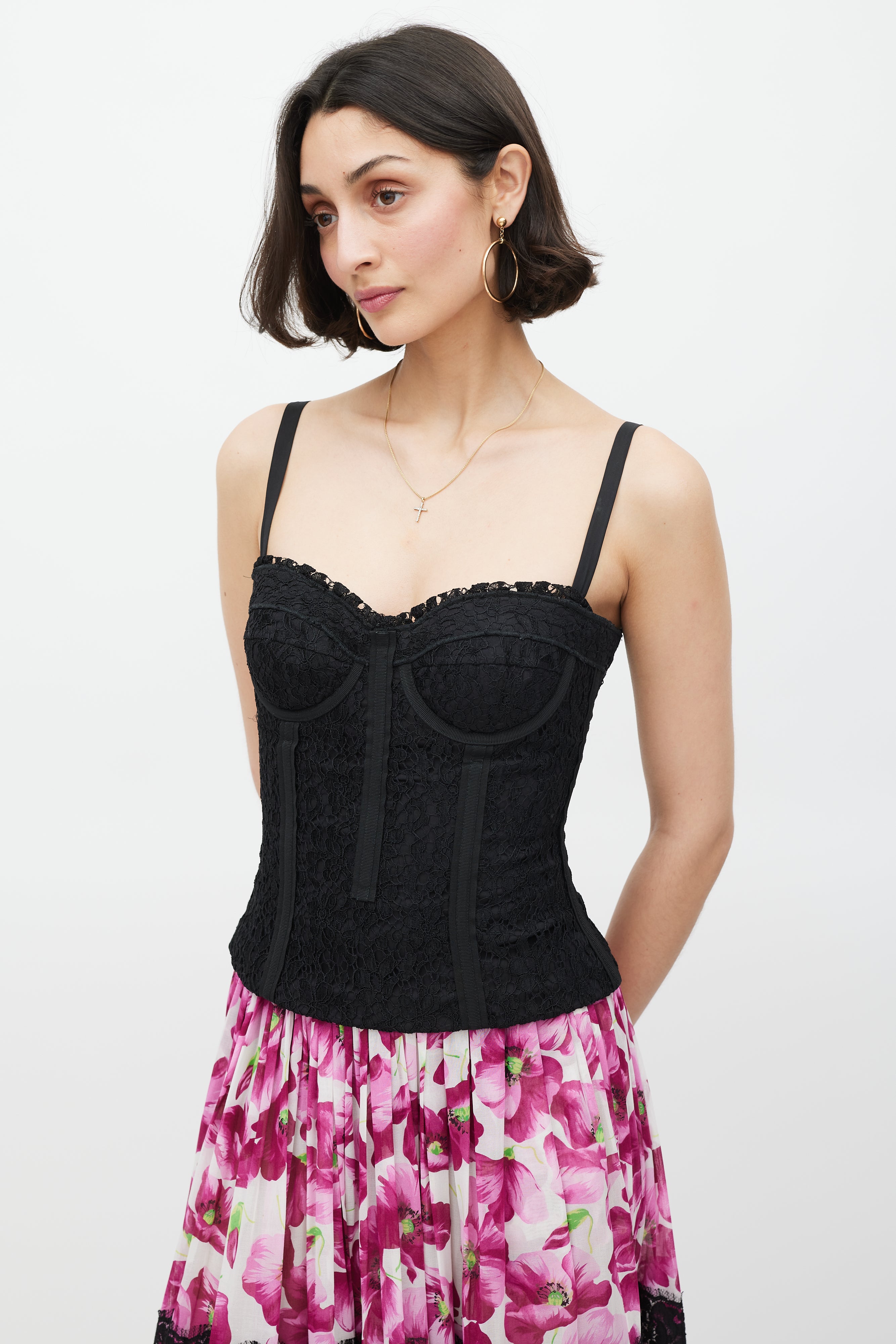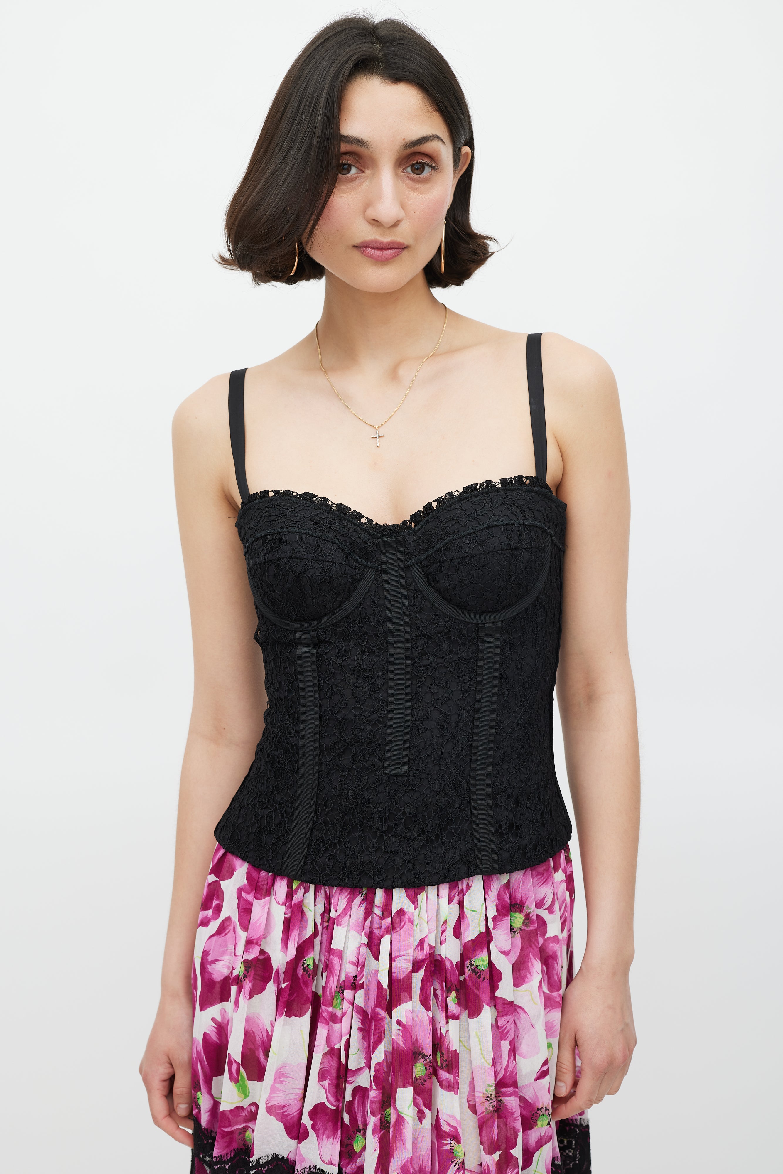 Pre-owned Dolce & Gabbana black floral guipure lace bustier top featuring dual shoulder straps, sweetheart neckline, exposed construction, boning throughout, and concealed back zip closure. Lined.