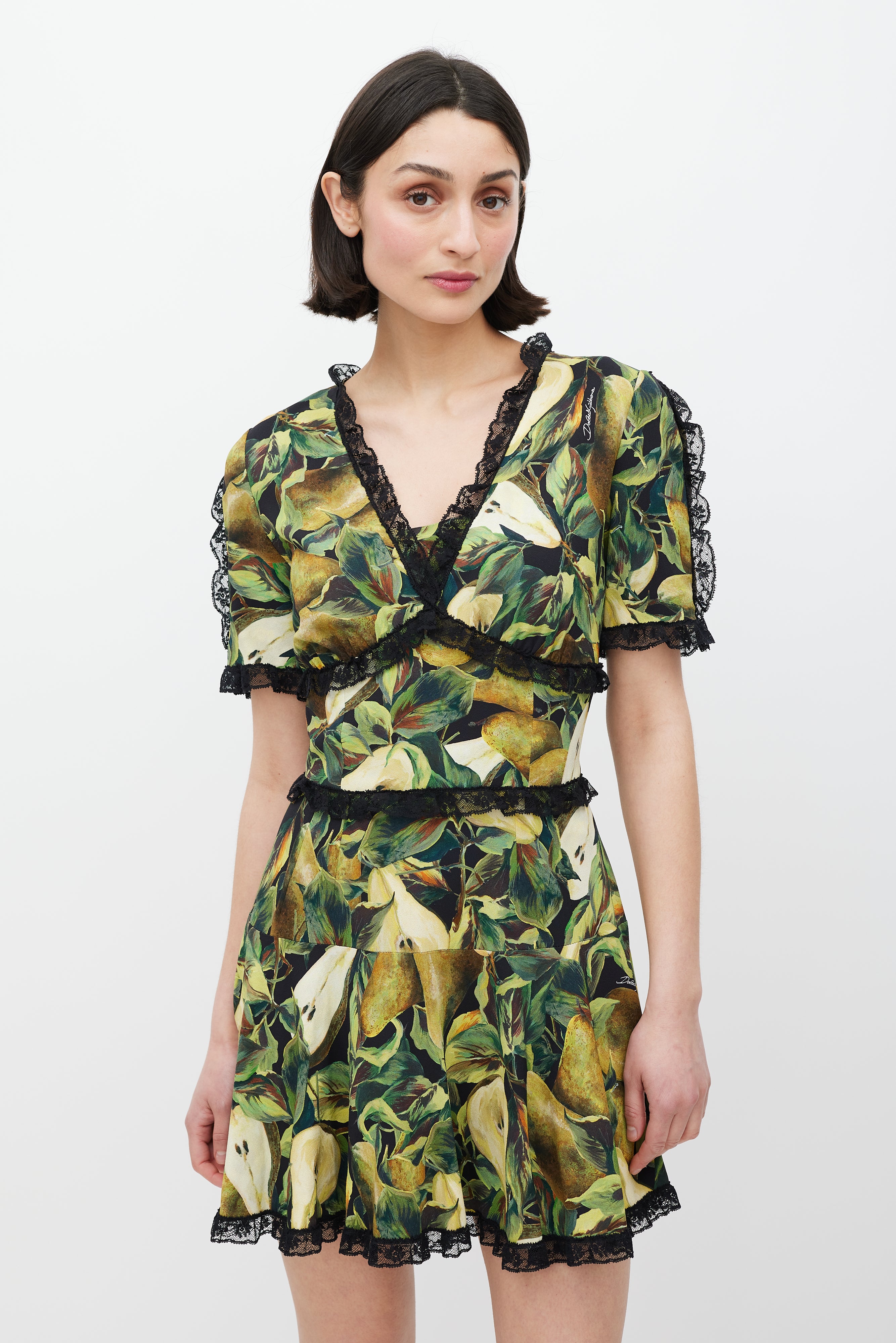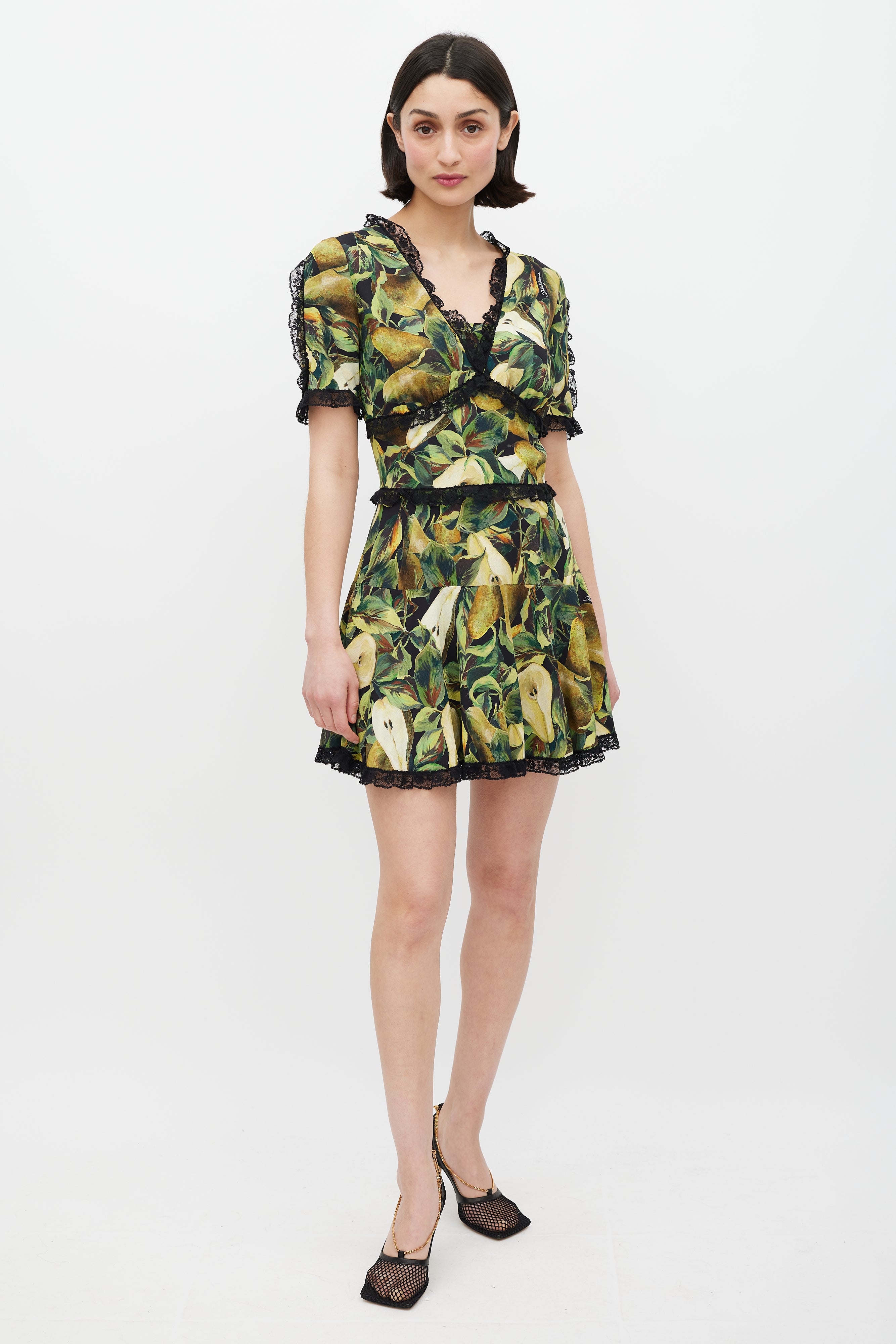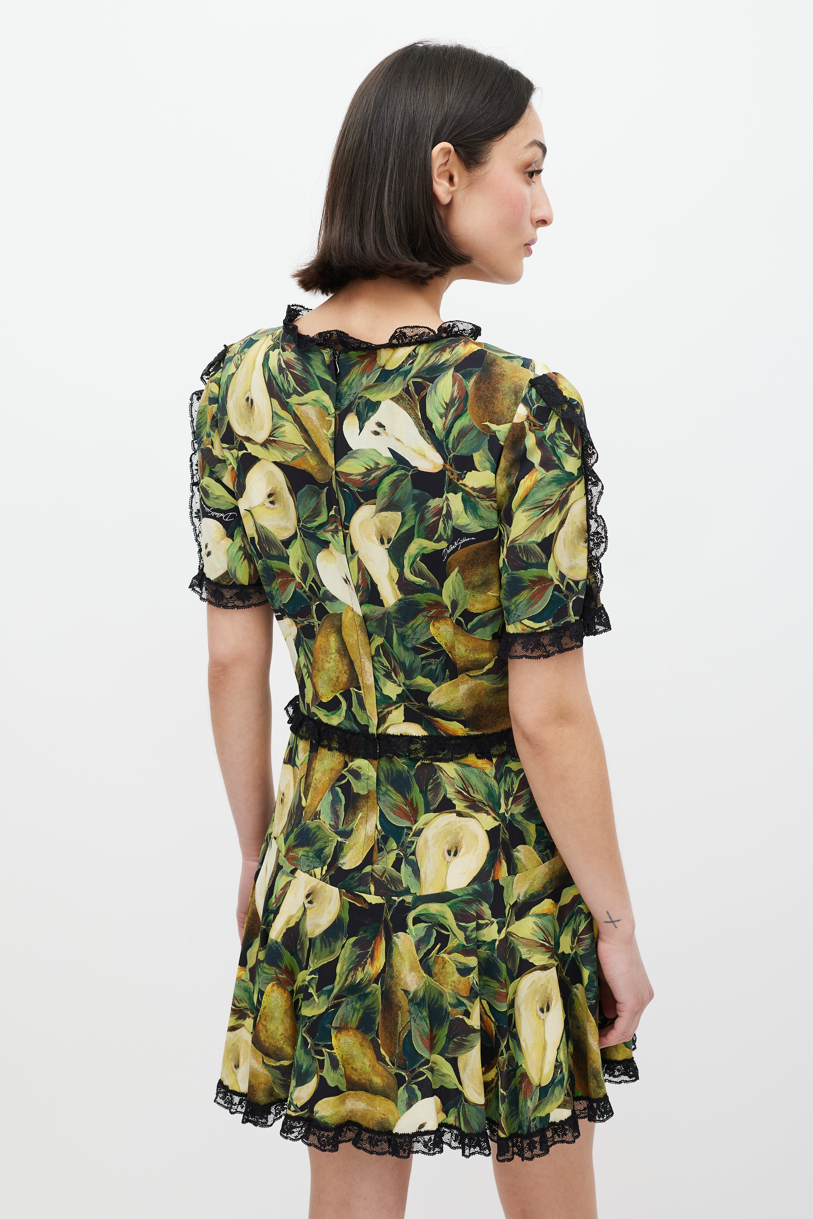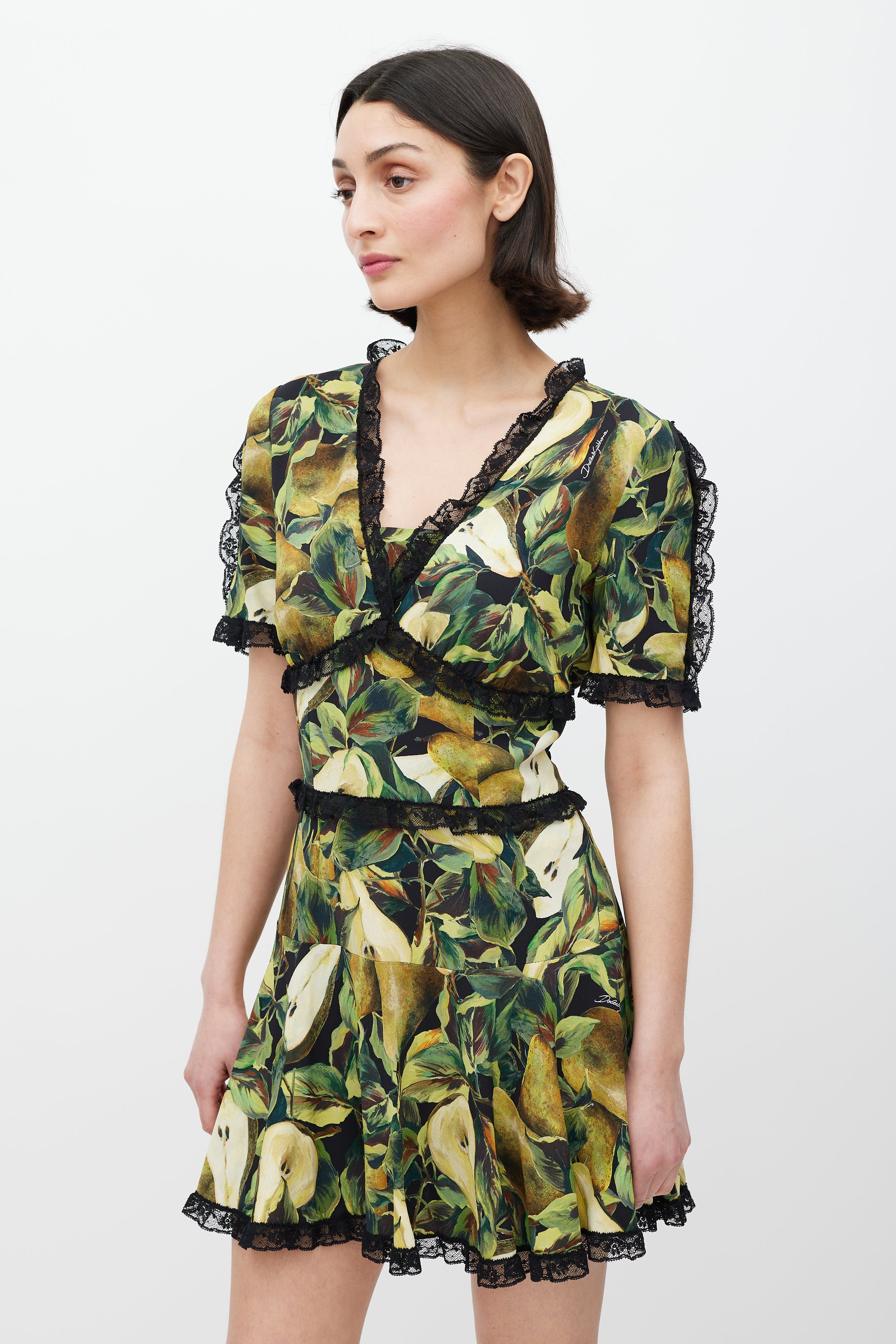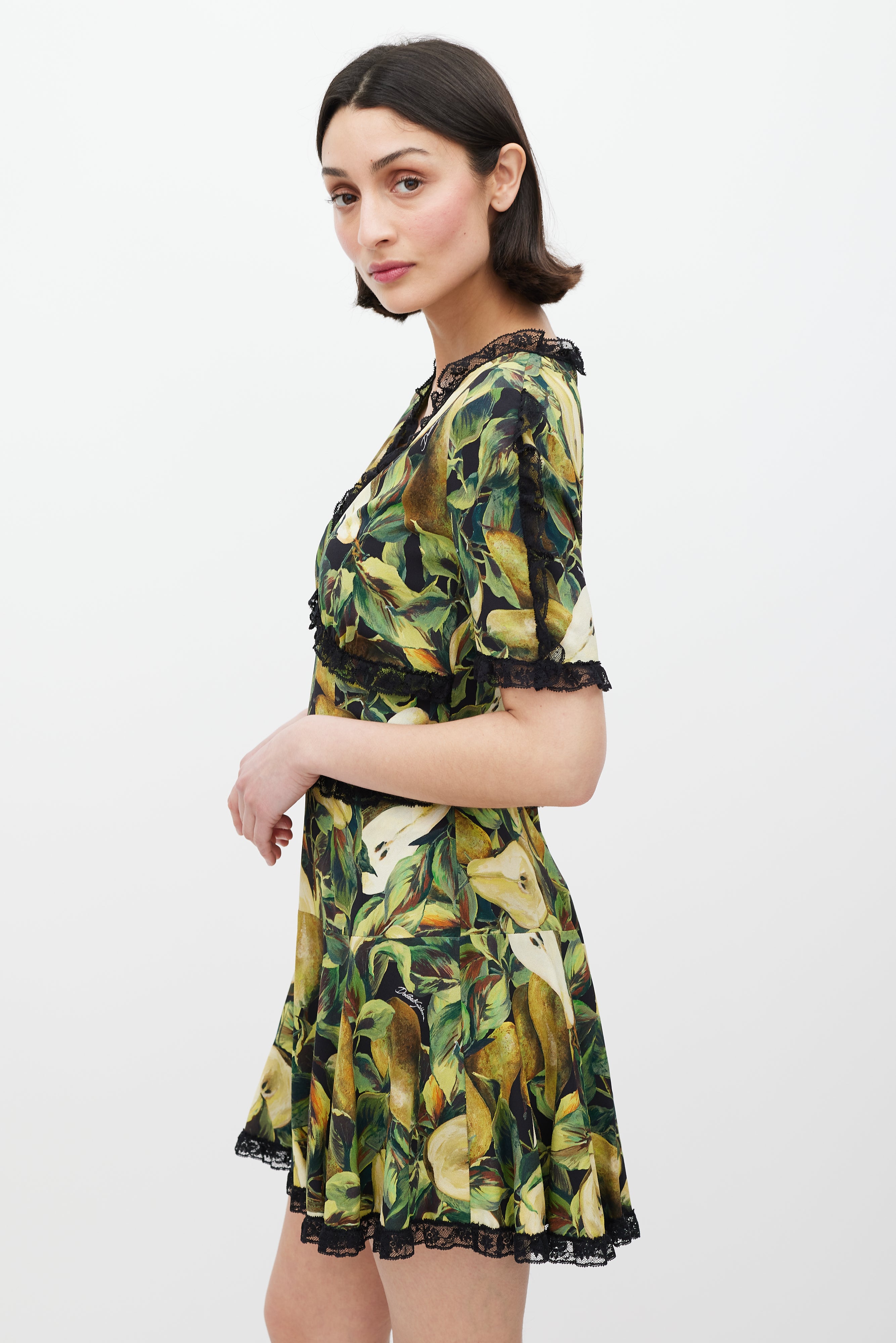 Pre-owned Dolce & Gabbana black Cady dress featuring a green Pear pattern throughout, V-neckline, short sleeves, ruffled floral lace trim, and zip at back with hook and eye closure. Clipped to fit model.