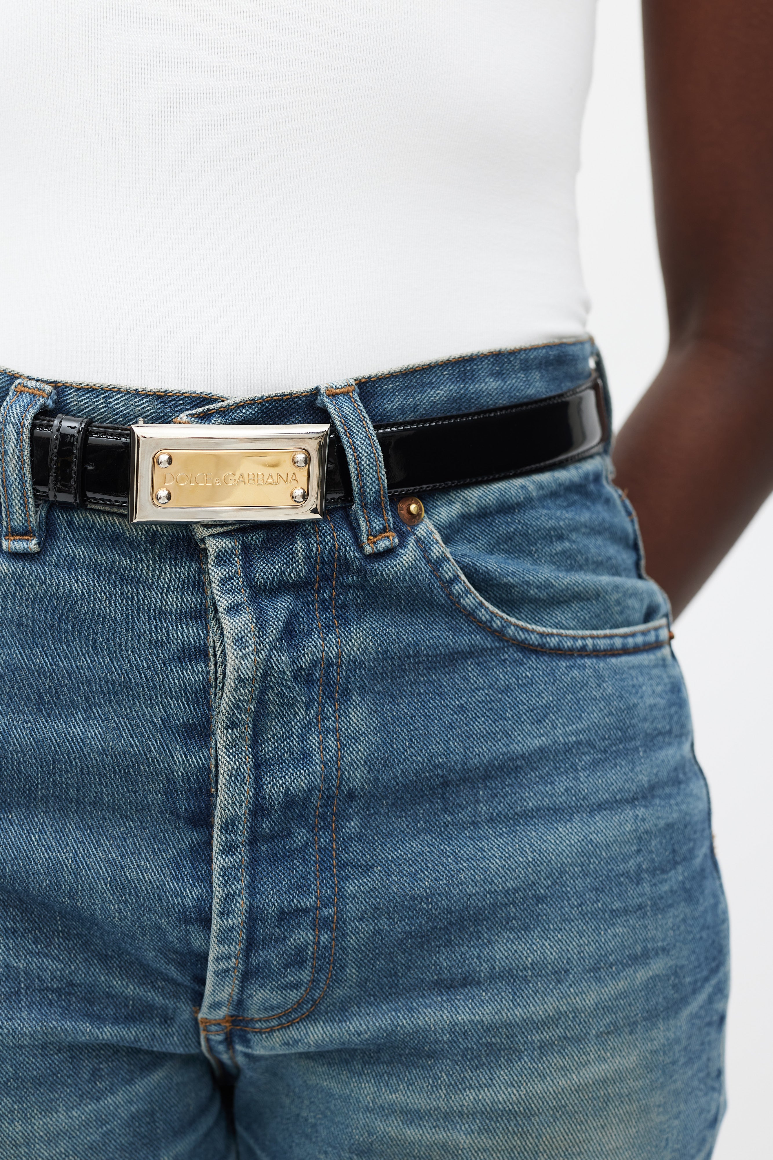 Pre-owned Dolce & Gabanna black patent leather belt featuring a debossed silver tone and gold tone plate buckle, stud closure, and stamped logo at inner side.