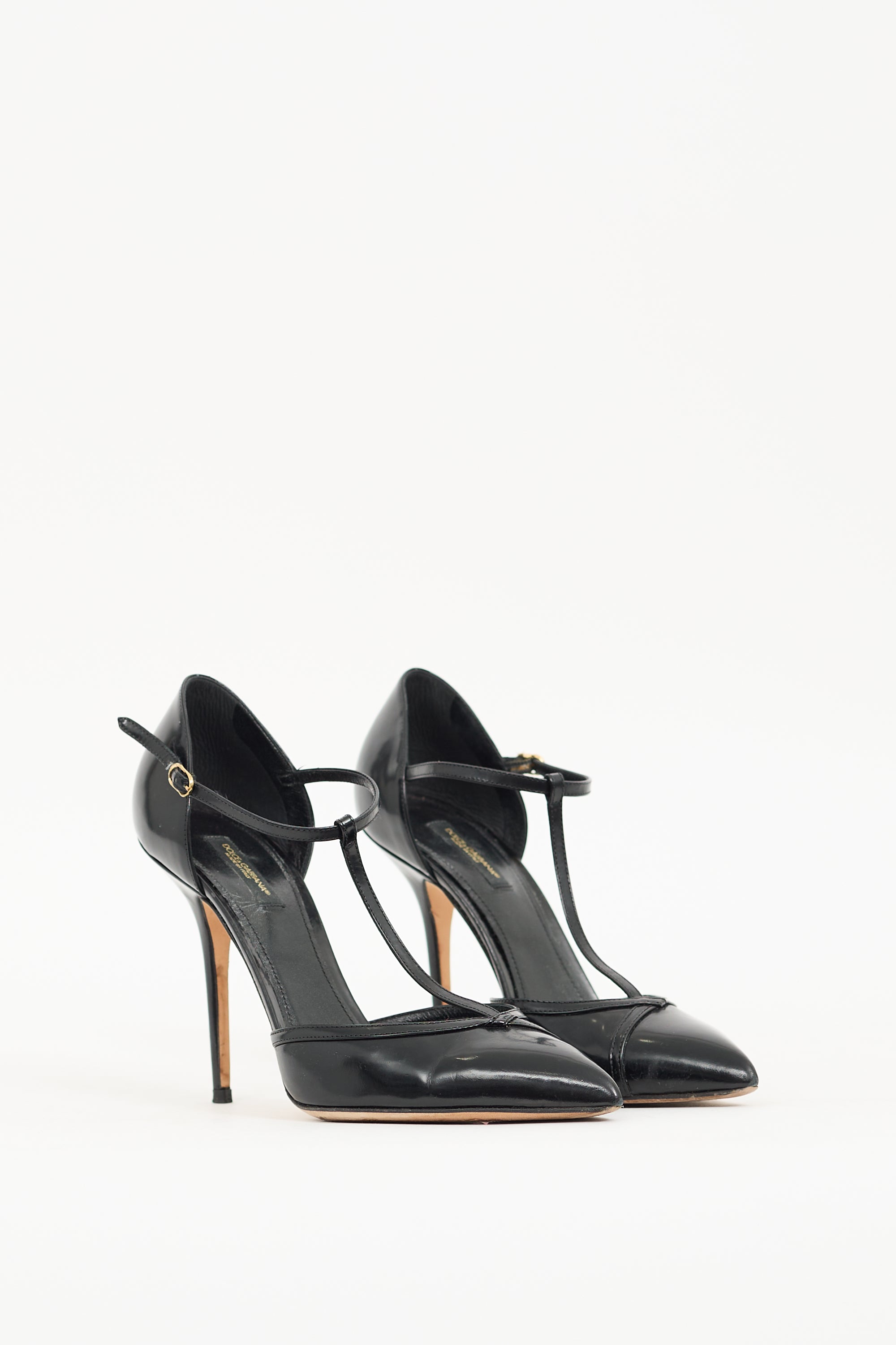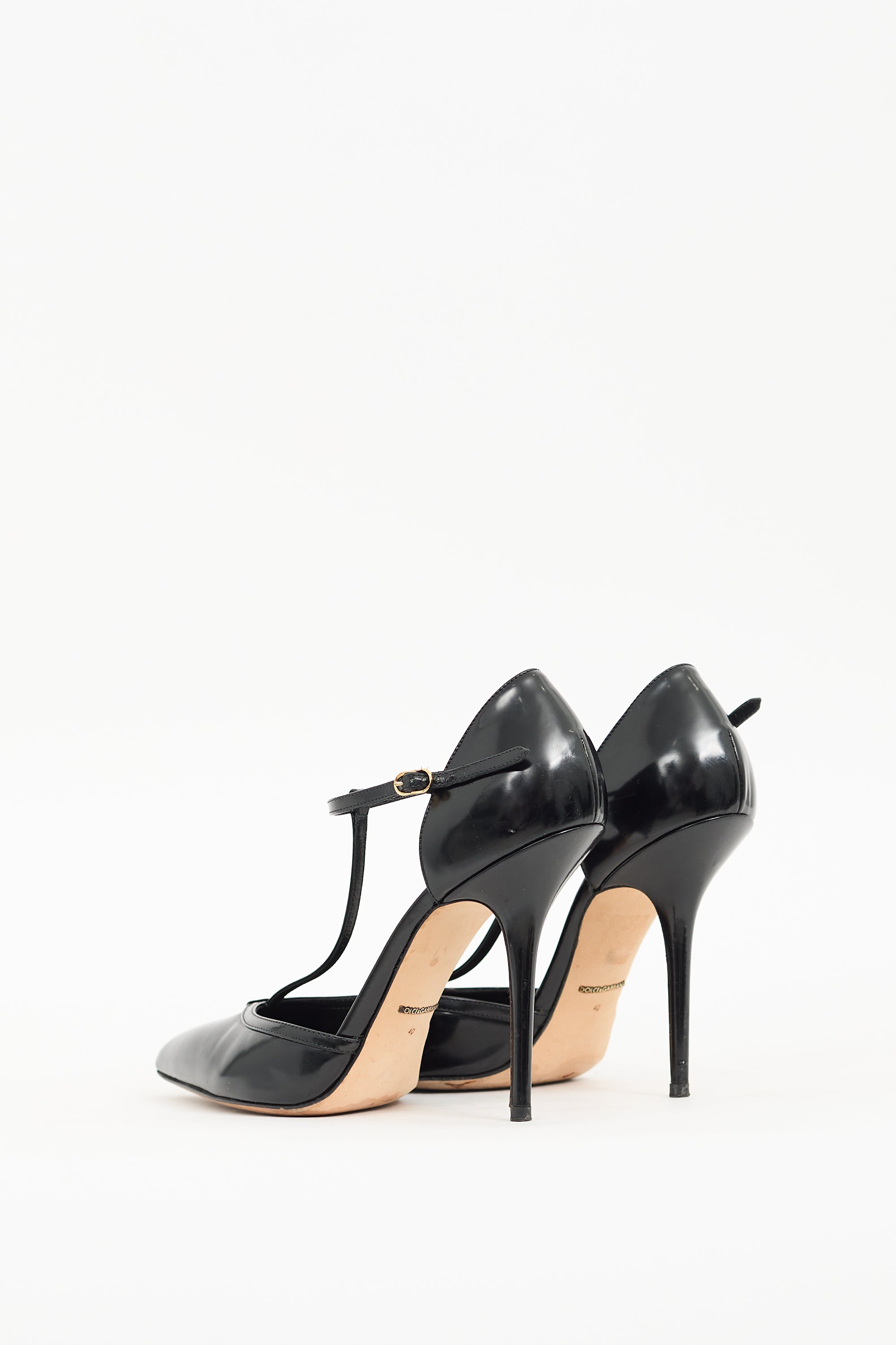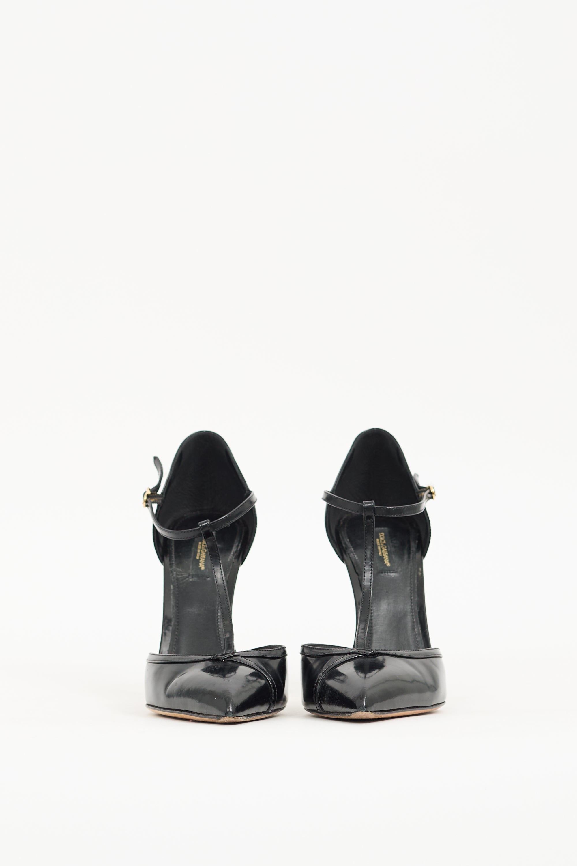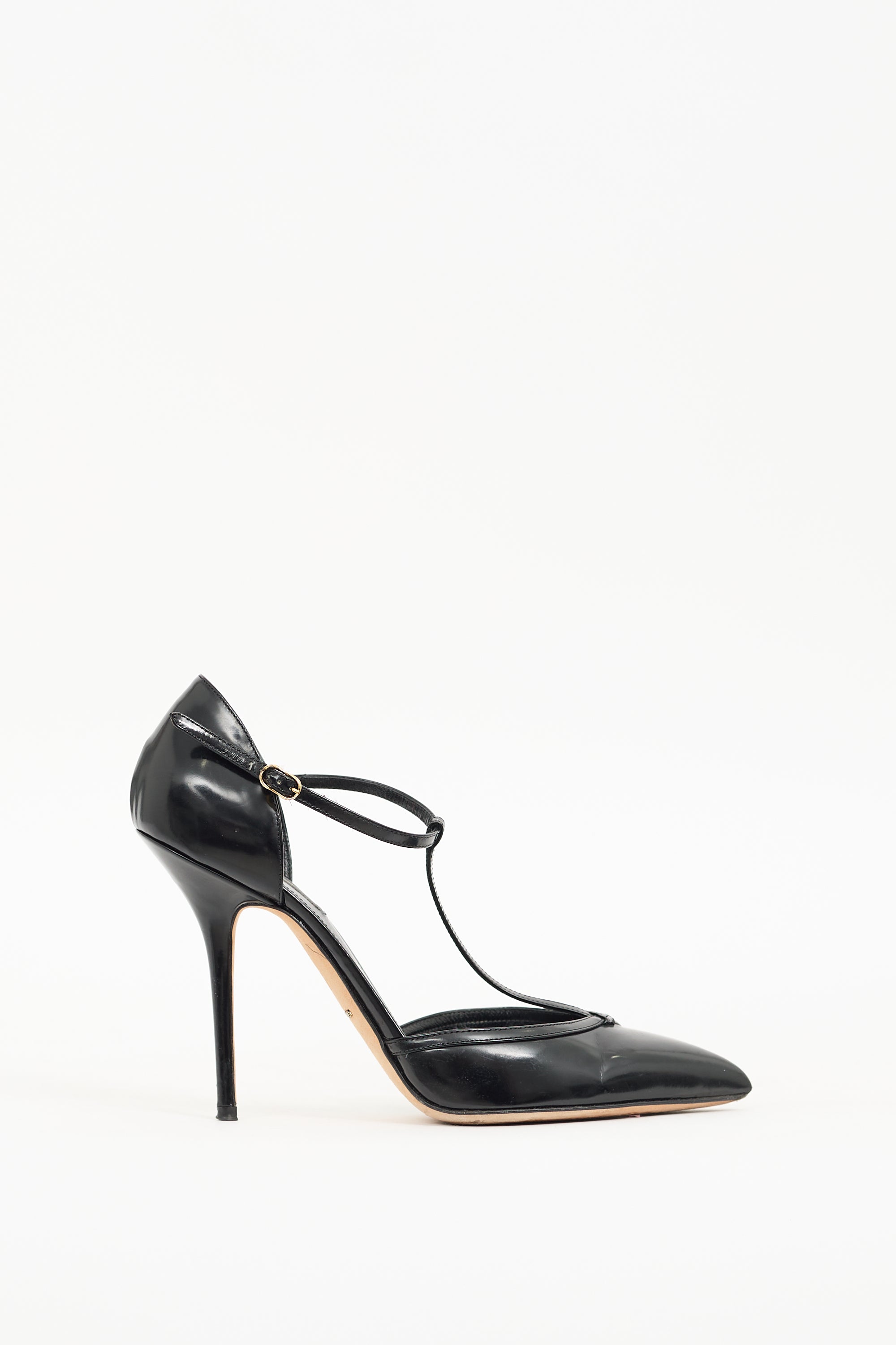 Pre-owned Dolce & Gabbana black patent leather heels featuring pointed toe, T-strap, ankle strap with buckle closure, and stiletto heel.