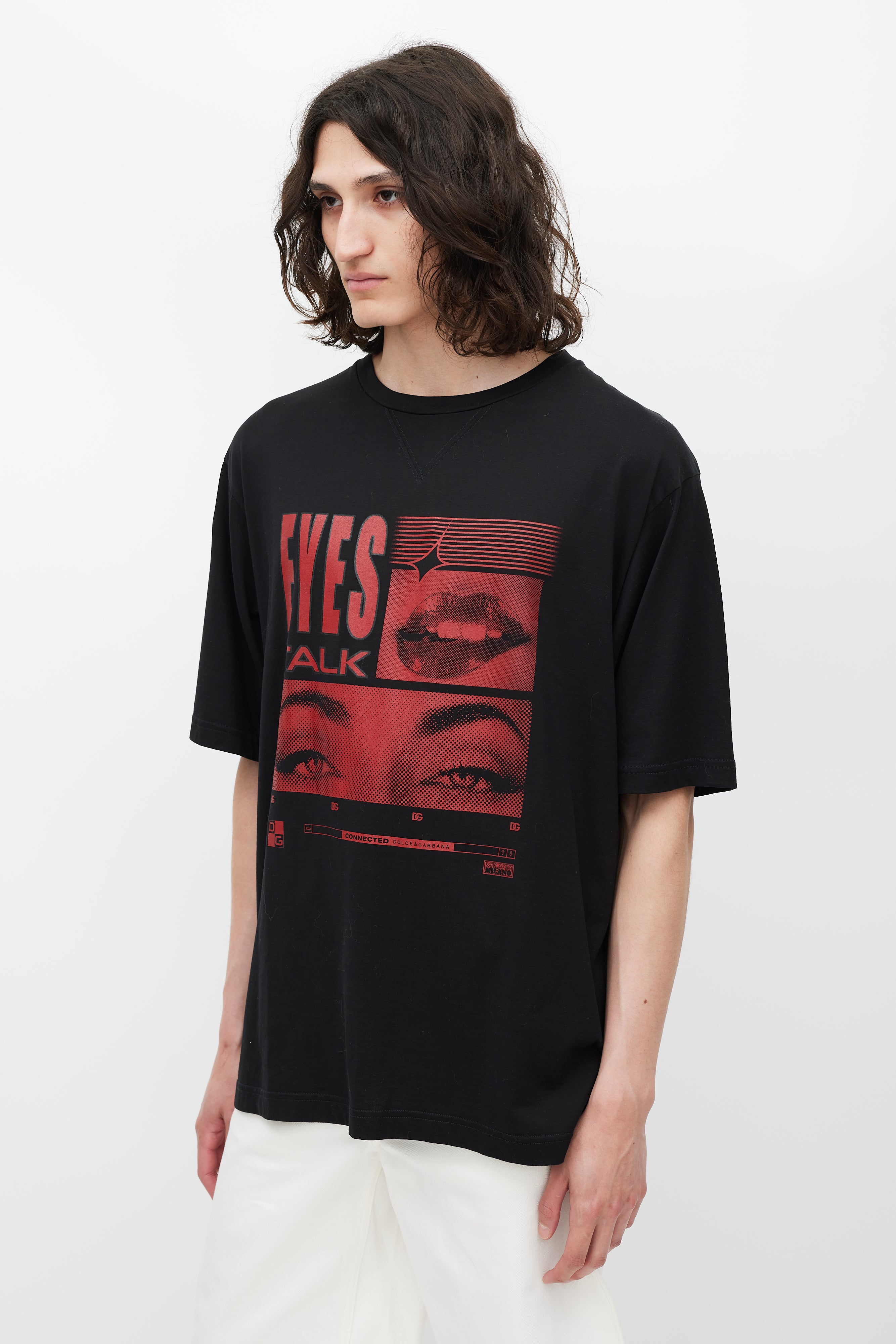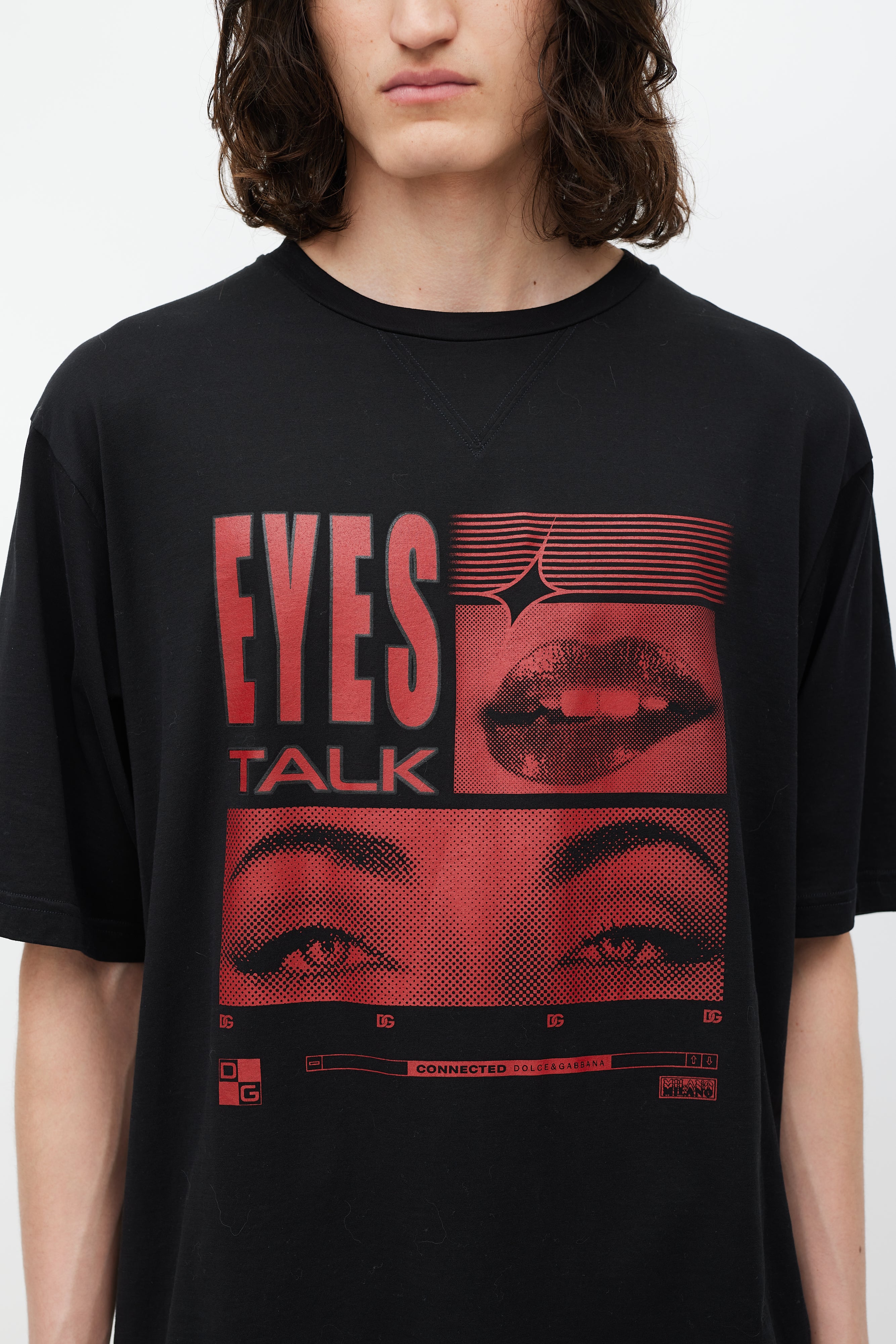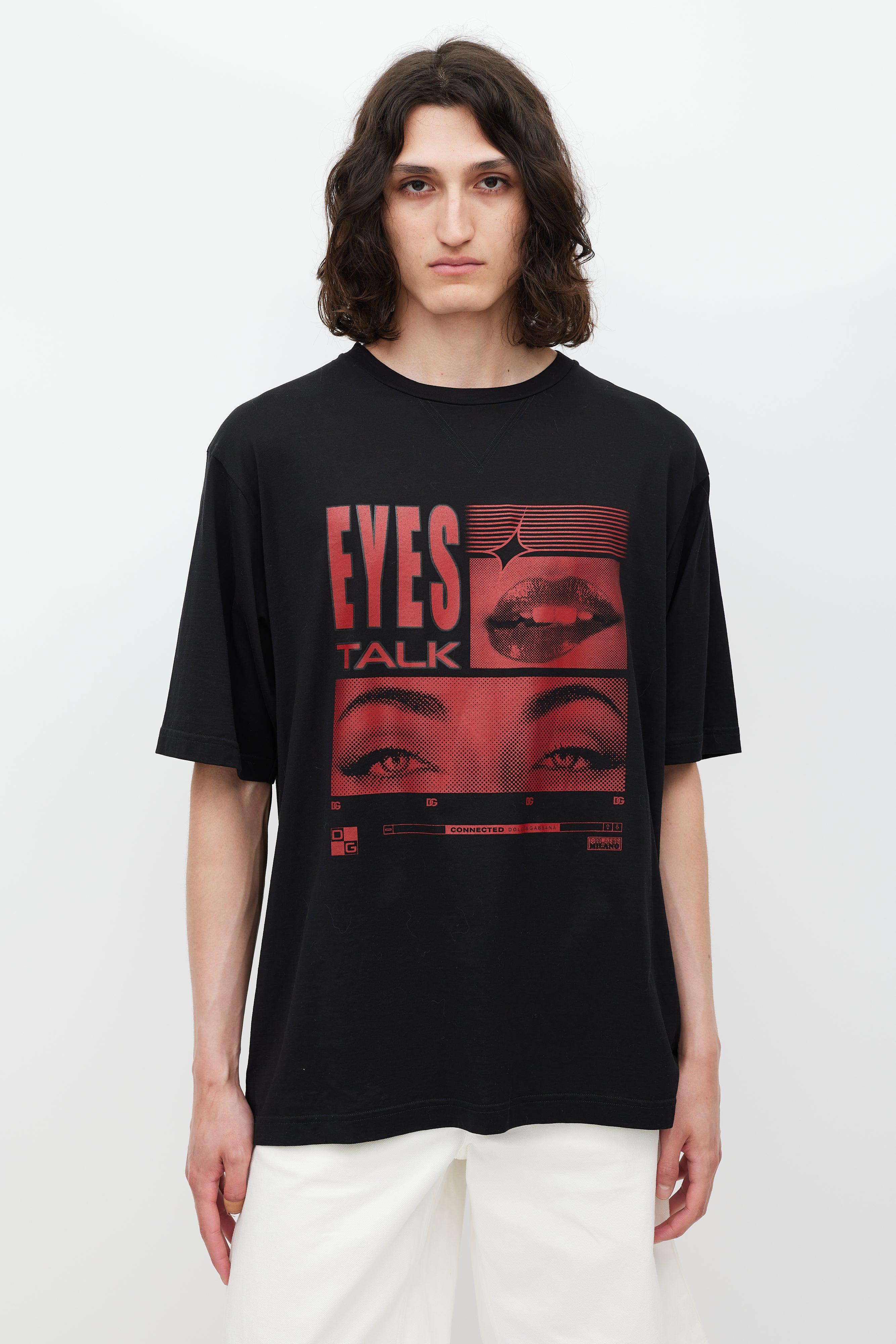 Pre-owned Dolce & Gabbana black T-shirt featuring a red Eyes Talk logo print at front and back, round neckline, and short sleeves.