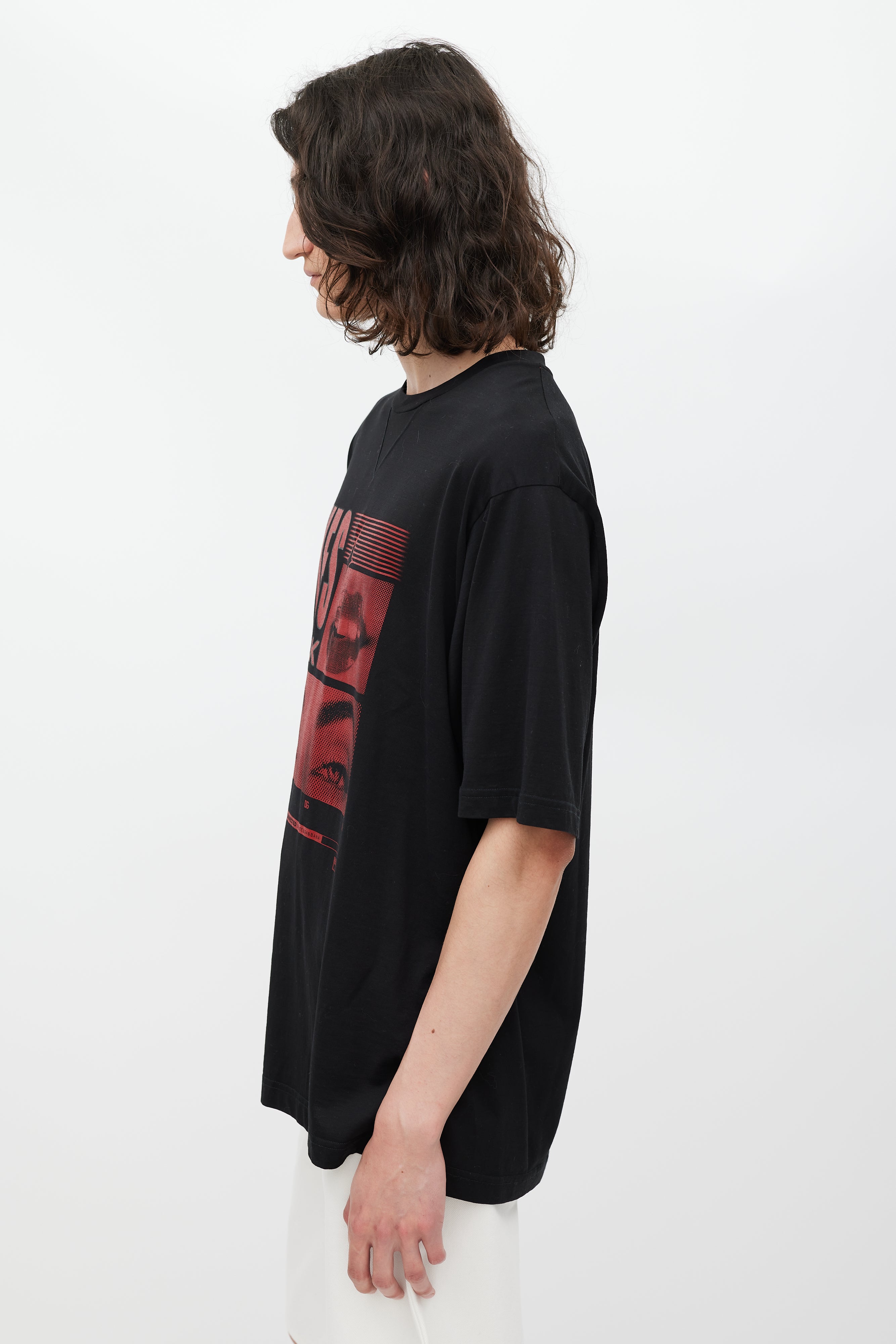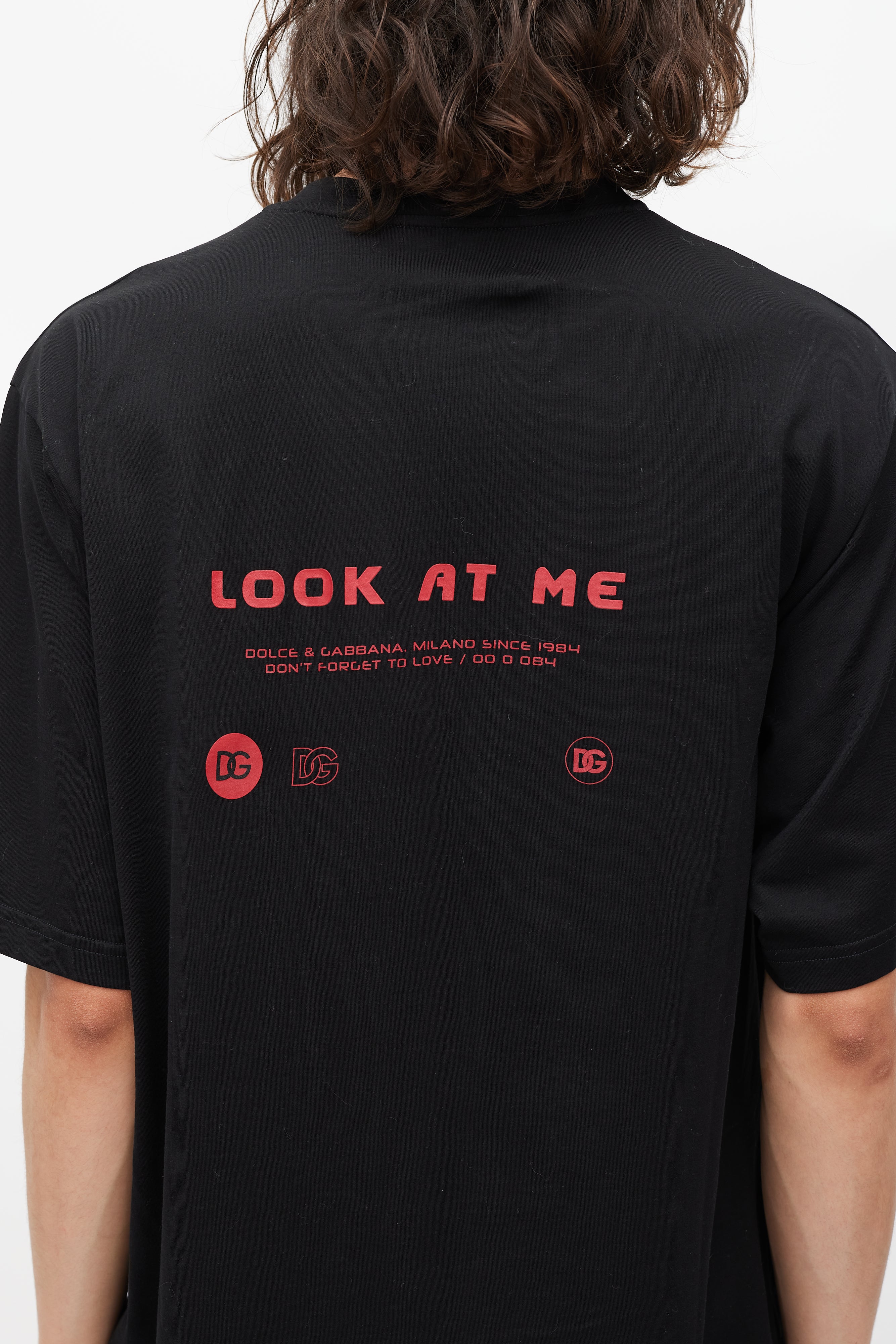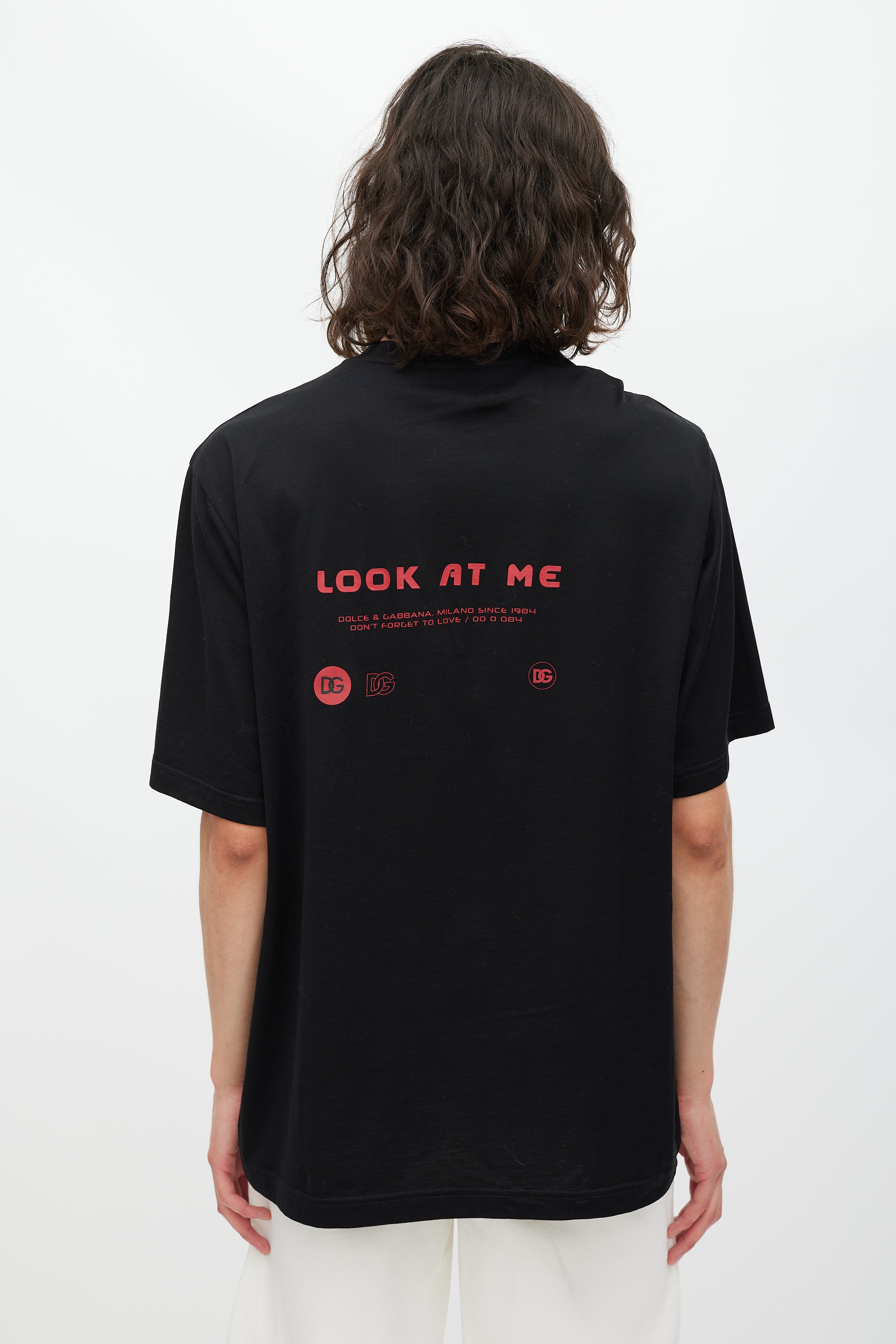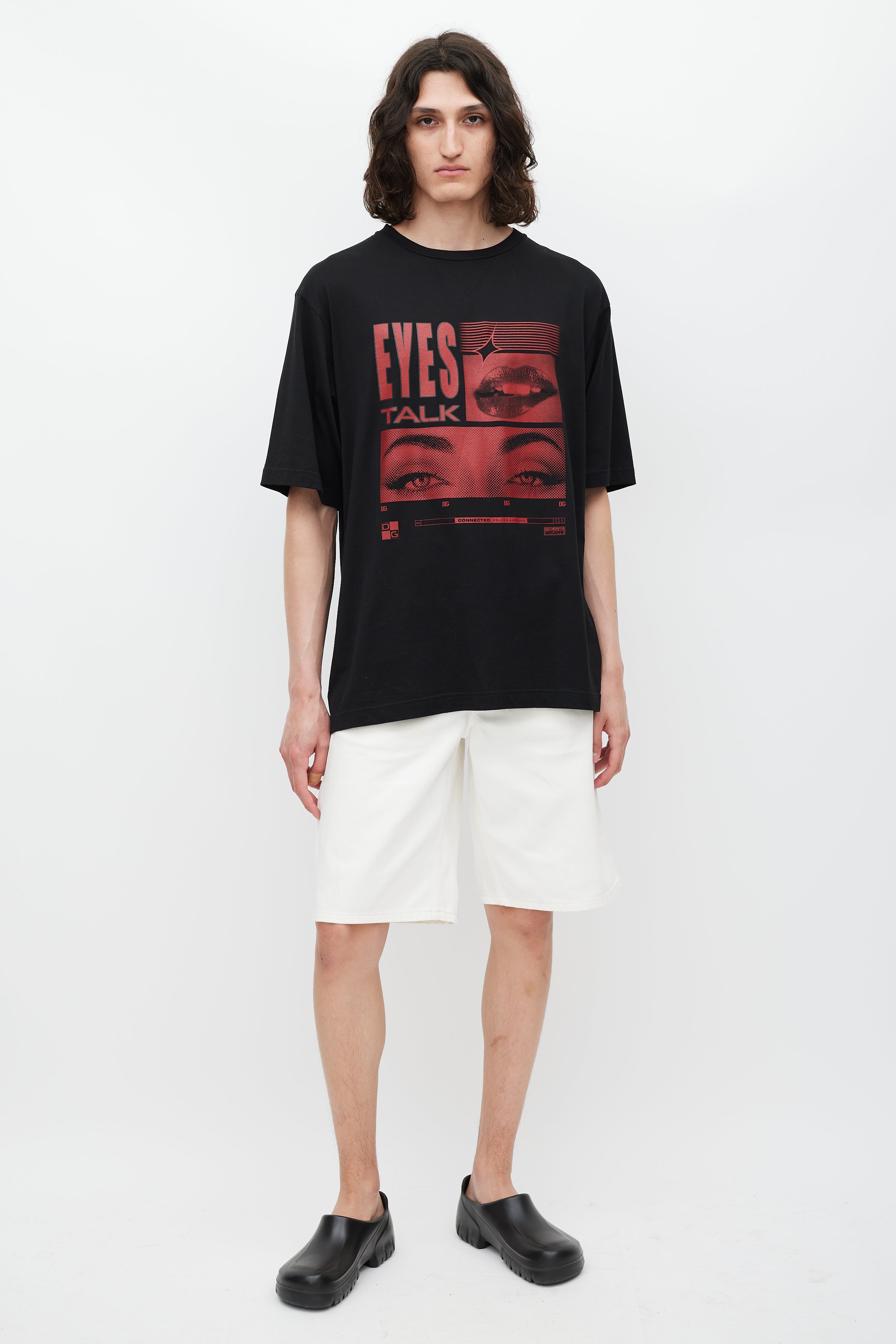 Pre-owned Dolce & Gabbana black T-shirt featuring a red Eyes Talk logo print at front and back, round neckline, and short sleeves.