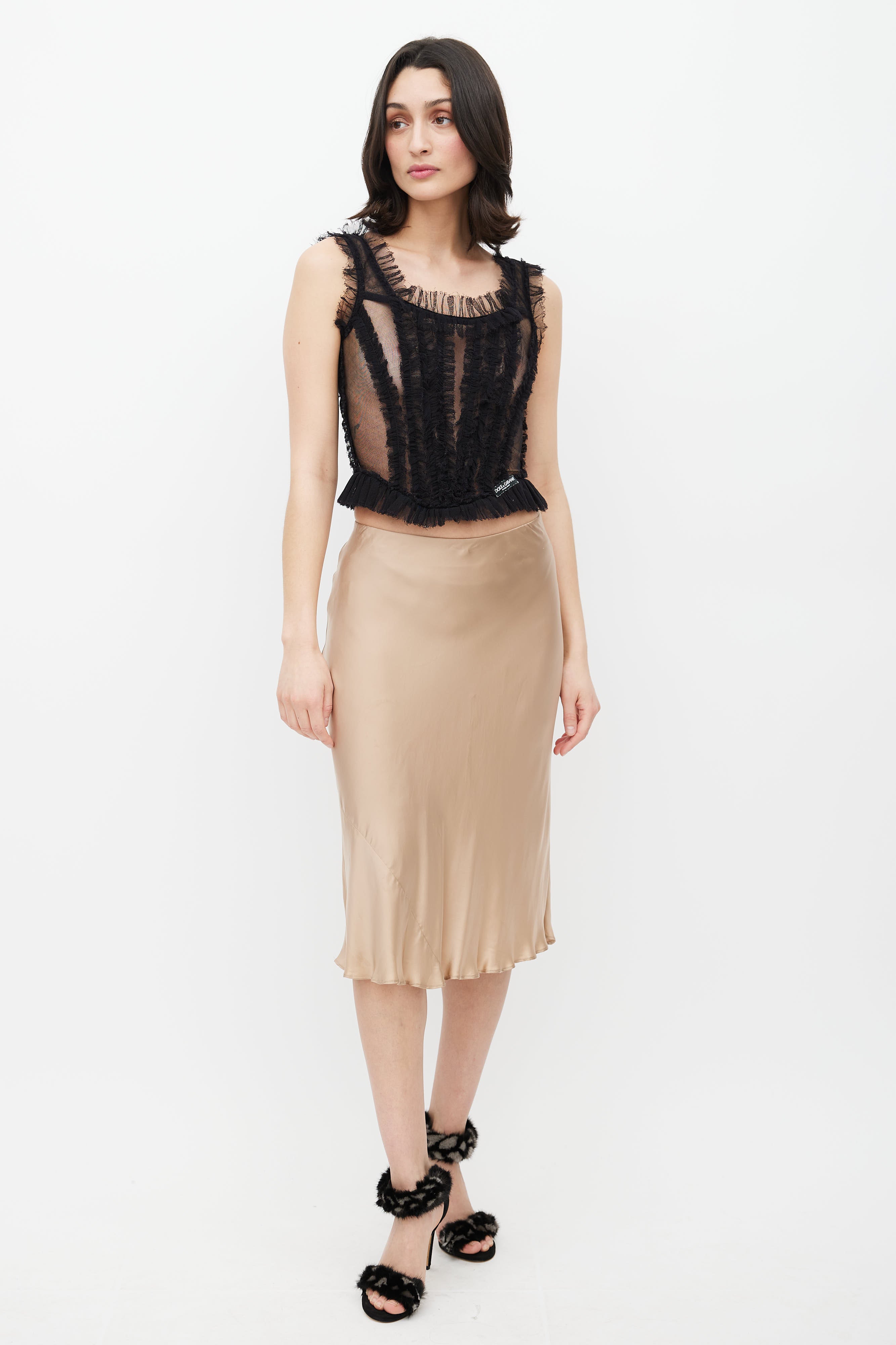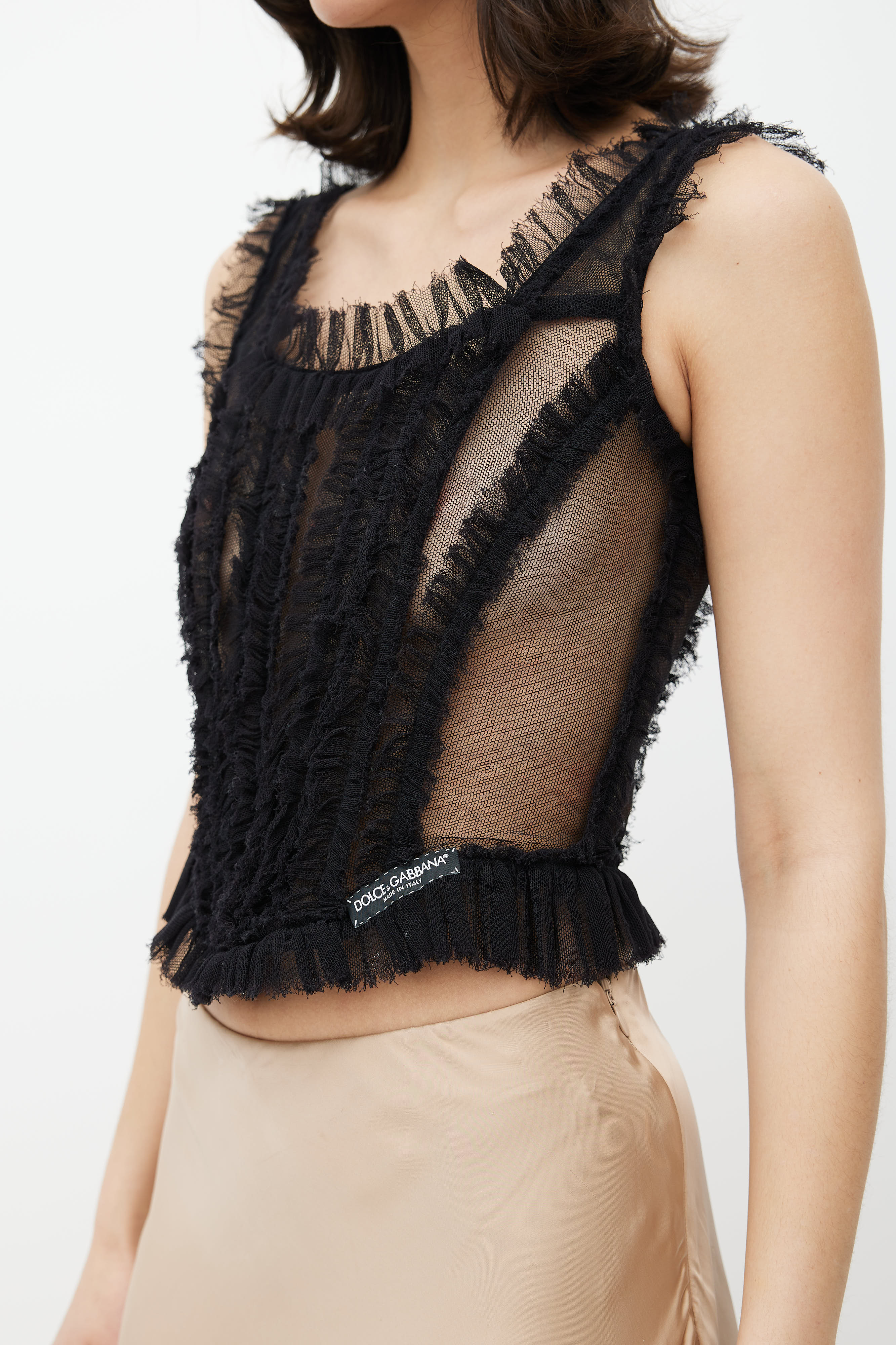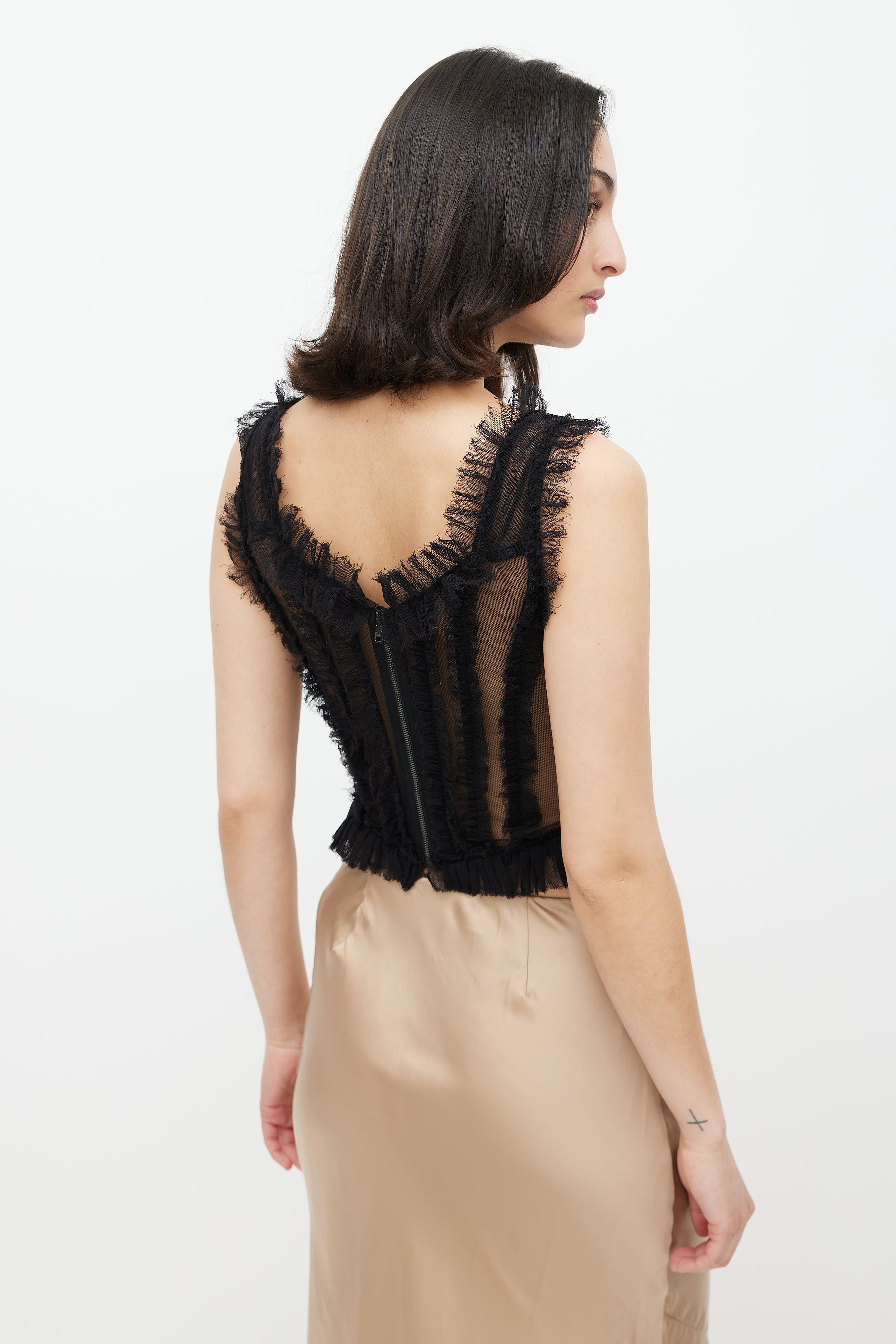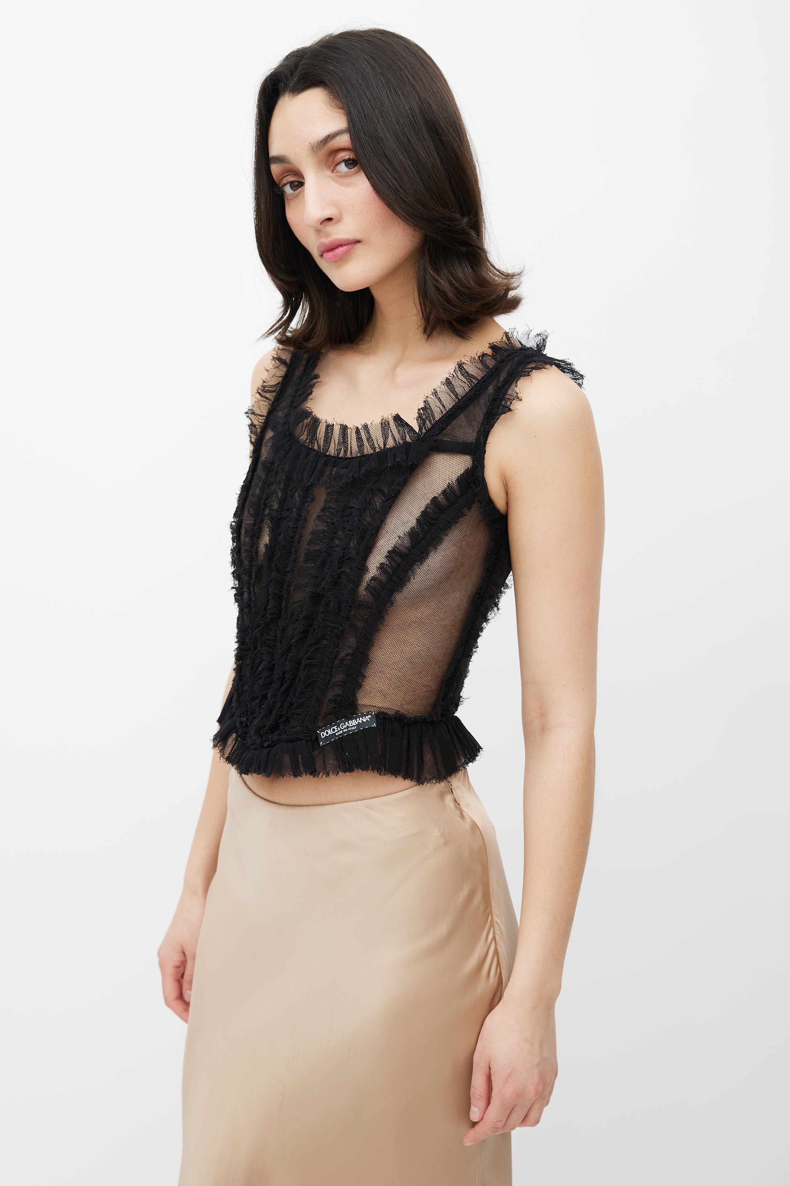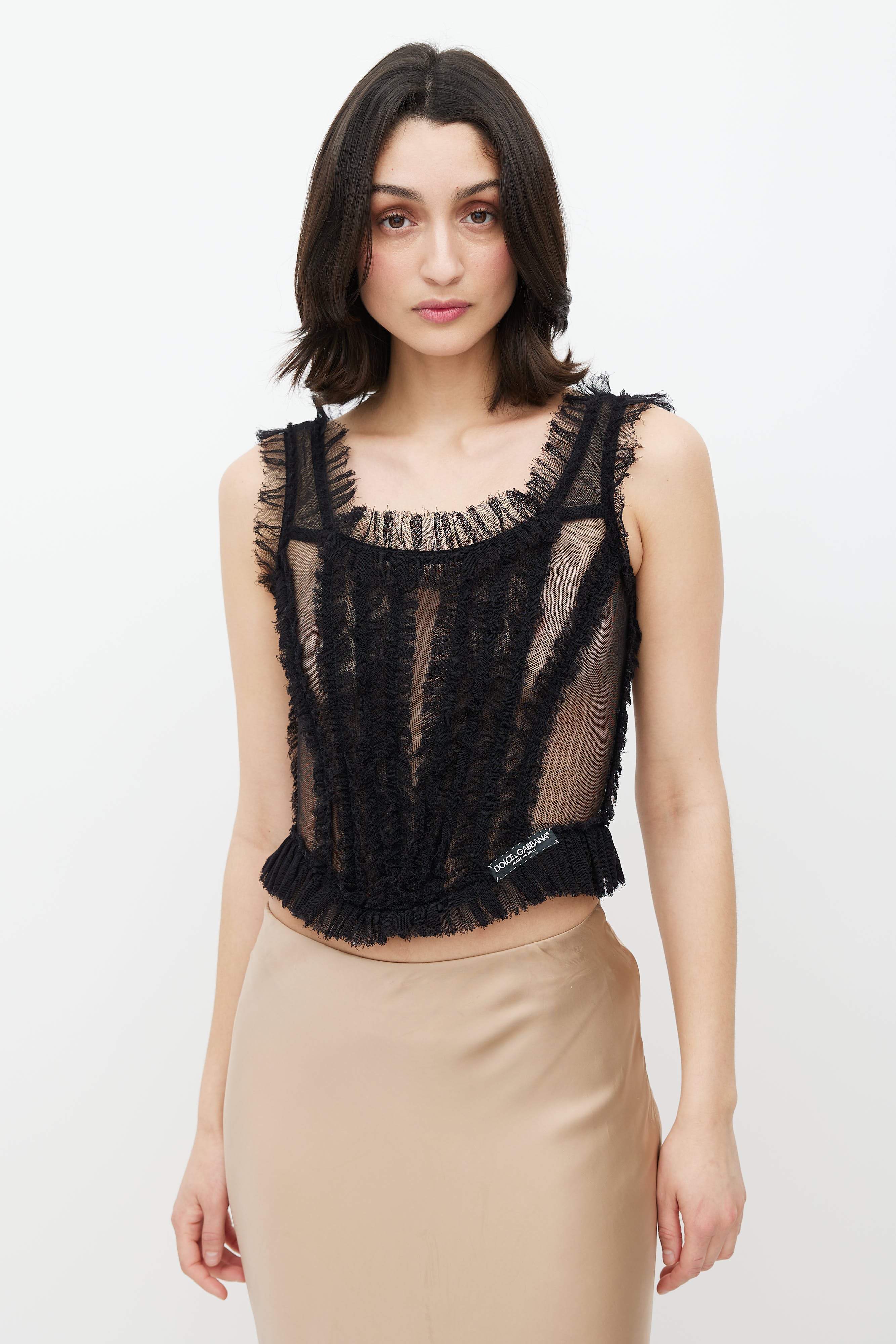Pre-owned Dolce & Gabbana black mesh corset featuring a scoop neckline, ruffled detailing, structured bust, logo tab at hip, and zip closure at back.