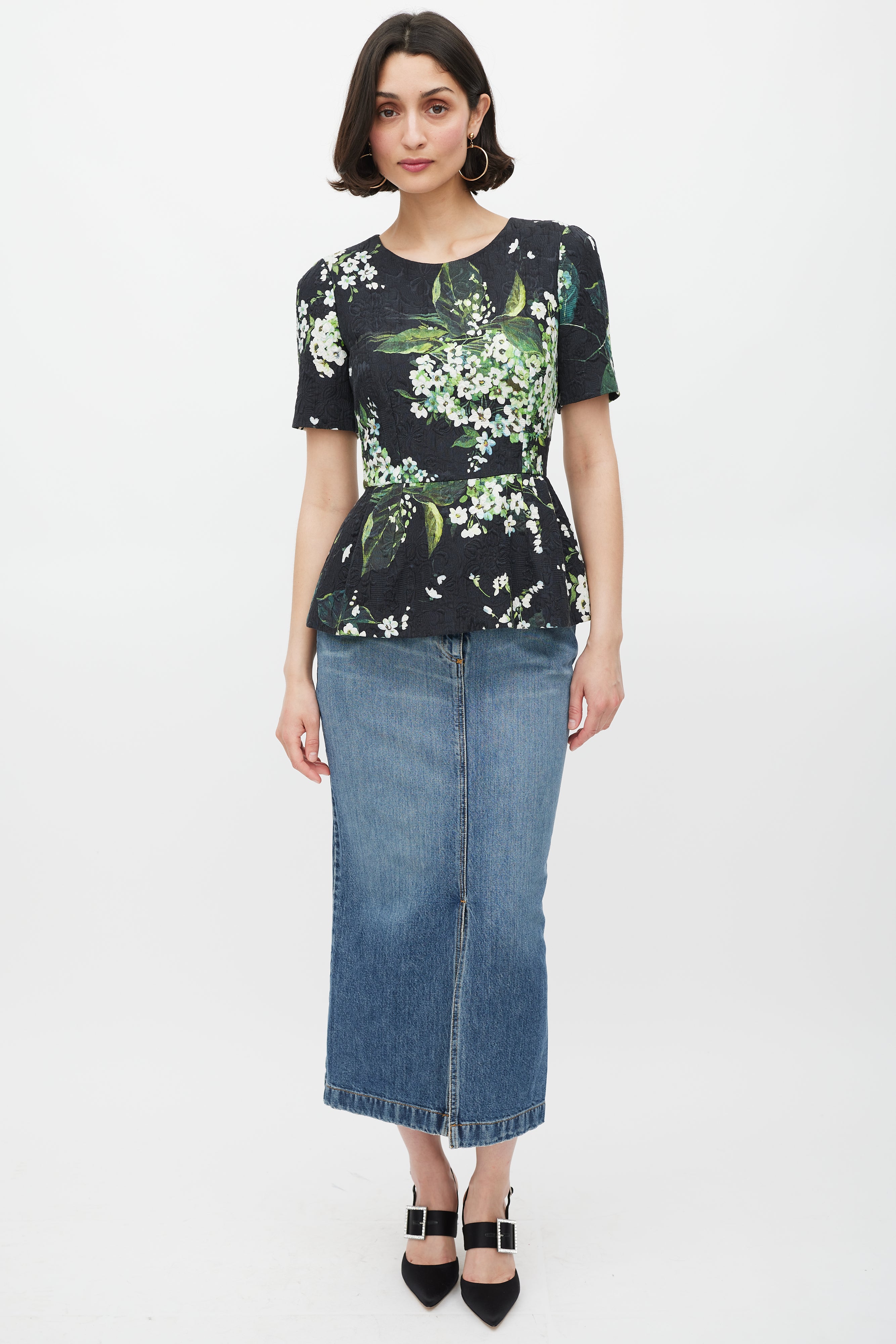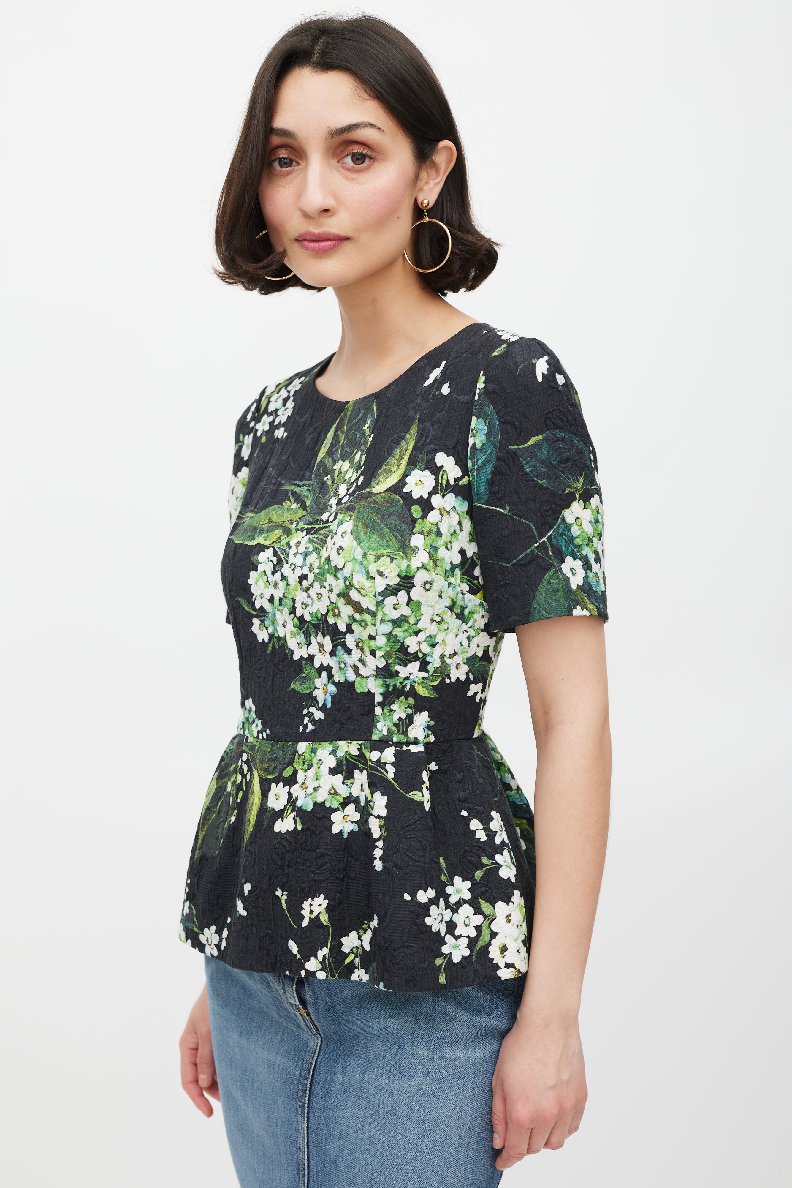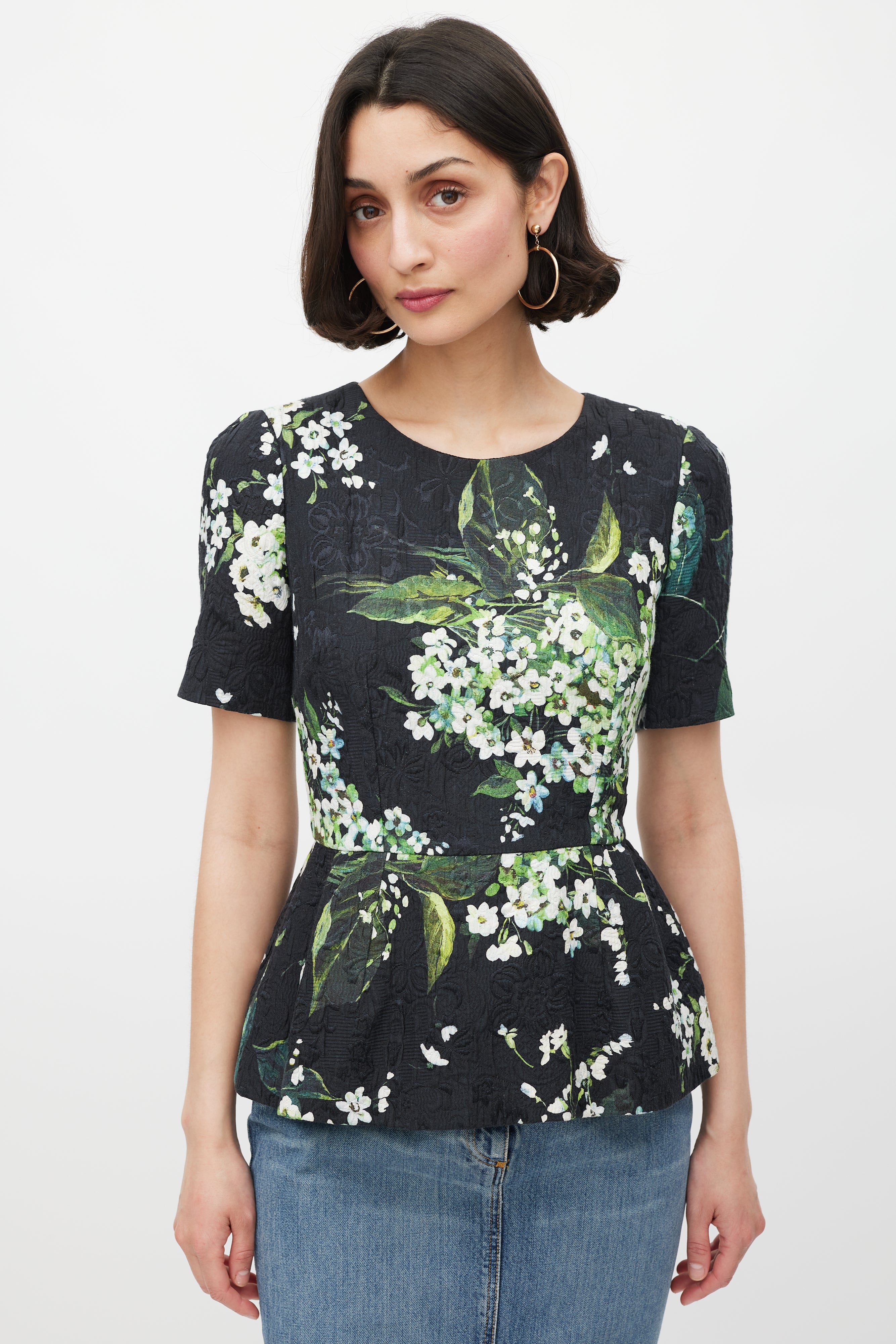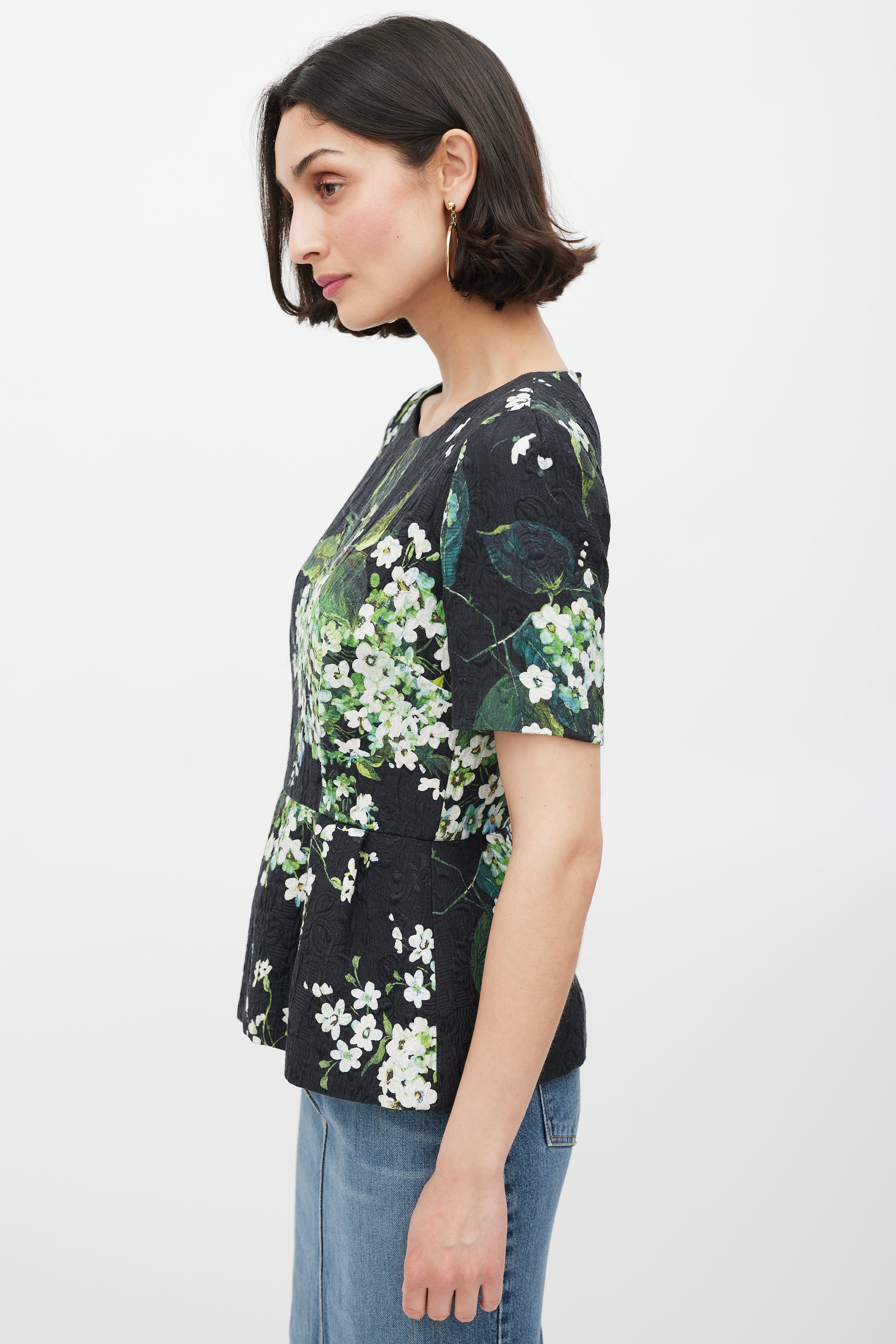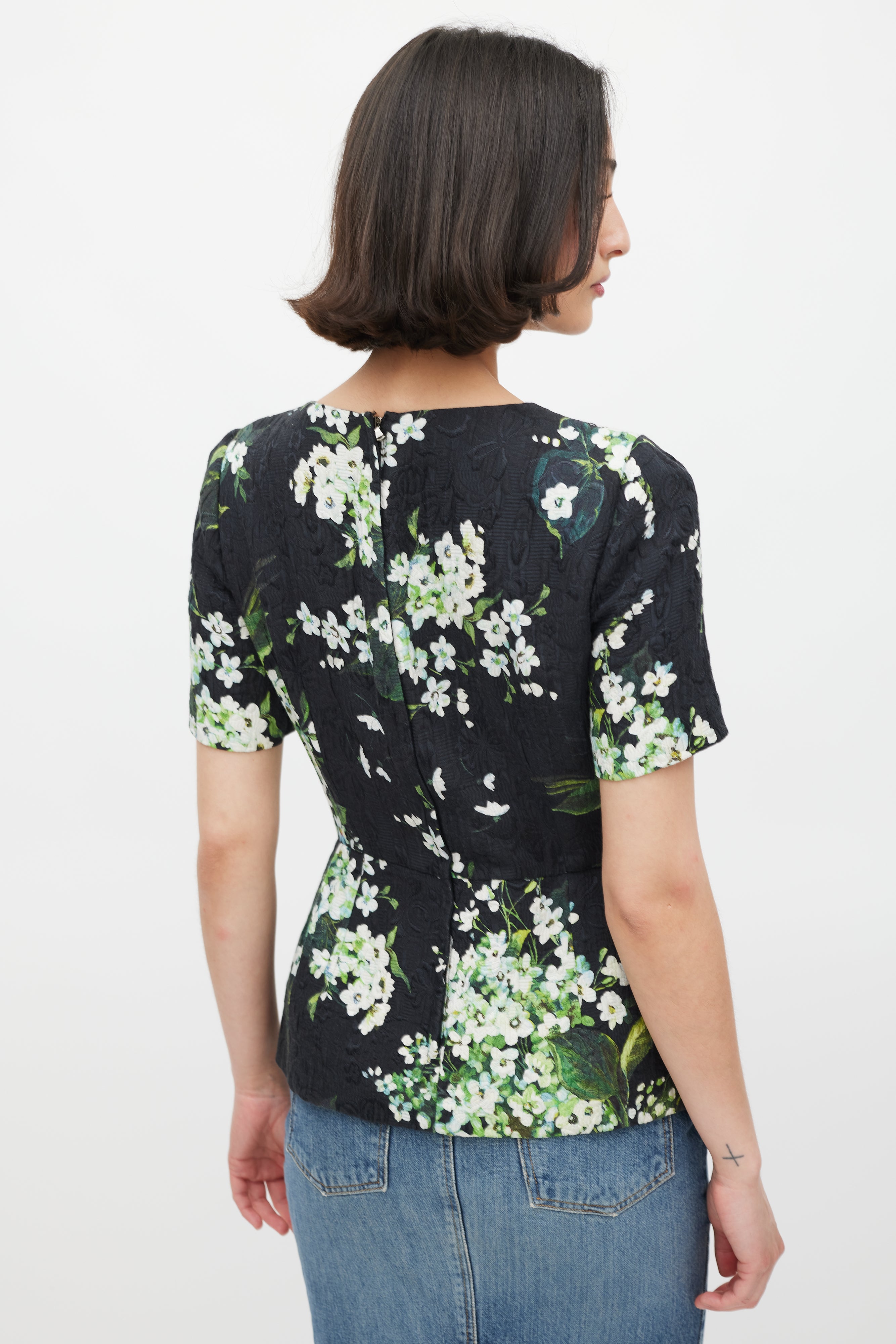 Pre-owned Dolce & Gabbana black peplum top featuring a tonal floral brocade throughout, white and green floral print throughout, scoop neckline, fitted bodice, short sleeves, and concealed back zip closure. Lined. Clipped to fit model.
