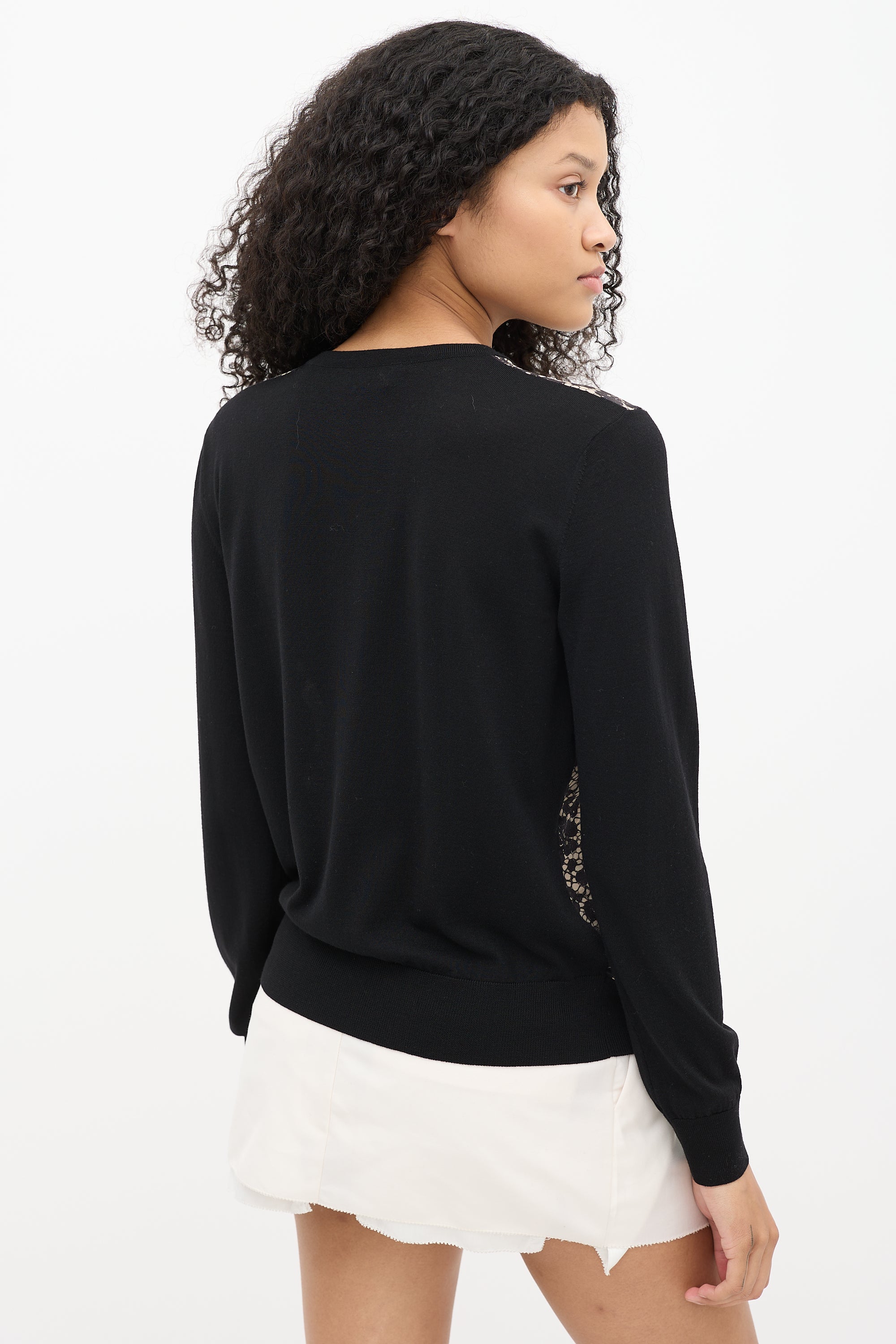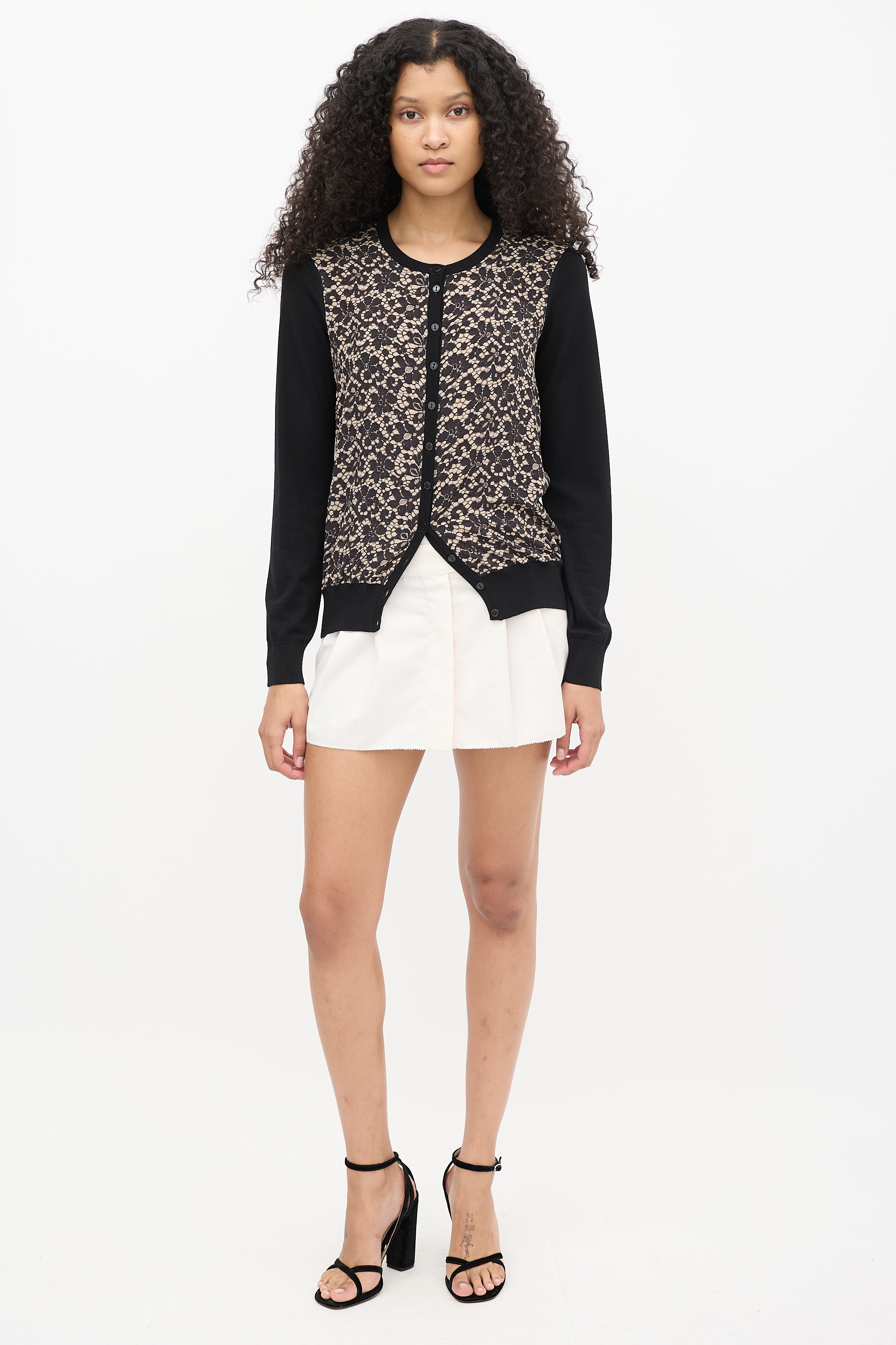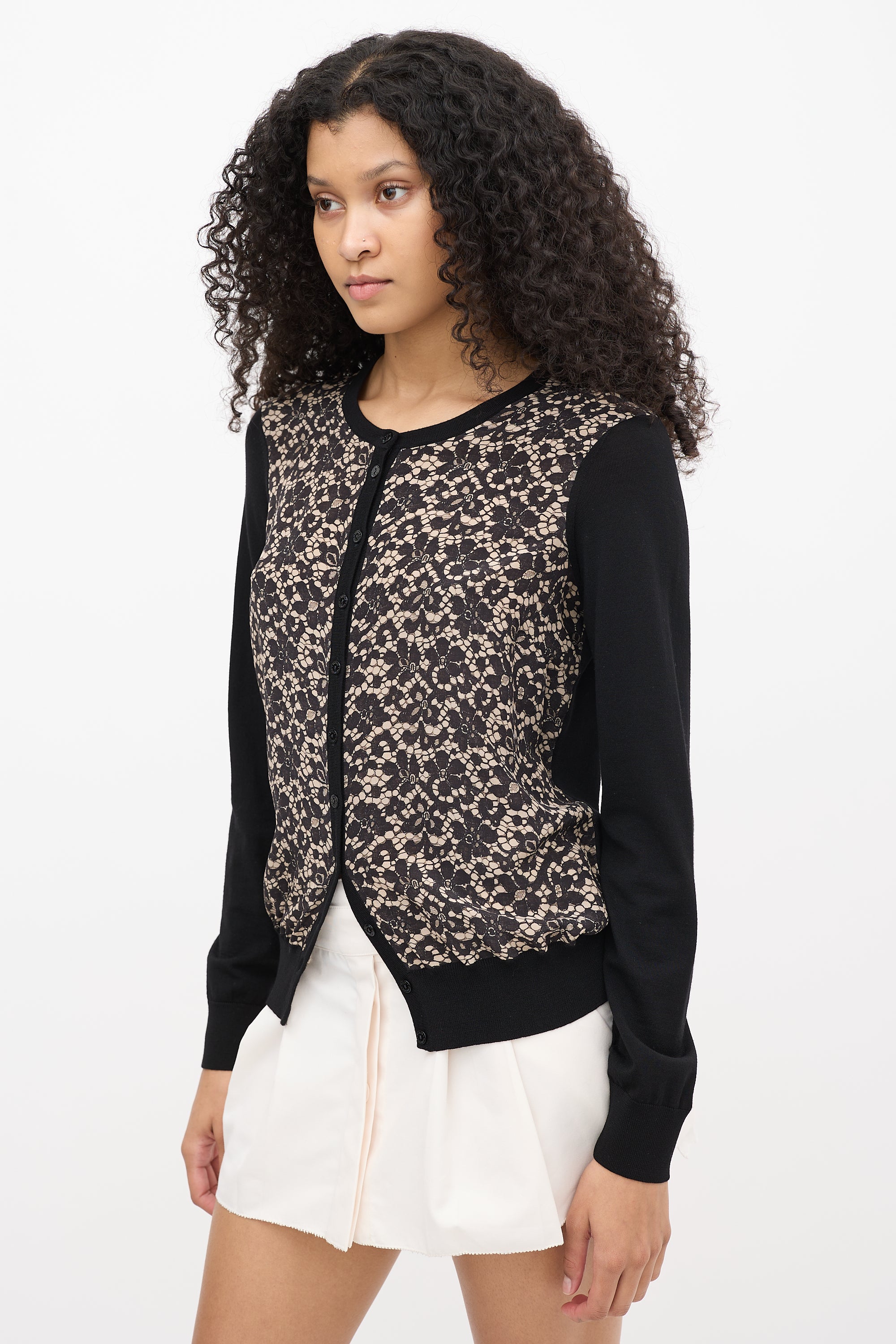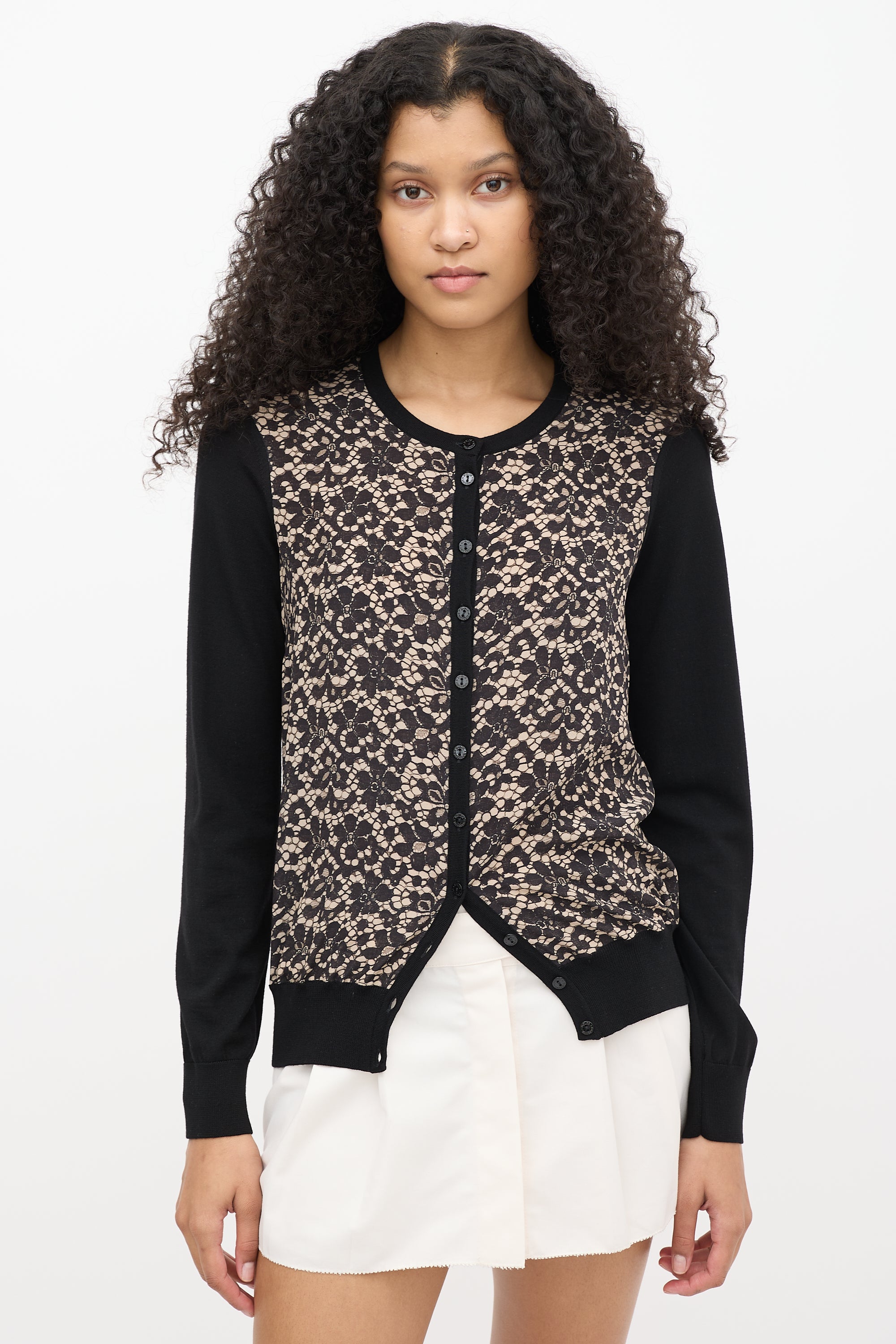 Pre-owned Dolce & Gabbana black wool cardigan featuring round neckline, beige lace print silk front paneling, button up front, long sleeves, and ribbed neckline, cuffs, and hem.