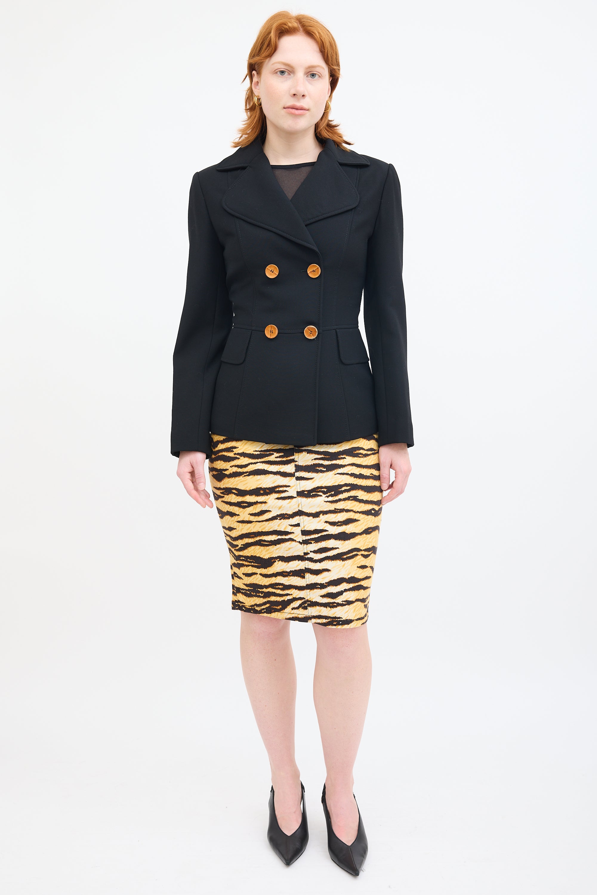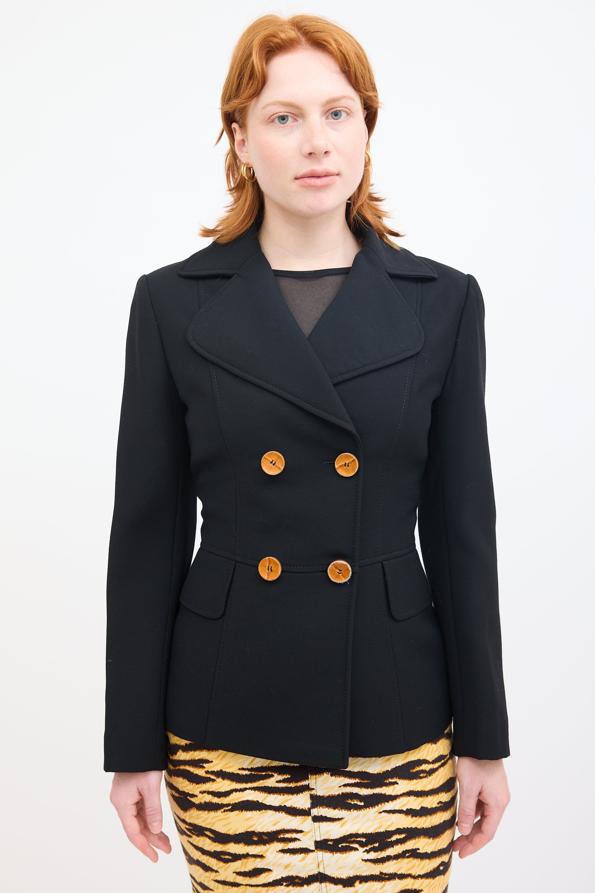 Pre-owned Dolce & Gabbana black wool blazer featuring rounded notched lapel, double breasted button up, brown croc effect buttons, and two decorative flap pockets at waist. Lined.