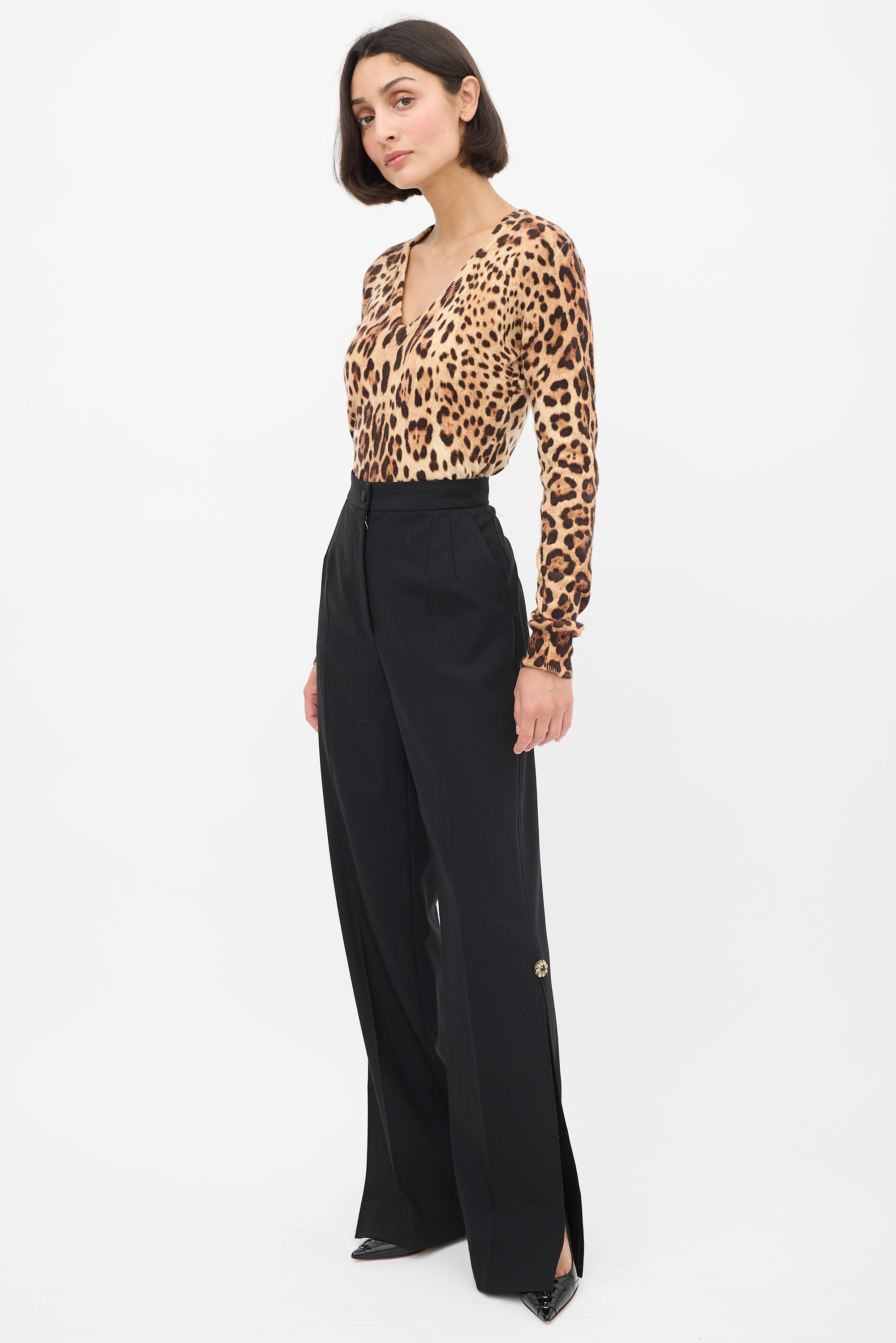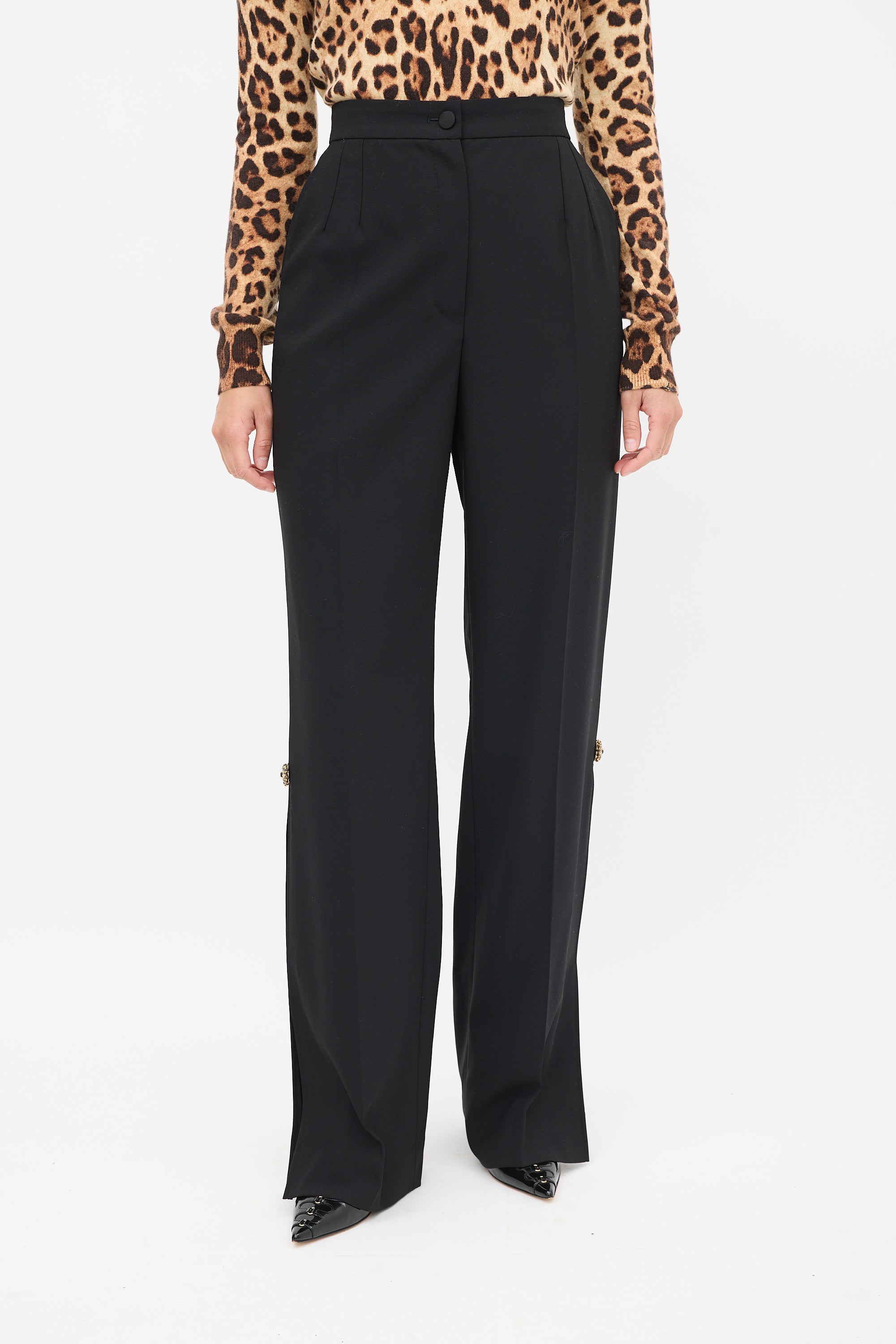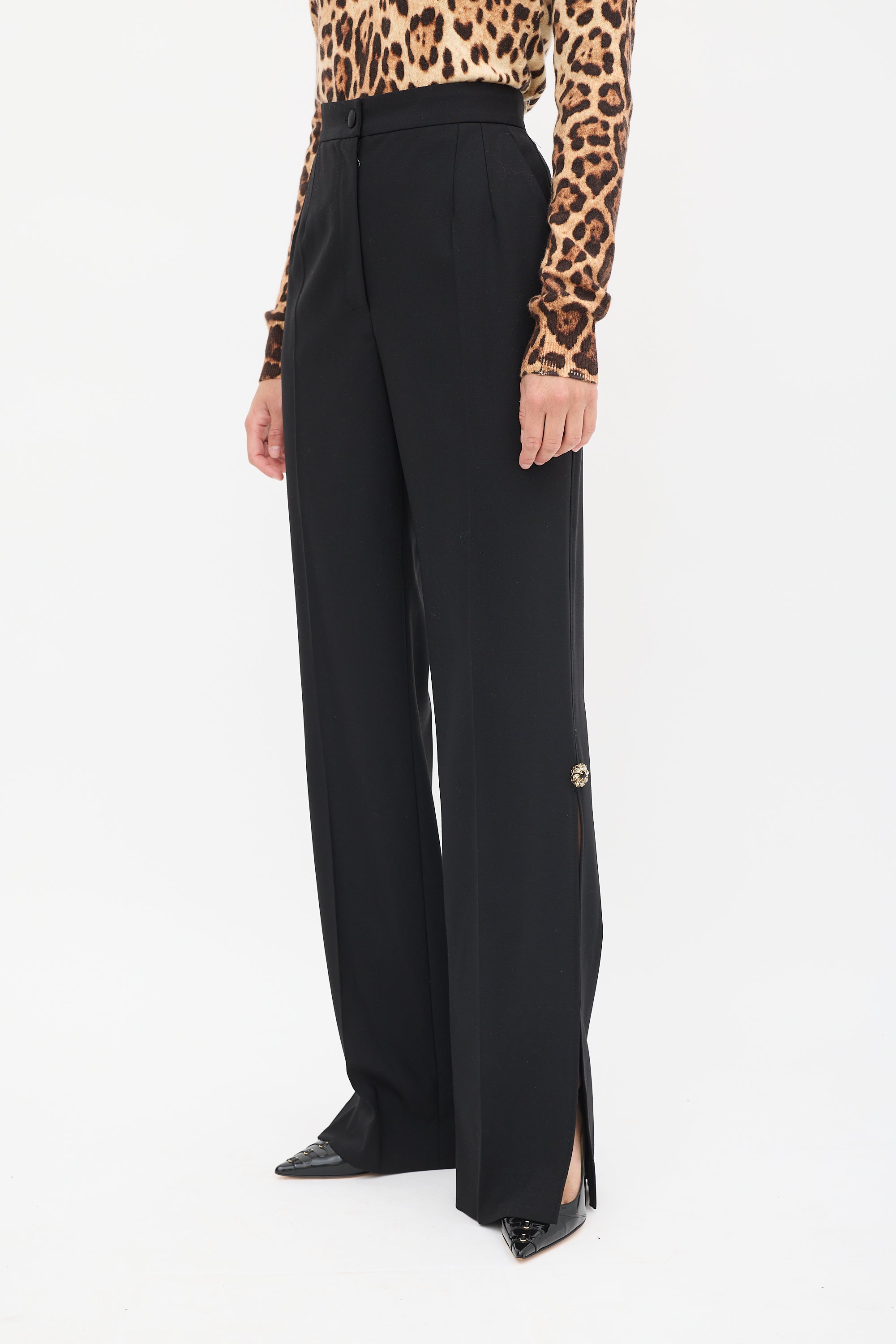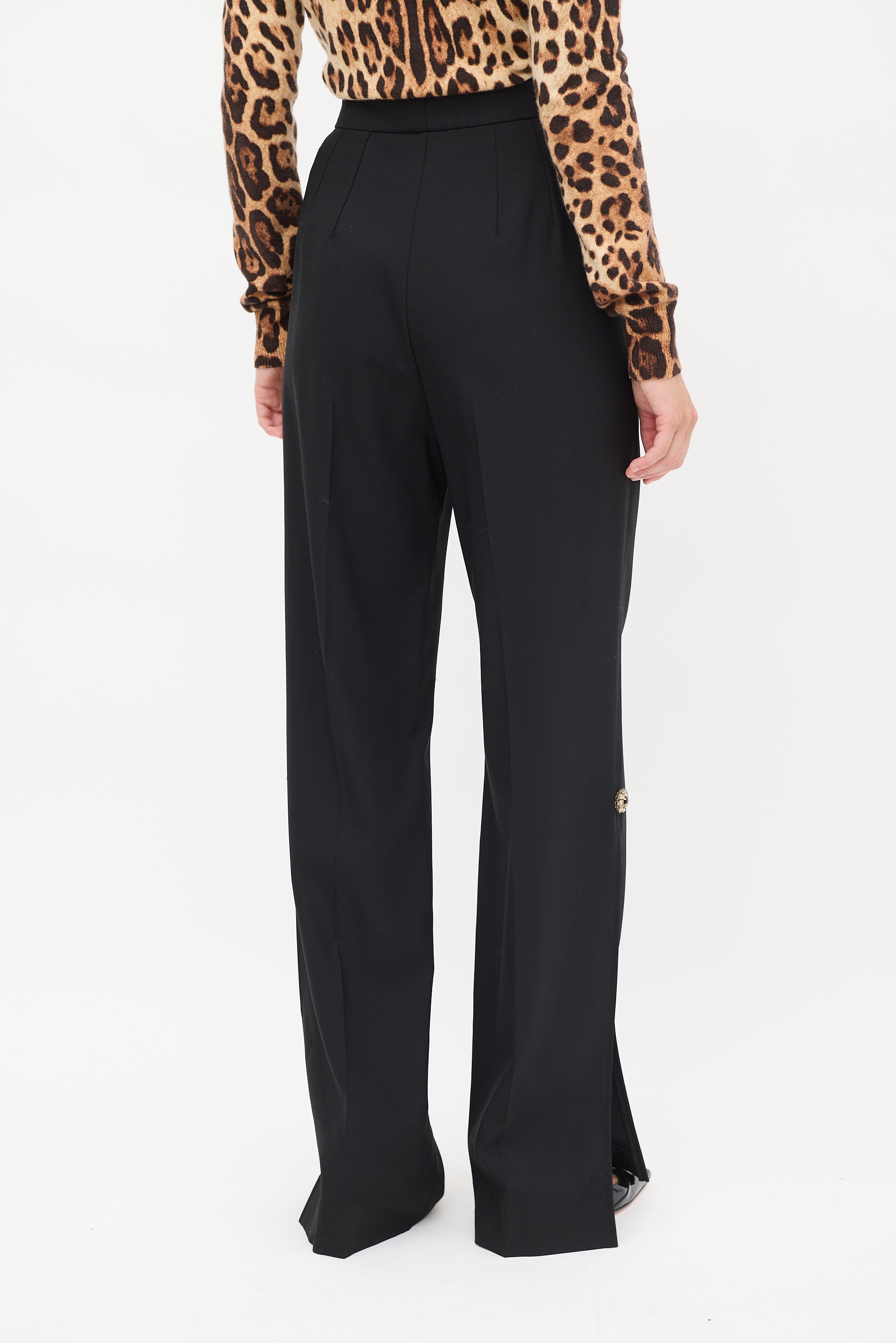 Pre-owned Dolce & Gabbana black wool blend trousers featuring a high darted waist, wide leg with creases and split sides, crystal cluster embellishment and hook and eye fastenings at split, two front slash pockets, and zip fly. Clipped to fit model.