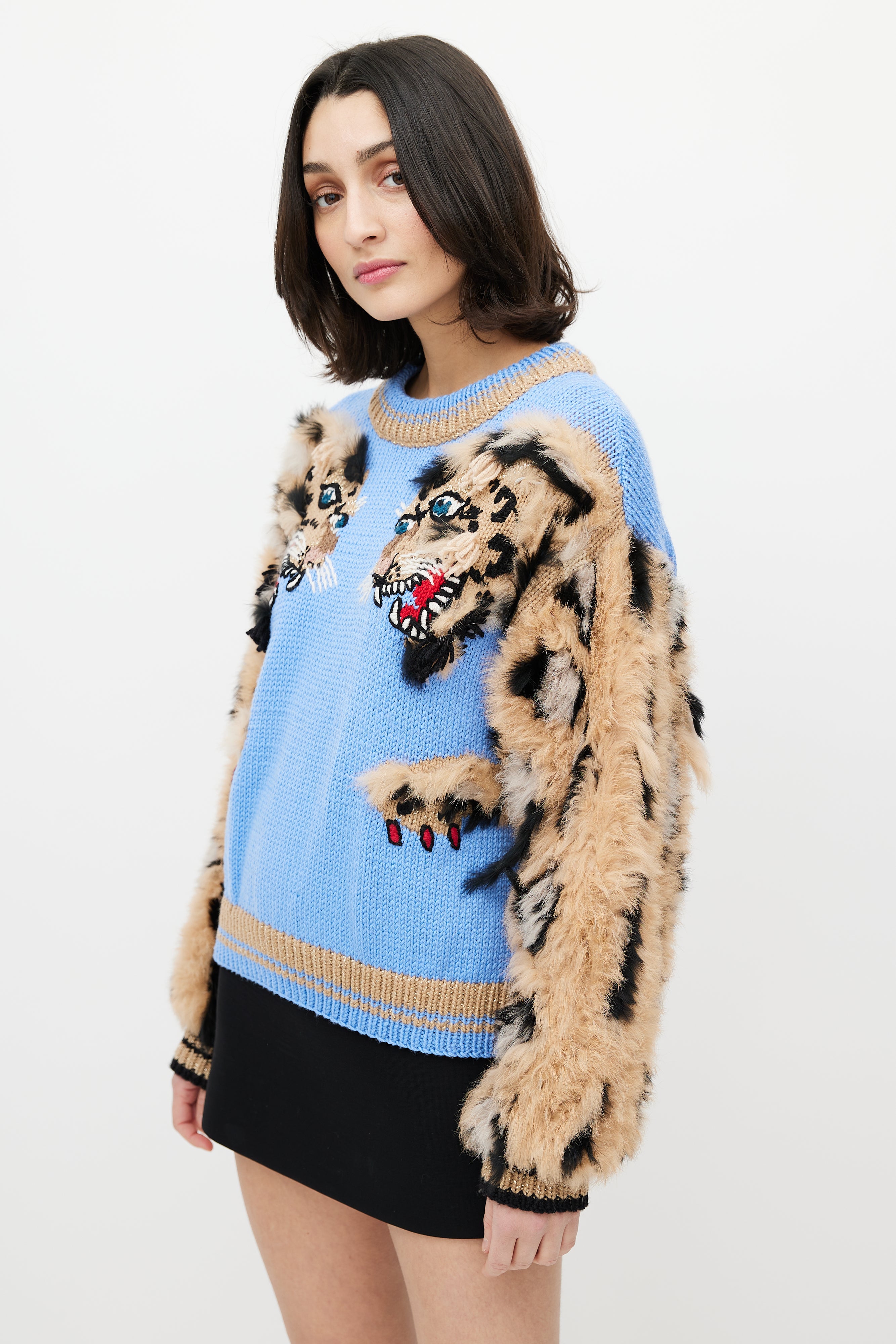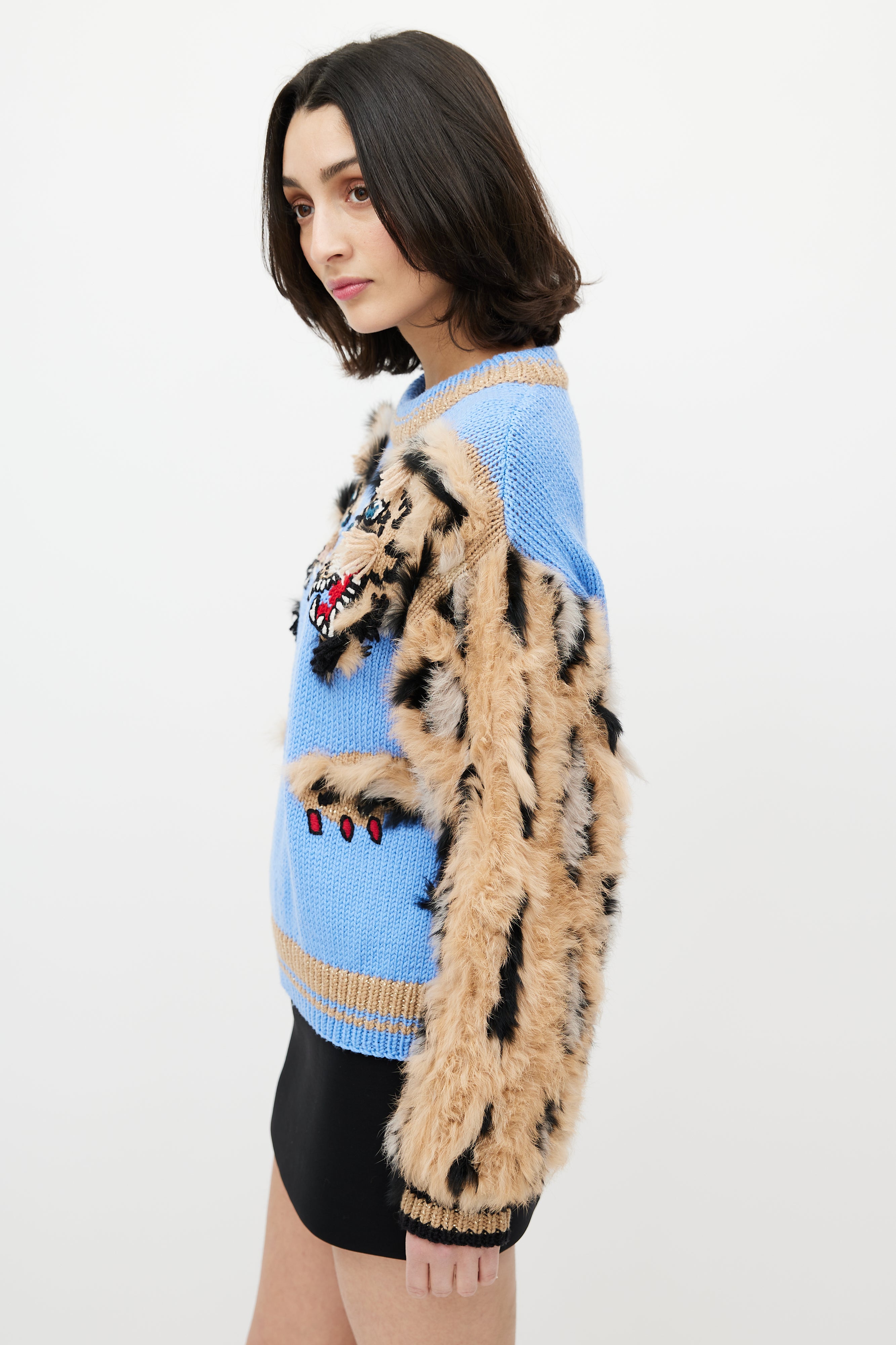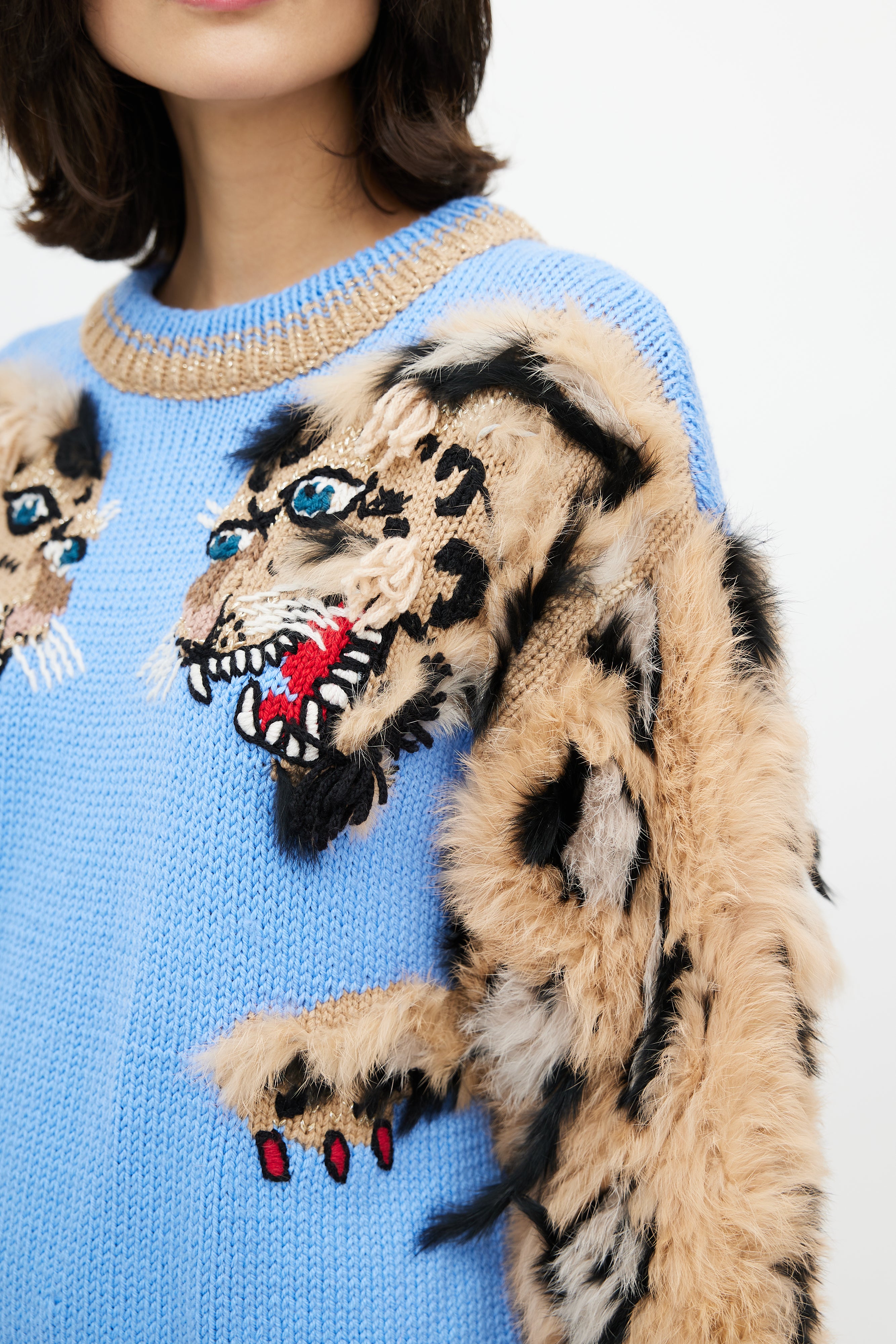 Dolce & Gabbana blue and brown sweater featuring crew neckline, fuzzy sleeves with leopard pattern, two tiger heads intarsia at chest, and ribbed hem and cuffs.