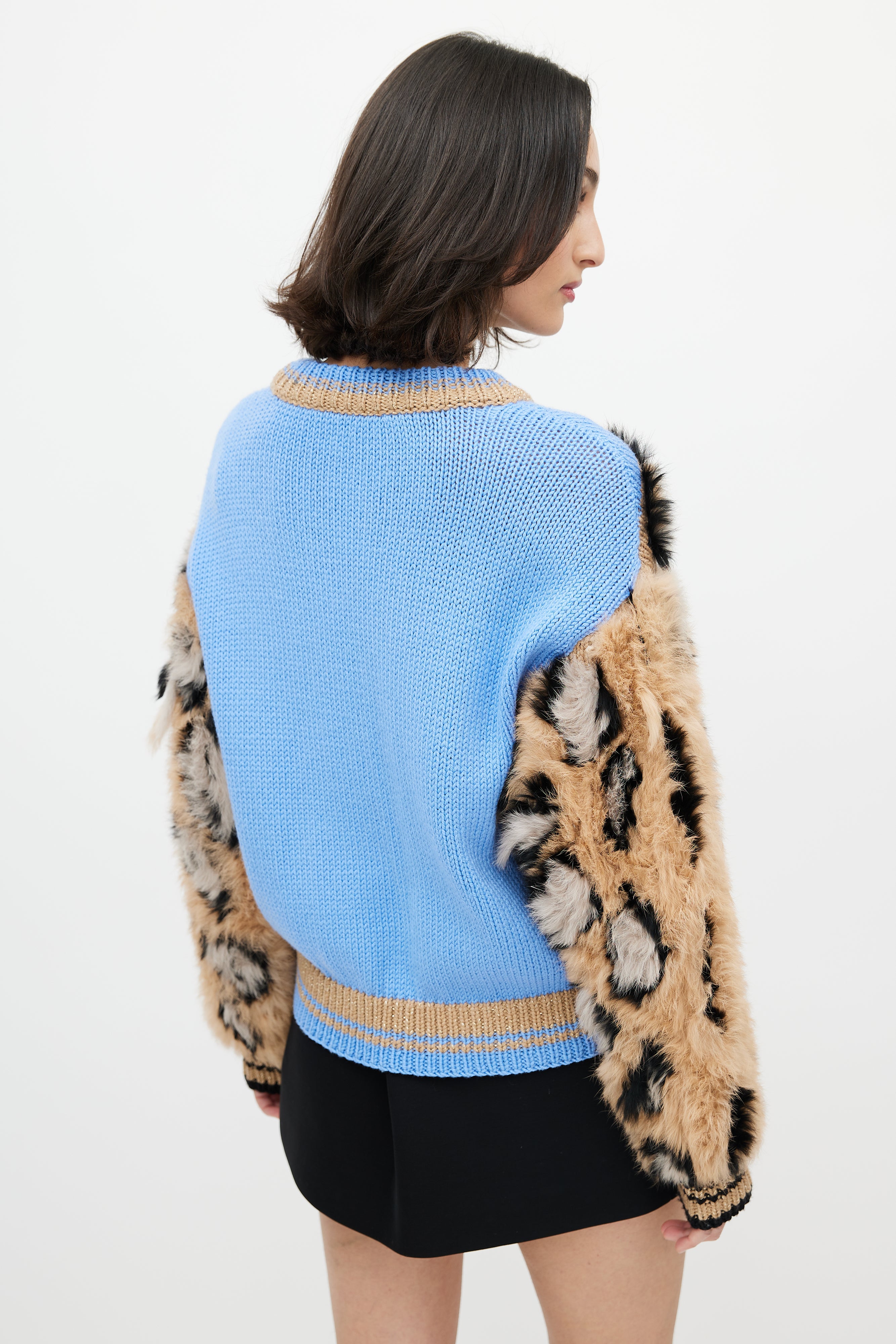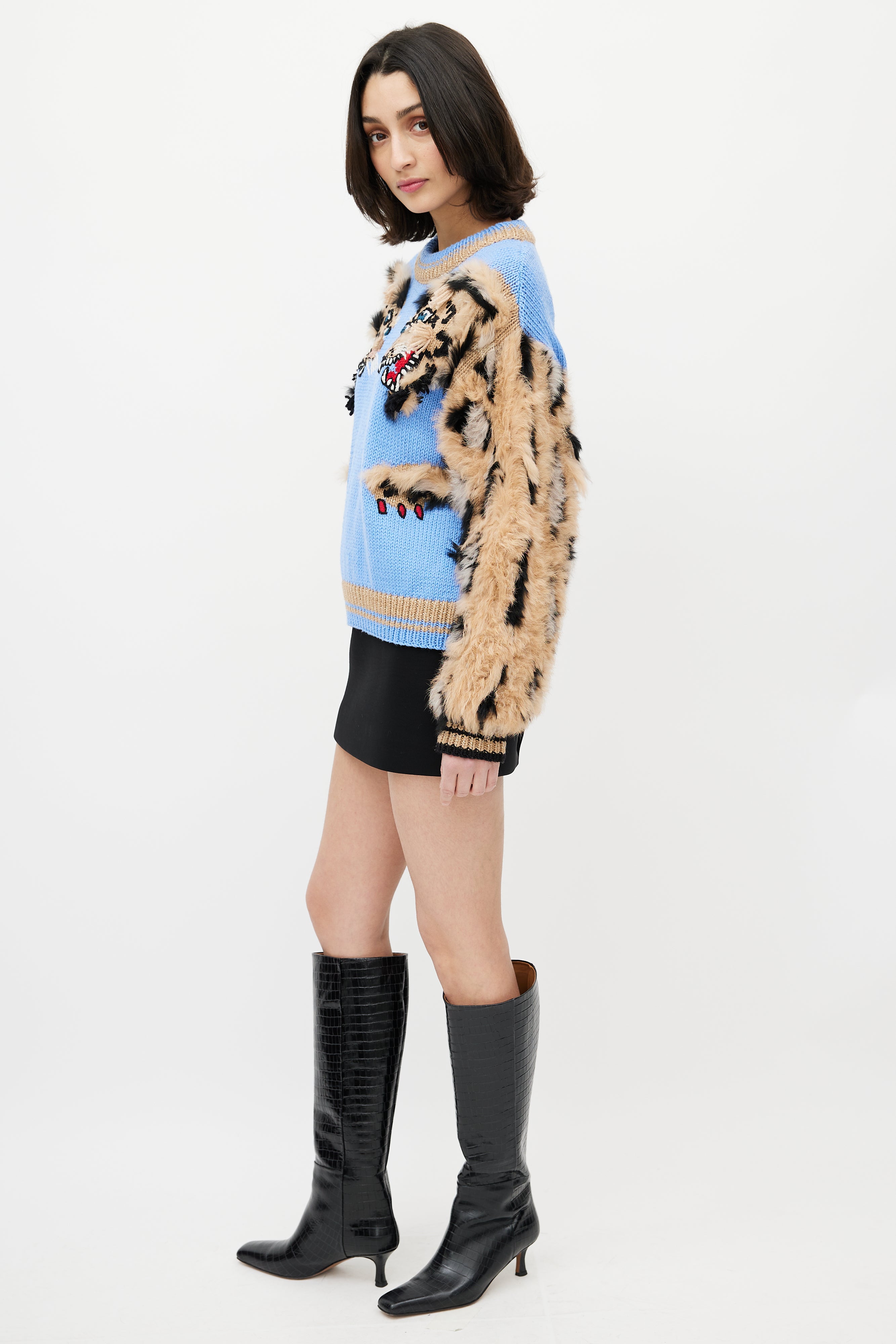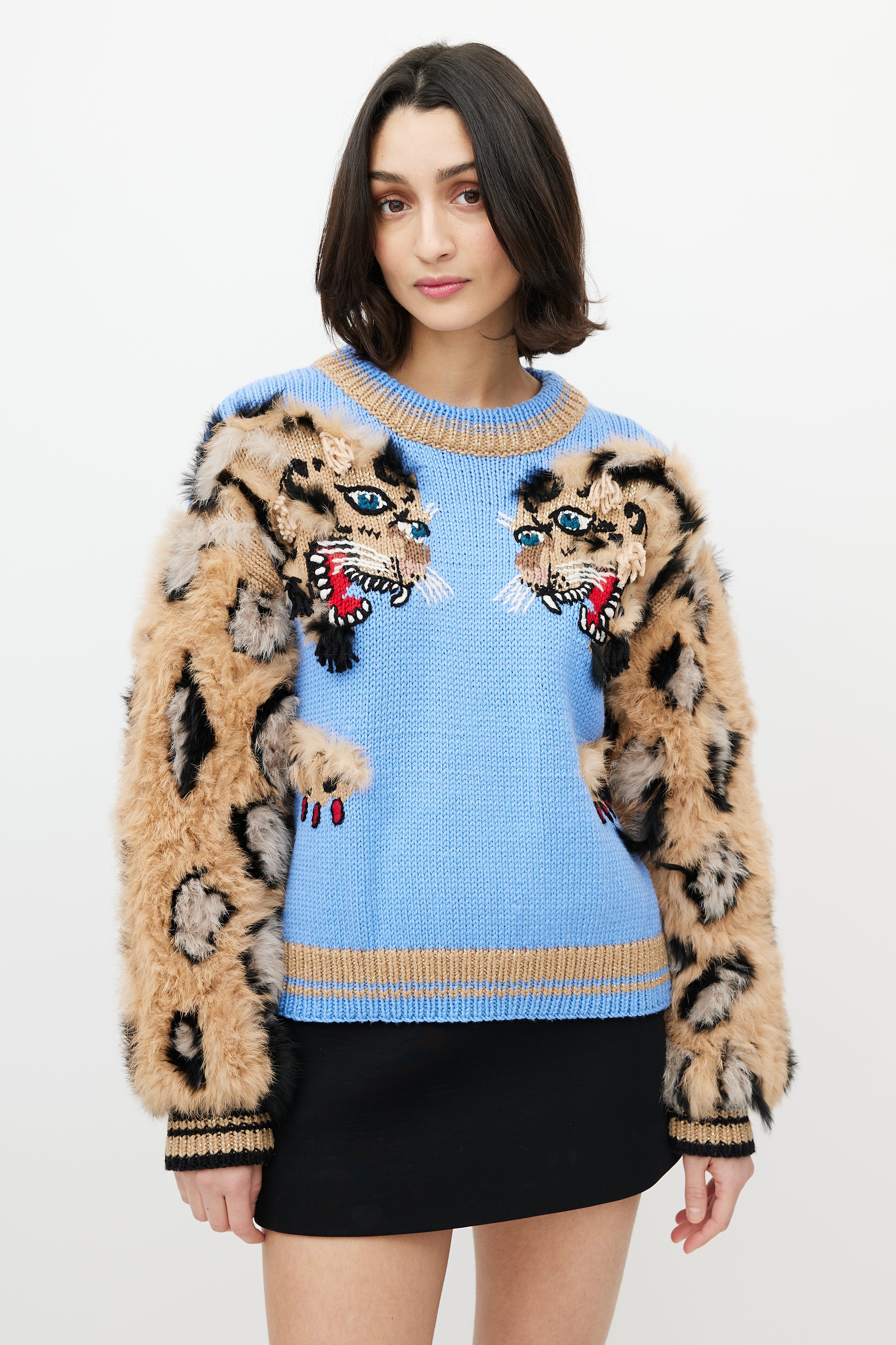 Dolce & Gabbana blue and brown sweater featuring crew neckline, fuzzy sleeves with leopard pattern, two tiger heads intarsia at chest, and ribbed hem and cuffs.