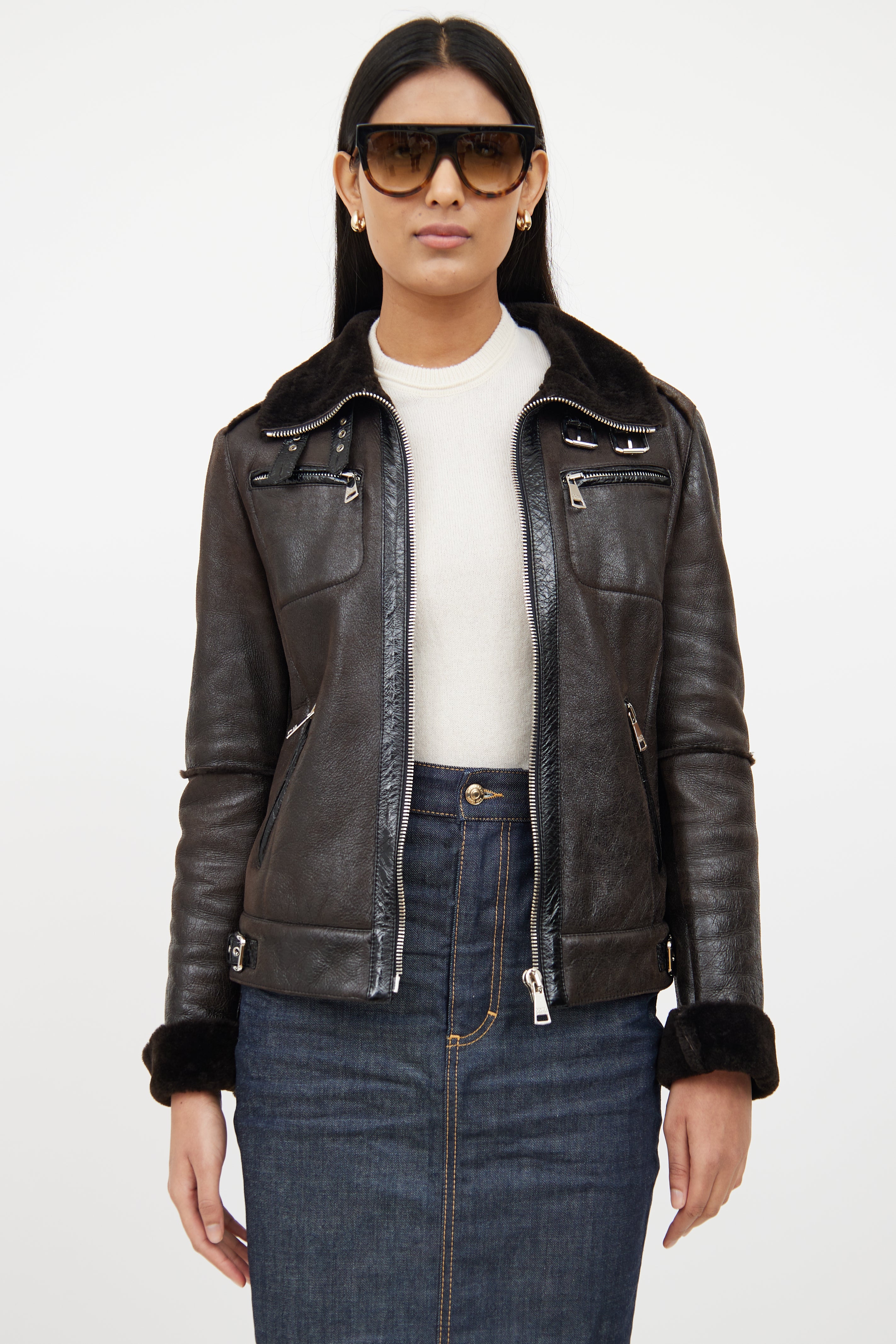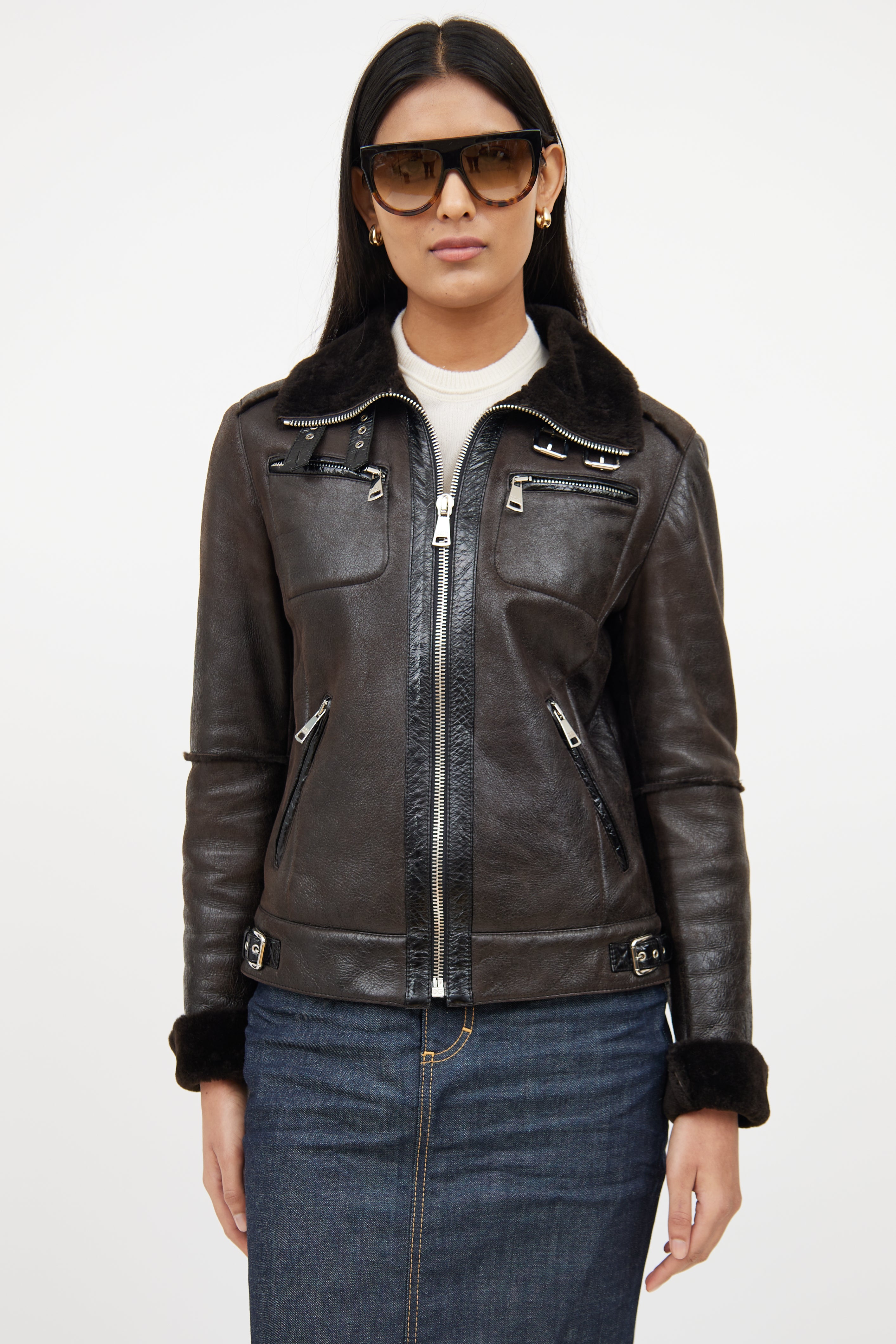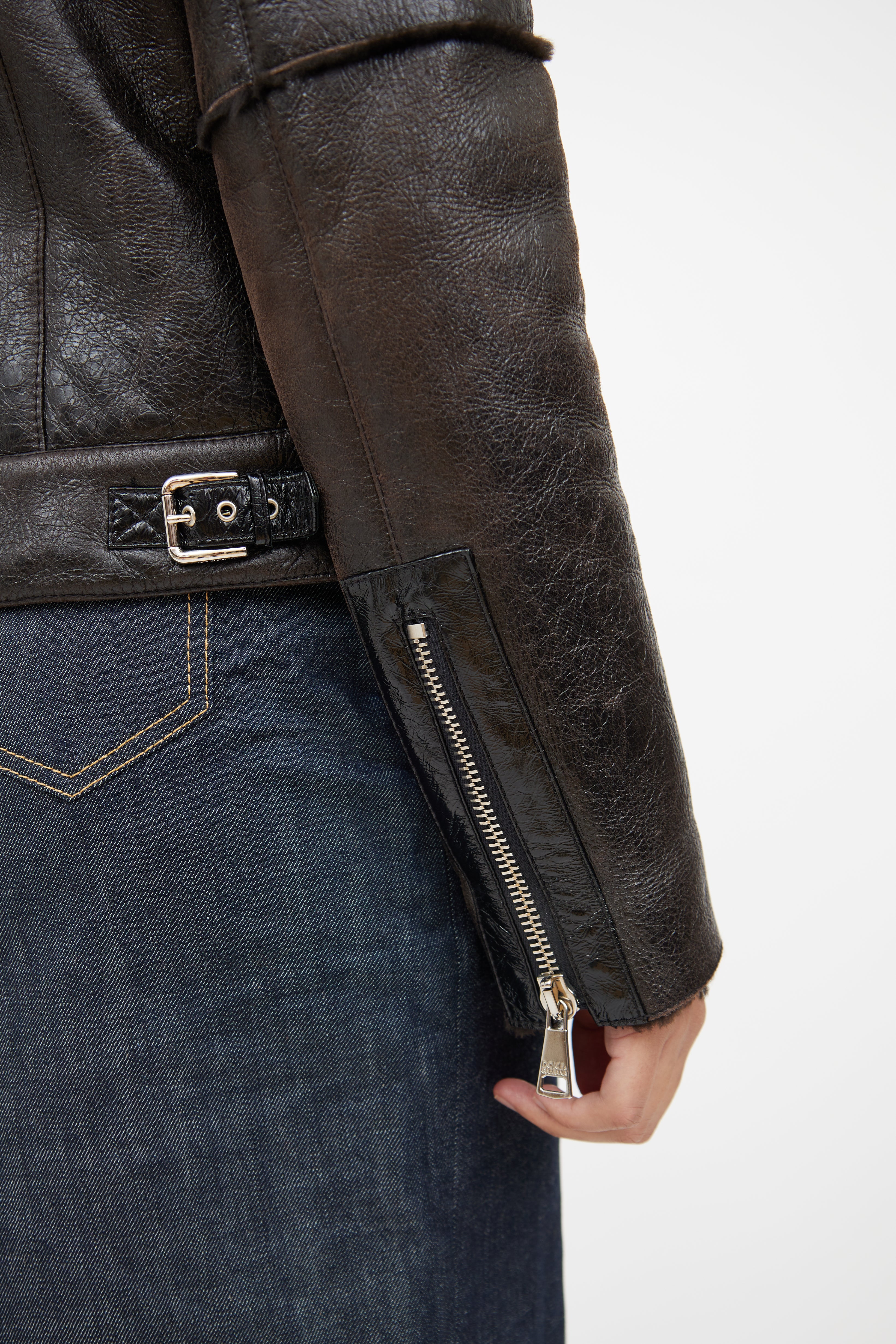 Pre-owned Dolce & Gabbana brown leather jacket featuring stand collar with adjustable black patent neck belts, long sleeves with zip detail at cuffs, zip front closure, dual zip pockets at chest, dual angled pockets at side, cinch belt details at side and silver tone hard wear. Fur lined.