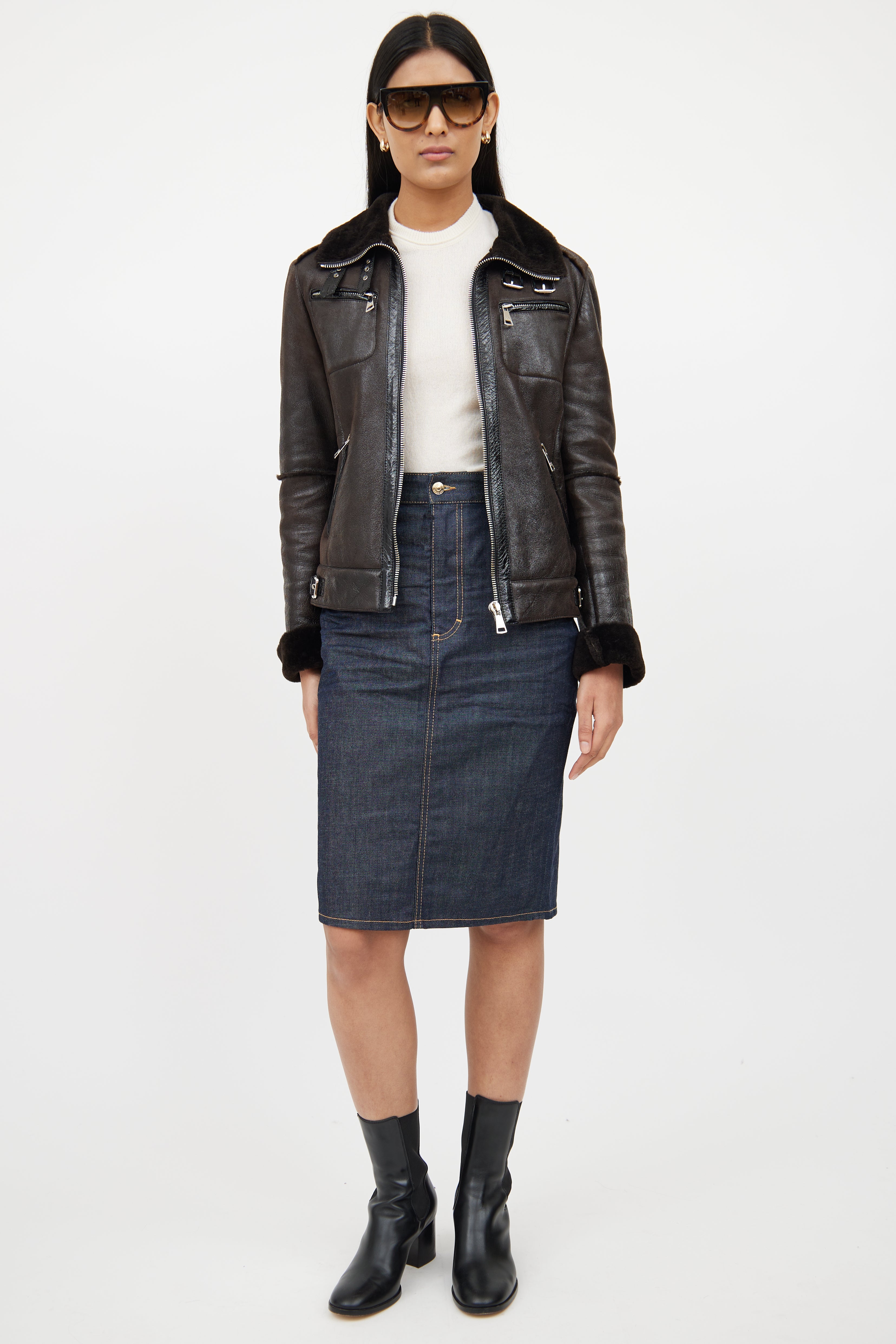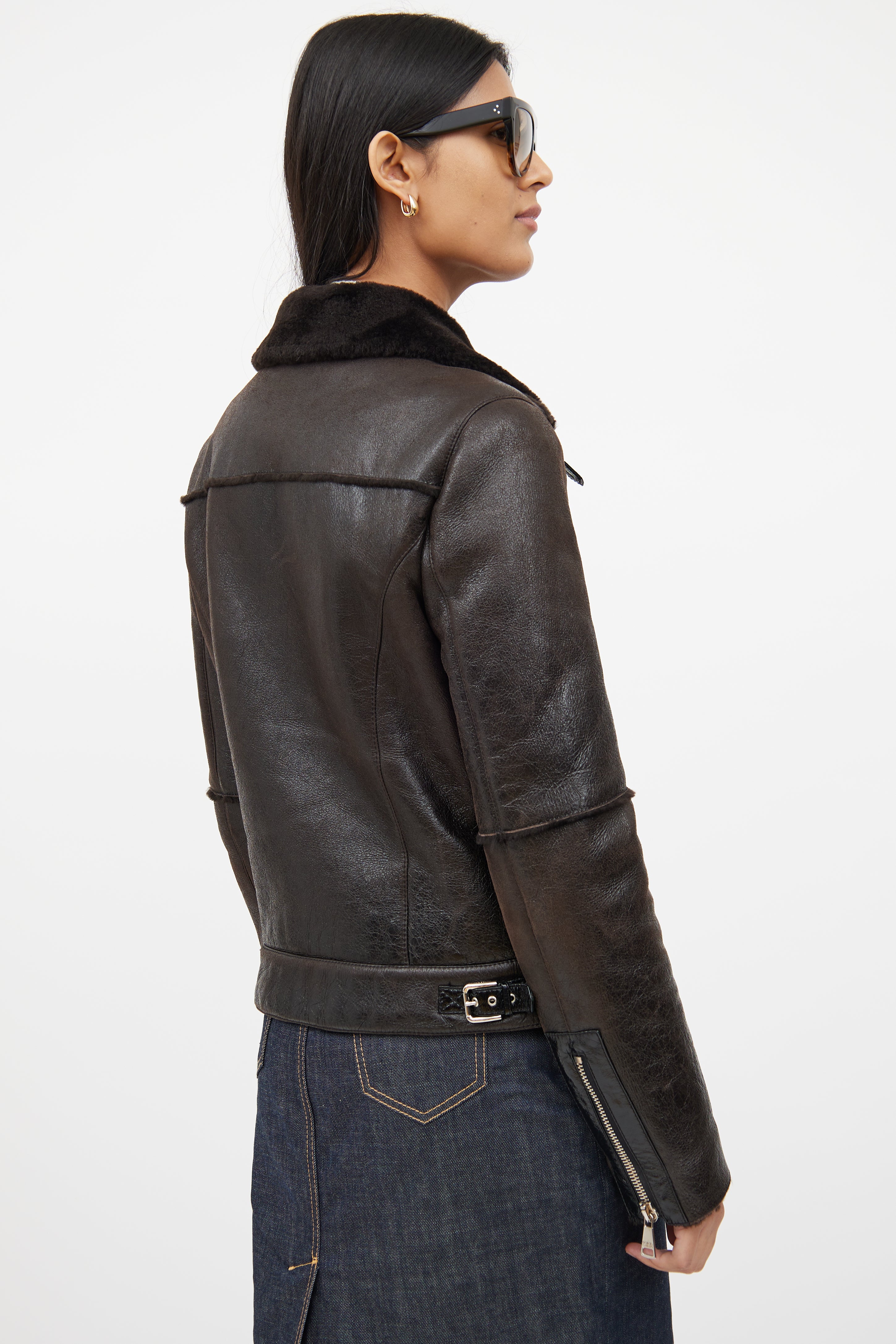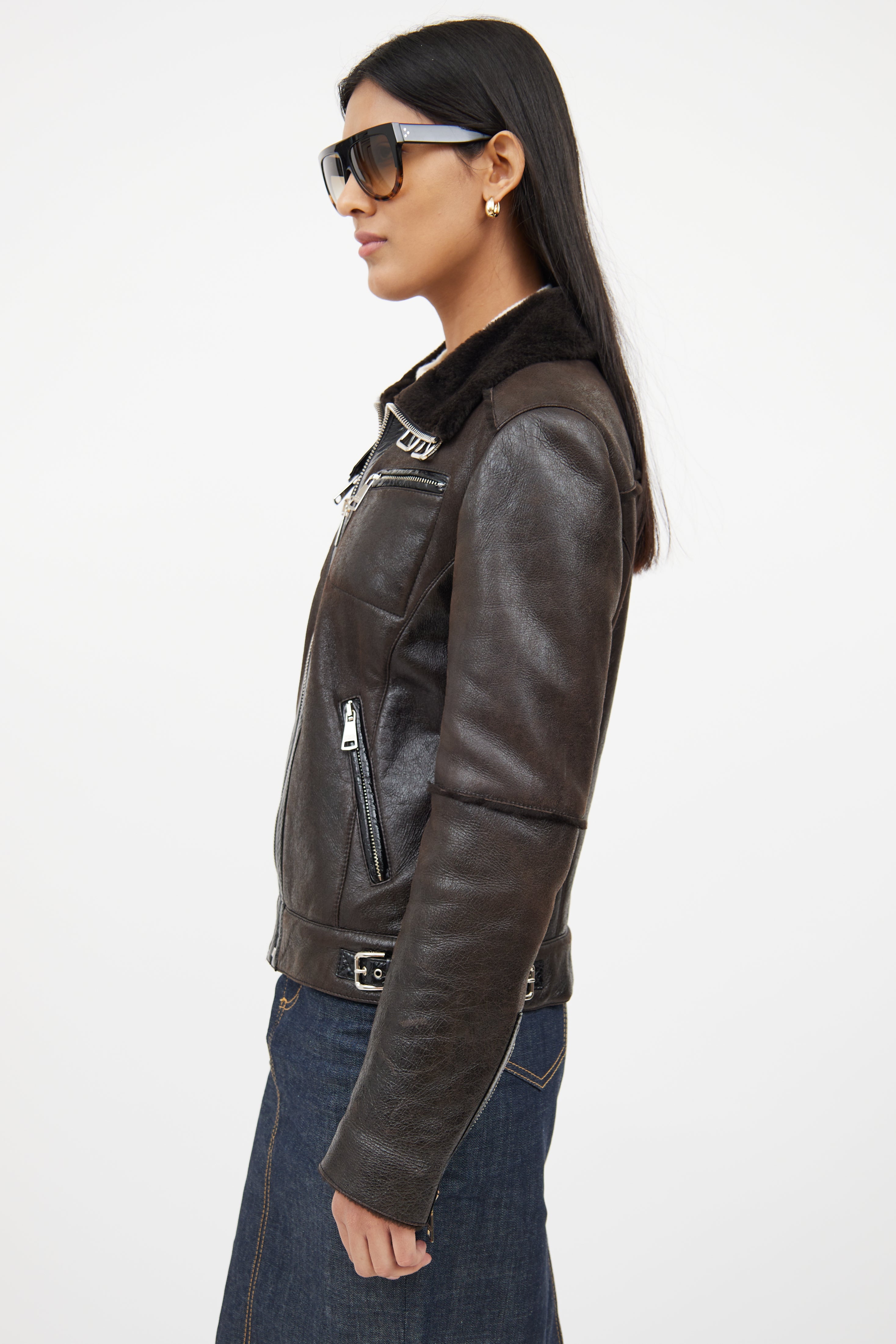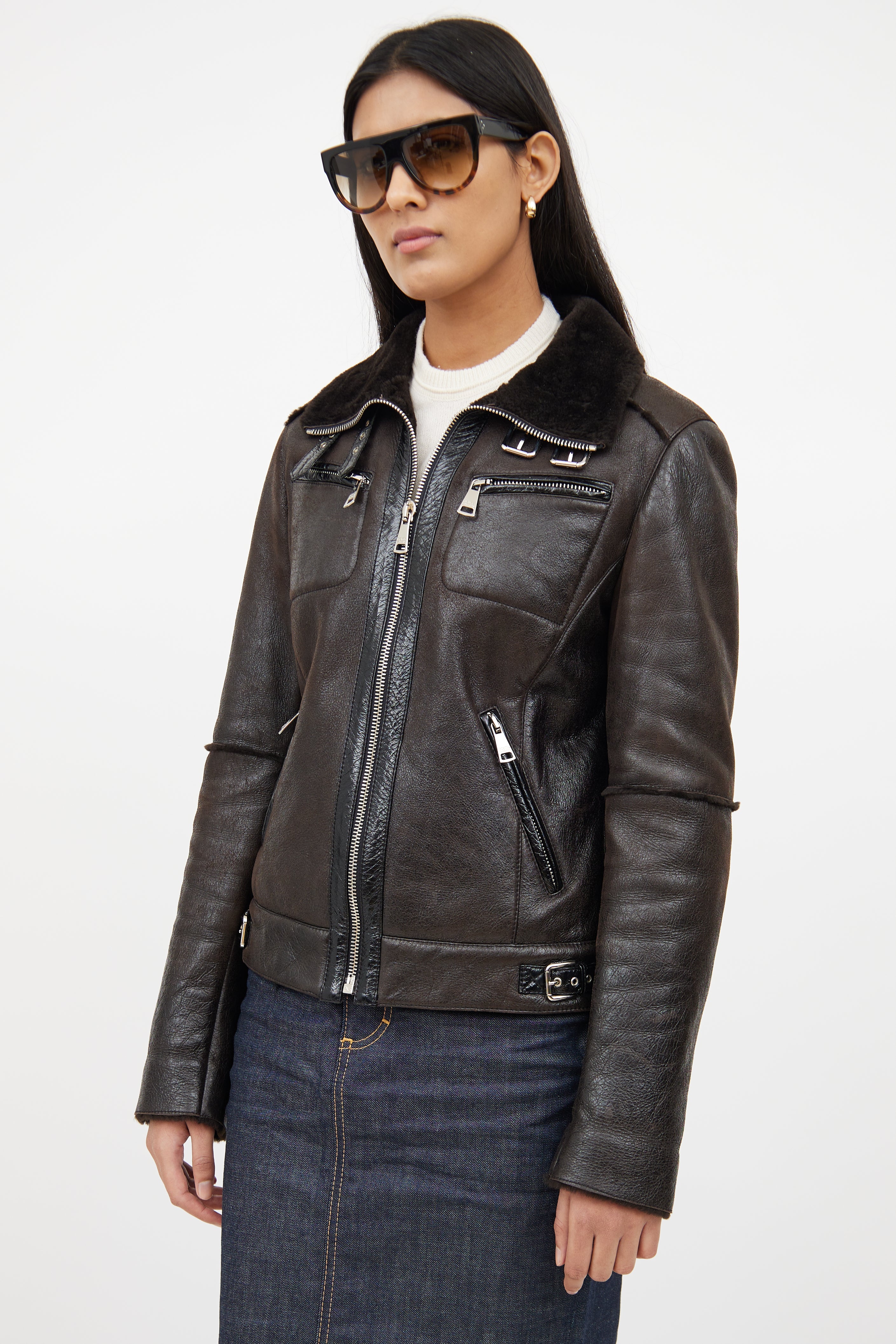 Pre-owned Dolce & Gabbana brown leather jacket featuring stand collar with adjustable black patent neck belts, long sleeves with zip detail at cuffs, zip front closure, dual zip pockets at chest, dual angled pockets at side, cinch belt details at side and silver tone hard wear. Fur lined.