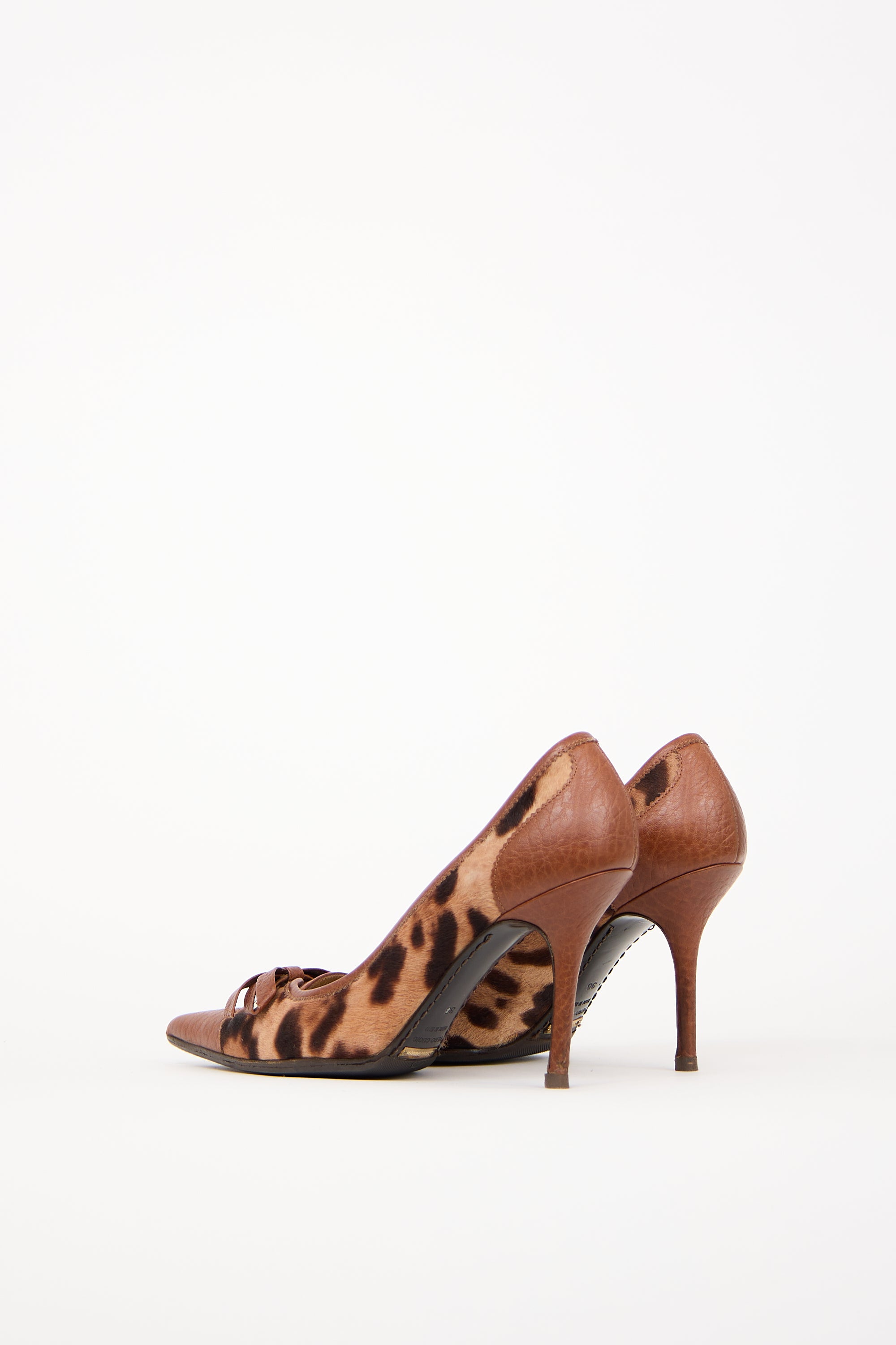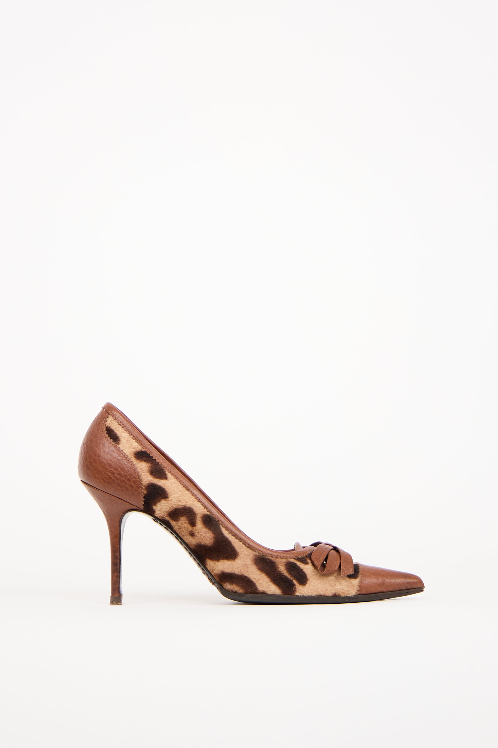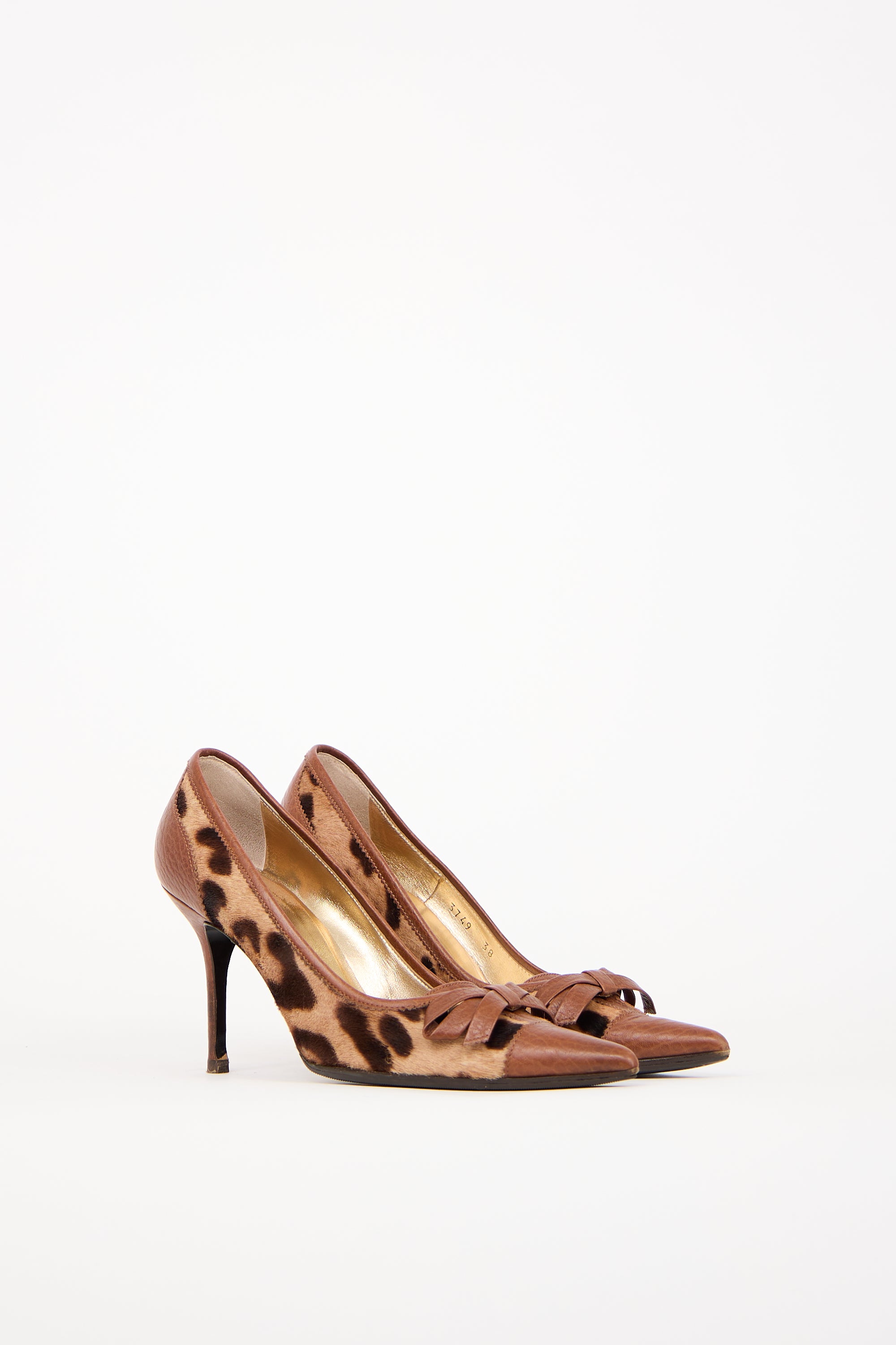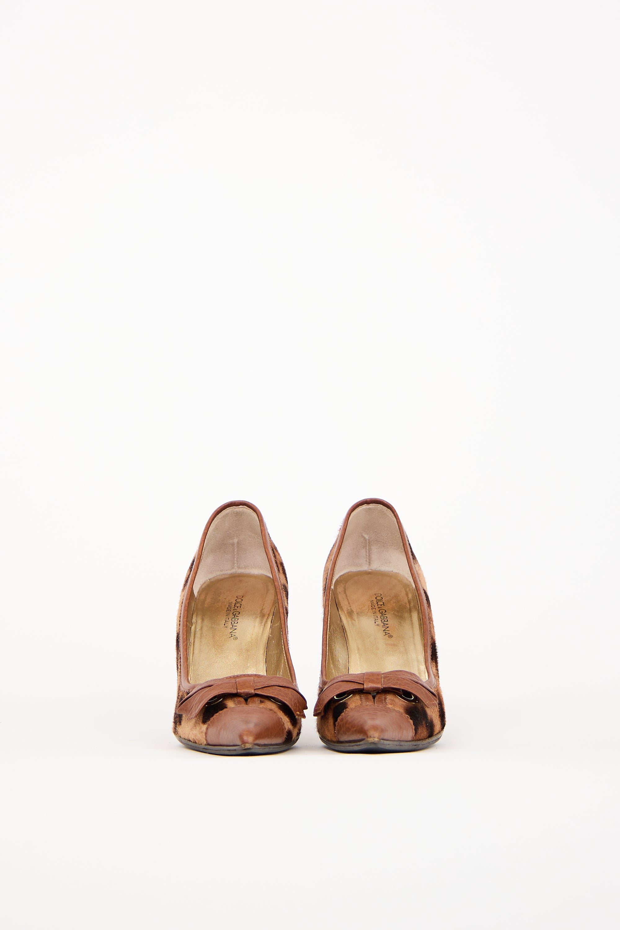 Pre-owned Dolce & Gabbana brown leopard print pony hair pumps featuring a leather pointed toe, bow detail at vamp, leather detail at heel counter, and stiletto heel.